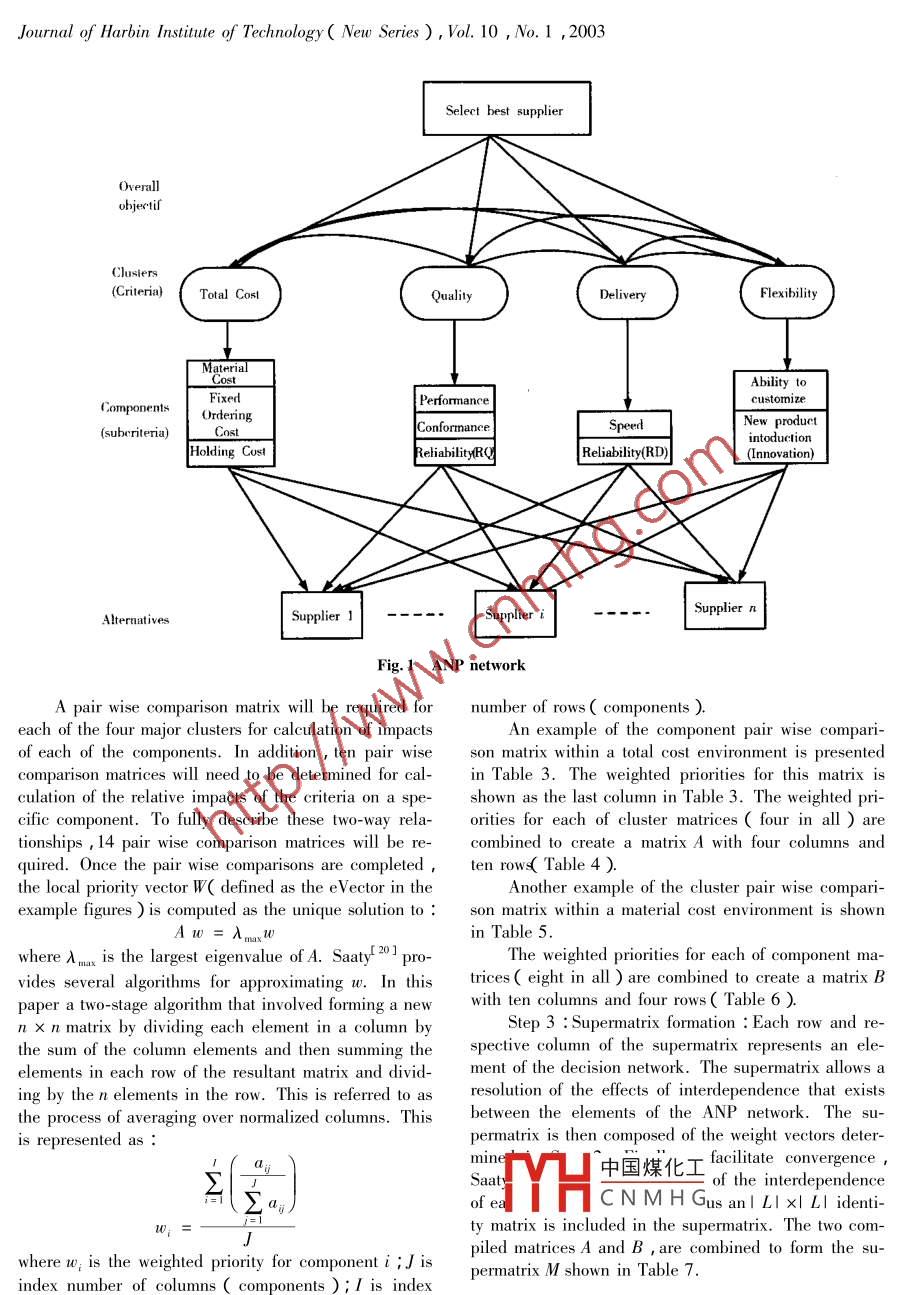 Journal of Harbin Institute of Technology( New Series ), Vol. 10 ,No. 1 ,2003An integrated model for supplier selection processOboulhas Conrad Tsahat ONESIME ,XU Xiao-fei , ZHAN De-chen ,SHA Lei徐曉飛,占德臣, 沙磊( Dept. of Computer Science and Engineering , Harbin Institute of Technology , Harbin 150001 , China )Abstract : In today' s highly competitive manufacturing environment , the supplier selection process becomesone of crucial activities in supply chain management. In order to select the best supplier( s )it is not only nec-essary to continuously tracking and benchmarking performance of suppliers but also to make a tradeoff betweentangible and intangible factors some of which may confict. In this paper an integration of case-based reasoning( CBR ) ,analytical network process( ANP ) and linear programming( LP ) is proposed to solve the supplier se-lection problem. .Key words : supplier selection ; case-based reasoning ; ANP ; linear programmingCLC number : TP391Document code :AArticle ID : 1005-9113( 2003 )01 -0043-080 INTRODUCTIONBasically there are two kinds of supplier selectionproblemtI : single sourcing and multiple sourcing. AIn today' s highly competitive manufacturing envi-single source establishes closer contacts with the suppli-ronment , manufacturing companies must constantly asker ,in some cases these contacts extend as far as syn-themselves these tough questions :Do we have the bestchronizing their production delivery schedules to reducesuppliers at the lowest possible prices ? Are we gettinginventory. All these well-intentioned programs , howev-and sending materials as quickly as possible ?Addition-er ,are not without problems. One obvious problem isally , the battlefield is shifting from individual companythe erosion of supply base for the buyer. Relying orperformance to what we call Supply Chain. The supplyone supplier is risky , and often might not produce thechain represents all activities associated with the move-lowest costs for the product. Also , as Newman' 31 sug-ment and transformation of raw materials to finishedgests , single sourcing may lead to loss of technologicalgoods,from primary suppliers ,to assemblers andthrust , excess control , and lack of identity for the sup-through to the end user. Increasingly , managers viewplier. However ,a stream of research in the last decadethe operations and purchasing functions as intimatelyhas focused on how the use of multiple sources can rlinked parts of the supply chain , each with the abilityduce' effective' transit or lead-times that can maketo contribute strategically to the firm. Since the typicaldual or multiple sourcing policy an effective risk strate-manufacturing firm spends approximately 60% of eachgy and cost reducing one.sales dollar on purchased components , materials ancSeveral methods for supporting. the supplier selec-services from external suppliers ,the manufacturingtion process have been proposedt 4,5 .firm' s final products are significantly affected by theLuitzen de Boer , Eva Labro , Pierangela Morlac-performance of external suppliers in terms of cost ,chit61 proposed four steps for supporting the supplierquality and so on' . The purchasing function is largelyselection process :( 1 ) finding out exactly what we wantresponsible for ( 1 ) determining the characteristics ofto achieve by selecting a supplier ,( 2 )defining the cri-purchased materials , components , and services ,( 2 )teria ,( 3 ) pre-qualifying suitable suppliers ,( 4 ) mak-selecting suppliers capable of providing the required i-ing a final choice.tems at the requisite levels of quality and price , andIn this paper , we emphasize much attention in the( 3 ) managing the transaction so that the goods or serv-pre-qualifying of suitable suppliers phase and the finalices are delivered in a timely manner. The purcha-choice phase ,because these phases ( pre-qualifyingsing department ability to identify useful suppliers canand final choice ) often being the most visible phases incontribute an organization' s efficiency and effective-the;中國(guó)煤化工ality of these phases isness : cost reduction ,profitability and flexibilty oflargeYHCNMHGY of the steps prior tocompany.theseReceived 2002 -06 -07.Sponsored by the National Natural Science Foundatioin of Chin( Grant No. 60084004 ) and National 863 Research Item/CIMS Program( Grant No.2001AA414610 ,2001 AA4115002 ) and the Cross Century Fund for Person with Ability of Chinese Educational Department.Journal of Harbin Institute of Technology( New Series ), Vol. 10 ,No. 1 ,2003( 1 )Pre-qualification of suitable suppliers phasesionmakingsituations ( such as supplier selec-The pre-qualification phase is the process of reduc-tion ) 45 . Mathematical programming ( MP ) modelsing the set of all' suppliers to a smaller set of accepta-allows the decision- maker to formulate the decisionble suppliers. This process may be caried out in moreproblem in terms of a mathematical objective functionthan one step. However , the first step always consists ofthat subsequently needs to be maximized( e. g. maxi-defining and determining the set of acceptable suppliersmize profit ) or minimized( e. g. minimize costs ) bywhile possible subsequent steps serve to reduce thevarying the values of the variables in the objectivenumber of suppliers to consider. Basically therefore.function( e. g. the amount ordered with supplier X ).pre-qualification is sorting process rather than a rankingWeber and Current' 151 proposed the use of MP. Artifi-process. Several methods have been proposed in the lit-cial intelligence( AI )-based models are based on com-erature for the pre-qualification step but the most impor-puter-aided systems that in one way or another can betant of them are briefly discussed below.trained' by a purchasing expert or historic data. AI-Categorical methods are qualitative models , basedbino and Garavellr' 16 J present a decision support systemon historical data which assigns either good ( + ),base