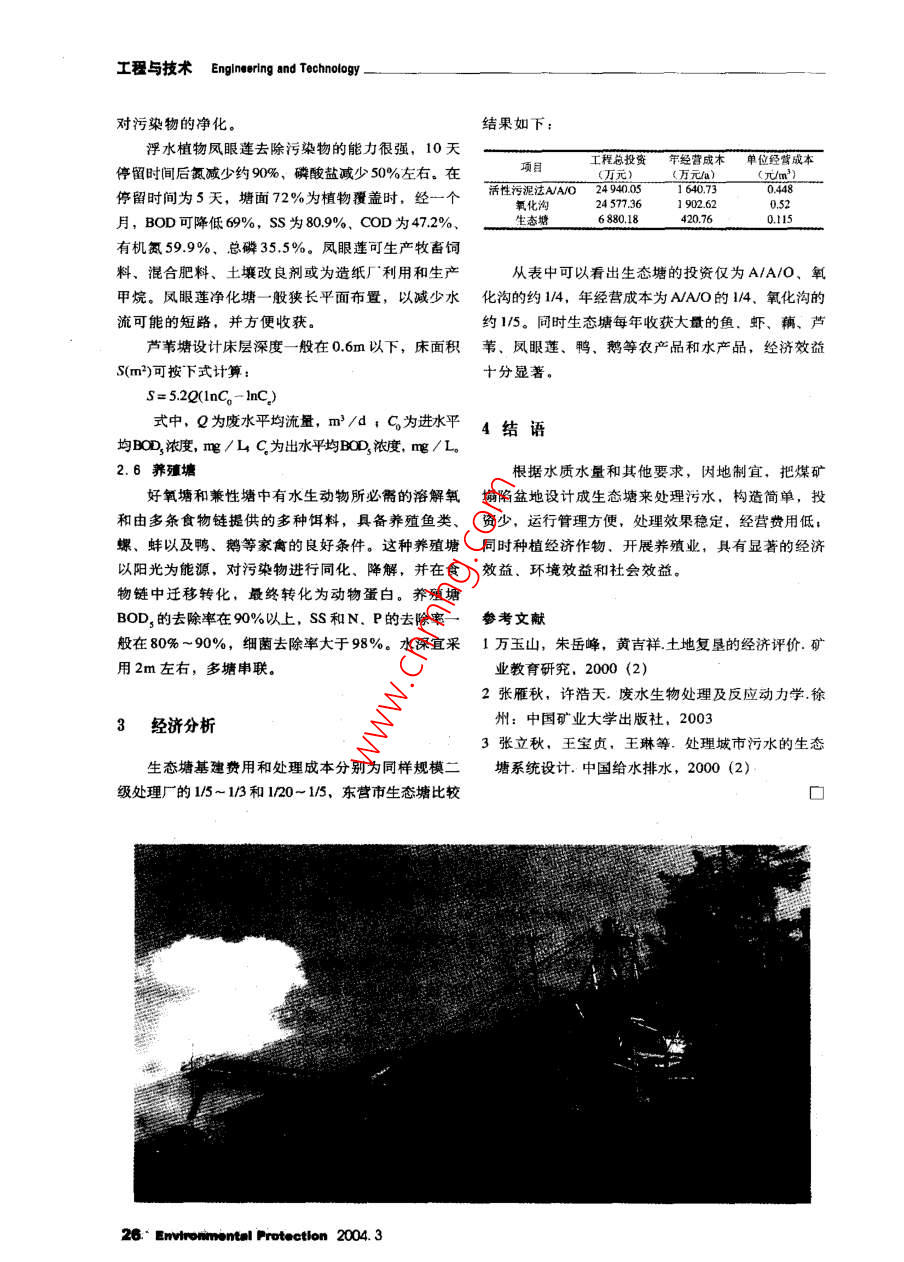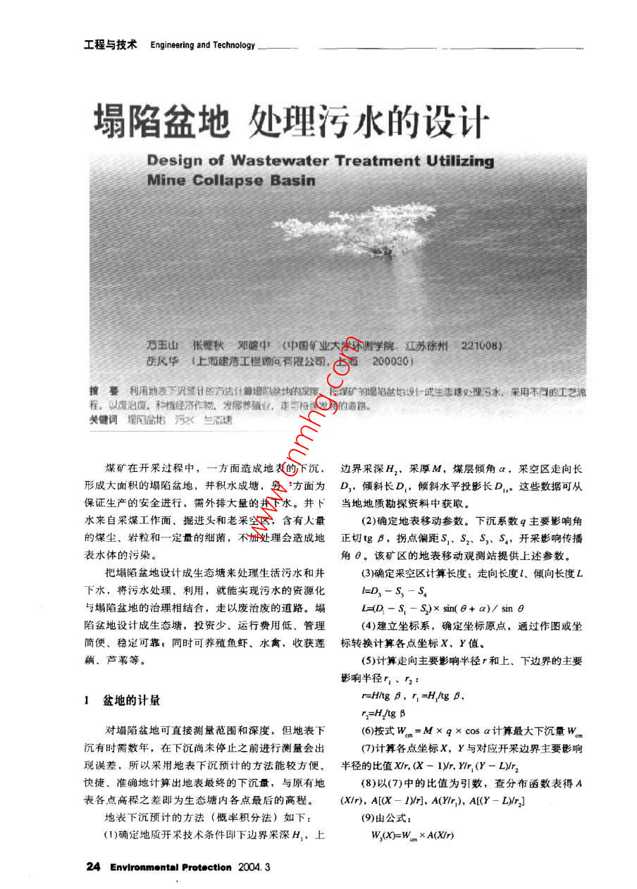 工程與技術(shù) Engineering and Technology塌陷盆地處理污水的設(shè)計(jì)Design of Wastewater Treatment UtilizingMine Collapse Basin乃主山張雅秋鄧婆中(中國(guó)業(yè)大學(xué)環(huán)測(cè)學(xué)院,江蘇徐州2100鳳華(上海建浩工程聊問有限公司,上矩200030)搜要利用地表下沉質(zhì)計(jì)的方法計(jì)靜增阻地的滾度,把礦愿唱獻(xiàn)始設(shè)武生志塘理虧水,采用不陽(yáng)的工藝程,似廢治廢,種植經(jīng)濟(jì)作,發(fā)養(yǎng)殖業(yè),走部擺發(fā)的路關(guān)鍵詞坫污三需濾煤礦在開采過程中,一方面造成地表的下沉,邊界采深H2,采厚M,煤層傾角a,采空區(qū)走向長(zhǎng)形成大面積的塌陷盆地,并積水成塘,另方面為D3,傾斜長(zhǎng)D1,傾斜水平投影長(zhǎng)D1。這些數(shù)據(jù)可從保證生產(chǎn)的安全進(jìn)行,需外排大量的井下水。井下當(dāng)?shù)氐刭|(zhì)勘探資料中獲取水來(lái)自采煤工作面、掘進(jìn)頭和老采空區(qū),含有大量2)確定地表移動(dòng)參數(shù)。下沉系數(shù)q主要影響角的煤塵、巖粒和一定量的細(xì)菌,不加處理會(huì)造成地正切tgB,拐點(diǎn)偏距S、S2、S3、S,開采影響傳播表水體的污染角θ。該礦區(qū)的地表移動(dòng)觀測(cè)站提供上述參數(shù)把塌陷盆地設(shè)計(jì)成生態(tài)塘來(lái)處理生活污水和井(3)確定采空區(qū)計(jì)算長(zhǎng)度:走向長(zhǎng)度l、傾向長(zhǎng)度L下水,將污水處理、利用,就能實(shí)現(xiàn)污水的資源化h=D3-S3-S4與塌陷盆地的治理相結(jié)合,走以廢治廢的道路。塌LD-5,-S2x sin(8+ a)/ sin 8陷盆地設(shè)計(jì)成生態(tài)塘,投資少、運(yùn)行費(fèi)用低、管理(4)建立坐標(biāo)系,確定坐標(biāo)原點(diǎn),通過作圖或坐簡(jiǎn)便、穩(wěn)定可靠;同時(shí)可養(yǎng)殖魚蝦、水禽,收獲蓮標(biāo)轉(zhuǎn)換計(jì)算各點(diǎn)坐標(biāo)X,Y值、藕、蘆葦?shù)取?5)計(jì)算走向主要影響半徑r和上、下邊界的主要影響半徑1盆地的計(jì)量H/tg B, r,=H/tg Br2=H/tg B對(duì)塌陷盆地可直接測(cè)量范圍和深度,但地表下(6)按式Wm=M×q×cosa計(jì)算最大下沉量W沉有時(shí)需數(shù)年,在下沉尚未停止之前進(jìn)行測(cè)量會(huì)出(7)計(jì)算各點(diǎn)坐標(biāo)X,Y與對(duì)應(yīng)開采邊界主要影響現(xiàn)誤差,所以采用地表下沉預(yù)計(jì)的方法能較方便、半徑的比值x,(X-1,mr:(Y-DMr2快捷、準(zhǔn)確地計(jì)算出地表最終的下沉量,與原有地(8)以(7)中的比值為引數(shù),查分布函數(shù)表得A表各點(diǎn)高釋之差即為生態(tài)塘內(nèi)各點(diǎn)最后的高程。(Xm,A[x-Dm,A(r1),A[(Y-Lmz地表下沉預(yù)討的方法(慨率積分法)如下(9)由公式:(1)確定地質(zhì)開采技術(shù)條件即下邊界采深H1,上W,(X=W xA(X/r)Environmental Protection 2004. 3Engineering and Technology工程與技術(shù)W(X-I=w x A[(X-y/rl藻類和大氣復(fù)氧時(shí),就使全塘處于厭氧分解狀態(tài)。w(r=Wm xA(rIr)厭氧塘是一類高有機(jī)負(fù)荷的以厭氧分解為主的生物w,cr-L=Wm x A((Y- Lyr,I塘BOD3負(fù)荷40~60kg/(km3d),其表面積較小,水在W(X=[,(-W(X-D]塘中停留I-5d。它能以高有機(jī)負(fù)荷處理高濃度廢w(r=[W (r)" w,(r-L)水,BOD3去除率60%-90%,污泥量少,產(chǎn)生臭氣計(jì)算X方向的下沉量W(X、WX-D、W(X和出水不能達(dá)到排放要求,因而多作為好氧塘的預(yù)處Y方向的下沉量W(Y、W2(Y-L,WY。理塘使用。(10)由公式2.3好氧塘wx, Y=w(x)xwn/w好氧塘是一種主要靠塘內(nèi)藻類的光合作用供氧求得各點(diǎn)的最終下沉量WXY)。的氧化塘。它的水深較淺,一般在0.3-0.5m,陽(yáng)把以上步驟編程,輸入(1)、(2)、(4)的數(shù)據(jù),光能直接射透到池底,藻類生長(zhǎng)旺盛,加上塘面風(fēng)可很快求出各點(diǎn)的高程力攪動(dòng)進(jìn)行大氣復(fù)氧,全部塘水都呈好氧狀態(tài)。BOD負(fù)荷2-40kg/(kmd),水在塘中停留2-10d2處理工藝BoD3去除率80%-95%。曝氣塘是為了強(qiáng)化塘面大氣復(fù)氧作用,在塘上設(shè)置機(jī)械曝氣或水力曝氣器2.1工藝流程使塘水得到不同程度的混合而保持好氧狀態(tài)。曝氣塘有機(jī)負(fù)荷和去除率都比較高,占地面積小污水{懨氧捆恤物塘好氧堌慘殖堌悱放或回用但運(yùn)行費(fèi)用高,且出水括浮物濃度較高,使用時(shí)可在后面連接兼性塘來(lái)改善最終出水水質(zhì)植物塘或好氧塘2.4兼性塘兼性塘的水深一般在1-25m,塘內(nèi)好氧根據(jù)不同的進(jìn)水水質(zhì)和回用要求選用不同的處和厭氧生化反應(yīng)兼而有之。在上部水層中,白天藻理流程Φ⑨③④,并結(jié)合上文計(jì)箅所得塌陷盆地的深類光合作用旺盛,塘水維持好氧狀態(tài),其凈化機(jī)理度,盡量減少工程投資,降低運(yùn)行成本和各項(xiàng)運(yùn)行指標(biāo)與好氧塘相同:在夜晚,藻類光合山東東營(yíng)市污水生態(tài)處理工藝流程為:作用停止,大氣復(fù)氧低于塘內(nèi)耗氧,溶解氧急劇下降至接近于琴。在塘底,由可沉固體和藻類、菌類殘?bào)w形成了污泥層,由于缺氧而進(jìn)行厭氧發(fā)酵,在污水—叫沉砂池厭氧塘曝氣好氧層和厭氧層之間,存在著一個(gè)兼性層。兼性塘是氧化塘中最常用的塘型,常在曝氣塘或厭氧塘之儲(chǔ)水庫(kù)一蘆葦塘藕塘曝氣養(yǎng)魚塘后作為二級(jí)處理塘使用,有的也作為難生化降解有機(jī)廢水的貯存塘和間歇排放塘。BOD,負(fù)荷4~10kg(kmd),水在塘中停留3~15d,BOD3去除率70%在設(shè)計(jì)時(sh