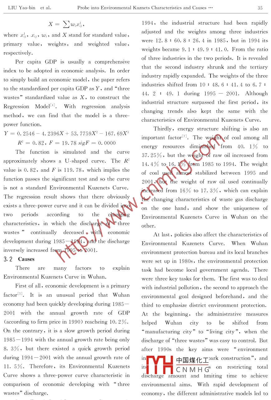 Jun. 2004Journal of China University of Mining &. TechnologyVol.14 No. 1Probe into Environmental K uznetsCharacteristics and Causes of W astewater,Waste Gas, and Solid Wastes in Wuhan CityLIU Yao- -bin(劉耀彬)', LI Ren- dong(李仁東)2(1. School of Management, CUMT, Xuzhou 221008,China;2. Institute of Geodesy and Geophysics, Chinese Academy of Science, Wuhan 430077, China)Abstract: Environmental K uznets characteristics and causes of waste water, waste gas, and solid wastes in W uhancity was researched; By comparing the variation of“three wastes", i.e. waste water, waste gas, and solid wastes,the model between standardized per capita GDP and values of“three wastes ”discharge was established and thecauses were analyzed based on the theory of environmental economics. The results show that 1) the total amount isfluctuantly increasing. but the discharges of the three kinds are temporarily different, 2) the curve conforms to thethree -power function, in which the curve descends from 1985 to 1994, and the curve preliminary shows theenvironmental Kuznets characteristics from 1995 to 2001,3) the simulated calculation ilustrates that the turningpoint of this environmental Kuznets curve would be over 25007. 25 Yuan per caprta, and 4) the economicdevelopment, changing of industry structure, energy resource structure, and environmental policies are the mainfactors leading to the Environmental Kuznets Curve in Wuhan city.Key words: discharge of“three wastes”; economic growth; Environmental Kuznets Curve; factorsCLC number: X 1Document code: A Article ID: 1006- 1266(2004)01- 003304Kuzenets Curve. Additionally, he advanced aIntroductionmathematics model based on the environmentalThere exists a kind of sequential coordinativecharacteristic values during lower revenue, shifting,relationshipbetween city development and itsand higher revenue phasest2l.ecologyenvironmentIl.In 1982, AmericanWuhan as a metropolis in the middle belt ineconomists Grossman and Krueger, who wereChina,its environmental quality lagged behindenlightened by K uzenets posing“Inverse U”curve,other metropolises according to the Nationalfirstly advanced“Environmental Kuzenets Curve”Environment Data Bulletin in 2001,which indicatessupposition for developed countries according to thethat its ecology environment is bad and not innorm that some developed countries had undergoneharmony with the goal of“ Ecology Parks andpreliminarily quick growth, serious pollution andInternational Metropolis ”that Wuhan governmentthen the improvement of environment quality.pursues. How to improve the sustainable developingAfter the following years, Bonaton ( Internationalcapability of Wuhan city without hinderingDevelopment Institute of Harvard University )economic development is an important issue facingcollected a mount of relevant data bet ween economic中國煤化工fact, although theredevelopment andenvironmentalquality from .THCNMHGenets Curve,wecandevelopinganddevelopedcountries,andCOnL1O1 allu 111p1UvC L110curve features to make itdemonstratedtheexistence of Environmentalhave three different trends by taking market andReceived date: 2003- 10- 13Foundatiqn i果Hey Knowledge Innovative Project of Chinese Academy of Science (KZCX2 SW-415)Biography!薩說bin (1970-), male, from Macheng, Hubei province, doctoral student, engaged in the research on city and regionalplanning and management.3Journal of China University of Mining &. TechnologyVol. 14 No. 1policy measures'3], and approach the environmental2 Variation of“Wastes” Dischargegoal (Fig. 1). In 2001 the discharges of“ threeIn April 1984, Wuhan environment protection .wastes",i. e . waste water,waste gas, and solidbureau was established and two years later thewaste,mount to 683. 56 million tons, 195. 01branches were also set up, which indicated thatbillion tons, and 5. 30 million tons, respectively. Itenvironmental protection was in a legislative stage ins of practicalsignificance tresearchtheWuhan. In order to study the characteristics ofEnvironmental Kuzenets Curve characteristics andEnvironmental K uzenetsCurveundernewcauses between economic development and“ threeconditions,we have objectively collected thewastes”discharge.discharge of“three wastes”and relevant economicFig.1 is an inversed Environmental Kuzenets .dataduring1985- 2001.For convenientlyCurve in Wuhan city. In Fig. 1, Curve A shows theanalyzing the changing characteristics of“ threesituationnwhichenvironmentaldamagewastes”discharge, we have individually made threedegeneration may reach the ecology thresholdcurve figures (Fig. 2). From Fig. 2a we can see thatwithout considering the environmental cost. Inthe discharge of waste water in W uhan graduallycurve B, part of the environmental cost is taken intodecreased from 1985 to 1997, but it undulatinglyaccount. In this situation, we can make the curveincreased after 1998. From Fig. 2b, it can be seenbe smooth and environmental worsening peakthat the discharge of waste gas basically rised fromdescended by drafting discharge standard,discharge1985 to 2001. However, the discharge decreased byfees,and executing discharge certificate trade. In12.4% after 2000. And in Fig. 2c, the discharge ofcurve C, all the environmental cost has been takensolid waste cyclically fluctuated, in which the firstinto account. We can make the peak be furtherperiod was between 1985 and 1990 ,the seconddescended, thus the damage of ecology environmentperiod between 1991 and 1996, and between 1997may reach the lowest by further restrictingand 2001 was the third period, but the fact is thatdischarge standard, increasing discharge fees, andthe total discharge increased.stopping unfavorable pensions for environment.According to the above analysis, we can findthat the total discharge undulatingly increases ,Ecologyi thresholdwhich on one hand, shows that the characteristics品of Environmental Kuzenets Curve is not apparent ,Economic developing levelon the other hand, the task of