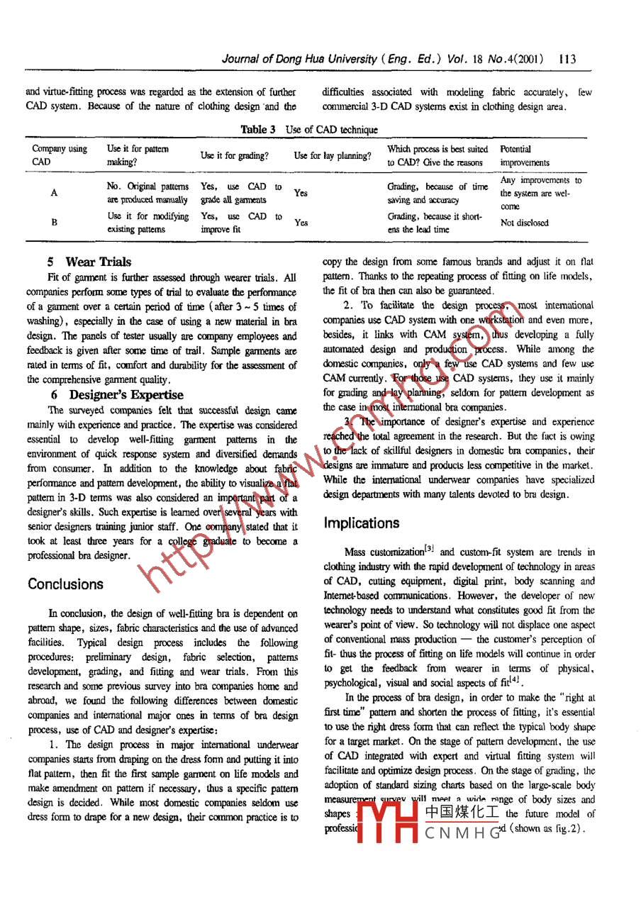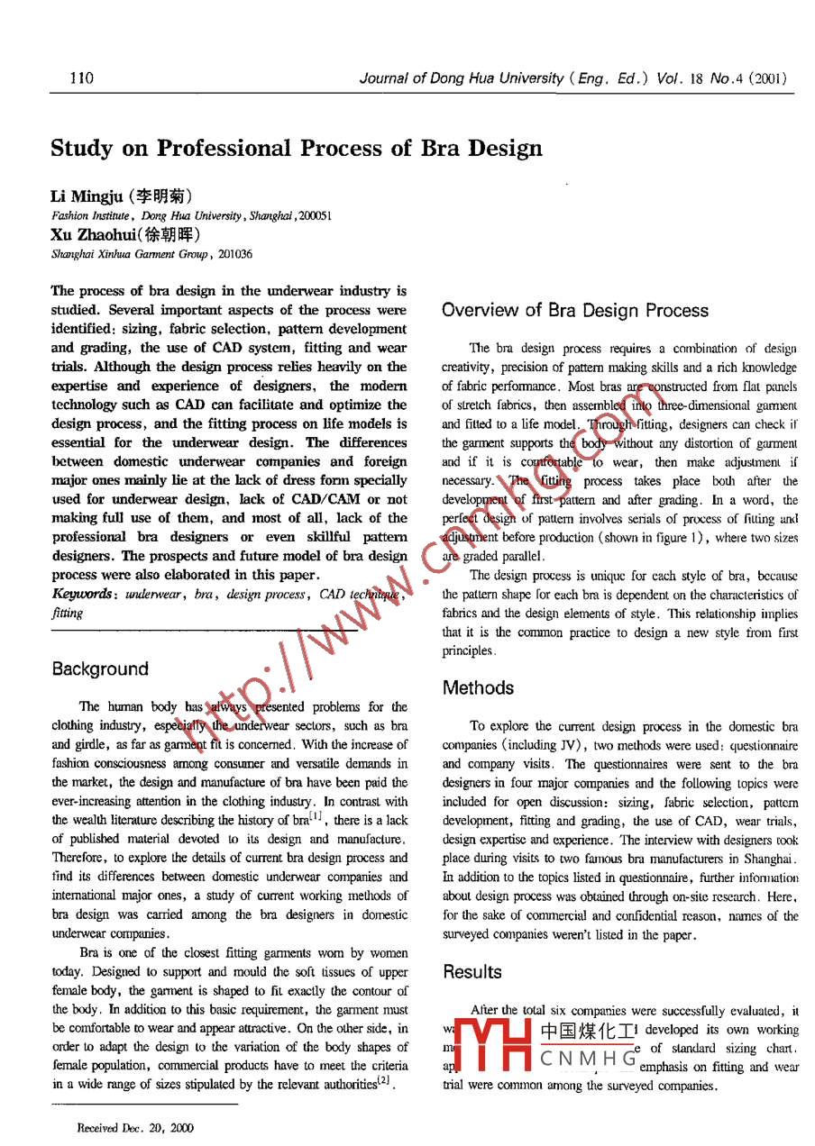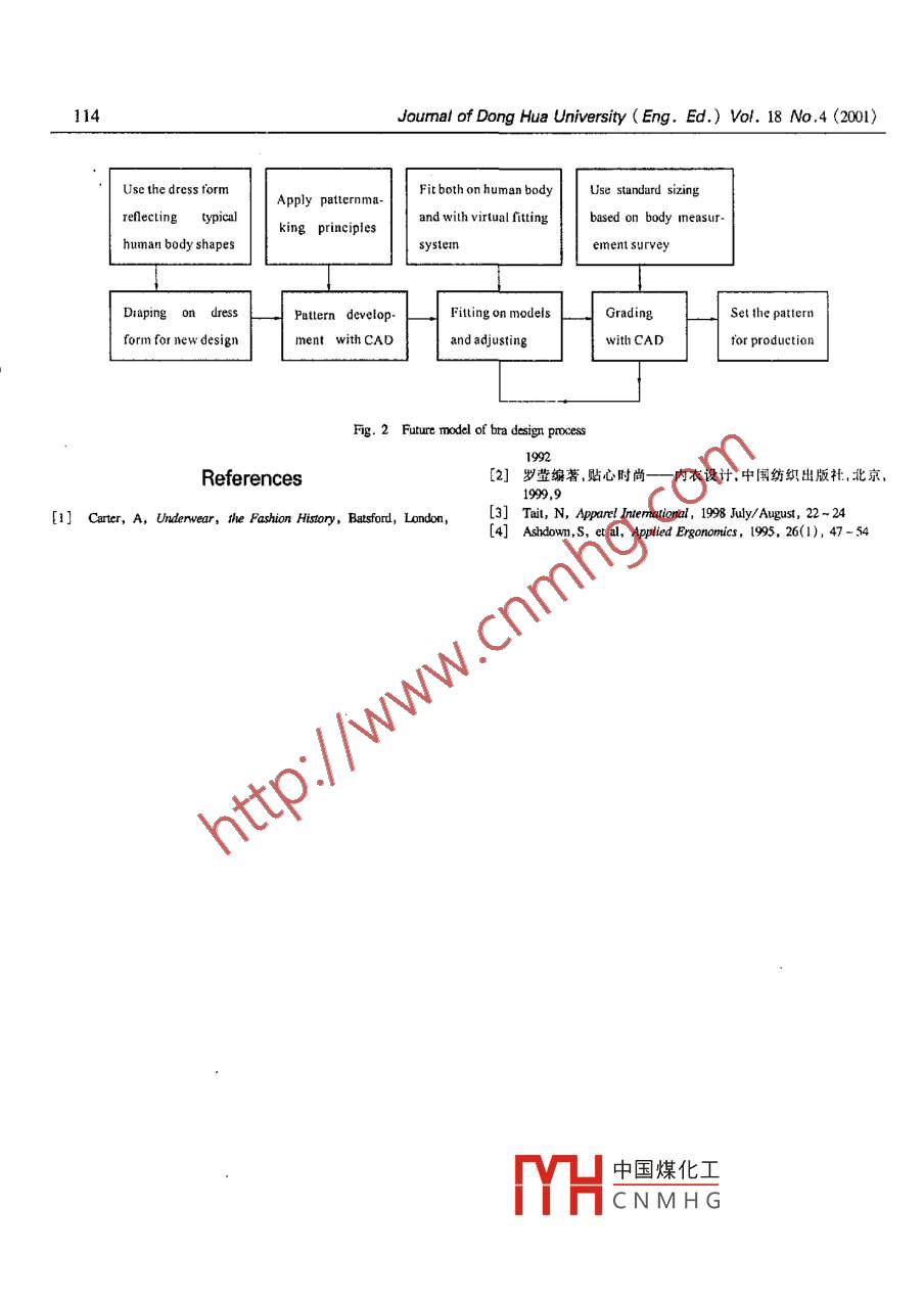 110Journal of Dong Hua University ( Eng. Ed.) Vol. 18 No .4 (2001)Study on Professional Process of Bra DesignLi Mingju (李明菊)Fashion Institute , Dong Hua University , Shanghai ,200051Xu Zhaohui(徐朝暉)Shanghai Xinhua Gamnent Group , 201036The process of bra design in the underwear industry isstudied. Several important aspects of the process wereOverview of Bra Design Process .identified: sizing, fabric selection, pattern developmentand grading, the use of CAD system, ftting and wearThe bra design process requires a combination of designtrials. Although the design process relies heavily on thecreativity, precision of pattermn making skills and a nich knowledgeexpertise and experience of designers, the modernof fabric performance. Most bras are constructed from flat panclstechnology such as CAD can facilitate and optimize theof strelch fabrics, then assembled into three dimensional gamentdesign process, and the fitting process on life models isand ftted to a life model. Through fiting, designers can check ifessential for the underwear design. The differencesthe garment supports the body without any distortion of garmentbetween domestic underwear companies and foreignond if it is comfortable to wear, then make adjustmenl imajor ones mainly lie at the lack of dress form specallynecessary. The ftting process takes place bouh after theused for underwear design, lack of CAD/CAM or notdevelopment of first pattern and after grading. In a word, thmaking full use of them, and most of all,lack of theperect design of patterm involves serials of prucess of fiuting und}professional bra designers or even slilful patternadjustment before production (shown in figure 1), where two sizesdesigners. The prospects and future model of bra designare graded parallel.process were also elaborated in this paper.The design process is urique for cach style of bra, becauseKeywords: undenwear, bra, dlesign process, CAD technique ,the pattern shape for each bra is dependent on the characteristics offtting .fabrics and the design elements of style. This relationship impliesthatit is the common practice to design a new style from firstprinciples.BackgroundMethodsThe buman body has always presented problems for theclothing industry, especially the underwear sectors, such as braTo explore the current design process in the dornestic braand girdle, as far as garment fit is concemed. With the increase ofcompanies (including JV), two methods were used: questionnairefashion consciousness among consuner and versatile demands inand company visits. The questinnaires were sent to the brathe market, the design and manufacture of bra have been paid thedesigners in four major cormpanies and the followving topics wereever-increasing altention in the clothing industry. In contrast withincluded for open discussion: sizing, fabric selection, pattemthe wealh literature describing the history of bral"I, there is a lackdevelopnent, flting and grading, the use of CAD,wear trials,of published material devoted to its design and manufacture.design expertise and experience. The inteview with designers tookTherefore, to explore the details of curent bra design process andplace during visits to two famous bra manufacturers in Shanghai.find its differences between domestic underwear companies andIn addition to the topics listed in questionnaine, further informnationintemational major ones, a study of current working methods ofaboul design process was obtained hrough on- sitc research. Here,bra design was carried among the bra designers in domesticfor the sake of commercial and confidential reason, namcs of theunderwear corupanies .surveyed companies weren't listed in the paper.Bra is one of the closest ftting garments wom by womentoday. Designed to support and rmould the soft issues of upperResultsfemale body, the garment is shaped to fit exacly the contour olthe body, In addition to this basic requirement, the garment mustAfter the total six companies were sucessfully evaluated, ilbe confortable to wear and appear atractive. On the ouher side, in中國(guó)煤化工developed its own workingorder to adapt the design w the variation of the body shapes ofof slandlard sizing chart.YHfemale population, commercial products have to meet the criteriaCN M H G emphasis on fting and werin a wide range of sizes stipulated by the relevant authoritiesl2!.trial were common among the surveyed companies.Recired Dec. 20, 2000Journal of Dong Hua University (Eng. Ed.) Vol. 18 No.4(2001) 111Inspiration & mood boardF abric selectionFabric tcstingFashion sketch| First pattern in sample sizcFirst sam ple garmcntAdjust samplc & amcnd patternFit to lifc modcIAssess filrange of sizes .Graded sample size a| Graded samplc sice bAdjust samplc &Adjusi sample &Fit to life modeIFit to life modelam end patternanend pallernAssess fitSet of graded paltern .ProductionFgure 1 Process of bra design1 SizingThe in-depth research revealed that some bras companiesGeneraly speaking, the domestic underwear companies haveoccasionally use their self-defined sizing charts in production. Irapplied current criteria of sizing set by the authority. For example,this case, even bras are labeled the same size but if produced byfor domesic market,the specification of bust circunference is .different manufacturers, the inconsistency in true measurements70 cm, 75 cm, 80 cm and 85 cm, which is equivalent to the 32in,will take place in the market.34in,36in and 38in respetively in American and European2 Fabric Selectionmarket. While the cup of bra is specified as typeA, B, C and D. delermining the shape offor Chinese women, AA,B, C,D, DD, E for those in westrma pattern中國(guó)煤化工greed on the imporunecountries. Because the body sizes of western people are differentof fabridC N M H Gign procss.s If the fabric .from Chinese, and more' diversified body shapes exist amongfor an exusung styue is cnangea, a new set of patterns should beAmerican women. So the sizing chart should be adjusted accordin