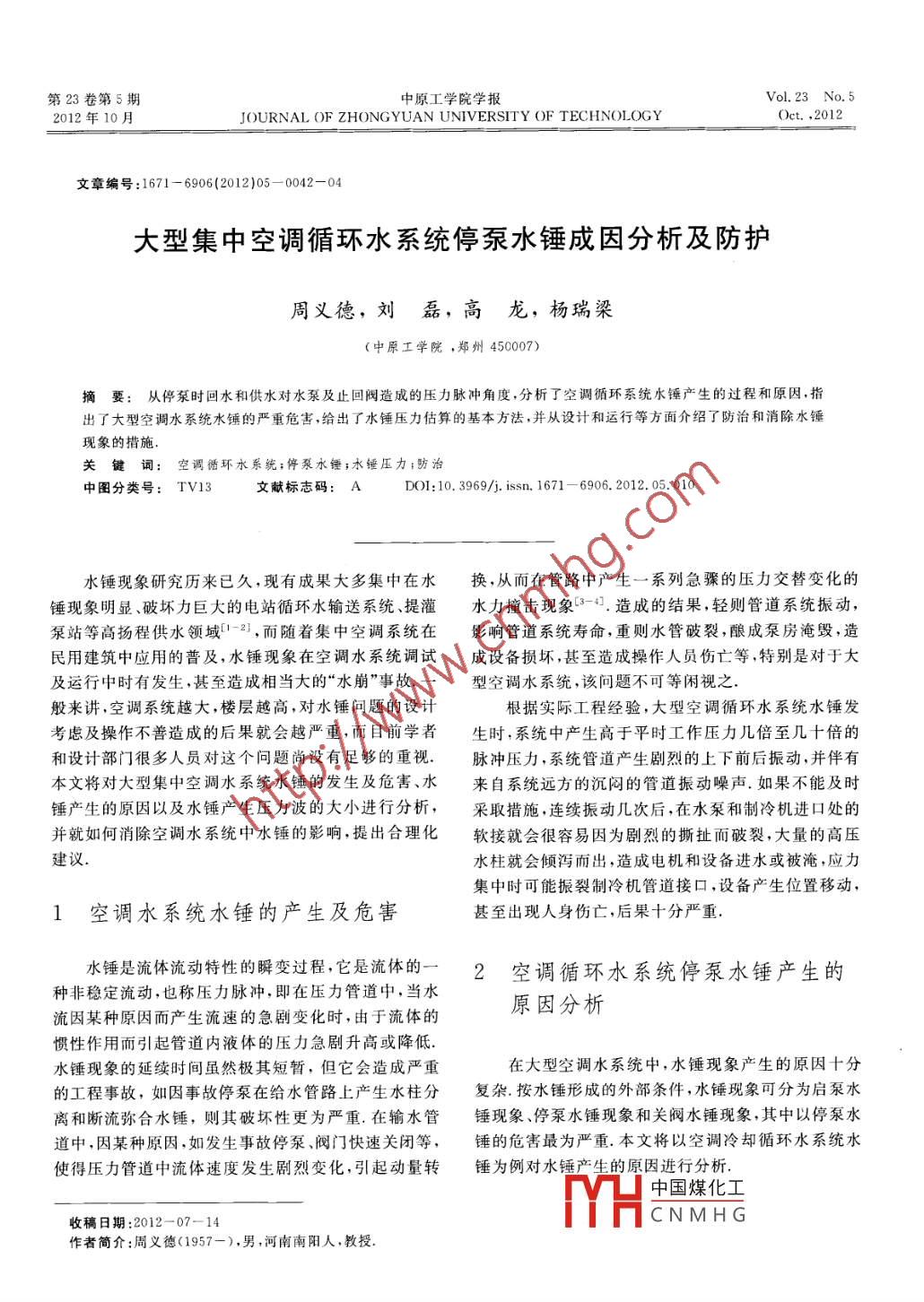 第23卷第5期中原工學(xué)院學(xué)報(bào)Vol. 23 No. 52012年10月JOURNAL 0F ZHONGYUAN UNIVERSITY OF TECHNOLOGYOct. ,2012文章編號(hào):1671- 6906(2012)05 - 0042- -04大型集中空調(diào)循環(huán)水系統(tǒng)停泵水錘成因分析及防護(hù)周義德,劉磊,高龍,楊瑞梁(中原工學(xué)院,鄭州450007)摘要:從停泵時(shí)回水和供水對(duì)水泵及止回閥造成的壓力脈沖角度,分析了空調(diào)循環(huán)系統(tǒng)水錘產(chǎn)生的過程和原因,指出了大型空調(diào)水系統(tǒng)水錘的嚴(yán)重危害,給出了水錘壓力估算的基本方法,并從設(shè)計(jì)和運(yùn)行等方面介紹了防治和消除水錘現(xiàn)象的措施.關(guān)鍵詞:空調(diào)循環(huán)水系統(tǒng);停泵水錘;水錘壓力;防治中圖分類號(hào): TV13文獻(xiàn)標(biāo)志碼: ADO1:10. 3969/j. issn. 1671 - 6906. 2012. 05. 010水錘現(xiàn)象研究歷來已久,現(xiàn)有成果大多集中在水換,從而在管路中產(chǎn)生一.系列急驟的壓力交替變化的錘現(xiàn)象明顯、破壞力巨大的電站循環(huán)水輸送系統(tǒng)、提灌水力撞擊現(xiàn)象C3-41.造成的結(jié)果,輕則管道系統(tǒng)振動(dòng),泵站等高揚(yáng)程供水領(lǐng)域1-2],而隨著集中空調(diào)系統(tǒng)在影響管道系統(tǒng)壽命,重則水管破裂,釀成泵房淹毀,造民用建筑中應(yīng)用的普及,水錘現(xiàn)象在空調(diào)水系統(tǒng)調(diào)試成設(shè)備損壞,甚至造成操作人員傷亡等,特別是對(duì)于大及運(yùn)行中時(shí)有發(fā)生,甚至造成相當(dāng)大的“水崩”事故.一型空調(diào)水系統(tǒng),該問題不可等閑視之.般來講,空調(diào)系統(tǒng)越大,樓層越高,對(duì)水錘問題的設(shè)計(jì)根據(jù)實(shí)際工程經(jīng)驗(yàn),大型空調(diào)循環(huán)水系統(tǒng)水錘發(fā)考慮及操作不善造成的后果就會(huì)越嚴(yán)重,而目前學(xué)者生時(shí),系統(tǒng)中產(chǎn)生高于平時(shí)工作壓力幾倍至幾十倍的和設(shè)計(jì)部門很多人員對(duì)這個(gè)問題尚沒有足夠的重視.脈 沖壓力,系統(tǒng)管道產(chǎn)生劇烈的上下前后振動(dòng),并伴有本文將對(duì)大型集中空調(diào)水系統(tǒng)水錘的發(fā)生及危害、水.來自系統(tǒng)遠(yuǎn)方的沉悶的管道振動(dòng)噪聲.如果不能及時(shí)錘產(chǎn)生的原因以及水錘產(chǎn)生壓力波的大小進(jìn)行分析,采取措施,連續(xù)振動(dòng)幾次后,在水泵和制冷機(jī)進(jìn)口處的并就如何消除空調(diào)水系統(tǒng)中水錘的影響,提出合理化軟接就會(huì)很容易因?yàn)閯×业乃撼抖屏?大量的高壓建議.水柱就會(huì)傾瀉而出,造成電機(jī)和設(shè)備進(jìn)水或被淹,應(yīng)力集中時(shí)可能振裂制冷機(jī)管道接口,設(shè)備產(chǎn)生位置移動(dòng),1空調(diào)水系統(tǒng)水錘的產(chǎn)生及危害甚至出現(xiàn)人身傷亡,后果十分嚴(yán)重.水錘是流體流動(dòng)特性的瞬變過程,它是流體的一2空調(diào)循環(huán)水系統(tǒng)停泵水錘產(chǎn)生的種非穩(wěn)定流動(dòng),也稱壓力脈沖,即在壓力管道中,當(dāng)水原因分析流因某種原因而產(chǎn)生流速的急劇變化時(shí),由于流體的慣性作用而引起管道內(nèi)液體的壓力急劇升高或降低.水錘現(xiàn)象的延續(xù)時(shí)間雖然極其短暫,但它會(huì)造成嚴(yán)重在大型空調(diào)水系統(tǒng)中,水錘現(xiàn)象產(chǎn)生的原因十分的工程事故,如因事故停泵在給水管路上產(chǎn)生水柱分復(fù)雜.按水錘形成的外部條件,水錘現(xiàn)象可分為啟泵水離和斷流彌合水錘,則其破壞性更為嚴(yán)重.在輸水管錘現(xiàn)象、停泵水錘現(xiàn)象和關(guān)閥水錘現(xiàn)象,其中以停泵水道中,因某種原因,如發(fā)生事故停泵、閥門快速關(guān)閉等,錘的危害最為嚴(yán)重.本文將以空調(diào)冷卻循環(huán)水系統(tǒng)水使得壓力管道中流體速度發(fā)生劇烈變化,引起動(dòng)量轉(zhuǎn)錘為例對(duì)水錘產(chǎn)生的原因進(jìn)行分析.中國煤化工收稿日期:2012 -07-14MHCNMHG作者簡(jiǎn)介:周義德(1957-).男,河南南陽人,教授..第5期周義德,等:大型集中空調(diào)循環(huán)水系統(tǒng)停泵水錘成因分析及防護(hù)2.1 水錘產(chǎn)生的過程2.2.2系統(tǒng)靜 壓水位高在大型集中空調(diào)系統(tǒng)運(yùn)行中,由于空調(diào)泵站工作系統(tǒng)靜壓水位越高,回水管儲(chǔ)存的能量就越大.一人員操作不當(dāng)、突然停電、外電網(wǎng)事故跳閘或其他原因旦水泵突然停止運(yùn)轉(zhuǎn),回水管內(nèi)的水流不會(huì)立即停止,導(dǎo)致水泵機(jī)組突然斷電而停機(jī),此時(shí)在泵站及管路系在高靜壓水位的作用下,產(chǎn)生的水力沖擊就越大.在系統(tǒng)中最容易發(fā)生的一種水錘現(xiàn)象,稱之為停泵水錘.如統(tǒng)靜壓水位高于20m時(shí),應(yīng)該注意這個(gè)問題.圖1所示,當(dāng)水泵緊急關(guān)閉時(shí),水泵的慣性制動(dòng)快于系2.2.3采用 單側(cè)離心泵統(tǒng)中水流的減速,系統(tǒng)較大時(shí),大量高速的水流由于慣由于單側(cè)離心泵葉輪的結(jié)構(gòu)特點(diǎn),停泵時(shí),葉輪在性繼續(xù)在管道內(nèi)流動(dòng),而在瞬間停滯的水泵葉片端面失去動(dòng)力的情況下快速停止,此時(shí)大量的水流無法順處受阻,在點(diǎn)2處產(chǎn)生的高壓如果不能及時(shí)釋放,將形利通過葉輪流向前方,葉輪對(duì)水流產(chǎn)生巨大的