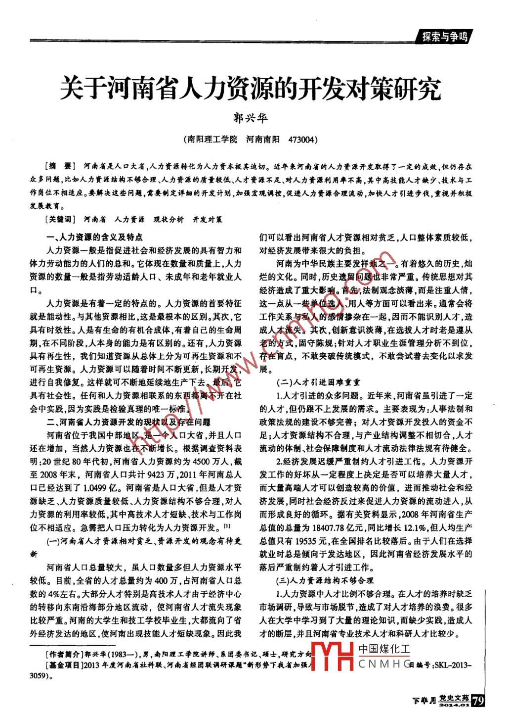 探索與爭鳴關于河南省人力資源的開發(fā)對策研究郭興華(南陽理工學院河南南陽473004)[摘要]河南省是人口大省,人力資源轉化為人力資本極其迫切。近年來河南省的人力資源開發(fā)取得了一定的成效,但仍存在眾多問題,比如人力資源結構不夠合理、人力資源的質量較低、人才資源不足、對人力資源利用率不高,其中高技能人才缺少、技術與工作崗位不相適應。要解決這些問題,需要制定詳細的開發(fā)計劃,加強宏觀調控,促進人力資源合理流動,加快人才引進步伐,重視并積極發(fā)展教育。[關鍵詞]河南省人力資源現(xiàn)狀分析開發(fā)對策-、人力資源的含義及特點們可以看出河南省人才資源相對貧乏,人口整體素質較低,人力資源一般是指促進社會和經濟發(fā)展的具有智力和對經濟發(fā)展帶來很大的負擔。體力勞動能力的人們的總和。它體現(xiàn)在數(shù)量和質量上,人力河南為中華民族主要發(fā)祥地之一。有著悠久的歷史,燦資源的數(shù)量-般是指勞動適齡人口、未成年和老年就業(yè)人爛的文化。 同時,歷史遺留問題也非常嚴重。傳統(tǒng)思想對其口。經濟造成了重大影響。首先,法制觀念淡薄,而是注重人情,人力資源是有著一定的特點的。人力資源的首要特征這一點從一些單位選人、用人等方面可以看出來。通常會將就是能動性。與其他資源相比,這是最根本的區(qū)別。其次,它工作關系 與私人的感情摻雜在-起,因而不能識別人才,造具有時效性。人是有生命的有機合成體,有著自己的生命周成人才流失。其次,創(chuàng)新意識淡薄,在選拔人才時老是遵從期,在不同階段,人本身的能力是有區(qū)別的。還有,人力資源老的方式,固守陳規(guī);針對人才職業(yè)生涯管理分析不到位,具有再生性,我們知道資源從總體上分為可再生資源和不存在盲點, 不敢突破傳統(tǒng)模式,不敢嘗試著去變化以求發(fā)可再生資源。人力資源可以隨著時間不斷更新,長期開發(fā),展。進行自我修復。這樣就可不斷地延續(xù)地生產下去。最后,它(二)人才引進困難重重.具有社會性。任何和人力資源相聯(lián)系的東西都離不開在社1.人才引進的眾多問題。近年來,河南省雖引進了一定會中實踐,因為實踐是檢驗真理的唯-標準。的人才,但仍跟不上發(fā)展的需求。主要表現(xiàn)為:人事法制和二、河南省人力資源開發(fā)的現(xiàn)狀以及存在問題政策法規(guī)的建設不夠完善;對人才資源開發(fā)投入的資金不河南省位于我國中部地區(qū),是一個人口大省,并且人口足;人才資源結構不合理,與產業(yè)結構調整不相切合,人才還在增加,當然人力資源也在不斷增長。根據(jù)調查資料表流動的體制社會保障制度和人才流動法律法規(guī)有待健全。明:20世紀80年代初,河南省人力資源約為4500萬人,截2.經濟發(fā)展遲緩嚴重制約人才引進工作。人力資源開至2008年末,河南省人口共計9423萬,2011年河南總人發(fā)工作的好壞從一 定程度上決定是否可以培養(yǎng)大量人才,口已經達到了1.0499 億。河南省是人口大省,但是人才資而大量高端人才可以創(chuàng)造較高的價值,進而推動社會和經源缺乏、人力資源質量較低、人力資源結構不夠合理,對人濟發(fā)展,同時社會經濟反過來促進人力資源的流動進入,從力資源的利用率較低,其中高技術人才短缺技術與工作崗而形 成良好的循環(huán)。據(jù)有關資料顯示,2008年河南省生產位不相適應。急需把人口壓力轉化為人力資源開發(fā)。1總值的總量為18407.78 億元,同比增長12.1%,但人均生產(一)河南省人才資源相對貧乏、資源開發(fā)的觀念有待更總值只有19535 元,在全國排名比較落后。由于人們在選擇新就業(yè)時總是傾向于發(fā)達地區(qū),因此河南省經濟發(fā)展水平的河南省人口總量較大,雖人口數(shù)量多但人力資源水平落后嚴重制約著人才引進工作。較低。目前,全省的人才總量約為400萬,占河南省人口總(三)人力資源結構不夠合理數(shù)的4%左右。大部分人才特別是高技術人才由于經濟中心1.人力資源中人才比例不夠合理。在人才的培養(yǎng)時缺乏的轉移向東南沿海部分地區(qū)流動,使河南省人才流失現(xiàn)象市場調研,導致與市場脫節(jié),造成了對人才培養(yǎng)的浪費。很多比較嚴重。河南的大學生和技工學校畢業(yè)生,大都流向了省人在大學中學習 到了大量的理論知識,而缺少實踐,造成人外經濟發(fā)達的地區(qū),使河南出現(xiàn)技能人才短缺現(xiàn)象。因此我才的斷層,并且河南省專業(yè)技術人才和科研人才比較少。中國煤化工[作者簡介]郭興華(1983- -),男,南陽理工學院講師、系團委書記.碩士,研究方向[基金項目]2013年度河南省社科聯(lián)、河南省經團聯(lián)調研課題“新形勢下我省加強/:YHCNMHG目編號:SKL2013-3059)。下非周堂史文苑79.