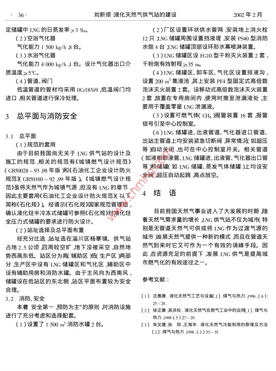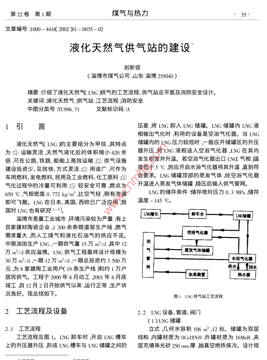 第22卷第1期煤氣與熱力35文章編號:1000-44162002)1-0035-02液化天然氣供氣站的建設(shè)劉新領(lǐng)淄博市煤氣公司山東淄博25040)摘要介紹了液化天然氣ING烘氣的工藝流程、供氣站總平面及消防安全設(shè)計。關(guān)鍵詞液化天然氣洪氣站江藝流程消防安全中圖分類號:IU996.71文獻標(biāo)識碼:A1引言壓差將LNG卸入LNG儲罐。LNG儲罐內(nèi)LNG液相輸出氣化時利用的設(shè)備是空浴氣化器。當(dāng)LNG液化天然氣(LNG)的主要組分為甲烷,其特點儲罐內(nèi)的ING壓力較低時,般應(yīng)開儲罐區(qū)的升壓為①運輸靈活天然氣液化后的體積縮小620余器升壓將LNG液相送入空浴氣化器NG在其內(nèi)倍可在公路、鐵路、船舶上高效運輸供氣設(shè)施發(fā)生相變并升溫。若空浴氣化器出口IN氣相溫建設(shè)投資少、見效快、方式靈活:用途廣可作為度低于5℃則應(yīng)開啟水浴氣化器將其升溫直到符車用燃料發(fā)電燃料、民用及工業(yè)燃料化工原料合要求。ING儲罐頂部的蒸發(fā)氣體經(jīng)空浴氣化器氣化過程中的冷量可利用;較安全可靠燃點為升溫進入蒸發(fā)氣體儲罐穩(wěn)壓后輸入供氣管網(wǎng)。650℃氕氣相密度0.772kg/m3北比空氣輕稍有泄漏ING的儲存條件儲存絕對壓力0.3MPa,儲存即可飛散。ING在日本、美國、西歐已廣泛應(yīng)用我溫度-145℃。國對LNG也有研究1-31LYG檜車卸車臺淄博市是重工業(yè)城市環(huán)境污染較為嚴重有上LC儲百家建材陶瓷企業(yè),1200余條輥道窯生產(chǎn)線燃氣需求量大而人工煤氣和液化石油氣的供應(yīng)不足空浴氣化器中原油田生產(chǎn)LNG,期供氣量15萬m3/d其中12萬m3d供應(yīng)淄博。LNG供氣工程最終設(shè)計規(guī)模為蒸發(fā)氣體儲健30萬m3/d,期12萬m3/d,期總投資約3500萬水浴氣化器元為8家建陶工業(yè)用戶(19條生產(chǎn)線廂約1萬戶回水居民供氣。工程于2000年8月動工2001年8月底加臭裝量熱水器竣工自12月2日開始供氣以來運行正常生產(chǎn)狀況良好。現(xiàn)總結(jié)如下。圖1LNG供氣站工藝流程2工藝流程及設(shè)備2.2LNG設(shè)備、管道、閥門(1)ING儲罐2.1工藝流程立式幾何水容積106m3,12臺。儲罐為雙層工藝流程見圖1。ING卸車時開啟ING槽車結(jié)構(gòu)內(nèi)罐材質(zhì)為Cr8N9外罐材質(zhì)為16MnR夾上的升壓器升壓形成ING槽車與LNG儲罐之間的層充填珠光砂250mm厚抽真空絕熱保冷。設(shè)計規(guī)劉新領(lǐng)液化天然氣供氣站的建設(shè)2002年2月定儲罐中LNG的日蒸發(fā)率≯3%(2)廠區(qū)設(shè)置環(huán)狀供水管網(wǎng)安裝地上消火栓(2)空浴氣化器12只iNG儲罐周圍設(shè)置擋液堤安裝PS40型消防氣化能力1500kg/h8臺。水炮4臺ING儲罐頂部設(shè)環(huán)形水幕噴淋裝置。(3)水浴氣化器(3)LNG儲罐區(qū)設(shè)FG10型干粉滅火裝置2套氣化能力4000kg/hl臺。設(shè)計氣化器出口介干粉炮有效射程≥35m質(zhì)溫度≥5℃。4)ING儲罐區(qū)、卸車區(qū)、氣化區(qū)設(shè)置排液溝(4)管道、閥設(shè)置200m3集液池其上安裝PF4型固定式高倍數(shù)低溫管道的管材均采用oCrl8N,低溫閥門均泡沬滅火裝置2套。設(shè)移動式高倍數(shù)泡沫滅火裝置進口相關(guān)管道進行保冷處理。2套放置在專用房間內(nèi)使用時推至泄漏液處,主要用于覆蓋零星LNG泄漏液。3總平面與消防安全(5)設(shè)置可燃氣體(CH4)報警裝置16套報警信號引至中心控制室。3.1總平面(6)ING儲罐進、出液管道、氣化器進囗管道、(1)規(guī)范的套用出站主管道上均安裝緊急切斷閥異常情況如超壓由于目前我國尚無關(guān)于LNG供氣站的設(shè)計及等)動關(guān)閉,也可在中心控制室開關(guān)。相關(guān)管道施工的規(guī)范相關(guān)的規(guī)范有《城鎮(zhèn)燃氣設(shè)計規(guī)范》(如液相卸液管、ING儲罐進、出液管、氣化器出口管GB5008-%3閃8年版廂《石油化工企業(yè)設(shè)計防火等和儲罐(如ING儲罐、蒸發(fā)氣體儲罐)均設(shè)安規(guī)范XGB50160-9年版》《城鎮(zhèn)燃氣設(shè)計規(guī)全閥超壓自動起跳高點放空。范》雖將夭然氣作為城鎮(zhèn)氣源但沒有LNG的章節(jié)因此主要套用《石油化工企業(yè)設(shè)計防火規(guī)范X以下4結(jié)語簡稱《石化規(guī)》經(jīng)請示《石化規(guī)》國家規(guī)范管理組確認液化烴半冷凍式儲罐可參照《石化規(guī)》液化烴目前我國天然氣事業(yè)進入了大發(fā)展的時期隨全壓力式儲罐的要求進行防火設(shè)計。著天然氣需求量的增長JNG供氣站不僅為城市特(2)站址選擇及總平面布置別是無管道天然氣可供或?qū)NG作為過渡氣源的經(jīng)充分比選站址選在淄川區(qū)楊寨鎮(zhèn)。供氣站城市發(fā)展天然氣提供一種新的模式而且在管道天占地2.5公頃四周較空曠地下沒被采空自然地然氣到來時它又可作為一個有效的調(diào)峰手段。因勢西高東低。站區(qū)分為高輔助區(qū)生產(chǎn)區(qū)兩部此在資源充足的前提下發(fā)展ING供氣是提高城分生產(chǎn)區(qū)中設(shè)有ING儲罐區(qū)和氣化區(qū)輔助區(qū)中市燃氣化的有效途徑之設(shè)有輔助用房和消防水罐。由于主風(fēng)向為西南風(fēng),儲罐設(shè)在低站區(qū)的東北側(cè)站區(qū)平面布置較為安全參考文獻合理3.2消防、安全[1]沈惠康,液化天然氣工藝與設(shè)備J]煤氣與熱力,996,(6)本著安全第一預(yù)防為主的原則對消防設(shè)施[2]徐正康吳洪松,液化天然氣在燃氣工業(y