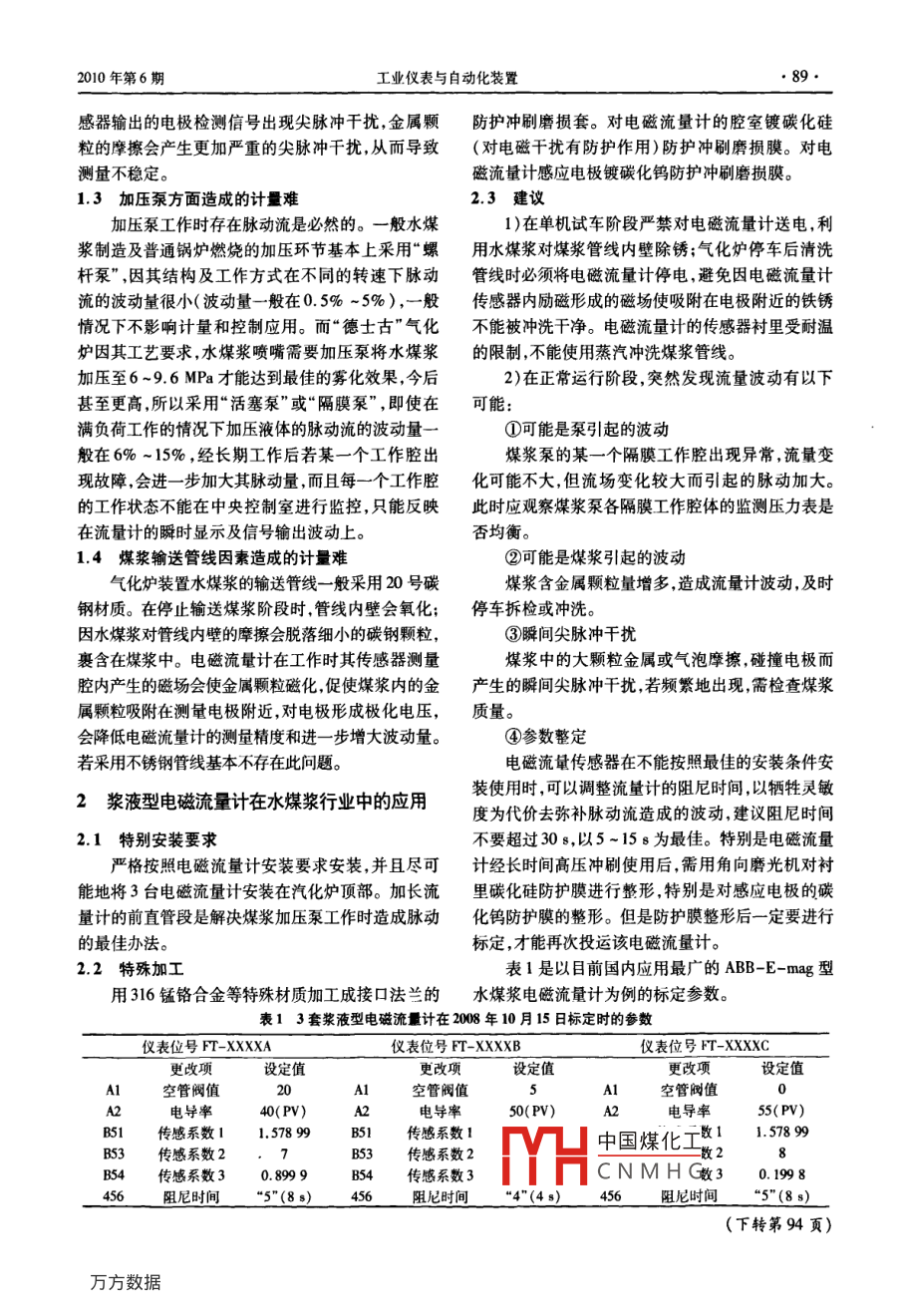 工業(yè)儀表與自動化裝置2010年第6期漿漩型電磁流量計在煤化工水煤漿流量測量中的應(yīng)用薛凌飛陳玉進,蘇小龍,李鎮(zhèn)春延長石油榆林煤化有限公司榆林供電局,陜西榆林71900摘要:通過對煤化工生產(chǎn)中水煤漿計量難的分析,有針對性地解決了水煤漿電磁流量計在具體應(yīng)用中存在的問題。為煤化工設(shè)計院、水煤漿電磁流量計制造廠家、化工生產(chǎn)企業(yè)的工作改進提供可靠的依據(jù)。關(guān)鍵詞:煤化工;水煤漿;漿液型電磁流量計;計量;參數(shù)整定中圖分類號:TP277文獻標(biāo)志碼:A文章編號:1000-0682(2010)06-0088-02Application of serous fluid type electromagnetism flowmeterin the coal chemical industry water-coal-slurry flow measurementXUE Lingfei, CHEN Yujin, SU Xiaolong, LI ZhenchunYanchang Petroleum Group Yulin Coal Chemical Co. Lad., Power SupplyBureau of Yulin, Shaanxi yulin 719000, China)Abstract: Calculate difficult analysis through water-coal-slurry in the coal chemical industrys pro-duction, fix and adjust to try actual angle to set out from the check, aim at the slurry electromagnetismflowmeter of sex ground effective solution water coal is concretely applying medium blemish and congenitalhortage. the check that designs production business enterprise in the hospital, water-coal-slurry electro-magnetism flowmeter manufactory house and chemical industry for the coal chemical industry fixs unit toprovide dependable science basis and promise the coal chemical industry water-coal-slurry calculates ofaccurate and dependableKey words: coal chemical industry: water-coal-slurry; serous fluid type electromagnetism flowe-ter; calculate; parameter setting0引言但是,在電磁流量計實際應(yīng)用中由于工頻干擾流體介質(zhì)產(chǎn)生的電化學(xué)干擾等,仍存在計量難的問題1990年,山東魯南化肥廠在中國第一次成功引進了“德士古”型氣化爐制煤氣技術(shù),隨之“對置式1水煤漿的計量難點四噴嘴新型氣化爐”、“魯奇BCGL氣化爐”、“西門子1.1水煤漿成分復(fù)雜導(dǎo)致計量相關(guān)設(shè)備易損壞GSP氣化爐”、“CE高壓氣化爐”等氣化爐制煤氣技因煤炭在采掘過程中常有各種金屬物輸送到棒術(shù)很快在中國得到了廣泛應(yīng)用。磨機或球磨機里,和造紙廢液、甲醇廢水等添加劑進新型的煤化工工藝和惡劣多變的現(xiàn)場條件,導(dǎo)行研磨生成含水量為60%-70%、操作密度為1250致水煤漿流量監(jiān)測不穩(wěn)定問題始終困擾著各個煤化-1286kg/m3、動力黏度為700-30p的水煤漿。工企業(yè)與流量計廠家。棒磨機或球磨機在研磨煤炭時碰撞會進一步脫落部經(jīng)眾多流量計廠家和媒化工企業(yè)共同開發(fā)的基分金屬顆粒,后續(xù)設(shè)備不可能完全濾除計量過程中于速度式測量原理的“漿液型電磁流量計”是測量的沖擊容易造成加壓泵及其計量設(shè)備的損壞。煤化工水煤漿流量的首選流量計。12V凵中國煤化工量難收稿日期:2010-07-15CNMHG兩相混合導(dǎo)電性介作者簡介:薛凌飛延長石油榆林媒化有限公司工程師主要從質(zhì)流量時,在固體顆?;蛘呃w維介質(zhì)擦過電極表面事儀表控制的調(diào)試與研究相關(guān)工作時電極表面的接觸電化學(xué)電勢突然變化,造成從傳2010年第6期工業(yè)儀表與自動化裝置感器輸出的電極檢測信號出現(xiàn)尖脈沖干擾,金屬顆防護沖刷磨損套。對電磁流量計的腔室鍍碳化硅粒的摩擦?xí)a(chǎn)生更加嚴重的尖脈沖干擾,從而導(dǎo)致(對電磁干擾有防護作用)防護沖刷磨損膜。對電測量不穩(wěn)定磁流量計感應(yīng)電極鍍碳化鎢防護沖刷磨損膜。13加壓泵方面造成的計量難2.3建議加壓泵工作時存在脈動流是必然的。一般水煤1)在單機試車階段嚴禁對電磁流量計送電,利漿制造及普通鍋爐燃燒的加壓環(huán)節(jié)基本上采用“螺用水煤漿對煤漿管線內(nèi)壁除銹;氣化爐停車后清洗桿泵”,因其結(jié)構(gòu)及工作方式在不同的轉(zhuǎn)速下脈動管線時必須將電磁流量計停電,避免因電磁流量計流的波動量很小(波動量一般在0.5%~5%),一般傳感器內(nèi)勵磁形成的磁場使吸附在電極附近的鐵銹情況下不影響計量和控制應(yīng)用。而“德士古”氣化不能被沖洗干凈。電磁流量計的傳感器襯里受耐溫爐因其工藝要求,水煤漿噴嘴需要加壓泵將水煤漿的限制,不能使用蒸汽沖洗煤漿管線。加壓至6~96MPa才能達到最佳的霧化效果,今后2)在正常運行階段,突然發(fā)現(xiàn)流量波動有以下甚至更高,所以采用“活塞泵”或“隔膜泵”,即使在可能滿負荷工作的情況下加壓液體的脈動流的波動量一①可能是泵引起的波動般在6%~15%,經(jīng)長期工作后若某一個工作腔出煤漿泵的某一個隔膜工作腔出現(xiàn)異常,流量變現(xiàn)故障,會進一步加大其脈動量,而且每一個工作腔化可能不大,但流場變化較大而引起的脈動加大的工作狀態(tài)不能在中央控制室進行監(jiān)控,只能反映此時應(yīng)觀察煤漿泵各隔膜工作腔體的監(jiān)測壓力表是在流量計的瞬時顯示及信號輸出波動上否均衡。14煤漿輸送管線因素造成的計量難②可能是煤漿引起的波動氣化爐裝置水煤漿的輸送管線一般采用20號碳煤漿含金屬顆粒量增多,造成流量計波動,及時鋼材質(zhì)。在停止輸送煤漿階段時,管線內(nèi)壁會氧化;停車拆檢或沖洗。因水煤漿對管線內(nèi)壁的摩擦?xí)撀浼毿〉奶间擃w粒,③瞬間尖脈沖干擾裹含在煤漿中。電磁流量計在工作時其傳