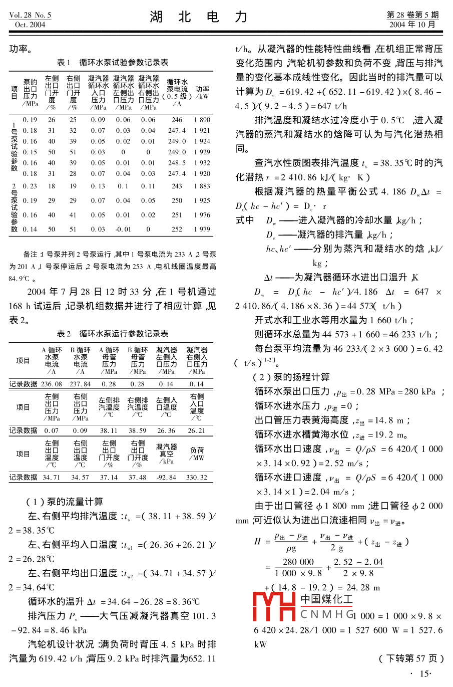 第28卷第5期湖北電力Vol.28 No. 52004年10月Oct. 2004降低循環(huán)水泵流量揚(yáng)程增 加機(jī)組效益姜愛(ài)民陳國(guó)松.(湖北西塞山發(fā)電股份有限公司,湖北黃石435001 )[摘要]西塞山發(fā)電廠1號(hào)機(jī)2臺(tái)循環(huán)水泵安裝完后在機(jī)組未運(yùn)行情況下進(jìn)行性能試驗(yàn)發(fā)現(xiàn)水泵電機(jī)軸功率超過(guò)水泵性能曲線.上的最大功率。在水泵性能曲線有疑問(wèn)且循環(huán)水流量不能準(zhǔn)確測(cè)量的情況下利用熱力平衡原理和水泵功率計(jì)算公式計(jì)算分析、最終判斷性能曲線是否正確并對(duì)循環(huán)水泵進(jìn)行改造達(dá)到最優(yōu)化設(shè)計(jì)值大大增加機(jī)組效益。[關(guān)鍵詞]循環(huán)水泵;熱平衡計(jì)算;判斷;流量揚(yáng)程[中圖分類號(hào) ] TK264. 1. [文獻(xiàn)標(biāo)識(shí)碼] A [文章編號(hào)] 1006-3986( 2004 )05-0014-02Increasing Efficiency of Generating Sets by Decreasing the Liftof Circulating W ater PumpJIANG Ai-min CHEN Guo-song( Hubei Xisaishan Power Generation Co. ,Lud. ,Huangshi Hubei 435001 China )[ Abstract ] After the completion of circulating water pump installation in Xisaishan Power Plant performancetest was carried out and it was found that the shaft load of pump motor exceeded the maximum value accordingto its performance curve. Because the accurate determination of the flow capacity of circulating water was diffi-cult ,the analysis based on thermodyinamic equilibrium theory and the algorithm of pump power was made todetermine whether the performance curve was right or not. The innovation on the circulating water pump wasmade in order to achieve its optimized design value and to increase the efficiency of the generating sets.[ Key words ] circulating water pump ; thermal balancing calculation ; determination ; flow lift西塞山發(fā)電廠2x330 MW機(jī)組項(xiàng)目于2002年流量5.3 m'/s ;8月動(dòng)工,2004年5月24日1號(hào)機(jī)組首次并網(wǎng)發(fā)揚(yáng)程25.5m;電。循環(huán)水泵設(shè)計(jì)用2臺(tái)長(zhǎng)沙水泵廠生產(chǎn)的效率87% ;72LKXC-25型大型立式斜流泵冬季開(kāi)一臺(tái)泵夏季轉(zhuǎn)速370 r/min ;開(kāi)2臺(tái)泵。1 號(hào)機(jī)水泵安裝于2004年2月12日驗(yàn)軸功率:1524kW;收5月11日湖北省電力試驗(yàn)研究院對(duì)1號(hào)機(jī)組2配套軸功率1 800 kW。臺(tái)循環(huán)水泵進(jìn)行水泵性能試驗(yàn)本次試驗(yàn)發(fā)現(xiàn)2臺(tái)(2 )電機(jī)額定參數(shù)泵軸功率超過(guò)設(shè)計(jì)軸功率和電機(jī)額定功率影響機(jī)功率:1 800kW;組安全滿負(fù)荷運(yùn)行并增加了水泵單耗增加了「”用額定電流243A ;電率。為此我們?cè)谘h(huán)水泵流量測(cè)量不準(zhǔn)的情況下功率因數(shù)0.76 ;通過(guò)熱平衡計(jì)算判斷循環(huán)水泵可以通過(guò)改造降低流效率94.5%。量和揚(yáng)程從而降低軸功率達(dá)到減少循環(huán)水泵單耗,(3)5月11日循環(huán)水泵試驗(yàn)參數(shù)(見(jiàn)表1 )增加機(jī)組效益的目的。從表1從試驗(yàn)數(shù)據(jù)分析,電機(jī)功率和電流顯然1泵、 電機(jī)和試驗(yàn)參數(shù)分析計(jì)算已超過(guò)了額定功率和額定電流,此時(shí)循環(huán)水泵的性能曲中國(guó)煤化工:性能曲線求水泵軸功(1)循環(huán)水泵額定參數(shù)率。YHCNMHG機(jī)的狀態(tài)下進(jìn)行,且循環(huán)水流量測(cè)量數(shù)據(jù)在20%范圍內(nèi)擺動(dòng),不能作為試[收稿日期] 2004-08-30[作者簡(jiǎn)介] 姜愛(ài)民( 1973- )男湖北黃石人工程師。驗(yàn)數(shù)據(jù)。因此有效辦法是通過(guò)機(jī)組開(kāi)啟后的熱力平衡原理計(jì)算出循環(huán)水流量和揚(yáng)程并由此算出泵的軸Vol. 28 No. 5湖北電力第28卷第5期Oct. 20042004年10月功率。V/h。從凝汽器的性能特性曲線看在機(jī)組正常背壓表1循環(huán)水泵 試驗(yàn)參數(shù)記錄表變化范圍內(nèi)汽輪機(jī)初參數(shù)和負(fù)荷不變背壓與排汽泵的車側(cè)有側(cè)凝汽器凝汽器凝汽器循環(huán)水量的變化基本成線性變化。因此當(dāng)時(shí)的排汽量可以1口 循環(huán)水循環(huán)水循環(huán)水景電流功率門開(kāi)入日車側(cè)出有側(cè)出(0.5級(jí))/kW計(jì)算為D。=619.42 +( 652. 11 -619.42 )x( 8.46-/MPa% /% AMPa /MPa /MPa4.5 )( 9.2-4.5 )=647 t/h .0.19 20.06 0.06246 1 890排汽溫度和凝結(jié)水過(guò)冷度小于0.5C ,進(jìn)入凝.號(hào)0.18 332 0.07 0.03 0.04247.4 1 921汽器的蒸汽和凝結(jié)水的焓降可認(rèn)為與汽化潛熱相泵0.16 40390.050.02 0.01249.01 924驗(yàn)0.15 50 51 0.03 0 0249.0 1 929同。參0.16 400.05 0.01 0.01248.5 1 932查汽水性質(zhì)圖表排汽溫度1。= 38.35C時(shí)的汽0.18 31 28 0.07 0.04 0.03 247.4 1 920化潛熱r =2 410. 86 kJ/( kg. K)已0.230.130.1 0.11243 1 883根據(jù)凝汽器的熱量平衡公式4.186D.Ot=泵0.19 29290.07.0.04 0.05 250 1 925式D.(hc-hc')=D。r驗(yàn)0.16 4041 0.05 0.01 0.02251 1 97式中D.一進(jìn)入凝汽器的冷卻水量kg/h ;數(shù)0.14 50510.030.01.0252 1 97D。一凝汽器的排汽量,kg/h ;hc、hc'一分別為蒸汽和凝結(jié)水的焓,kJ/備注1號(hào)泵并列2號(hào)泵運(yùn)行其中1號(hào)泵電流為233 A 2號(hào)泵為201A,1號(hào)泵停運(yùn)后2號(hào)泵電流為253A,電機(jī)線圈溫度最高kg ;84.9C。△t-為 凝汽器循環(huán)水進(jìn)出口溫升K2004年7月28日12時(shí)33分,在1號(hào)機(jī)通過(guò)D、=D(hc一he')/4.186△t=647x168 h試運(yùn)后,記錄機(jī)組數(shù)據(jù)并進(jìn)行了相應(yīng)計(jì)算,見(jiàn)24