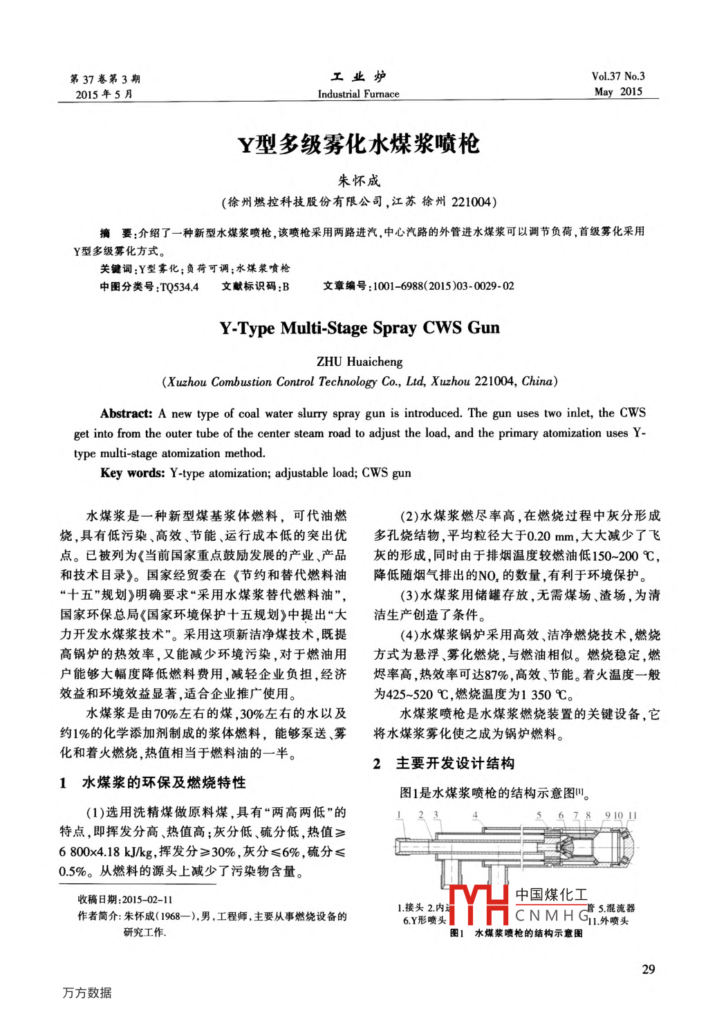 第37卷第3期工業(yè)妒Vol37 No. 32015年5月Industrial furnaceMay 2015Y型多級霧化水煤漿噴槍朱懷成徐州燃控科技股份有限公司,江蘇徐州221004)摘要:介紹了一種新型水煤漿噴槍,該噴槍釆用兩路進汽,中心汽路的外管進水煤漿可以調節(jié)負荷,首級霧化采用Y型多級霧化方式。關鍵詞:Y型霧化;負荷可調;水煤漿噴槍中圖分類號:TQ5344文獻標識碼:B文章編號:1001-6988(201503-002902Y-Type Multi-Stage Spray CWS GunZHU Huaicheng(Xuzhou Combustion Control Technology Co, Ltd, Xuzhou 221004, China)Abstract: A new type of coal water slurry spray gun is introduced. The gun uses two inlet, the Cwsget into from the outer tube of the center steam road to adjust the load, and the primary atomization uses Ytype multi-stage atomization methodKey words: Y-type atomization; adjustable load; CWS gun水煤漿是一種新型煤基漿體燃料,可代油燃(2)水煤漿燃盡率高,在燃燒過程中灰分形成燒,具有低污染、高效、節(jié)能、運行成本低的突出優(yōu)多孔燒結物,平均粒徑大于020mm,大大減少了飛點。已被列為《當前國家重點鼓勵發(fā)展的產業(yè)、產品灰的形成,同時由于排煙溫度較燃油低150-200℃和技術目錄》。國家經貿委在《節(jié)約和替代燃料油降低隨煙氣排出的NO,的數量,有利于環(huán)境保護。“十五”規(guī)劃》明確要求“采用水煤漿替代燃料油(3)水煤漿用儲罐存放,無需煤場、渣場,為清國家環(huán)??偩帧秶噎h(huán)境保護十五規(guī)劃》中提出“大潔生產創(chuàng)造了條件。力開發(fā)水煤漿技術”。采用這項新潔凈煤技術,既提(4)水煤漿鍋爐采用高效、潔凈燃燒技術,燃燒髙鍋爐的熱效率,又能減少環(huán)境污染,對于燃油用方式為懸浮、霧化燃燒,與燃油相似。燃燒穩(wěn)定,燃戶能夠大幅度降低燃料費用,減輕企業(yè)負擔,經濟燼率高,熱效率可達87%,高效、節(jié)能。著火溫度一般效益和環(huán)境效益顯著,適合企業(yè)推廣使用。為425-520℃,燃燒溫度為1350℃。水煤漿是由70%左右的煤,30%左右的水以及水煤漿噴槍是水煤漿燃燒裝置的關鍵設備,它約1%的化學添加劑制成的漿體燃料,能夠泵送、霧將水煤漿霧化使之成為鍋爐燃料化和著火燃燒,熱值相當于燃料油的一半。2主要開發(fā)設計結構1水煤漿的環(huán)保及燃燒特性圖1是水煤漿噴槍的結構示意圖(1)選用洗精煤做原料煤,具有“兩高兩低”的6789101特點,即揮發(fā)分高、熱值高;灰分低、硫分低,熱值≥6800×418kJkg,揮發(fā)分≥30%,灰分≤6%,硫分≤0.5%。從燃料的源頭上減少了污染物含量。收稿日期:2015-02-11中國煤化工1接頭2內5混流器作者簡介:朱懷成(1968—),男,工程師,主要從事燃燒設備的6Y形噴頭CNMHG1外噴頭研究工作圖1水煤漿噴槍的結構示意圖驗交流:Y型多級霧化水煤漿噴槍水煤漿噴槍,包括一個水煤漿進漿管3,兩個蒸汽進汽管及噴頭,噴頭由混流器5、Y形噴頭6、撞擊筒7、內筒8、外筒9噴嘴10、外噴頭11構成。混流器5的左端分別設有內進汽管2、水煤漿進漿管3和外進汽管4,水煤漿進漿管3的內部套裝伸出其外端部的內進汽管2,水煤漿進漿管3的外部套裝外進汽管4內進汽管2的端頭、水煤漿進漿管3的側壁和外進汽管4的側壁上分別設有接頭1;混流器5的中部設有Y圖2水煤漿噴槍燃燒狀況圖形噴頭6,混流器5的右端設有前部套在Y形噴頭6上由于水煤漿中含有顆粒狀的煤,所以對水煤漿的內筒8和套裝內筒8的外筒9,外筒9與混流器5螺噴槍的噴嘴的磨損比較嚴重。一般連續(xù)使用3~4周紋連接。內筒8的前部呈喇叭口狀,喇叭口外緣固定左右就需要更換。圖3是老式水煤漿噴槍的使用磨在外筒9的內壁上,內筒8前部的喇叭口上開有多個損情況。與內外筒間隙相連通的孔,內筒8的內壁上設有撞擊筒7,外筒9的外端部設有外噴頭11,外噴頭與外筒9螺紋連接。外噴頭11上設有多個噴嘴10,多個噴嘴成環(huán)形布置?;炝髌?上開有多個分別與外進汽管4和內外筒間隙相連通的外圓周孔,并開有多個分別與水煤漿進漿管3和內筒8相連通的內圓周孔。圖3老式水煤漿噴槍使用磨損情況圖3工作原理新開發(fā)的水煤漿噴槍,采用兩路進汽,中心汽路的外管進水煤漿方式,正常使用時,通過調節(jié)兩水煤漿噴槍采用高速汽流對水煤漿進行多級路進汽量的比例,就可對負荷進行調節(jié)。當噴槍長霧化。噴槍頭中心進汽、外管進漿,一級霧化釆用Y時間使用,有較大磨損,出現霧化質量下降時,又可形噴孔,水煤漿經Y形噴孔噴出,混合流先多次撞擊通過調節(jié)汽路進汽量及比例來改善霧化質量,從而撞擊筒,然后再與蒸汽內混,最后混合流沖出噴嘴大大增加水煤漿噴槍的使用壽命。每只水煤漿噴槍形成霧化很細的水煤漿霧。由于采用多級霧化,霧售價在2-3萬,采用新型水煤漿噴槍,可以為用戶節(jié)化質量有保證,霧化顆粒度小,不易堵塞噴嘴。由于約大量的設備成本,經濟效益顯著。有兩個進汽管,雙汽道可以分別調節(jié)進汽量,通過調節(jié)進汽量的比例關系從而達到調節(jié)負荷及霧化5結語質量的功能。其結構簡單,使用方便,熱效率高,節(jié)水煤漿噴槍的設計特點能減排,具有廣泛的實用性。(1)一級霧化采用Y型油槍的結構,充分發(fā)揮Y4應用實例型噴嘴霧化效果好的特點。(2)采用多級霧化,霧化顆粒度小,霧化效果2005年,為江南電廠配套了一臺爐的水煤漿噴好,不易堵塞噴嘴。槍設備。由于水煤漿霧化效果不能和油相比,所以(3)采用雙汽道進汽方式,通過調節(jié)進