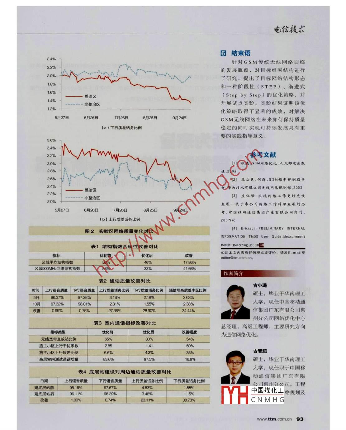 》RANPLAN.無(wú)線網(wǎng)絡(luò)規(guī)劃與優(yōu)化創(chuàng)新論壇(C ANPLanwww.ranplan.co.uk協(xié)辦基3 FSTEP的GSM結(jié)構(gòu)優(yōu)化古小璐古智趄中國(guó)移動(dòng)通信集團(tuán)廣東有限公司惠州分公司提出了一種基于STEP要素的網(wǎng)絡(luò)結(jié)構(gòu)優(yōu)化體系,通過(guò)轉(zhuǎn)變網(wǎng)絡(luò)發(fā)展方式,從結(jié)構(gòu)角度闡述了目標(biāo)網(wǎng)絡(luò)形摘要態(tài),并提出了長(zhǎng)期演進(jìn)的網(wǎng)絡(luò)結(jié)構(gòu)優(yōu)化策略,對(duì)無(wú)線網(wǎng)絡(luò)進(jìn)行重構(gòu)和優(yōu)化,從而解決了GSM網(wǎng)絡(luò)在發(fā)展中面臨的容量、覆蓋和質(zhì)量因素相互制約的瓶頸問題。關(guān)鍵詞GSM網(wǎng)絡(luò)結(jié)構(gòu)網(wǎng)絡(luò)優(yōu)化STEP0引言增加,頻率復(fù)用干擾增大,大量的高站容工程還導(dǎo)致網(wǎng)絡(luò)結(jié)構(gòu)快速變化,為滿足快速增長(zhǎng)的業(yè)務(wù)需求,和直放站加劇了干擾擴(kuò)散,導(dǎo)致載干比造成網(wǎng)絡(luò)質(zhì)量劇烈波動(dòng)、客戶感知.中國(guó)移動(dòng)GSM無(wú)線網(wǎng)絡(luò)通過(guò)長(zhǎng)期簡(jiǎn)單C/I不斷降低。設(shè)頻率復(fù)用距離為D,小度不斷降低。加站和粗放擴(kuò)容,規(guī)模急劇擴(kuò)大。在區(qū)覆蓋半徑為R,可用頻點(diǎn)數(shù)為M,小網(wǎng)絡(luò)發(fā)展初期這種方式能夠高效地提區(qū)平均載頻配置為E,則載干比C/I滿足3目標(biāo)網(wǎng)及STEP結(jié)構(gòu)優(yōu)化升容量,但隨著擴(kuò)容工程持續(xù)開展,公式( 1 )。策略網(wǎng)絡(luò)結(jié)構(gòu)逐漸復(fù)雜,網(wǎng)絡(luò)質(zhì)量劇烈波∈="k:qr=k員增針對(duì)傳統(tǒng)網(wǎng)絡(luò)的結(jié)構(gòu)弊端,為突動(dòng),頻率干擾急劇增加,網(wǎng)絡(luò)容量、破發(fā)展瓶頸、提升用戶感知,提出了覆蓋和質(zhì)量間的矛盾日益凸顯,網(wǎng)絡(luò)目標(biāo)網(wǎng)及其結(jié)構(gòu)優(yōu)化策略,通過(guò)轉(zhuǎn)變優(yōu)化難度越來(lái)越大,網(wǎng)絡(luò)遇到了嚴(yán)峻由公式(1)可見,載干比C/I與頻率發(fā)展方式,根據(jù)話務(wù)分布特點(diǎn)和用戶的發(fā)展瓶頸問題。因此,如何突破發(fā)復(fù)用距離D、可用頻點(diǎn)數(shù)M正相關(guān),與行為特性,在地域上將傳統(tǒng)二維平面展瓶頸,實(shí)現(xiàn)GSM網(wǎng)絡(luò)的可持續(xù)科學(xué)小區(qū)覆蓋半徑R和平均小區(qū)配置E負(fù)相網(wǎng)絡(luò)改造為立體層次網(wǎng)絡(luò),在功能上發(fā)展,已成為中國(guó)移動(dòng)網(wǎng)絡(luò)優(yōu)化專業(yè)關(guān)。持續(xù)建站及擴(kuò)容工程使頻率復(fù)用對(duì)網(wǎng)絡(luò)進(jìn)行強(qiáng)化和區(qū)分,在能效.上對(duì)的重要研究課題。距離D減小、小區(qū)配置E增大,當(dāng)可用資源利用實(shí)現(xiàn)提高和均衡,同時(shí)在手頻率資源M和小區(qū)覆蓋半徑R不變時(shí),段上開展創(chuàng)新和精細(xì)優(yōu)化。2傳統(tǒng)網(wǎng)絡(luò)結(jié)構(gòu)的發(fā)展瓶頸必然導(dǎo)致載干比C/I降低。傳統(tǒng)的無(wú)線網(wǎng)絡(luò)是一個(gè)物理結(jié)構(gòu)復(fù)因此,傳統(tǒng)網(wǎng)絡(luò)結(jié)構(gòu)的發(fā)中國(guó)煤化工構(gòu)雜、邏輯結(jié)構(gòu)簡(jiǎn)單、承載功能綜合、頻頸在于無(wú)法解決容量、覆蓋增MYHCN MH G網(wǎng)絡(luò)長(zhǎng)期發(fā)展的立率復(fù)用單-的二維平面網(wǎng)絡(luò),隨著容量求導(dǎo)致質(zhì)量降低的矛盾。同時(shí),擴(kuò)體層以網(wǎng)路,如圖1所示。目標(biāo)網(wǎng)形態(tài)90 TEl ECOMMUNICATIONSTECHNOLOGY/2012●11》RANPLAN.無(wú)線網(wǎng)絡(luò)規(guī)劃與優(yōu)化創(chuàng)新論壇(2)消除覆蓋功能:針對(duì)部分上行干擾水平。明顯改善,網(wǎng)絡(luò)質(zhì)量顯著提升。強(qiáng)干擾的高層站,可以通過(guò)向周邊基(2)載波池RRU拉遠(yuǎn):對(duì)重要站轉(zhuǎn)移覆蓋功能,消除其過(guò)覆蓋干擾室內(nèi)區(qū)域,可以通過(guò)RRU載波池拉遠(yuǎn)5.1結(jié)構(gòu)合理性改善影響改造,單個(gè)獨(dú)立信源小區(qū)吸收多棟室結(jié)構(gòu)指數(shù)表征了結(jié)構(gòu)的合理性,結(jié)(3)利舊機(jī)房功能:利用現(xiàn)有高內(nèi)話務(wù),提高資源利用率,后期可通構(gòu)指數(shù)合理性改善對(duì)比見表1。由表可層站機(jī)房作為規(guī)劃資源,可降低選址過(guò)小區(qū)分裂實(shí)現(xiàn)容量提升。見,實(shí)驗(yàn)區(qū)域900MHz網(wǎng)絡(luò)的區(qū)域結(jié)構(gòu)指難度,提高工程效率。(3)全樓覆蓋改造:傳統(tǒng)室數(shù)從56%降至33%,改善達(dá)42%,小區(qū)平(4)保留容災(zāi)功能:高層站信號(hào)內(nèi)分布僅覆蓋電梯區(qū),覆蓋深度有均結(jié)構(gòu)指數(shù)從56%降至46%。由此可見,強(qiáng)、覆蓋遠(yuǎn),若干基站即可實(shí)現(xiàn)區(qū)域限,通過(guò)增補(bǔ)底層覆蓋、減少室內(nèi)小區(qū)覆蓋目標(biāo)更明確,結(jié)構(gòu)更合理,網(wǎng)整體覆蓋,具有良好的容災(zāi)功能,改分布級(jí)聯(lián)、改造饋線、更換定向天絡(luò)干擾明顯下降。造高層站為容災(zāi)站,在重大故障時(shí)可線等方法增強(qiáng)室內(nèi)場(chǎng)強(qiáng),增大覆蓋迅速實(shí)現(xiàn)應(yīng)急覆蓋??v深,實(shí)現(xiàn)全樓覆蓋。5.2通話質(zhì)改善(4)雙頻段共小區(qū)建設(shè):對(duì)大型開展基于