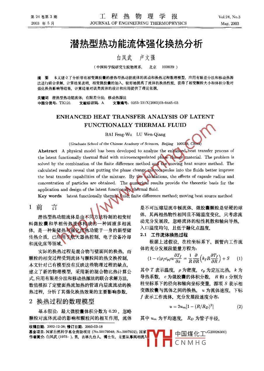 第24蒼第3期工程熱物理學(xué)報(bào)Vol 24 No.3003年5月JOURNAL OF ENGINEERING THERMOPHYSICSMay,2003潛熱型熱功能流體強(qiáng)化換熱分析白鳳武盧文強(qiáng)(中國(guó)科學(xué)院研究生院物理系,北京100039)摘要本文建立了分析帶有相變微膠囊的潛熱型熱功能流體的流動(dòng)和換熱過(guò)程數(shù)理模型,應(yīng)用有限差分法和移動(dòng)熱源進(jìn)行聯(lián)合求解,計(jì)算結(jié)果表明,相變微膠囊的加入,較好地提高了流體的換熱性能.獲得了相變顆粒大小和體積分?jǐn)?shù)對(duì)強(qiáng)化換熱態(tài)響等結(jié)果。計(jì)算結(jié)果對(duì)該類流體的設(shè)計(jì)和應(yīng)用提供了理論依據(jù)關(guān)鑣詞潛熱型熱功能流體;有限差分法;移功熱源法中圖分類號(hào):TK121文獻(xiàn)標(biāo)識(shí)碼A文章編號(hào):0253-231X(2003)03-0445-03ENHANCED HEAT TRANSFER ANALYSIS OF LATENTFUNCTIONALLY THERMAL FLUIDBAI Feng-Wu LU Wen-Qiang(Graduate School of the Chinese Academy of Sciences, Beijing 100039, China)Abstract A physical model has been developed to analyze the enhanced heat transfer process ofthe latent functionally thermal fluid with microencapsulated phase change material. The problem issolved by the combination of the finite difference method and the moving heat source method. thealculated results reveal that putting the phase change microcapsules into the fuids better improthe heat transfer capabilities of the mixture By the calculations, the effects of capsule radius andconcentration of particles are obtained. The numerical results provide the theoretic basis for theapplication and design of the latent functionally thermal AuidKey words lateat functionally thermal fuid; finite difference method; moving heat source method前言是不可壓縮層流牛頓流體。微膠囊顆粒是堅(jiān)硬的球潛熱型熱功能流體是由不同方法特制的相變材體,其兩相熱物性相同且不隨溫度變化只考慮流料微胺囊和單相傳熱流體構(gòu)成的一種固液多相流動(dòng)充分發(fā)展段,忽略流體的粘性耗散和軸向?qū)?體,是一種集儲(chǔ)熱與強(qiáng)化傳熱功能于一身的新型儲(chǔ)口溫度均勻,且低于融化點(diǎn)溫度傳熱介質(zhì)。已應(yīng)用于航天器熱控制、電子設(shè)備冷卻21工作流體換熱過(guò)程和流化床等領(lǐng)域。根據(jù)上述假設(shè),在柱坐標(biāo)系下,圓管內(nèi)工作流實(shí)際的換熱過(guò)程是混合物與壁面間的換熱,而體的充分發(fā)展段能量方程為顆粒的相變過(guò)程受到流體與顆粒間的熱交換控制(1-902=Rb(4+nam)+S(1)本文針對(duì)已有模型沒(méi)有反映這些物理過(guò)程的缺點(diǎn)其中表示溫度,P為密度,cp為定壓比熱,k為建立了新的物理模型,采用新的混合物比熱計(jì)算公式應(yīng)用有限差分法和移動(dòng)熱源法的聯(lián)合求解方法,導(dǎo)熱系數(shù),c為微膠囊的體積分?jǐn)?shù),R和2分別為數(shù)值模擬了定壁面熱流加熱的管道內(nèi)層流流動(dòng)的換坐標(biāo)系下的徑向和軸向坐標(biāo)變量,源項(xiàng)S表示相熱過(guò)程,分析了其強(qiáng)化換熱效果的主要影響參數(shù)變微膠囊與流體之間的換熱,u為流體速度,下標(biāo)2換熱過(guò)程的數(shù)理模型∫表示工作流體.充分發(fā)展段速度分布:u=2um(1-(R/RD)21基本假設(shè):最大微膠囊體積分?jǐn)?shù)為0.20,忽略顆粒對(duì)流體流動(dòng)的影響和顆粒間的相互作用,流體其中um為平均速度,RD為管子半徑收稿日期:2002-1228;修訂日期:20030318基金項(xiàng)目國(guó)家自然科學(xué)基金資助項(xiàng)目(No50176048;No5007602);國(guó)家作者簡(jiǎn)介白風(fēng)武(1975-),男,吉林九臺(tái)人,博土生,主要從事兩相流iTYH中國(guó)煤化工CNMHG446熱物理學(xué)報(bào)單位體積的微膠囊與流體之間的換熱量S為:r為顆粒的相界面半徑將式(8~10)代入式(7)得S=hpc(Tpu-Ts)/pu其中Tm為相變顆粒的壁面溫度,h為顆粒與周圍流體的對(duì)流換熱系數(shù),rp為顆粒的半徑22相變微膠囊的相變過(guò)程kR2+1+(m+1):Bc,/PaE(1)忽略相變過(guò)程液體的流動(dòng),顆粒在與流體換熱作用下的相變過(guò)程可用移動(dòng)熱源法描述:由方程(11)可以看出,混合物的能量方程受相a(rTp) g(r)變物質(zhì)的體積分?jǐn)?shù)和相變速率的影響at 0