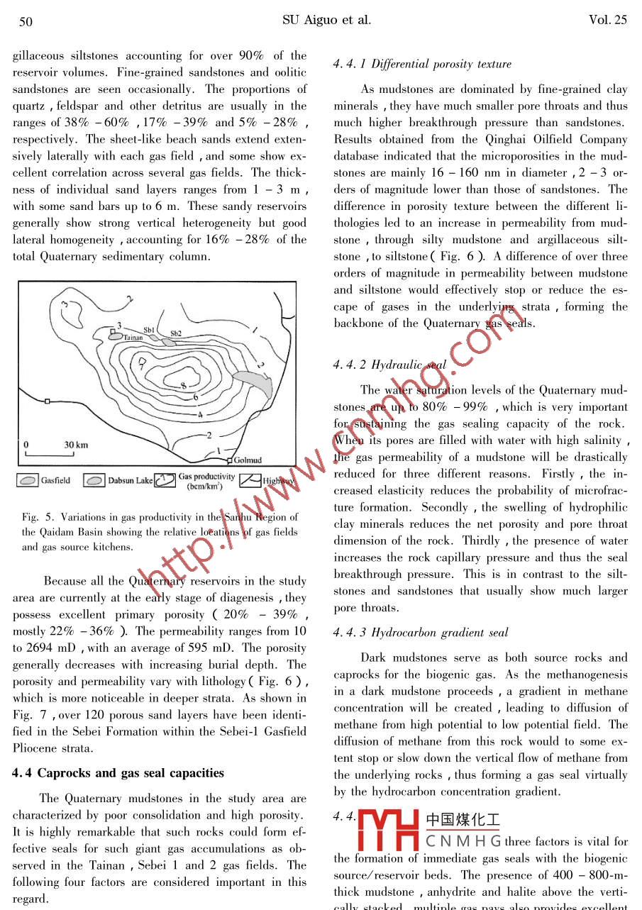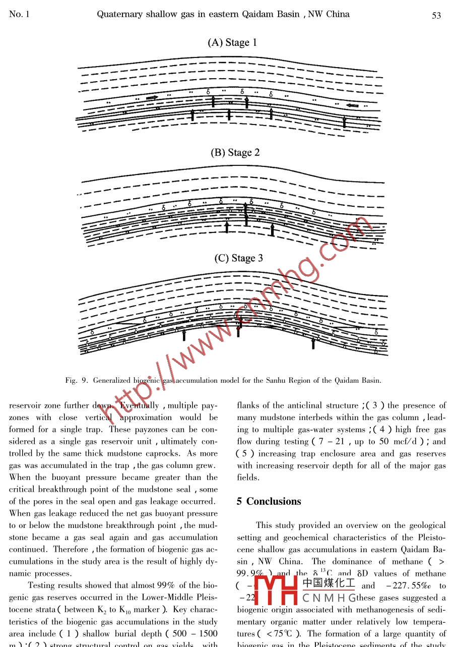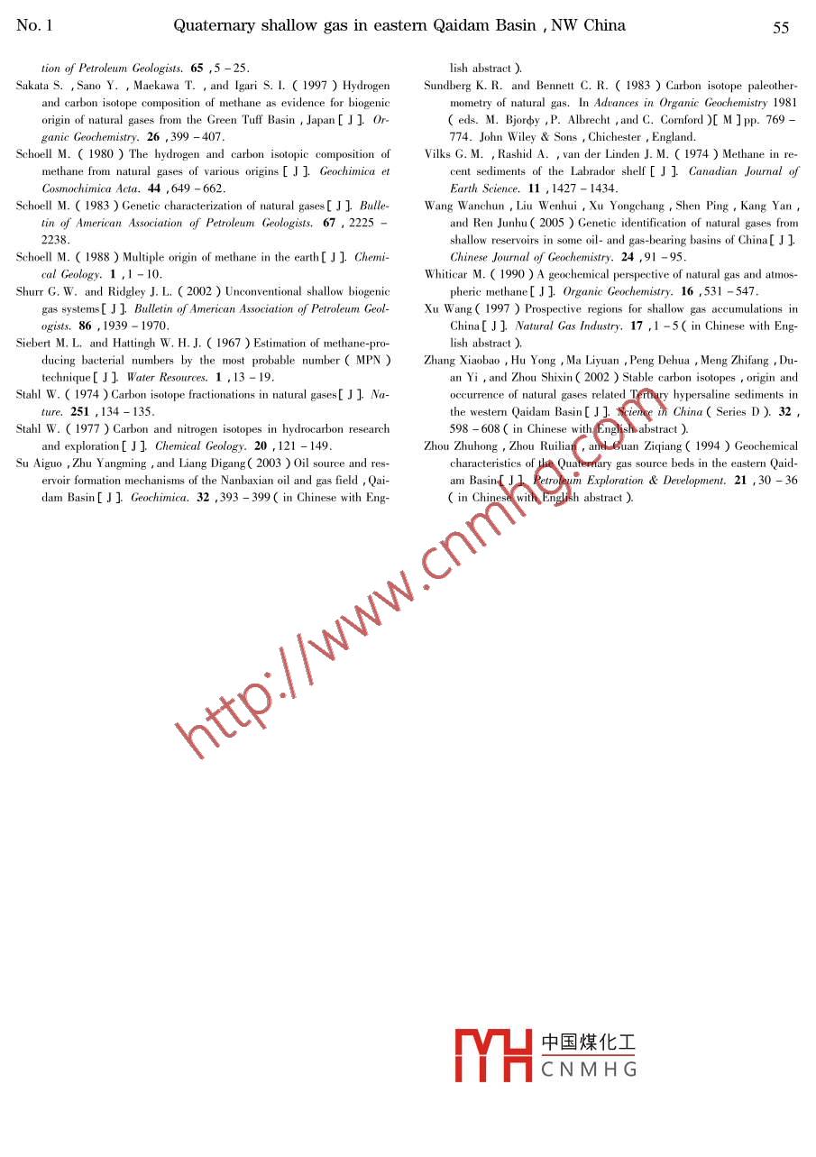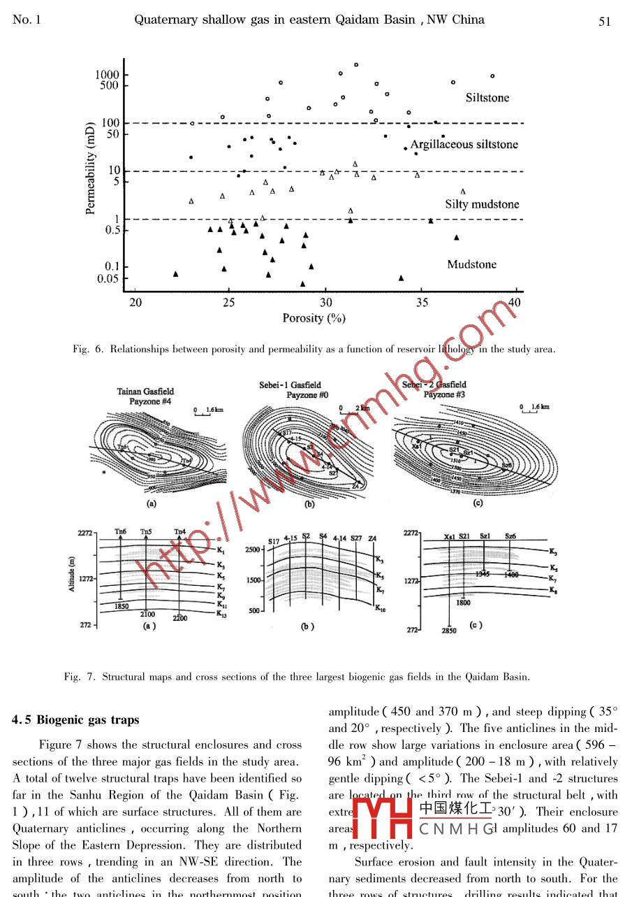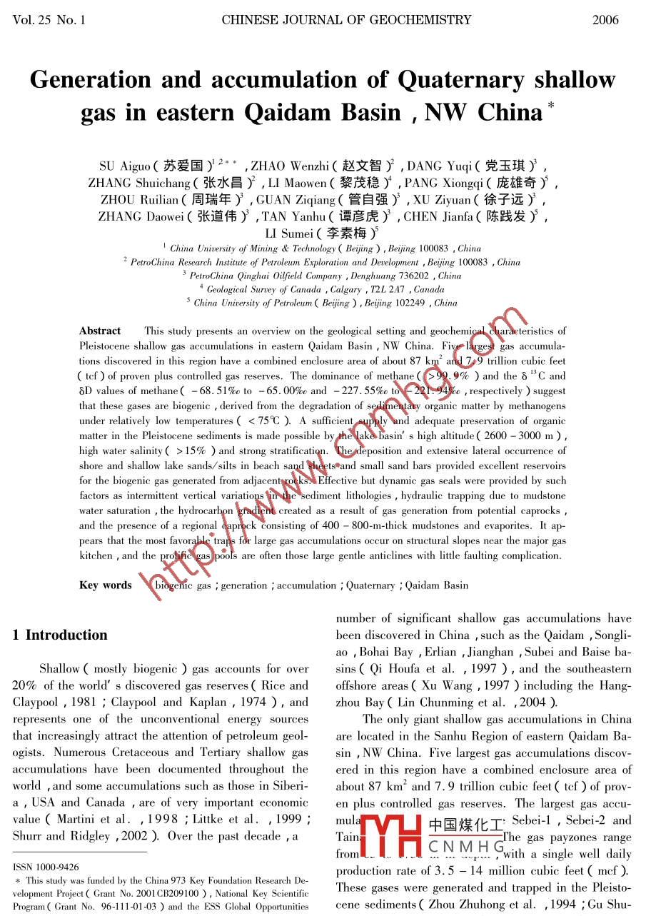 ol. 25 No. 1CHINESE JOURNAL OF GEOCHEMISTRY2006Generation and accumulation of Quaternary shallowgas in eastern Qaidam Basin, NW China(Agm(蘇愛國y2…, HAO Wenzhi(趙文智y, DANG Y(黨玉琪ING Shuichang(張水昌), LI Maowen(黎茂穩(wěn)), PANG Xiongqi(龐雄奇ZHOU Ruilian(周瑞年), GUAN Ziqiang(管自強(qiáng)),Ⅻ U Ziyuan(徐子遠(yuǎn))ZHANG Daowei(張道偉), Tan Yanhu(譚彥虎), chen Jianfa(陳踐發(fā)),LI Sumei(李素梅I China Uniiversity of Mining Technology( Beiing ) Beijing 1000832 Petro China Research Institute of Petroleum Exploration and Development, Beijing 100083,ChinaPetro China Qinghai Oilfield Company, Denghuang 736202, ChinaGeological Survey of Canada, Calgary T2L 2A7, CanadaChina University of Petroleum( Beiing ) Beijing 102249, ChinaAbstract This study presents an overview on the geological setting and geochemical characteristics ofPleistocene shallow gas accumulations in eastern Qaidam Basin, NW China. Five largest gas accumulations discovered in this region have a combined enclosure area of about 87 km and 7. 9 trillion cubic feettcf )of proven plus controlled gas reserves. The dofinance8D values of methane(-68 51%0 to-65 00%0 and -227 55%0 to.94%0, respectively )suggestthat these gases are biogenic derived from the degradation of sedimentary organic matter by methanogensunder relatively low temperatures( 75C). A sufficient supply and adequate preservation of organicmatter in the Pleistocene sediments is made possible by the lake basins high altitude( 2600-3000 mgh water salinity(>15%)and strong stratification. The deposition and extensive lateral occurrence ofshore and shallow lake sands/silts in beach sand sheets and small sand bars provided excellent reservoirsfor the biogenic gas generated from adjacent rocks. Effective but dynamic gas seals were provided by suchfactors as intermittent vertical variations in the sediment lithologies, hydraulic trapping due to mudstonewater saturation the hydrocarbon gradient created as a result of gas generation from potential caprocksand the presence of a regional caprock consisting of 400-800-m-thick mudstones and evaporites. It appears that the most favorable traps for large gas accumulations occur on structural slopes near the major gaslarge gentle anticlines with little faKey words biogenic gas generation accumulation; Quaternary Qaidam Basinnumber of significant shallow gas accumulations have1 Introductionbeen discovered in China such as the Qaidam Songli-ao, Bohai Bay Erlian Jianghan Subei and Baise baShallow( mostly biogenic)gas accounts for over sins( Qi Houfa et al. 1997), and the southeastern20% of the world s discovered gas reserves( Rice and offshore areas( Xu Wang, 1997)including the hangClaypool 1981: Claypool and Kaplan, 1974), and zhou Bay( Lin Chunming et al. 2004represents one of the unconventional energy sourcesThe only giant shallow gas accumulations in Chinathat increasingly attract the attention of petroleum geol- are located in the Sanhu Region of eastern Qaidam Ba-ogists. Numerous Cretaceous and Tertiary shallow gas sin, NW China. Five largest gas accumulations discovered in this region have a combined enclosure area ofworld, and some accumulations such as those in Siberi- about 87 km and 7. 9 trillion cubic feet( tcf )of prova, USA and Canada are of very important economic en plus controlled gas reserves. The largest gas accuvalue( Martini et al. 1998 Littke et al. 1999: mul中國煤化工seil, Sebei2andShurr and Ridgley 2002 ) Over the past decade,aHCNMHThe gaszones rangewith a single well dailyISSN1000-9426s This study was funded by the China 973 Key Foundation Research Deproduction rate of 3. 5-14 million cubic feet( mcfopment Project( Grant No. 2001 CB209100), National Key ScientificgenerateProgram( Grant No. 96-111-01-03) and the ESS Global Opportuniticene sediments( Zhou Zhuhong et al., 1994; Gu ShuCcmc高教,Em:gmsong, 1996 Qi Houfa et al. 1997; Guan Zhiqiang etyahoo. comSU Aiguo et al2001 Dai Jingxing et al. 2003)aoilfieldpress++AnticlineStudy area03060kmSbITEs Slopentral5oQ contour(m)o0o Gasfield4+ AnticlineSouth Slopeol Gas kitchen■ golmudFig. Ia. Map showing the oil and gas field locations and surface recognizable anticlinal structures in theQaidam Basin, NW China lb. enlarged map of the study area showing the Quaternary sediment con油小m,sms2,The origin of shallow biogenic gas is a topic in- et al., 1998 Okyar and Ediger, 1999; Lin Chunmingvolving many discussions( Wang Wanchun et al., et al., 2004). Such gases are different from routine2005). It is generally believed that biogenic gas is the ones( Liu Luofu et al. 2005), and typically rich inproduct of anaerobic degradation of sedimentary organic methane but not associated with oil and their originsmatter at low temperatures and it is typically trapped can be constrained by carbon and hydrogen isotope daI immature sediments( rice1中國煤化工,197:Jmes,1983and Claypool, 1981 ). The suitable biogenic gas habi- SheCNMH Gennett, 1983; Fabertats include swamps paddy fields, anoxic freshwater 1987, Berner and Faber, 1988; Galimov, 1988bays, glacial drifts andWhiticar, 1990, Floodgate and Judd, 1992 Jenden etrine sediments beneath the anaerobic sulfate-reducing al., 1993 Baylis et al., 1997aplanzones( vilks et al. 1974: Rashid and Vilks, 1977Schoell, 1986*1883, 1988: Whiticar, 1990: AlbertThis study on the Pleistocene gas accumulationsQuaternary shallow gas in eastern Qaidam Basin, NW China45in eastern Qaidam Basin aims to describe the gerCenozoic sediments on the top of the pre-Mesozoic base-geological settings of shallow gas pools with anment consisting of metamorphic and igneous rocksphasis on the salt lake sediments discuss the condi- Structurally the badivided into a meions required for the formation of gas pools, and pro- block zone in the north and two Cenozoic depressions invide a synthesis on the geological controls of shallow the west and south( figenlergas distributionbasin during the Jurassic were located wit
