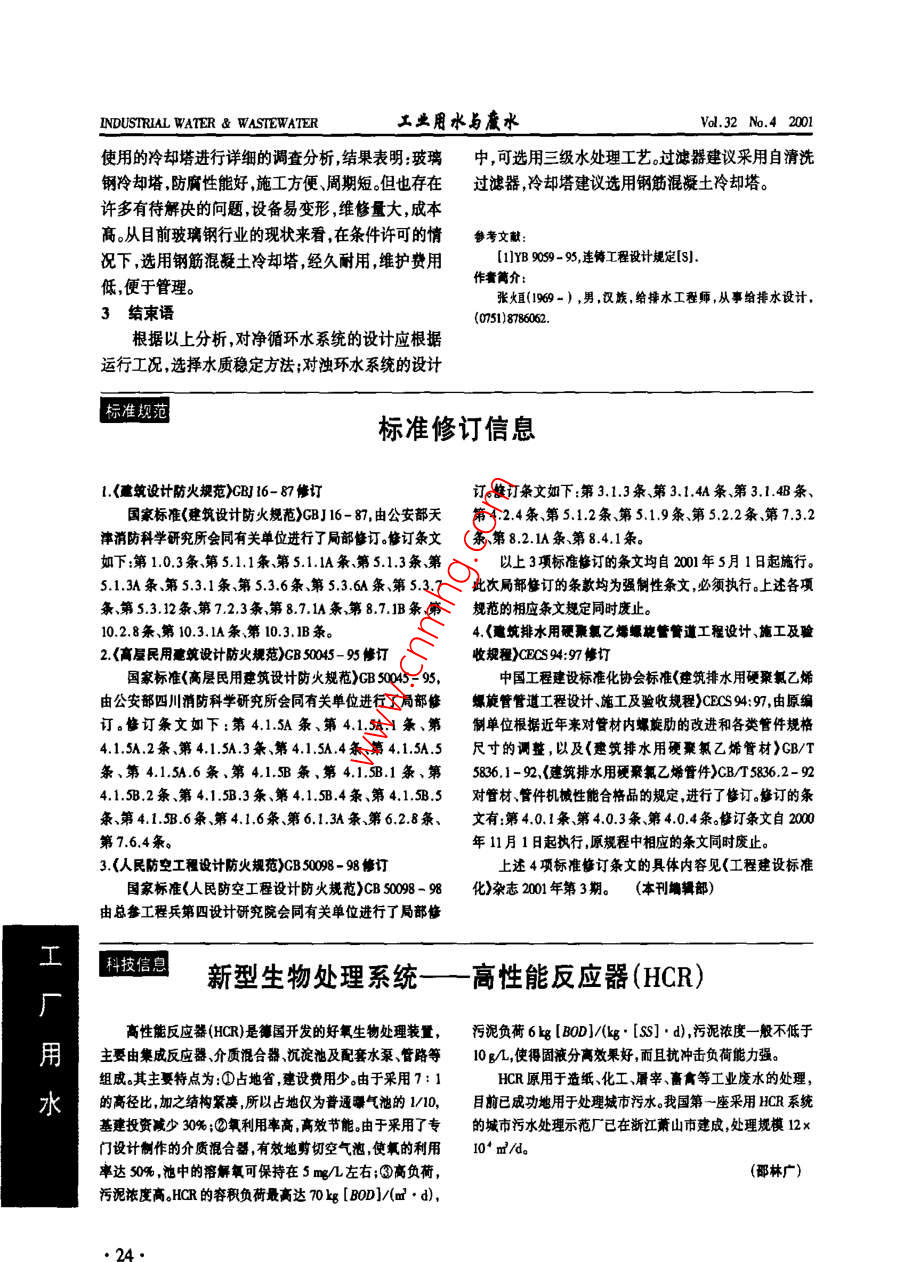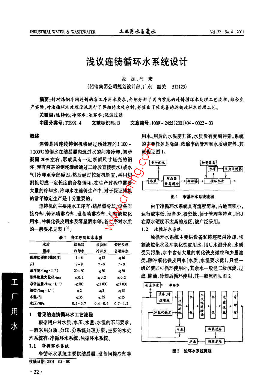 INDUSTRIAL WATER & WASTEWATER工業(yè)用水與廢水Vol.32 No.4 2001淺議連鑄循環(huán)水系統(tǒng)設(shè)計(jì)張煩,肖宏(韶鋼集團(tuán)公司規(guī)劃設(shè)計(jì)部,廣東韶關(guān)512123)摘要:針對煉鋼車間連鑄的各工序用水要求,介紹分析了國內(nèi)常見的連鑄循環(huán)水處理工藝流程,結(jié)合生產(chǎn)實(shí)際,對濁循環(huán)水處理設(shè)施進(jìn)行了詳細(xì)的比較分析,并提出了較完善的連鑄濁環(huán)水處理工藝。關(guān)鍵詞:連鑄機(jī);凈環(huán)水;濁環(huán)水;沉淀過濾中圖分類號:TU991.4文獻(xiàn)標(biāo)識碼:B文章編號: 1009- 2455(2001)04- 0022 - 03概述用水。用后的水溫度升高,水質(zhì)沒有受到污染。系統(tǒng)連鑄是用連續(xù)鑄鋼機(jī)將經(jīng)過預(yù)處理的1 100 ~的 主要任務(wù)是降溫、濃縮率的管理和水質(zhì)穩(wěn)定等。其1 200C的鋼水在結(jié)晶器內(nèi)通過水的間接冷卻,初步流程見圖 1。凝固20%左右,形成具有一定斷面尺寸坯殼的鋼安全水池加藥設(shè)備坯。帶有液芯的鋼坯繼續(xù)通過二冷段直接噴水(或水水泰一壓力過濾司氣)冷卻至全部凝固。然后經(jīng)過拉矯機(jī)矯直,再用切割機(jī)切成- -定長度的合格鑄坯。在生產(chǎn)過程中需要→水萊}站晶器體卻等→二猜環(huán)水池設(shè)備間冷大量的冷卻水,冷卻水在連鑄生產(chǎn)中,對于保證鑄機(jī)的常年穩(wěn)定生產(chǎn)是十分重要的。圈1凈循環(huán)水系統(tǒng)謊程連鑄機(jī)的主要用水工序有:結(jié)晶器冷卻,設(shè)備間由于凈循環(huán)水系統(tǒng)具有流程簡單,占地面積小,接冷卻,鑄坯噴淋冷卻,設(shè)備噴淋冷卻,切割渣粒化運(yùn)行成本低 ,設(shè)備少,投資低,便于管理等特點(diǎn),所以用水,沖氧化鐵皮用水及零星灑水等。各工序?qū)λ|(zhì)在原水硬度不太高的地區(qū),被廣泛采用。的一般要求見表中。1.2濁循環(huán)水系統(tǒng)裹1各工序冷卻水水質(zhì)濁循環(huán)水系統(tǒng)主要供設(shè)備和鑄坯噴淋冷卻、切水質(zhì)結(jié)晶器設(shè)備間鑄坯及設(shè)割渣?;皼_氧化鐵皮用水。用后水溫升高,水質(zhì)指標(biāo)冷卻水備噴淋水受到污染,水中含有大量的氧化鐵皮微粒和少量油碳酸鹽硬度(德國度)1-6≤|2與16類。除沖氧化鐵皮用水(水質(zhì)、水溫要求低),只經(jīng)- -7- 97-9級沉淀即可循環(huán)使用外,其余水一般經(jīng)二級沉淀、過懸浮物/(略,L")20~50sS0≤50懸浮物最大粒徑/mm≤0.2濾、除油冷卻后循環(huán)使用,其一-般流程見圖2。工總含鹽量/(ng'L)≤S003000s3 000 :安全水池←凈環(huán)水袖類/(噸●L')≤2<2≤I5子設(shè)備、紳廠水溫心≤35坯噴淋水壓/MPa0.5~ 0.70.4-0.6 0.7-1.2用1常見的連鑄循環(huán)水工藝流程氧化鐵皮一水根據(jù)用戶對水質(zhì)、水壓、水量、水溫的不同要求,- -般采用分質(zhì)、分壓分系統(tǒng)處理方案,主要的水處[加藥設(shè)備]理系統(tǒng)有:凈循環(huán)水系統(tǒng)濁循環(huán)水系統(tǒng)。水?!h(huán)水池]1.1凈循環(huán)水系統(tǒng)圖2 濁環(huán)水系統(tǒng)流程凈循環(huán)水系統(tǒng)主要供結(jié)晶器、設(shè)備間接冷卻等收稿日期:2001-05-08. 22.張短,肖宏:淺議連鑄循環(huán)水系統(tǒng)設(shè)計(jì)2凈、濁循環(huán)水系統(tǒng)的確定兩種,兩者相比,旋流沉淀池具有沉淀效率高,占地2.1連鑄機(jī)凈循環(huán)水系統(tǒng)的確定面積小,清渣方便等優(yōu)點(diǎn),并在設(shè)計(jì)施工和生產(chǎn)管對于供結(jié)晶器、設(shè)備間接冷卻等用水以凈循環(huán)理方面積累了豐富的經(jīng)驗(yàn),因此--次鐵皮坑采用下水為主體,工藝系統(tǒng)大體與圖1類似。在水質(zhì)穩(wěn)定方旋式旋流沉淀池的較為廣泛。面,為防止各循環(huán)水系統(tǒng)經(jīng)長期運(yùn)行,使設(shè)備、管道平流沉淀他具有構(gòu)造簡單,施工管理方便,它不:發(fā)生結(jié)垢與腐蝕,確保連鑄的正常生產(chǎn),延長設(shè)備與僅可進(jìn)-步去除水中懸浮物,還為除油提供了良好管道的使用壽命。所以必須考慮水質(zhì)穩(wěn)定設(shè)施。緩蝕的條件。與它相配套的刮油刮渣機(jī)和各種撇油機(jī)均阻垢殺菌滅藻藥劑的投加種類及劑量必須依補(bǔ)充水已標(biāo)準(zhǔn)系列化生產(chǎn),所以它在連鑄濁循環(huán)水二次沉及循環(huán)水的水質(zhì)、運(yùn)行工況、設(shè)備材質(zhì)等條件,進(jìn)行淀處理中得到廣泛的應(yīng)用。水質(zhì)穩(wěn)定試驗(yàn)后才能確定。過濾是除濁的一個(gè)重要組成部分,它是快速去由于各地的原水、運(yùn)行工況、設(shè)備材質(zhì)不同,以除水中細(xì)小顆粒的主要手段。目前常用的水過濾器及水質(zhì)穩(wěn)定試驗(yàn)條件與實(shí)際生產(chǎn)條件不同,因此在有:以活性炭和石英砂為濾料的壓力過濾器;高梯度正常生產(chǎn)過程中必須不斷積累經(jīng)驗(yàn),調(diào)整加藥品種磁過濾器,以及近幾年新開發(fā)的自清洗過濾器。和投藥量,尋求最優(yōu)的藥劑配方,不斷提高水質(zhì)管理-直作為主要過濾設(shè)備的壓力過濾器經(jīng)過長期水平。的生產(chǎn)實(shí)踐發(fā)現(xiàn)還存在以下缺陷:對于處理含油污2.2 連鑄機(jī)濁循環(huán)水處理流程的選擇水,易造成濾料板結(jié),出水水質(zhì)惡化,濾料使用周期連鑄機(jī)濁環(huán)水要求較高,特別是二次噴淋和設(shè)短,增加了設(shè)備維護(hù)的