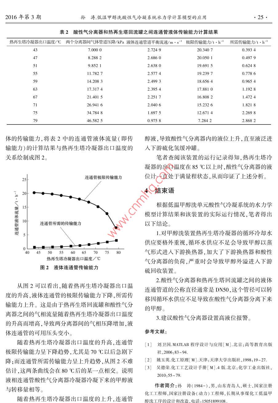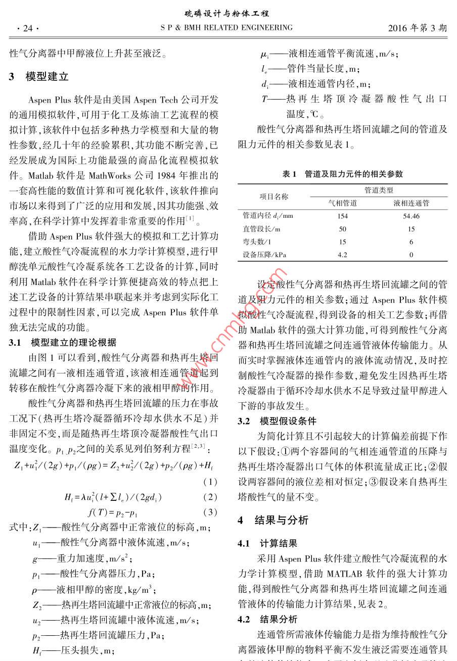 硫磷設(shè)計與粉體工程2016年第3期SP& BMH RELATED ENGINEERING23低溫甲醇洗酸性氣冷凝系統(tǒng)水力學(xué)計算模型的應(yīng)用孫濤(中石化南京工程有限公司,江蘇南京211100)摘要:低溫甲醇洗單元酸性氣冷凝系統(tǒng)中熱再生塔冷凝器因循環(huán)冷卻水供水不足會導(dǎo)致過量甲醇進(jìn)入下游硫化氬緩沖罐,會造成一定危害。針對這一問題,借助 Aspen Plus和 Matlab軟件,對低溫甲醇洗單元中甲醇在上述事故狀態(tài)下進(jìn)入下游硫化氫緩沖罐的杋理進(jìn)行了探討和分析,并建立了水力學(xué)計算模型,為量化分析該現(xiàn)象并避免發(fā)生類似事故提供了理論依據(jù)。關(guān)鍵詞:低溫甲醇洗;酸性氣冷凝系統(tǒng);水力學(xué);計算糢型;壓降中圖分類號:TQ051.502文獻(xiàn)標(biāo)識碼:B文章編號:1009-1904(2016)03-0023-031概述2建立水力學(xué)計算模型的背景某煤化工裝置硫化氫緩沖罐在檢修作業(yè)時發(fā)生2.1酸性氣冷凝流程火災(zāi)事故,經(jīng)事故分析確定火災(zāi)原因是緩沖罐中甲酸性氣冷凝流程如圖1所示。來自熱再生塔富醇外溢,遇明火作業(yè)造成火災(zāi),所幸未造成人員傷含甲醇的酸性氣經(jīng)熱再生塔冷凝器降溫,其中大部亡。正常操作工況下,上游甲醇洗單元產(chǎn)生的克勞分甲醇冷凝后進(jìn)入熱再生塔回流罐,作為回流液由斯氣體中甲醇露點-30℃左右,不會把甲醇帶入下熱再生塔回流泵打回塔頂。酸性氣則由下游一系列游硫回收單元。經(jīng)原因排査最后確定是因為熱再生換熱器換熱降溫,冷凝下來的甲醇進(jìn)入酸性氣冷凝塔冷凝器由于循環(huán)冷卻水供水不足導(dǎo)致過量甲醇進(jìn)器,由底部的液相連通管返回?zé)嵩偕亓鞴?氣相入下游。作為克勞斯氣經(jīng)換熱升溫送至下游硫回收單元??藙谒箽釲CWR[CWS]酸性氣換熱器氣氨酸性氣一⊙熱再生塔冷凝器熱再生塔回流泵、-酸性氣尾氣換熱器酸性氣冷凝器液氨熱再生塔回流罐酸性氣分離器回流液圖1酸性氣冷凝流程示意22過量甲醇進(jìn)入下游的原因分析循環(huán)水供水存在問題時,離開該換熱器的甲醇蒸氣由上述冷凝流程分析可知,正常操作工況下,酸量上升,導(dǎo)致熱再生塔回流罐和酸性氣分離器之間性氣分離器冷凝下來的液體甲醇在液位差(一個框的管道及換熱器沿程阻力增加,使得這兩個容器的架的層高,約6m)的作用下,足以克服兩個容器的壓力差增加。當(dāng)壓差大到一定程度時,兩容器間的硫磷設(shè)計與粉體工24sP& BMH RELATED ENGINEERING016年第3期性氣分離器中甲醇液位上升甚至液泛。μ——液相連通管平衡流速,m/sl管件當(dāng)量長度,m;3模型建立d液相連通管內(nèi)徑,mAspen Plus軟件是由美國 Aspen Tech公司開發(fā)T——熱再生塔頂冷凝器酸性氣出口的通用模擬軟件,可用于化工及煉油工藝流程的模溫度,℃。擬計算,該軟件中包括多種熱力學(xué)模型和大量的物酸性氣分離器和熱再生塔回流罐之間的管道及性參數(shù),經(jīng)幾十年的經(jīng)驗累積,其功能不斷完善,已阻力元件的相關(guān)參數(shù)見表1。經(jīng)發(fā)展成為國際上功能最強(qiáng)的商品化流程模擬軟件。 Matlab軟件是 Math Works公司1984年推出的表1管道及阻力元件的相關(guān)參數(shù)套高性能的數(shù)值計算和可視化軟件,該軟件推向管道類型市場以來得到了廣泛的應(yīng)用和發(fā)展,因其功能強(qiáng)、效氣相管道液相連通管率高,在科學(xué)計算中發(fā)揮著非常重要的作用管道內(nèi)徑d;/mn直管段長/m借助 Aspen Plus軟件強(qiáng)大的模擬和工藝計算功彎頭數(shù)/1能,建立酸性氣冷凝流程的水力學(xué)計算模型,進(jìn)行甲設(shè)備壓降/Pa5604.2醇洗單元酸性氣冷凝系統(tǒng)各工藝設(shè)備的計算,同時利用 Matlab軟件在科學(xué)計算便捷高效的特點把上設(shè)定酸性氣分離器和熱再生塔回流罐之間的管述工藝設(shè)備的計算結(jié)果串聯(lián)起來并考慮到實際化工道及阻力元件的相關(guān)參數(shù);通過 Aspen plus軟件模過程中的限制性因素,可以完成 Aspen Plus軟件單擬酸性氣冷凝流程,得到設(shè)備的相關(guān)工藝參數(shù);再借獨無法完成的功能。助 Matlab軟件的強(qiáng)大計算功能,可得到酸性氣分離3.1模型建立的理論根據(jù)器和熱再生塔回流罐之間連通管液體傳輸能力。從由圖1可以看到,酸性氣分離器和熱再生塔回而實時掌握液體連通管內(nèi)的液體流動情況,及時控流罐之間有一液相連通管道,該液相連通管道起到制酸性氣冷凝器的操作參數(shù),避免發(fā)生因熱再生塔轉(zhuǎn)移在酸性氣分離器冷凝下來的液相甲醇的作用。冷凝器由于循環(huán)冷卻水供水不足導(dǎo)致過量甲醇進(jìn)入酸性氣分離器和熱再生塔回流罐的壓力在事故下游的事故發(fā)生。工況下(熱再生塔冷凝器循環(huán)冷卻水供水不足)并3.2模型假設(shè)條件非固定不變,而是隨熱再生塔頂冷凝器酸性氣出口為簡化計算且不引起較大的計算偏差前提下作溫度變化。P1P2之間的關(guān)系見列伯努利方程23:以下假設(shè):①兩個容器間的氣相連通管道的壓降與Z1+u2/(2g)+1/(pg)=Z2+n21(2g)+2(pg)+H1熱再生塔冷凝器出口氣體的體積流量成正比;②假(1)設(shè)兩容器間的液位差相對恒定;③假設(shè)來自熱再生H1=Au2(l+∑l)/(2gd1)(2)塔酸性氣的量不變。f(T)=p2-p(3)式中:Z1—酸性氣分離器中正常液位的標(biāo)高,m;4結(jié)果與分