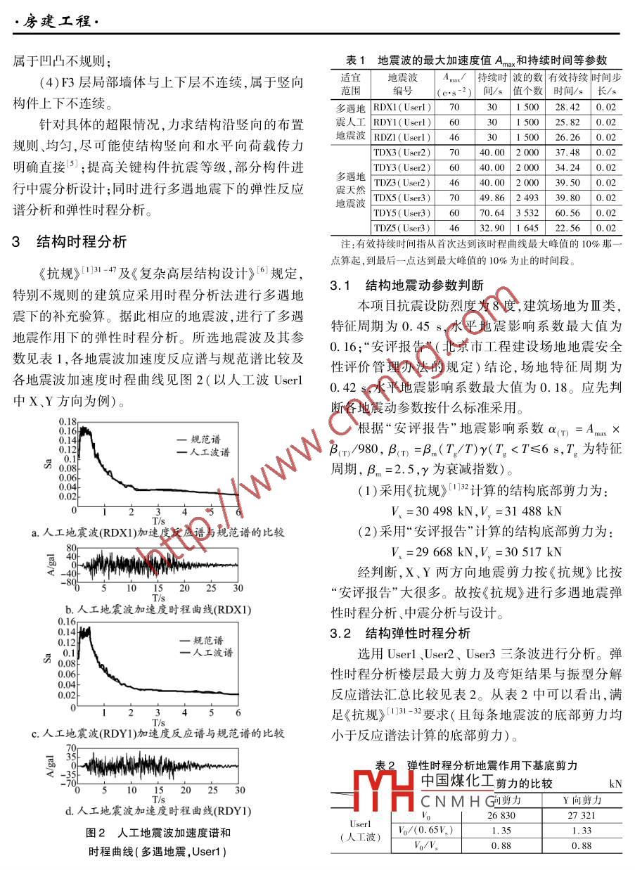●房建工程.超限結(jié)構(gòu)時(shí)程分析與中震分析楊明杰(中鐵十六局集團(tuán)北京建筑工程設(shè)計(jì)有限公司北京100018)摘要超限結(jié)構(gòu)建筑體型復(fù)雜、高度較高、平面不規(guī)則、剛度突變、豎向抗側(cè)力構(gòu)件間斷、承載力突變等多種因素,需確定合理的抗震性能目標(biāo)。本文結(jié)合諾金飯店項(xiàng)目,重點(diǎn)解析時(shí)程分析與中震設(shè)計(jì)等性能目標(biāo),明確相關(guān)概念設(shè)計(jì),列舉具體計(jì)算分析方法及構(gòu)造措施,在規(guī)范的基礎(chǔ)上加以理解運(yùn)用。關(guān)鍵詞超限結(jié)構(gòu) 時(shí)程分析 中震設(shè)計(jì) .中圖分類號(hào)TU973. 31文獻(xiàn)標(biāo)識(shí)碼A文章編號(hào)1009-4539 (2016) 07 -0103 -03.Analysis of Overrun Structural Time-history and Middle SeismYang Mingjie( China Railway 16h Bureau Group Beijing Arhitectural Engineering Design Co. Ltd. ,Beiing 100018, China)Abstract It was necessary to confirm reasonable anti-seismic performance targets for the overrun structure due to a varietyof factors such as the complicated shape of the building, high altitude ,irregular plane,stiffness mutation, discontinuouscomponent of vertical lateral force and mutation of bearing capacity. This paper, combined with NUO Hotel Project, mainlyanalyzed the time-history analysis and middle seismic design of performance goals , made clear the related concept design,and listed the specific calculation method and construction measures. Moreover, it was understood and applied on the basisof the speeification.Key words overrun structure ; time-history analysis ; middle seismic design(以下簡(jiǎn)稱《抗規(guī)》) .《高層建筑混凝土結(jié)構(gòu)技術(shù)規(guī)1引言時(shí)代的發(fā)展,滿足人們?nèi)粘N幕?、交流、業(yè)余生活程》[2]及《超限高層建筑工程抗震設(shè)防專項(xiàng)審查技等超高建筑不斷應(yīng)運(yùn)而生。這類建筑基本都突破規(guī)術(shù)要點(diǎn)》[3],判斷是否為超限結(jié)范的規(guī)定,形成超限結(jié)構(gòu)。超限結(jié)構(gòu)建筑因體型復(fù)構(gòu)。以諾金飯店為例,主體采用雜高度較高、平面不規(guī)則、剛度突變、豎向抗側(cè)力構(gòu)鋼筋混凝土框架一剪力墻結(jié)構(gòu)件間斷、承載力突變等因素,設(shè)計(jì)時(shí)有很大難度,需多體系,整體模型見(jiàn)圖1。有以下條件分析、合理判斷,采取適當(dāng)加強(qiáng)措施,尤其在高烈不規(guī)則問(wèn)題[4] ,屬于超限高層建度地區(qū)更為顯著。超限結(jié)構(gòu)建筑又因其突破現(xiàn)行規(guī)筑結(jié)構(gòu),需進(jìn)行超高超限結(jié)構(gòu)抗范規(guī)定,沒(méi)有衡量標(biāo)準(zhǔn),確定合理適度的抗震性能目震性能化設(shè)計(jì):標(biāo)尤為重要。要根據(jù)建筑的超限程度,采取概念設(shè)(1)平面及豎向的不規(guī)則性,計(jì)、計(jì)算措施及構(gòu)造措施,并進(jìn)行中震設(shè)計(jì)與時(shí)程分結(jié)構(gòu)高度為98.39 m(大于90 m),析等性能目標(biāo),后者也是本文的重點(diǎn)解析。屬中國(guó)煤化工水圖1整體空間模型2結(jié)構(gòu)超限判定MHCNMHG平位移與次餒)層位夠平均值的比值大于1.2,屬于一般建筑應(yīng)根據(jù)《建筑抗震設(shè)計(jì)規(guī)范》18-10扭轉(zhuǎn)不規(guī)則;收稿日期:2016-04 -07(3)主平面凹進(jìn)尺寸占主體平均寬度的35%,鐵道建筑技術(shù)RAILWAY CONSTRUCTION TECHNOLOGY 2016(07)103●房建工程.屬于凹凸不規(guī)則;表1地震波的最大加速度值 Ama;和持續(xù)時(shí) 間等參數(shù)(4)F3層局部墻體與上下層不連續(xù),屬于豎向適宜地震波Ama/持續(xù)時(shí)波的數(shù)|有效持續(xù)時(shí)間步范圍編號(hào)(e.s-2)| 間/s值個(gè)數(shù)時(shí)間/s 長(zhǎng)/s構(gòu)件上下不連續(xù)。多遇地RDX1(User1)| 703(1 50028. 420.02針對(duì)具體的超限情況,力求結(jié)構(gòu)沿豎向的布置震人工RDYI(User1)| 6(30I 50025.82規(guī)則、均勻,盡可能使結(jié)構(gòu)豎向和水平向荷載傳力地震波RDZI( User1)_ 46 _30| 1 50026.26| 0. 02| TDX3( User2)| 740.00 200037.48明確直接[5] ;提高關(guān)鍵構(gòu)件抗震等級(jí),部分構(gòu)件進(jìn)多遇地.| TDY3(User2)| 60| 40.00 200034.24| 0.02行中震分析設(shè)計(jì);同時(shí)進(jìn)行多遇地震下的彈性反應(yīng)震天然| TDZ3( User2)4640.00 2 00039. 50| TDX5(User3)| 70| 49. 86| 2 49339. 80[ 0.02譜分析和彈性時(shí)程分析。| TDY5( User3)60| 70.64| 353260.56TDZ5( User3)4632.90164522.56| 0. 023結(jié)構(gòu)時(shí)程分析注: 有效持續(xù)時(shí)間指從首次達(dá)到該時(shí)程曲線最大峰值的10%那點(diǎn)算起,到最后一點(diǎn)達(dá)到最大峰值的10%為止的時(shí)間段?!犊挂?guī))》[1]31-47及《復(fù)雜高層結(jié)構(gòu)設(shè)計(jì)》[6]規(guī)定,3.1結(jié)構(gòu)地震 動(dòng)參數(shù)判斷特別不規(guī)則的建筑應(yīng)采用時(shí)程分析法進(jìn)行多遇地.本項(xiàng)目抗震設(shè)防烈度為8度,建筑場(chǎng)地為II類,震下的補(bǔ)充驗(yàn)算。據(jù)此相應(yīng)的地震波,進(jìn)行了多遇特征周期為0.45s,水平地震影響系數(shù)最大值為地震作用下的彈性時(shí)程分析。所選地震波及其參0.16;“安評(píng)報(bào)告”(北京市工程建設(shè)場(chǎng)地地震安全數(shù)見(jiàn)表1,各地震波加速度反應(yīng)譜與規(guī)范譜比較及性評(píng)價(jià)管理辦法的規(guī)定)結(jié)論,場(chǎng)地特征周期為各地震波加速度時(shí)程曲線