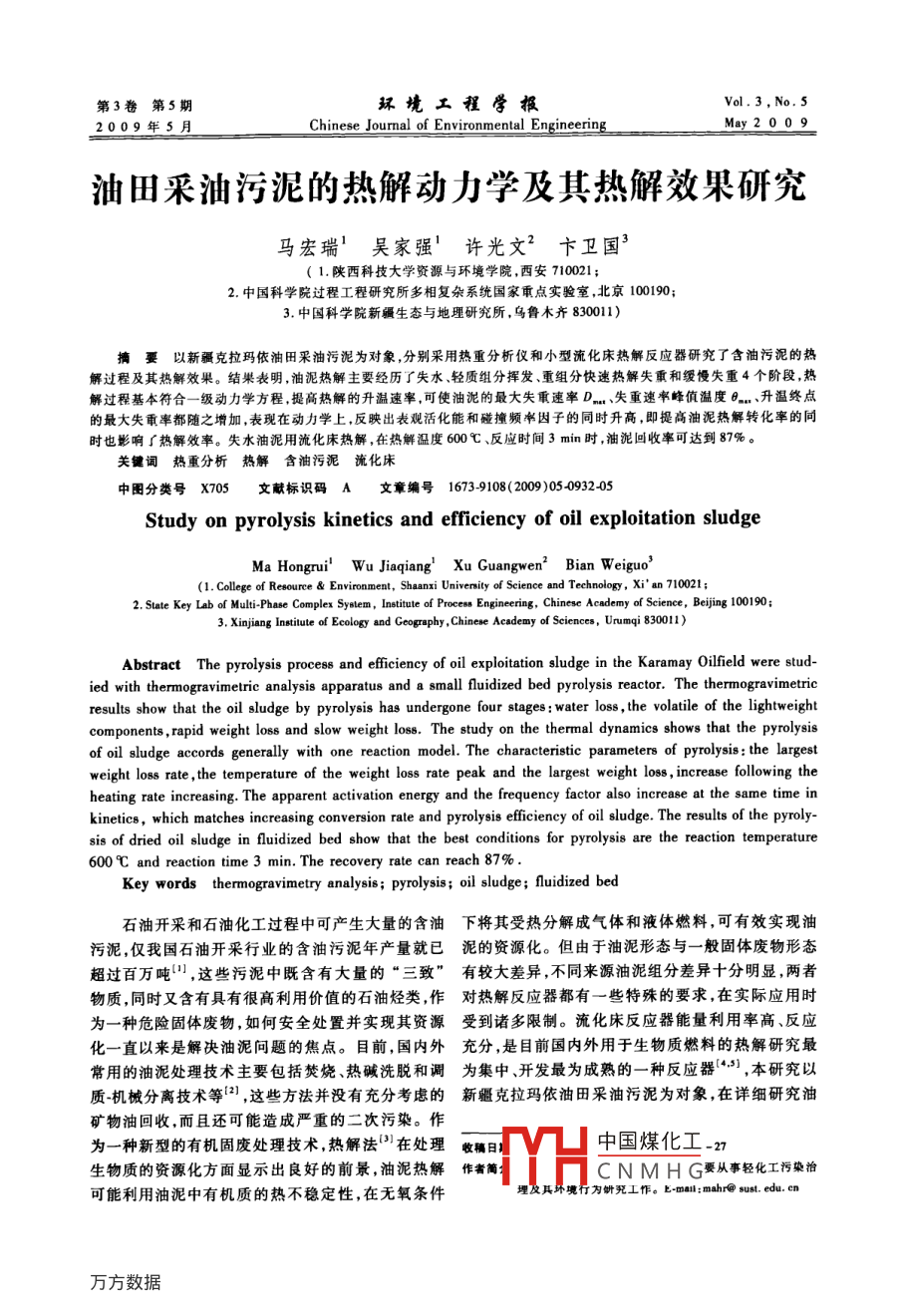 第3卷第5期環(huán)境工程學(xué)報Vol. 3. No. 52009年5月Chinese Journal of Environmental Engineering.May 2009油田釆油污泥的熱解動力學(xué)及其熱解效果斫究馬宏瑞吳家強!許光文2卞衛(wèi)國(1陜西科技大學(xué)資源與環(huán)境學(xué)院,西安7100212中國科學(xué)院過程工程研究所多相復(fù)雜系統(tǒng)國家重點實驗室,北京100190;3中國科學(xué)院新疆生態(tài)與地理研究所,烏魯木齊830011)摘要以新疆克拉瑪依油田采油污泥為對象,分別采用熱重分析儀和小型流化床熱解反應(yīng)器研究了含油污泥的熱解過程及其熱解效果。結(jié)果表明,油泥熱解主要經(jīng)歷了失水輕質(zhì)組分揮發(fā)重組分快速熱解失重和緩慢失重4個階段熱解過程基本符合一級動力學(xué)方程提高熱解的升溫速率可使油泥的最大失重速率D失重速率峰值溫度n升溫終點的最大失重率都隨之增加,表現(xiàn)在動力學(xué)上,反映出表觀活化能和碰撞頻率因子的同時升高即提高油泥熱解轉(zhuǎn)化率的同時也影響了熱解效率。失水油泥用流化床熱解,在熱解溫度600℃、反應(yīng)時間3min時,油泥收率可達到8%關(guān)鍵詞熱重分析熱解含油污泥流化床中圖分類號X705文獻標(biāo)識碼A文章編號16739108(2009)054093205Study on pyrolysis kinetics and efficiency of oil exploitation sludgeMa Hongrui Wu Jiaqiang Xu Guangwen Bian We(1. College of Resouree Environment, Shaanxi University of Science and Technology, Xi'an 710021:2. State Key Lab of Multi-Phase Complex System, Institute of Process Engineering, Chinese Academy of Science, Beijing 100190;3.Xinjiang Institute of Ecology and Geography, Chinese Academy of Sciences, Urumqi 830011)Abstract The pyrolysis process and efficiency of oil exploitation sludge in the Karamay Oilfield were studied with thermogravimetric analysis apparatus and a small fluidized bed pyrolysis reactor. The thermogravimetricresults show that the oil sludge by pyrolysis has undergone four stages: water loss, the volatile of the lightweightcomponents, rapid weight loss and slow weight loss. The study on the thermal dynamics shows that the pyrolysiof oil sludge accords generally with one reaction model. The characteristic parameters of pyrolysis: the largestweight loss rate, the temperature of the weight loss rate peak and the largest weight loss, increase following theheating rate increasing. The apparent activation energy and the frequency factor also increase at the same time inkinetics, which matches increasing conversion rate and pyrolysis efficiency of oil sludge. The results of the pyrolysis of dried oil sludge in fluidized bed show that the best conditions for pyrolysis are the reaction temperature600C and reaction time 3 min. The recovery rate can reach 87%Key words thermogravimetry analysis; pyrolysis; oil sludge; fluidized bed石油開采和石油化工過程中可產(chǎn)生大量的含油下將其受熱分解成氣體和液體燃料,可有效實現(xiàn)油污泥,僅我國石油開采行業(yè)的含油污泥年產(chǎn)量就已泥的資源化。但由于油泥形態(tài)與一般固體廢物形態(tài)超過百萬噸,這些污泥中既含有大量的“三致”有較大差異,不同來源油泥組分差異十分明顯兩者物質(zhì),同時又含有具有很高利用價值的石油烴類作對熱解反應(yīng)器都有一些特殊的要求,在實際應(yīng)用時為一種危險固體廢物,如何安全處置并實現(xiàn)其資源受到諸多限制。流化床反應(yīng)器能量利用率高、反應(yīng)化一直以來是解決油泥問題的焦點。目前,國內(nèi)外充分,是目前國內(nèi)外用于生物質(zhì)燃料的熱解研究最常用的油泥處理技術(shù)主要包括焚燒、熱堿洗脫和調(diào)為集中開發(fā)最為成熟的一種反應(yīng)器,本研究以質(zhì)機械分離技術(shù)等2),這些方法并沒有充分考慮的新疆克拉瑪依油田采油污泥為對象,在詳細研究油礦物油回收,而且還可能造成嚴(yán)重的二次污染。作為一種新型的有機固廢處理技術(shù),熱解法在處理收稿日中國煤化工-2生物質(zhì)的資源化方面顯示出良好的前景,油泥熱解作者簡:CNMHG要從事輕化工污染治可能利用油泥中有機質(zhì)的熱不穩(wěn)定性,在無氧條件為岍死工作。E-ma:mahr@sust,edu,cn第5期馬宏瑞等:油田采油污泥的熱解動力學(xué)及其熱解效果研究933泥熱解組分特性及其熱解動力學(xué)特征的基礎(chǔ)上,對流化床熱解油泥的效果進行了初步研究,以期為油泥熱解產(chǎn)業(yè)化提供理論和實踐依據(jù)。1材料與方法1.1油泥來源及成分分析實驗所采油泥為新疆克拉瑪依油田火燒山作業(yè)區(qū)廢液池池底污泥,其污泥主要來自聯(lián)合站罐底污泥和采油廢水長期沉積的底泥,采樣時間為2007年11月。于實驗室內(nèi)分別測定了油泥含水量(105℃烘干法)、石油烴含量(索氏萃取法)及其熱值(氧彈量熱儀測量),測定結(jié)果為:油泥含水量26.4%,石油烴類28.7%,原始油泥熱值13413J/g,烘干油泥A10℃熱值24022J/g1.2油泥熱動力學(xué)分析實驗采用美國TA公司的TGAQ500型熱重分析儀分別對原始油泥和風(fēng)干油泥進行了熱重分析。風(fēng)干油泥分別以10、20和30℃/min的升溫速率加熱,原始油泥在20℃/min的升溫速率下加熱,升溫終點都為800℃,加入量約為15m。實驗以高純N2(99.99%)為載氣,流量為100mL/min,以確保將熱解產(chǎn)物及時帶走,避免高溫下二次反應(yīng)對樣品瞬圖1風(fēng)干油泥在不同的升溫速率下的熱失重和熱失重速率曲線失重帶來影響。該TG分析儀可自動輸出熱重Fig. 1(TG)和微商熱重(DTG)等數(shù)據(jù)dried oil sludge at different