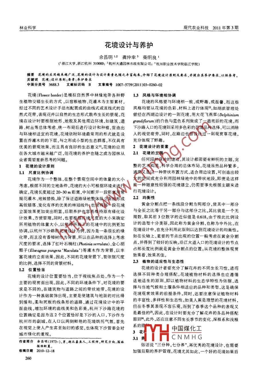 林業(yè)科學(xué)現(xiàn)代農(nóng)業(yè)科技2011 年第3期花境設(shè)計(jì)與養(yǎng)護(hù)余昌明12龔仲幸3柴明良|(浙江大學(xué).浙江杭州300 2杭州大通園林市政有限公司;, 杭州職業(yè)技術(shù)學(xué)院臨江學(xué)院)摘要_花境的應(yīng)用越來魏廣泛 花境的設(shè)計(jì)與設(shè)計(jì)要素也隨之豐富起來。介紹了花境設(shè)計(jì)原則及要求,并提出其養(yǎng)護(hù)要求,以供參考。關(guān)鍵詞花境;設(shè)計(jì)原則;要素;養(yǎng)護(hù)要求中團(tuán)分類號(hào)S688.3 文 獻(xiàn)標(biāo)識(shí)碼B文章編號(hào)1007-5739<2011)03- -0260-02花境(Flower border)是模擬自然界中林緣地帶各種野1.3風(fēng)格與環(huán)境相協(xié)調(diào)生植物交錯(cuò)生長的方式,以宿根植物、花灌木為主要索材,花境的風(fēng)格要與環(huán)境相一致,或野趣,或溫馨.而這些經(jīng)過不同的藝術(shù)設(shè)計(jì)手法而配置成的曲線式或直線式的自風(fēng)格均要從花境的色彩、材料上進(jìn)行體現(xiàn)”。如湖濱管理處然式花帶,表現(xiàn)花卉以自然的生態(tài)形式散布生長的景觀?;ㄔ?經(jīng)在西湖邊設(shè)計(jì)的-則花境.用大花飛燕草(Delphinium境在設(shè)計(jì)時(shí)要根據(jù)地形、地貌及其他周邊環(huán)境,如建筑道grandiflorum)的白色與藍(lán)色系列做成了一道亮 麗的花境。而路、樹叢等總體考慮.統(tǒng)一布局后進(jìn)行設(shè)計(jì)和種植,營造出下沙路人口的花境則采用多色彩的花境品種選擇,可以消除與環(huán)境相適宜的花境。花境依附環(huán)境最常用的形式就是設(shè)人的視覺疲勞。同時(shí).在路邊也曾設(shè)計(jì)過-則觀賞草花境,置在喬灌木的的下層,與之形成小型的生態(tài)群落,不僅具有充分體現(xiàn)了野趣。優(yōu)美的景觀效果,而且具有良好的生態(tài)意義"?;ň车膽?yīng)用2花境設(shè)計(jì)的要素在各大城市越米越廣泛,但花境的養(yǎng)護(hù)也隨之成為園林從2.1 花境的主題業(yè)者需要重新思考的問題。任何園林綠地的建設(shè).其設(shè)計(jì)都需要有鮮明的主題,完1花境的設(shè)計(jì)原則整的藝術(shù)構(gòu)思,科學(xué)合理的總體布局?;ň畴m然品種繁多,1.1尺度比 例協(xié)調(diào)通常又是以一-種帶狀布置方式,適合周邊設(shè)置,可創(chuàng)造出較花境作為一個(gè)整體,在整個(gè)景觀空間中的體量的大小大的空間或充分利用園林綠地中的帶狀地段。即便是這樣考慮。根據(jù)不同的立地條件,花境的大小可根據(jù)環(huán)境來進(jìn)行的一種隨意性較強(qiáng)的花境建立,仍需要事先根據(jù)主題來進(jìn)確定?;ň抽L度超過20-30m距離,中間斷開一段距離用常行花境設(shè)計(jì)。規(guī)花灌木.地被替換,除了保證道路綠地整體縱立面能形成22 均衡性高低錯(cuò)落.變化有序的優(yōu)美的林冠線外,也使得每- -段花境黃金分割點(diǎn)把一條線段分割為兩部分 ,使其中一部分立面效果更加突出明顯,后期養(yǎng)護(hù)也容易維持原有綠化設(shè)與全長之比等于另一部分與這部分之比。其比值是一個(gè)無計(jì)效果,方便管理。同時(shí),也要根據(jù)花境尺度的大小來確定理數(shù),取其前3位數(shù)字的近似值是0.618。由于按此比例設(shè)所用植物的體量大小,以使得所施工的花境中的比例更加計(jì)的造型十分美麗,因此稱為黃金分割,也稱為中外比。在協(xié)調(diào)。以杭州下沙路的花境設(shè)計(jì)為例,因?yàn)槭且粭l很長的綠花境設(shè)計(jì)中,也充分利用此原則以達(dá)到花境設(shè)計(jì)的均衡性?;瘞?而且沒有香樟樹作為背景,所以在品種的選擇上考慮如在長軸上,重要的節(jié)點(diǎn)出現(xiàn)的位置一般考慮在黃金分割尺度的要求,選擇了紅葉石楠柱(Photinia serulata)金心胡點(diǎn),并得到了較好的反映。沿江大道人口的花境設(shè)計(jì)的節(jié)點(diǎn)頹子(Elaeagnus pungens 'Maculata' )等灌木作為背景,以豐占部長度比例就是黃金分割點(diǎn)的位置。從花境的整體觀賞富花境的立面效果。因此,不同的花境背景下,要依據(jù)尺度效果看,效果甚佳。23 植物的適應(yīng)性與生態(tài)性的比例.選擇不同的背景材料。2位置恰當(dāng)花境的設(shè)計(jì)者要充分了解花卉的不同生長習(xí)性,進(jìn)而花境的設(shè)計(jì)位置要恰當(dāng),位于視線焦點(diǎn)處,作為一個(gè)選擇不同種類合理搭配。花境植物材料的選擇也應(yīng)遵循主要的觀賞面出現(xiàn)。因此,不同的環(huán)境條件下,對(duì)花境的要適地適生的原則,即以植物材料的生態(tài)學(xué)特性為依據(jù),選求是不同的。在建筑物與道路之間的帶狀地帶,花境的設(shè)擇與當(dāng)?shù)貧夂蚝屯寥罈l件相適應(yīng)的品種和類型,這是確保計(jì)作為一種基礎(chǔ)裝飾出現(xiàn),主要是使建筑與地面的對(duì)比得花境觀賞效果的前提條件。同時(shí),還要注意保證植物材料到緩和。柔和死板的線條形的道路,通過花境設(shè)計(jì)中的平的豐富性、多樣性和生態(tài)性。如美人蕉是理想的花境材料,面曲線.增加環(huán)境的曲線美和色彩美。杭州下沙路花境的但在冬季其表現(xiàn)不容樂觀,而到了春季這個(gè)品種的表現(xiàn)又位置確定是因?yàn)檫@2個(gè)位置恰好是下沙的人口,下沙作為是最佳的。因此,在設(shè)計(jì)時(shí)要充分了解花卉的各品種搭配杭州市的