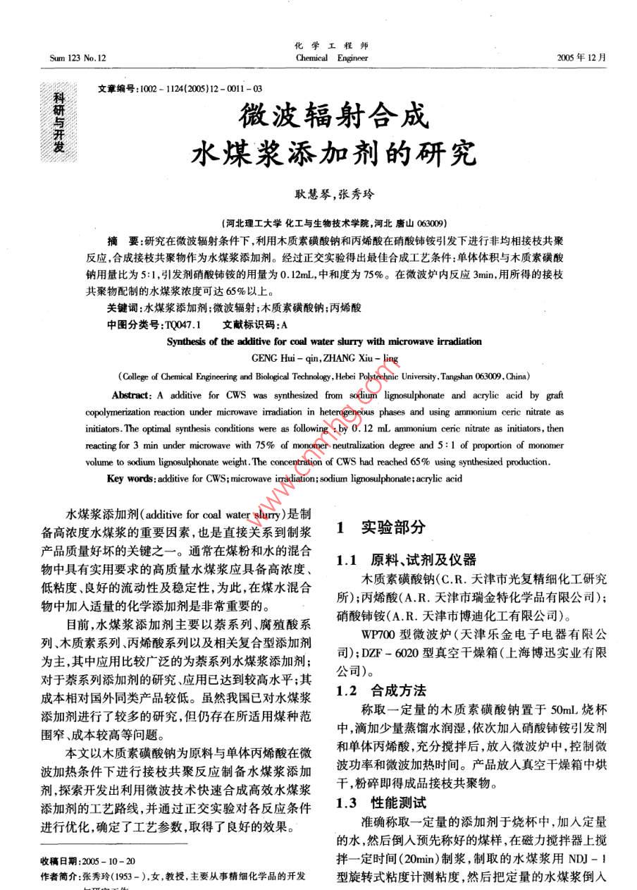微波輻射合成水煤漿添加劑的研究