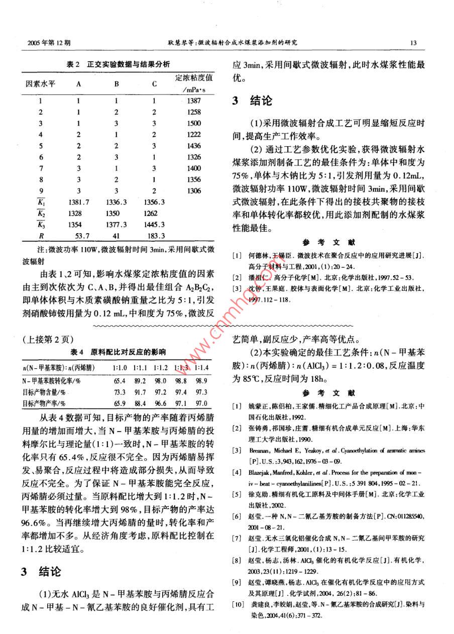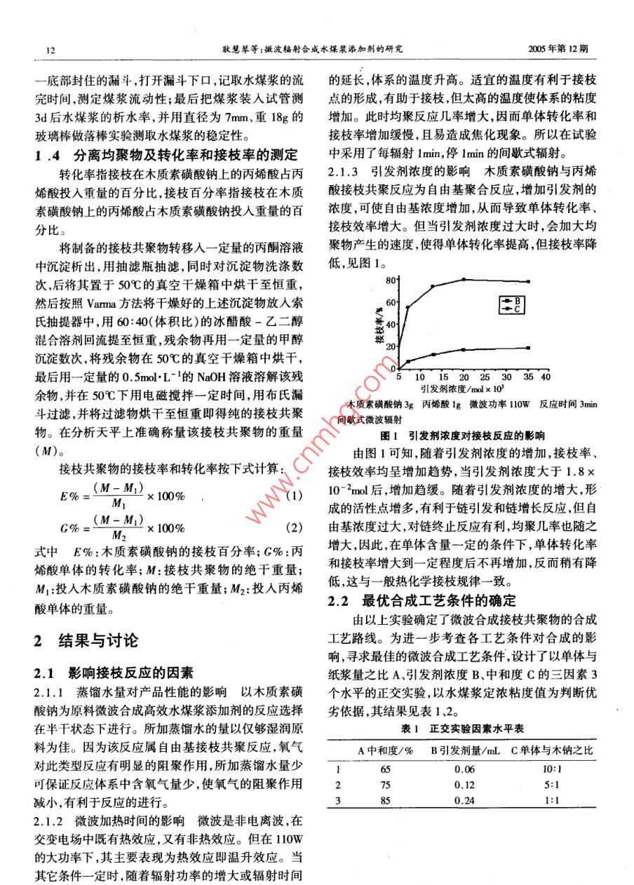 化學(xué)工程師Sum 123 No 12Chemical Engineer2005年12月文章編號:1002-1124(2005)12-0011微波輻射合成水煤漿添加劑的研究耿慧琴,張秀玲(河北理工大學(xué)化工與生物技術(shù)學(xué)院,河北唐山06300)摘要:研究在微波輻射條件下,利用木質(zhì)素磺酸鈉和丙烯酸在硝酸鈰銨引發(fā)下進(jìn)行非均相接枝共聚反應(yīng),合成接枝共聚物作為水煤漿添加劑。經(jīng)過正交實驗得出最佳合成工藝條件:單體體積與木質(zhì)素磺酸鈉用量比為5:1,引發(fā)劑硝酸鋪銨的用量為0.12m,中和度為75%。在微波爐內(nèi)反應(yīng)3min,用所得的接枝共聚物配制的水煤漿濃度可達(dá)65%以上。關(guān)鍵詞:水煤漿添加劑;微波輻射;木質(zhì)素磺酸鈉;丙烯酸中圖分類號:TQO47.1文獻(xiàn)標(biāo)識碼:ASynthesis of the additive for coal water slurry with microwave irradiationGENG Hui-qin, ZHANG Xiu-lingCollege of Chemical Engineering and Biological Technology, Hebei Polytechnic University, Tangshan 063009, China)Abstract: A additive for Cws was synthesized from sodium lignosulphonate and acrylic acid by graftcopolymerization reaction under microwave irradiation in heterogeneous phases and using ammonium ceric nitrate asinitiators. The optimal synthesis conditions were as following: by 0. 12 mL ammonium ceric nitrate as initiators, thenreacting for 3 min under microwave with 75% of monomer neutralization degree and 5: I of proportion of monomerolume to sodium lignosulphonate weight. The concentration of CWS had reached 65% using synthesized productionKey words: additive for CWS; microwave irradiation; sodium lignosulphonate; acrylic acid水煤漿添加劑( additive for coal water slurry)是制備高濃度水煤漿的重要因素,也是直接關(guān)系到制漿1實驗部分產(chǎn)品質(zhì)量好壞的關(guān)鍵之一。通常在煤粉和水的混合物中具有實用要求的高質(zhì)量水煤漿應(yīng)具備高濃度11原料、試劑及儀器低粘度、良好的流動性及穩(wěn)定性,為此,在煤水混合木質(zhì)素磺酸鈉(C.R.天津市光復(fù)精細(xì)化工研究物中加入適量的化學(xué)添加劑是非常重要的。所);丙烯酸(A.R.天津市瑞金特化學(xué)品有限公司);目前,水煤漿添加劑主要以萘系列、腐殖酸系硝酸鈰銨(A.R.天津市博迪化工有限公司)。列、木質(zhì)素系列、丙烯酸系列以及相關(guān)復(fù)合型添加劑WP00型微波爐(天津樂金電子電器有限公對于禁系列添加劑的研究應(yīng)用已達(dá)到較高水平其公團(tuán)-60型真空干燥箱(上海博迅實業(yè)有限為主,其中應(yīng)用比較廣泛的為萘系列水煤漿添加司);DZ成本相對國外同類產(chǎn)品較低。雖然我國已對水煤漿12合成方法添加劑進(jìn)行了較多的研究,但仍存在所適用煤種范稱取一定量的木質(zhì)素磺酸鈉置于50mL燒杯圍窄、成本較高等問題。中,滴加少量蒸餾水潤濕,依次加入硝酸鈰銨引發(fā)劑本文以木質(zhì)素磺酸鈉為原料與單體丙烯酸在微和單體丙烯酸,充分?jǐn)嚢韬?放入微波爐中,控制微波加熱條件下進(jìn)行接枝共聚反應(yīng)制備水煤漿添加波功率和微波加熱時間。產(chǎn)品放入真空干燥箱中烘劑,探索開發(fā)出利用微波技術(shù)快速合成高效水煤漿千,粉碎即得成品接枝共聚物。添加劑的工藝路線,并通過正交實驗對各反應(yīng)條件1、3性能測試進(jìn)行優(yōu)化,確定了工藝參數(shù),取得了良好的效果。準(zhǔn)確稱取一定量的添加劑于燒杯中,加入定量的水,然后倒入預(yù)先稱好的煤樣,在磁力攪拌器上攪收稿日期:2005-10-20拌一定時間(20min)制漿,制取的水煤漿用NDJ-1作者簡介:張秀玲(1953-),女,教授,主要從事精細(xì)化學(xué)品的開發(fā)型旋轉(zhuǎn)式粘度計測粘度,然后把定量的水煤漿倒入耿慧琴等:微波輻射合威水煤漿添加劑的研究2005年第12期一底部封住的漏斗,打開漏斗下口,記取水煤漿的流的延長,體系的溫度升高。適宜的溫度有利于接枝完時間,測定煤漿流動性;最后把煤漿裝入試管測點的形成,有助于接枝,但太高的溫度使體系的粘度3d后水煤漿的析水率,并用直徑為7mm、重18g的增加。此時均聚反應(yīng)幾率增大,因而單體轉(zhuǎn)化率和玻璃棒做落棒實驗測取水煤漿的穩(wěn)定性。接枝率增加緩慢,且易造成焦化現(xiàn)象。所以在試驗1.4分離均聚物及轉(zhuǎn)化率和接枝率的測定中采用了每輻射lmin,停1min的間歇式輻射。轉(zhuǎn)化率指接枝在木質(zhì)素磺酸鈉上的丙烯酸占丙21.3引發(fā)劑濃度的影響木質(zhì)素磺酸鈉與丙烯烯酸投入重量的百分比,接枝百分率指接枝在木質(zhì)酸接枝共聚反應(yīng)為自由基聚合反應(yīng),增加引發(fā)劑的素磺酸鈉上的丙烯酸占木質(zhì)素磺酸鈉投入重量的百濃度,可使自由基濃度增加,從而導(dǎo)致單體轉(zhuǎn)化率分比。接枝效率增大。但當(dāng)引發(fā)劑濃度過大時,會加大均將制備的接枝共聚物轉(zhuǎn)移入一定量的丙酮溶液聚物產(chǎn)生的速度,使得單體轉(zhuǎn)化率提高但接枝率降中沉淀析出,用抽濾瓶抽濾,同時對沉淀物洗滌數(shù)低見圖1。次,后將其置于50℃的真空干燥箱中烘干至恒重然后按照vama方法將干燥好的上述沉淀物放入索氏抽提器中,用60:40(體積比)的冰醋酸-乙二醇混合溶劑回流提至恒重,殘余物再用一定量的甲醇沉淀數(shù)次,將殘余物在50℃的真空干燥箱中烘干,最后用一定量的0.5m0lL1的NaOH溶液溶解該殘510152025303540余物,并在50℃下用電磁攪拌一定時間,用布氏漏引發(fā)劑濃度/modx103斗過濾,并將過濾