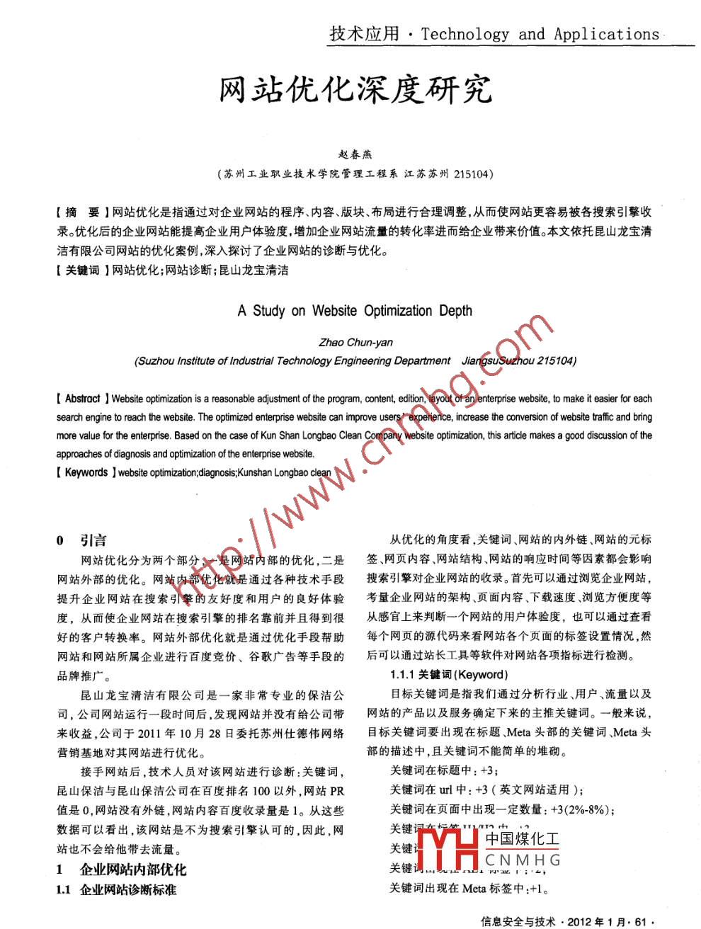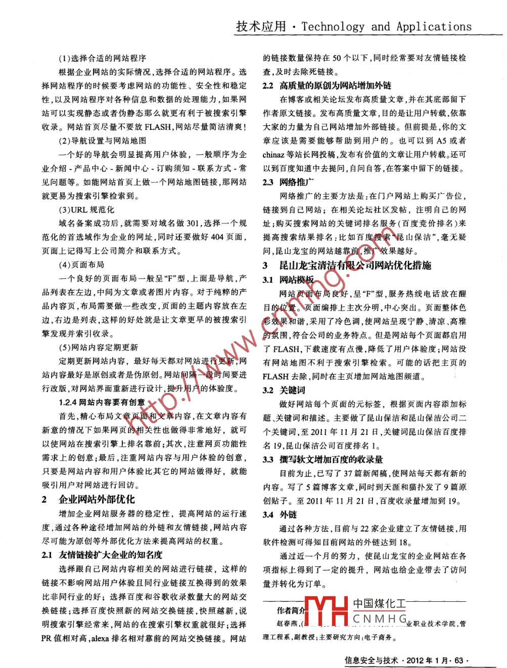 技術(shù)應(yīng)用●Technology and Appl icat ions網(wǎng)站優(yōu)化深度研究趙春燕(蘇州工業(yè)職業(yè)技術(shù)學(xué)院管理工程系江蘇蘇州215104)[摘要]網(wǎng)站優(yōu)化是指通過對企業(yè)網(wǎng)站的程序、內(nèi)容、版塊、布局進(jìn)行合理調(diào)整,從而使網(wǎng)站更容易被各搜索引擎收錄。優(yōu)化后的企業(yè)網(wǎng)站能提高企業(yè)用戶體驗(yàn)度,增加企業(yè)網(wǎng)站流量的轉(zhuǎn)化率進(jìn)而給企業(yè)帶來價(jià)值。本文依托昆山龍寶清潔有限公司網(wǎng)站的優(yōu)化案例,深入探討了企業(yè)網(wǎng)站的診斷與優(yōu)化。. [關(guān)鍵詞]網(wǎng)站優(yōu)化;網(wǎng)站診斷; 昆山龍寶清潔A Study on Website Optimization DepthZhao Chun-yan(Suzhou Institute of Industrial Technology Engineering Depatment JiangsuSuzhou 215104)[ Abstract ] Website optimization is a reasonable adjustment of the program, content, editin, layout of an enterprise website, to make it easier for eachsearch engine to reach the website. The optimized enterprise webite can improve users' experience, increase the conversion of website taffic and bringmore value for the enterprise. Based on the case of Kun Shan Longbao Clean Company website optimization, this article makes a good discussion of theapproaches of diagnosis and optimization of the enterprise website.[ Keywords ]website opiminonianosis;Kunshan Longbao clean0引言從優(yōu)化的角度看,關(guān)鍵詞、網(wǎng)站的內(nèi)外鏈、網(wǎng)站的元標(biāo)網(wǎng)站優(yōu)化分為兩個部分,-是網(wǎng)站內(nèi)部的優(yōu)化,二是簽、網(wǎng)頁內(nèi)容、網(wǎng)站結(jié)構(gòu)、網(wǎng)站的響應(yīng)時間等因素都會影響網(wǎng)站外部的優(yōu)化。網(wǎng)站內(nèi)部優(yōu)化就是通過各種技術(shù)手段搜索引擎對企業(yè)網(wǎng)站的收錄。首先可以通過瀏覽企業(yè)網(wǎng)站,提升企業(yè)網(wǎng)站在搜索引擎的友好度和用戶的良好體驗(yàn)考量企業(yè)網(wǎng)站的架構(gòu)、頁面內(nèi)容、下載速度瀏覽方便度等度,從而使企業(yè)網(wǎng)站在搜索引擎的排名靠前并且得到很從感官 上來判斷- -個網(wǎng)站的用戶體驗(yàn)度,也可以通過查看好的客戶轉(zhuǎn)換率。網(wǎng)站外部優(yōu)化就是通過優(yōu)化手段幫助每個網(wǎng)頁的源代碼來看網(wǎng)站各個頁面的標(biāo)簽設(shè)置情況,然網(wǎng)站和網(wǎng)站所屬企業(yè)進(jìn)行百度競價(jià)、谷歌廣告等手段的后可以通過站長工具等軟件對網(wǎng)站各項(xiàng)指標(biāo)進(jìn)行檢測。品牌推廣1.1.1 關(guān)鍵詞(Keyword)昆山龍寶清潔有限公司是一家非常專業(yè)的保潔公目標(biāo)關(guān)鍵詞是指我們通過分析行業(yè)、用戶、流量以及司,公司網(wǎng)站運(yùn)行-段時間后,發(fā)現(xiàn)網(wǎng)站并沒有給公司帶網(wǎng)站的產(chǎn)品以及服務(wù)確定下來的主推關(guān)鍵詞。-般來說,來收益,公司于2011年10月28日委托蘇州仕德偉網(wǎng)絡(luò)目標(biāo)關(guān)鍵詞要出現(xiàn)在標(biāo)題、Meta頭部的關(guān)鍵詞、Meta頭營銷基地對其網(wǎng)站進(jìn)行優(yōu)化。部的描述中,且關(guān)鍵詞不能簡單的堆砌。接手網(wǎng)站后,技術(shù)人員對該網(wǎng)站進(jìn)行診斷:關(guān)鍵詞,關(guān)鍵詞在標(biāo)題中: +3;昆山保潔與昆山保潔公司在百度排名100以外,網(wǎng)站PR關(guān)鍵詞在url中:+3(英文網(wǎng)站適用);值是0,網(wǎng)站沒有外鏈,網(wǎng)站內(nèi)容百度收錄量是1。從這些關(guān)鍵詞在頁面中出現(xiàn)- -定數(shù)量: +3(2%-8%);數(shù)據(jù)可以看出,該網(wǎng)站是不為搜索引擎認(rèn)可的,因此,網(wǎng)關(guān)鍵中國煤化工站也不會給他帶去流量。1企業(yè)網(wǎng)站內(nèi)部優(yōu)化CNMHG1.1 企業(yè)網(wǎng)站診斷標(biāo)準(zhǔn)關(guān)鍵詞出現(xiàn)在Meta標(biāo)簽中:+1。信息安全與技術(shù).2012年1月.61 .Technology and Applications ●技術(shù)應(yīng)用1.1.2 鏈接(Links)機(jī)器的當(dāng)機(jī)時間:-1;網(wǎng)站鏈接有網(wǎng)站的內(nèi)部鏈接和網(wǎng)站的外部鏈接,-Flash頁面: -2;般來說一個好的網(wǎng)站結(jié)構(gòu)應(yīng)該是一個扁平化的樹型網(wǎng)狀錯誤的重定向:-3。結(jié)構(gòu),網(wǎng)站頁面要有一個良好的導(dǎo)航欄便于網(wǎng)站內(nèi)部鏈診斷上述各個項(xiàng)目,把相應(yīng)的分?jǐn)?shù)進(jìn)行累加,得到最接的通暢。而在做外鏈的時候要注意鏈接對象的權(quán)重,通后分?jǐn)?shù),通常分?jǐn)?shù)越高,說明在搜索結(jié)果中獲得好排名的常情況下,門戶網(wǎng)站>行業(yè)網(wǎng)站>專業(yè)網(wǎng)站>普通網(wǎng)站機(jī)會也就越大。>公司網(wǎng)站...存在這么一個從大到小的權(quán)重關(guān)系,所以1.2企業(yè)網(wǎng)站內(nèi)部優(yōu)化有時即使你的鏈接在門戶網(wǎng)站的內(nèi)頁,也有可能比在普通過對網(wǎng)站關(guān)鍵詞、導(dǎo)航、網(wǎng)站地圖、網(wǎng)站模板等進(jìn)通網(wǎng)站的首頁價(jià)值高,其鏈接更有價(jià)值。行優(yōu)化,使企業(yè)網(wǎng)站的質(zhì)量得到提升,從而可以增加搜索導(dǎo)人鏈接(inbound links)的錨文本:+3;引擎對網(wǎng)站內(nèi)容的收錄量。導(dǎo)人鏈接的來源: +3;1.2.1網(wǎng)站結(jié)構(gòu)從相似站點(diǎn)來的鏈接: +3;網(wǎng)站結(jié)構(gòu)分為物理結(jié)構(gòu)和邏輯結(jié)構(gòu),物理結(jié)構(gòu)指的從.edu
