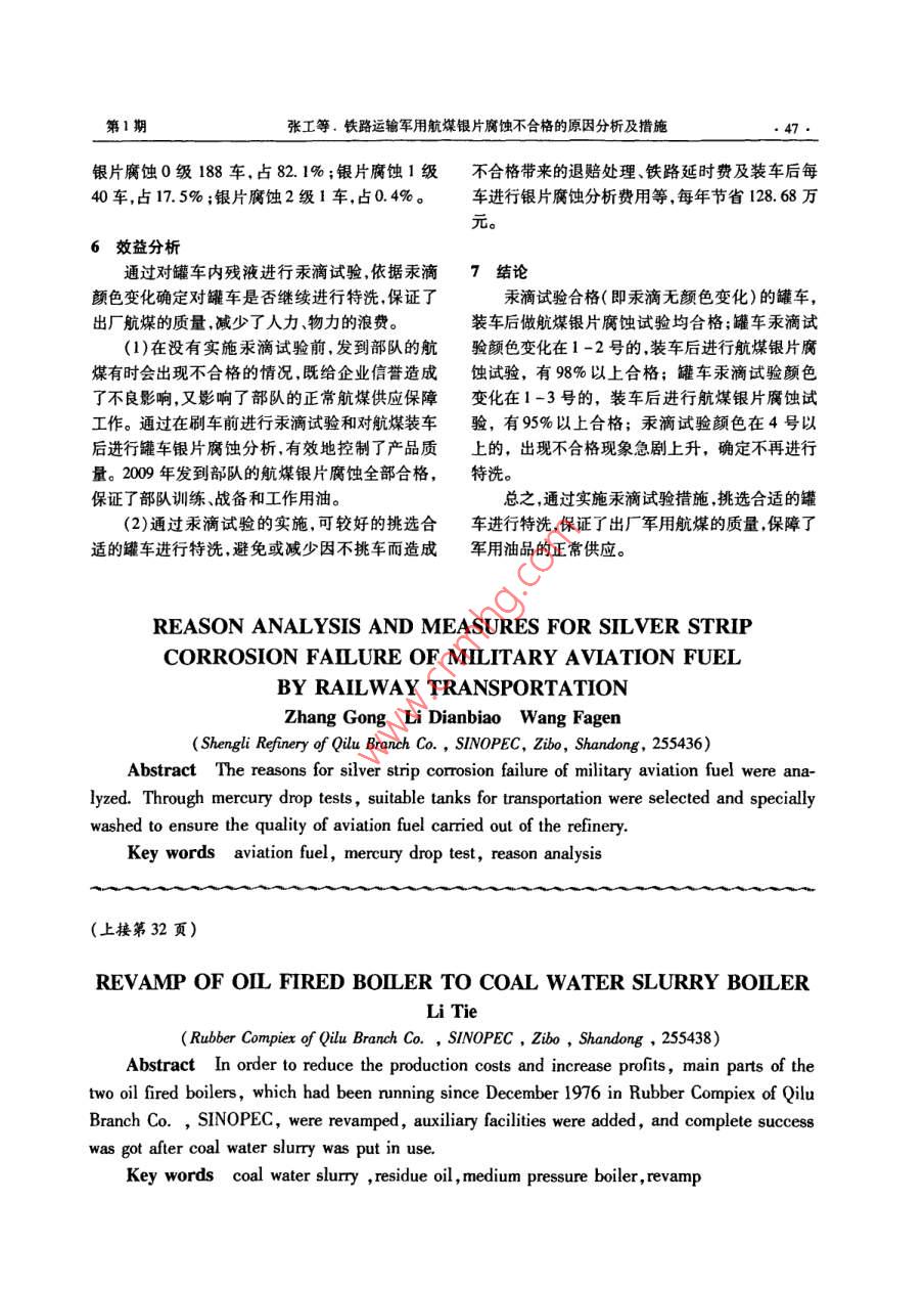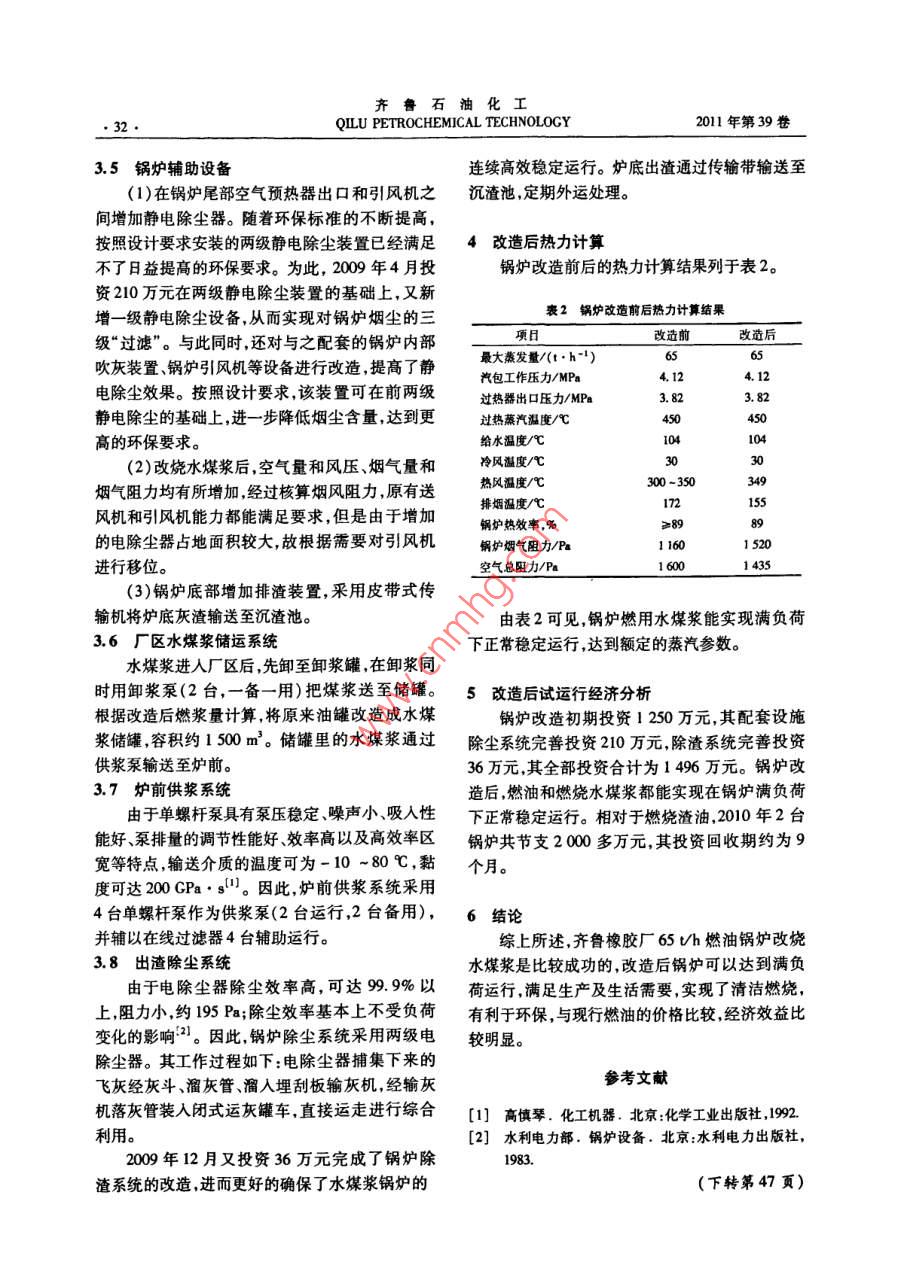 齊魯石油化工,2011,39(1):30-32工業(yè)技術(shù)QILU PETROCHEMICAL TECHNOLOGY燃油鍋爐改燒水煤漿的改造總結(jié)李鐵(中國石化齊魯分公司橡膠廠,山東淄博,255438)齊魯橡膠廠的鍋爐為1976年12月投用的燃油鍋爐,為了降低成本提高效益對其中2臺鍋爐主體進行增設(shè)輔助設(shè)施改燒水煤漿,并獲得了圓滿成功關(guān)鍵詞水煤漿渣油中壓鍋爐改造中圖分類號:1K22.2文獻標(biāo)識碼:B文章編號:1009-9859(2011)01-0030-031前育(3)燃料供給系統(tǒng)和控制系統(tǒng)遠較煤粉系統(tǒng)中國石化齊魯分公司橡膠廠(簡稱齊魯橡膠簡單廠)2臺65Uh中壓燃油鍋爐型號為F65/39-Y,(4)不存在自燃著火和粉塵飛散等問題1973年6月制造,原設(shè)計為燃煤,但1976年12月5)可以實現(xiàn)100%代油,且與油一樣易于霧投產(chǎn)后一直使用重油和渣油。爐膛為矩形截面,化燃燒穩(wěn)定。因此只需對原有燃油鍋爐進行簡尺寸為5945mmx5345mm,燃燒裝置采用四角單改造即可燃用水煤漿燃燒效率高電站鍋爐能切圓方式,切圓直徑為4600m,布置2組8個油達到98%-99%以上。燃燒器。為了進一步挖掘鍋爐潛力降低成本提(6)水煤漿儲運和燃燒方式與油接近,運行高效益在保持鍋爐現(xiàn)有各項技術(shù)參數(shù)(見表1)操作規(guī)程相似給運行人員帶來方便提高了可操不變的前提下,于2000年完成了鍋爐的全面改作性同時鍋爐能做到即可以燒水煤漿又可以燒造,將鍋爐燃料由重油和渣油改為水煤漿油(7)在水煤漿加工過程中,可以進行不同程表1原燃油鍋爐的主要技術(shù)參數(shù)度的脫灰、脫硫處理,因此,燃燒時放出的SO2、項目數(shù)值NOx等污染物可大大減少,環(huán)保效益好,是一種額定蒸發(fā)量/(t·h1)清潔燃料。額定燕汽壓力/MPa3.82(8)運行成本降低。額定蒸汽溫度/℃因此,在石油資源日趨緊缺、價格不斷攀升的排煙溫度/℃140~160今天,水煤漿就成為一種非常理想的代油燃料。鍋爐熱效率%我國水煤漿技術(shù)與國外先進水平相比,在工程的大型化、商業(yè)化、大型制漿工藝(尤其是大容2水煤漿的優(yōu)點量制漿設(shè)備以及關(guān)鍵設(shè)備的耐磨性能和壽命方水煤漿是一種新型煤基流體燃料,普通水煤面)、管道輸漿、大型燃燒設(shè)備、自動化程度等方漿由65%-70%的煤粉、30%35%的水和1%面都不相上下。2%的添加劑通過物理方法加工而成水煤漿具因此,齊魯橡膠廠燃油鍋爐改燒水煤漿,在技有以下優(yōu)點:術(shù)上是有保證的,且具有顯著的經(jīng)濟效益(1)良好的流動性、穩(wěn)定性、易運輸,可減少運輸過程中的損失,特別是可以液體燃料的方式收稿日期:2010-11-02;修回日期:2011-02-2。作者簡介:李鐵(1978-),男,工程師。2001年畢業(yè)于石油用泵和管道輸送。大學(xué)(華東)化工設(shè)備與機械專業(yè)現(xiàn)任中國石化齊魯分公司(2)加工方法簡單,易貯存。橡膠廠鍋爐車間設(shè)備員。電話:0533-7544859。第1期李鐵.燃油鍋爐改燒水煤漿的改造總結(jié)3改造措施3.1爐膛(1)因水煤漿燃燒器高度和寬度要大于油燃上二次風(fēng)燒器,原水冷壁的開口要作相應(yīng)改變。(2)為了強化水煤漿著火,在爐膛燃燒器區(qū)域布置一定數(shù)量的衛(wèi)燃帶,其布置圖如圖1和圖上一次風(fēng)2所示。更換減溫器中二次風(fēng)19下一次風(fēng)下二次風(fēng)更換水煤漿燃燒器,數(shù)圖3單角燃燒器布置示意設(shè)衛(wèi)燃帶5733燃燒器四角切圓布置,兩層一次風(fēng)燃燒器中均布置水煤漿噴嘴,正常運行時投用8個水煤漿噴嘴。鍋爐啟動時,處于下二次風(fēng)噴口的點火油槍首先投用,啟動鍋爐到一定負荷時再逐個投入圖1鍋爐主體改造示意水煤漿主燃燒器,待鍋爐達到要求負荷并且水煤漿能穩(wěn)定燃燒時,停用點火油槍。A My燃用水煤漿時,鍋爐最低負荷約為50%3.3水煤漿噴嘴采用由浙江大學(xué)研制的撞擊式多級霧化型水煤漿噴嘴,如圖4所示,容量為1.6U/h。左側(cè)墻右側(cè)墻2級霧化頭撞擊頭混合室混合室2燃燒器區(qū)域衛(wèi)燃帶布置示意化氣霧化氣3級霧化氣(3)增加部分開孔,如燃燒器附近的打焦孔、吹灰孔等圖4水煤漿噴嘴結(jié)構(gòu)示意3.2燃燒器在原燃燒器位置安裝水煤漿燃燒器。設(shè)計燃3.4更換減溫器燒器共5層,一次風(fēng)2層,二次風(fēng)3層,自上而下根據(jù)熱力學(xué)計算,過熱器和省煤器等均不需分別為上二次風(fēng)、上一次風(fēng)、中二次風(fēng)、下一次風(fēng)要作改動。由于減溫水量的要求有所變化,故更和下二次風(fēng)。其布局如圖3所示。換減溫器減溫器位置如圖1所示。齊魯石油化工QILU PETROCHEMICAL TECHNOLOGY2011年第39卷3.5鍋爐輔助設(shè)備連續(xù)高效穩(wěn)定運行。爐底出渣通過傳輸帶輸送至(1)在鍋爐尾部空氣預(yù)熱器出口和引風(fēng)機之沉渣池,定期外運處理。間增加靜電除塵器。隨著環(huán)保標(biāo)準(zhǔn)的不斷提高按照設(shè)計要求安裝的兩級靜電除塵裝置已經(jīng)滿足4改造后熱力計算不了日益提高的環(huán)保要求。為此,2009年4月投鍋爐改造前后的熱力計算結(jié)果列于表2。資210萬元在兩級靜電除塵裝置的基礎(chǔ)上,又新表2鍋爐改造前后熱力計算結(jié)果電除塵效果。按照設(shè)計要求,該裝置可在前兩級過熱器出口壓力/MPa3.82靜電除塵的基礎(chǔ)上,進一步降低煙塵含量,達到更過熱蒸汽溫度/450高的環(huán)保要求。給水溫度/℃(2)改燒水煤漿后,空氣量和風(fēng)壓、煙氣