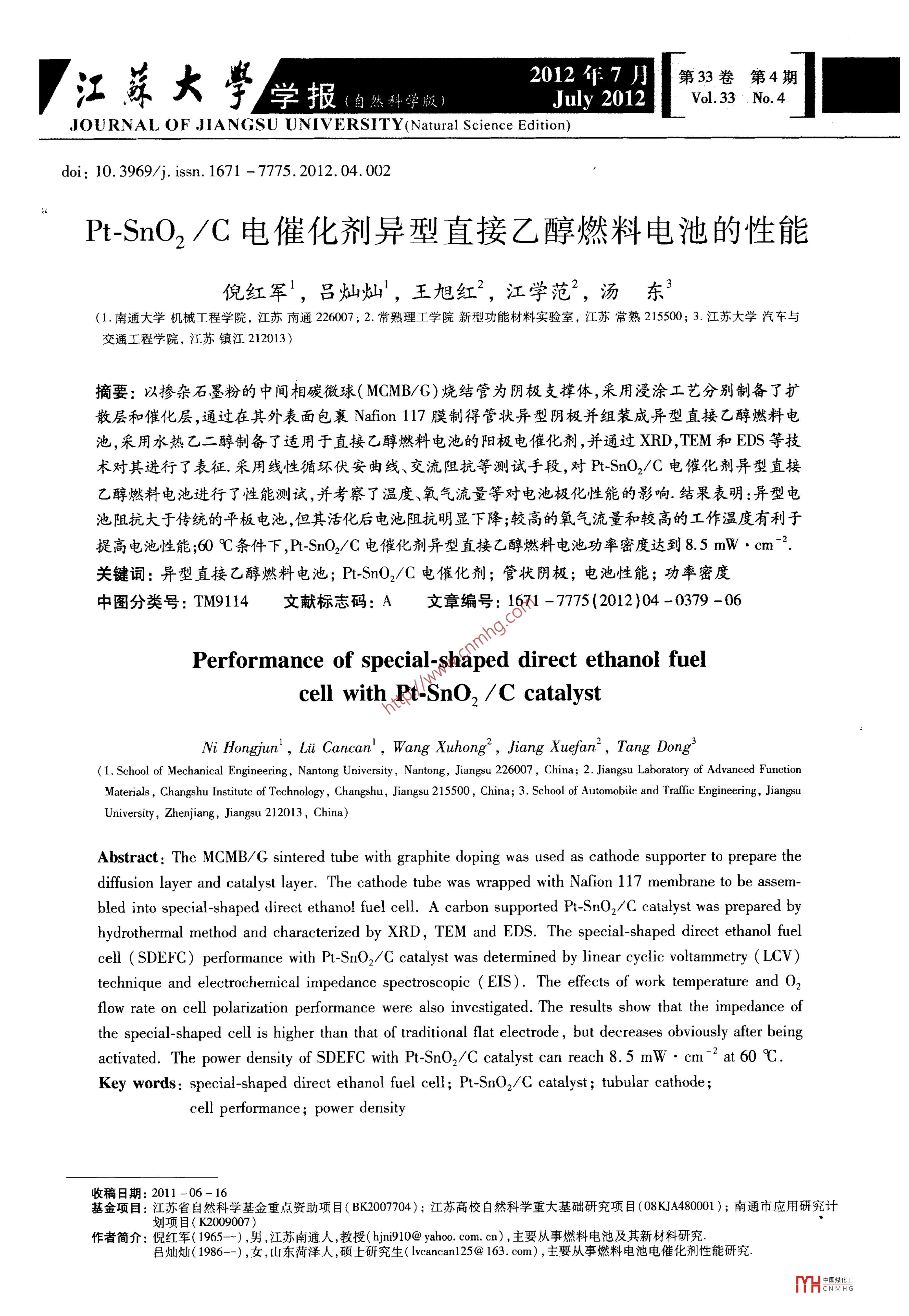 江大/學報2012年7第3卷第4期July 2012Vol33 No 4JOURNAL OF JIANGSU UNIVERSITY(Natural Science Edition)doi:10.3969/j.iss.1671-7775.2012.04.002PSnO2C電催化劑異型直接乙醇燃料電池的性能倪紅軍!,呂燦燦,王旭紅2,江學范2,湯東(1.南通大學機械工程學院,江蘇南通226007;2.常熟理工學院新型功能材料實驗室,江蘇常熟215500;3.江蘇大學汽車與交通工程學院,江蘇鎮(zhèn)江212013)摘要:以摻雜石墨粉的中間相碳微球(MCMB/∽)燒結管為陰極攴撐體,采用浸涂工藝分別制備了擴散層和催化層,通過在其外表面包襄 Nafion117膜制得管狀異型陰極并組裝成異型直接乙醇燃料電池,采用水熱乙二醇制備了適用于直接乙醇燃料電池的陽極電催化劑,并通過ⅹRD,TEM和EDS等技術對其進行了表征.禾用線性循環(huán)伏安曲線、交流阻抗等測試手段,對 Pt-SnO2/C電催化劑異型直接乙醇燃料電池進行了性能測試,并考察了溫度、氧氣流量等對電池極化性能的影響.結果表明:異型電池阻抗大于傳統(tǒng)的平板電池,但其活化后電池阻抗明顯下降;較高的氧氣流量和較高的工作溫度有利于提高電池性能;60℃條件下, Pt-Sno2/C電催化劑異型直接乙醇燃料電池功率密度達到8.5mW·cmˉ2關鍵詞:異型直接乙醉燃料電池; PI-Sno2C電催化劑;管狀陰極;電池性能;功率密度中圖分類號:TM9114文獻標志碼:A文章編號:1671-775(2012)04-0379-06Performance of special-shaped direct ethanol fuelcell with Pt-SnO,/c catalystNi Hongjun, Li Cancan, Wang Xuhong", Jiang Xuefan, Tang Dong(1. School of Mechanical Engineering, Nantong University, Nantong, Jiangsu 226007, China; 2. Jiangsu Laboratory of Advanced Functionhangshu Institute of Technology, Changshu, Jiangsu 215500, China; 3. School of Automobile and Trafic Engineering, JiangsuersityAbstract: The MCMB/G sintered tube with graphite doping was used as cathode supporter to prepare thediffusion layer and catalyst layer. The cathode tube was wrapped with Nafion 117 membrane to be assembled into special-shaped direct ethanol fuel cell. A carbon supported Pt-Sn02/C catalyst was prepared byhydrothermal method and characterized by XRD, TEM and EDS. The special-shaped direct ethanol fuelcell( SDEFC )performance with PL-Sn02/C catalyst was determined by linear cyclic voltammetry(LCVtechnique and electrochemical impedance spectroscopic(EIS). The effects of work temperature and O2flow rate on cell polarization performance were also investigated The results show that the impedance ofthe special-shaped cell is higher than that of traditional flat electrode, but decreases obviously after beingactivated. The power density of SDEFC with Pt -Sn0, /C catalyst can reach 8. 5 mw.cm" at 60CKey words: special-shaped direct ethanol fuel cell; Pt-SnO2/C catalyst; tubular cathodecell performance; power density收稿日期:2011-06-16基金項目:江蘇省自然科學基金重點資助項目(BK007704);江蘇高校自然科學重大基礎研究項目(08KJA480001);南通市應用研究計劃項目(K2009007作者簡介:倪紅軍(1965-),男,江蘇南通人,教授(hn910@yahoocom.cn),主要從事燃料電池及其新材料研究呂燦燦(1986--),女,山東菏澤人,碩土研究生(Iveancan125@163.com),主要從事燃料電池電催化劑性能研究YH出380江蘇大學學報(自然科學版)第33卷直接醇類燃料電池由于其操作簡單,燃料易于1.2管狀陰極及陽極制備儲存和攜帶,成為當前燃料電池研究的熱點問試驗制備的陰極和陽極,如圖1所示題13.但甲醇有毒,滲透現(xiàn)象嚴重,大大降低電池性能和利用率,乙醇是一種最有希望替代甲醇的燃料,具有來源豐富、無毒性、含氫量高等優(yōu)點,在某些條件下其化學活性與甲醇接近.開發(fā)直接乙醇燃料電池( direct ethanol fuel cel,DEFC)對解決能源短缺和環(huán)境保護具有重要意義,在小型獨立電源、國防通訊、攝像機和筆記本電腦電源等領域具有廣~闊的(a)包裹 Nafion膜的陰極(b)噴涂電催化劑的陽極應用前景.H前阻礙DEFC商業(yè)應用的主要因素:乙圖1試驗制備的陰極和陽極醇完全電氧化是一個12電子轉移過程,并必須斷裂C—C鍵,極易引起催化劑中毒,降低電池輸出電壓管狀陰極管制備參見文獻[8],包裹膜為 Nafion還會導致陰極催化劑中毒而大大縮短電池壽命,所117膜,所制得的管狀陰極如圖la所示.管狀陰極以電催化劑的研究成為DEC研究的一個主要方的編號為1#,2#,對應的質量分數(shù)為30%,40%的石墨粉;壁厚均為1.3mm;擴散層載量均為3.5mg為了解決電催化劑中毒,降低成本等問題,國內m2;催化層載量均為3.0mg·cm-2.外學者研究重點放在高活性的電催化劑的制備上,以H2PCl6·6H2O,SnCl2·5H2O為前驅體,碳并未有實質性突破傳統(tǒng)的平板型DEFC由于不能粉為載體,按鉑錫原子比3:1將2種前驅體和碳粉存儲燃料、需配備較復雜的燃料儲罐和進料系統(tǒng),因在乙二醇(EG)中混合成漿液,NaOH溶液調節(jié)pH此電池系統(tǒng)復雜.研究者對傳統(tǒng)的電池結構進行了值,超聲分散30min后放到水熱反應釜中,在170℃改進,著手研究異型直接乙醇燃料電池( special下反應12h.詳細制備過程見文獻[9].陽極催化層shaped direct ethanol fuel cell, SDEFC)6.倪紅軍米用靜電紡絲技術進行制備,SDFC電化學性能研等以管狀金屬鈦網(wǎng)為攴撐體制備了管狀陰極究所釆用的陽極PSnO2電催化劑其催化層Pt擔載DEFC并對其性能進行了研究,但是金屬鈦網(wǎng)管制量均為1.5mg·cm2,如圖b所示作工藝復雜,成本非常昂貴筆者以凝膠注模工藝制1.3陽極電催化劑的表征與性能測試備管狀陰極支撐體,涂覆擴散層和催化層后制作成采用日本 Rigaku公司的D/max-2200/PCX管狀陰極;以P1SnO2C為陽極電催化劑,通過靜電