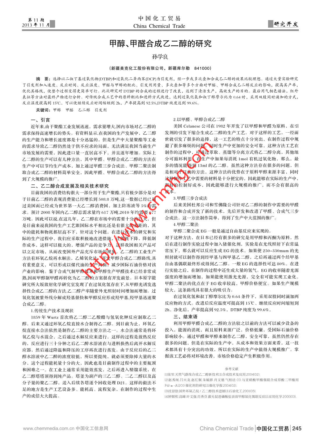 第11期中國化工貿易2013年11月China Chemical Trade研究開發(fā).甲醇、甲醛合成乙二醇的研究孫學良(新疆美克化工股份有限公司,新疆庫爾勒841000)摘要:選擇以二叔丁基過氧化物DTBP)和過氧化二異丙苯(DCP)為引發(fā)劑,經一步或多次疊加合成乙二醇的效果比較理想。通過大量實驗研究了引發(fā)劑加入速度、反應時間、反應溫度、甲醛與甲醇的配比、引發(fā)劑用量、多次疊加等多個方面對甲醛、甲醇合成乙二醇反應的影響,提高其產率,優(yōu)化其路線,使整個過程變得更簡單可行。此次研究對DTBP的合成的過程進行了改良,達到了清潔生產,高效生產的目的。最后用氣相色譜法,紅外表征等方法對最終產物進行分析。對傳統(tǒng)合成工藝中的原料配比和進料方式改進,達到過氧化氫和叔丁醇摩爾比為0.64時,采用雙股同時滴加的方式,反應溫度提高到15°C、可以使繼續(xù)反應時間縮短到2h,產率提高到92.5%,DTBP純度達到99.6%。關鍵詞:甲醇甲醛乙二醇引發(fā)劑一、引言2.以甲醛、甲醇合成乙二醇近年來,由于聚酯工業(yè)發(fā)展迅速,需求量增大,國內市場對乙二醇的美國Celanese公司在1982年開發(fā)了以甲醇和甲醛為原料,在引需求保持高速增長的勢頭。有資料顯示,在我國的生產發(fā)展中,乙二醇發(fā) 劑的引發(fā)下縮合生成乙二醇的生產工藝。對于這樣的工藝,一經面的生產能力和增長速度都是十分迅猛的,但是生產中大量聚酯等工業(yè)世就引發(fā)了 很多的追捧,這- - 工藝的特點十分突出,在制作過程中規(guī)的需求導致乙二醇仍然處于供不應求的局面,無法滿足我國當前生產避 了很多麻煩的問題,同時生產中更加的安全可靠,這種方法工藝在市場發(fā)展的需要,因此進口量一直居高不下, 并且逐年增加。實際上制作的過程中, 可通過萃取、蒸餾等分離方式將乙:二醇分離,其他組乙二醇的生產可以有幾種方法,其中甲醛、甲醇合成乙二醇的方法在分可循環(huán)利用。 在生產中如果每消耗1mol有機過氧化物,那么,最生產中可以節(jié)約生產成本,加上通過甲醛三步合成法、甲醇二聚法制多的情況能得到 13ml的乙二醇。雖然這種方法存在很多的問題,但取合成乙二醇的材料簡單安全,因此甲醛、甲醇合成乙二醇的方法得是 相對于以前的方法,這種方法的優(yōu)勢在于原料甲醇來源豐富,同時到了大規(guī)模的推J這種制作I藝中需要的材料是十分便宜的,因此能夠在實際的生產中,二、乙二醇合成發(fā)展及相關技術研究很好的控制好成本,因此能夠進行大規(guī)模的推廣,而不會有很高的目前我國的消費結構很大一部分用于生產聚酯,只有極少部分是對成本。于目前乙二醇的表觀消費量已經增長到508.8萬噸,這一數據已經已 超3.甲醛三步合成法過美國而已經成為世界第一-大乙二二醇消費國,加上防凍液等5%的需后來美國杜邦公司和雪佛隆公司針對乙二醇的制作中需要的甲醛求。預計2008年國內乙二醇總需求量約617萬噸、2010年約需要677的制作 和合成開發(fā)了新的技術,先后開發(fā)和改進了甲醛、合成氣三步萬噸。因此可以說,在這幾年,乙二醇在市場中的需要十分的巨大,但合成法。 這一方法制作簡單,得到了生產中大范圍的推廣是目前來說我國的生產工藝跟國際水平相比還是有很大的差距的,其4.甲醇二聚法中的能耗和物耗都居高不下,針對這個問題,在進行技術的研究和實甲醇二聚合成EG一般是通過自由基反應來實現(xiàn)的。際的生產過程中,我們應采取積極地改進措施,讓能耗下降,降低制對于這種方法, 在日本已經有很多的研究是用甲醇和丙酮為原料,然作成本,這樣可以極大的,增強產品的競爭力,這樣我國相關產品可后 在進行制作實驗過程中加入鍺催化劑,實驗是在光線照射下在常溫以立足市場,從而改變國外產品充斥市場的現(xiàn)象。乙二醇的工業(yè)生產常壓下,那么就可以反應生成EG的技術。如果使250-330mum的光方法有環(huán)氧乙烷再水解法,乙烯氧化法。開發(fā)甲醇合成乙二醇路線,其照射就可以制作得到經甲 基與四甲基乙二醇,之后再通過兩個經甲基有重要意義,可以形成以煤代油的生產局面,減少國際石油價格對該自 由基偶聯(lián)最終形成得到乙二醇。一般 EG的選擇性可達80%。在進產業(yè)的影響。鑒于合成氣制甲醇技術和甲醇生產甲醛技術已經非常成行實驗之后, 在制作的過程中還生成大量的氫氣。EG的收率隨著光源熟因而甲醇制甲醛再轉化為乙二醇的方案很有開發(fā)前景。日本原字能強 度的增加而增加,如果能使用激光光源,完全有可能實現(xiàn)工業(yè)化。研究所大坂放射化學研究室發(fā)現(xiàn)了在過氧化氫存在下,從甲醇光誘發(fā)選甲醇 二聚法的優(yōu)點在于EG收率較高,甲醇價格便宜。如果生產規(guī)模擇性合成乙二醇的方法,乙二醇產率隨紫外光照射時間增加而增加。過較大, 這條路線具有很大的吸引力。氧化氫被紫外線分解成羥基很快和甲醇反應形成羥甲基,羥甲基迅速聚在過氧化氫和叔丁醇摩爾比為0.64條件下,采用雙股同時滴加兩合成乙二醇。反應物的方式。改進后反應溫度可提高到15C、繼續(xù)反應時間縮短到1.傳統(tǒng)生產技術及現(xiàn)狀2h。凈化后,產率提高到92.5%,DTBP純度為99.6%。1859年Wurtz首次將乙二醇二乙酸醋與氫氧化鉀反應制取乙二三、結束語醇。后來又通過環(huán)氧乙烷直接水合制得乙二醇。 