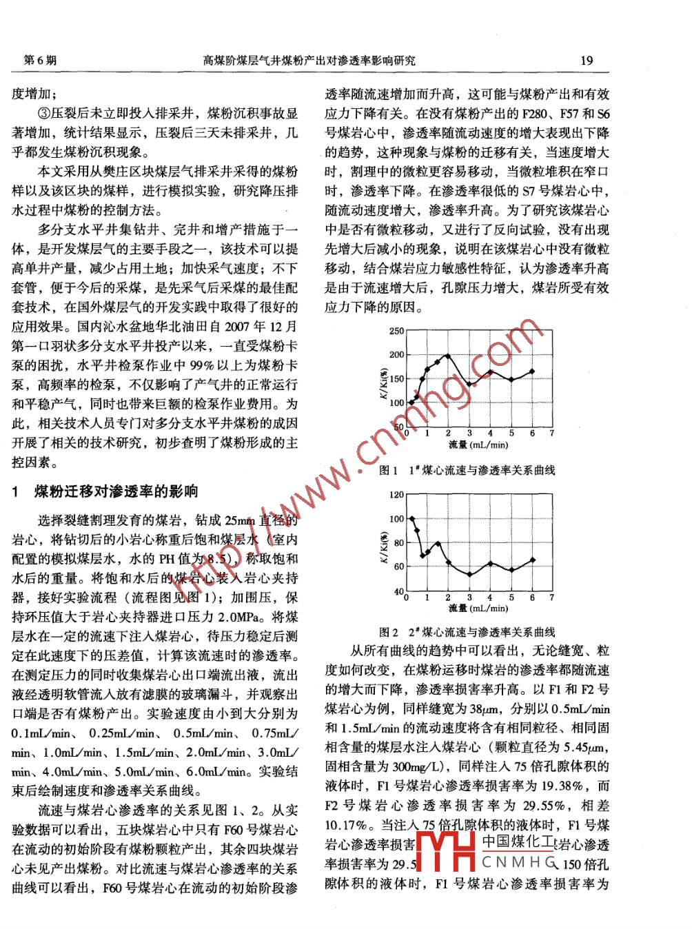 第8卷第6期中國煤層氣Vol. 8 No 60ll年12月CHINA COALBED METHANEDecember 2011高煤階煤層氣井煤粉產(chǎn)出對滲透率影響研究白建梅孫玉英李薇崔金榜周燦華北油田公司采油工藝研究院,河北062552)摘要:高煤階煤層氣井在鉆井、開采過程中由于機械碰撞、氣液沖刷、壓力波動等外力作用不可避免的會產(chǎn)生煤粉,煤粉的產(chǎn)出一方面有利于形成氣液產(chǎn)出通道,但另一方面如果過快、過多的產(chǎn)出使氣水流動出現(xiàn)障礙,引起產(chǎn)氣量下降,同時頻繁的檢泵作業(yè)導(dǎo)致氣井的解吸-吸附過程交錯進行,嚴重影響了氣井的正常生產(chǎn);本文通過煤粉產(chǎn)出與滲透率的關(guān)系、排采速度對煤粉產(chǎn)出的影響等室內(nèi)模擬實驗,論證了高煤階煤層氣井煤粉產(chǎn)出控制的重要性。關(guān)鍵詞:高煤階煤粉產(chǎn)出控制Study of the Impact of Coal Dust Yield on Permeability Rate in HighRank CBm WellBai Jianmei, Sun Yuying, Li Wei, Cui Jinpang, Zhou CanPetroleum Recovery Technology Research Institute, North China Oil field Company, Hebei 062552)Abstract: High rank of CBM well will inevitably produce coal dusts in the process of well boring, gas extrac-tion due to external forces, like mechanical collision, gas and fluid flushing, fluctuation of pressure, etc. Ocurrence of cuttings on one hand, is favorable to formation of passages for the yielded gas and fluid, one theother hand, too many dusts become obstacles to gas and water flow, resulting in drop of production, and alternate desorption and absorption due to frequent repair of pump. All these affected seriously normal operation ofgas well. The paper discusses the importance of controlling formation of fine coal in high rank CBM well, bymaking laboratory tests to understand the relationship between yield of coal dusts and permeability rate as wellas the influence of gas extraction rate on yield of coal fines, etcKeywords: High coal rank; yield of coal dusts; control煤巖是一種抗壓和抗拉強度較低的脆弱介質(zhì),驗,煤粉產(chǎn)出呈現(xiàn)出一些基本規(guī)律在鉆井、開采過程中煤巖由于受到較大的壓力波①動液面初次降至煤層附近時,可能出現(xiàn)一個動、水力沖擊震動,液柱的機械碰撞等外力作用容煤粉相對高發(fā)期,統(tǒng)計結(jié)果顯示,該階段煤粉爆發(fā)易使煤巖結(jié)構(gòu)破壞,可能導(dǎo)致井壁坍塌,堵塞煤巖的幾率較排采的其他時間段高出50%以上;裂縫等不利煤層氣開采的后果。②煤粉產(chǎn)出與降液速率密切相關(guān).排液工作制根據(jù)沁水盆地南部樊莊區(qū)塊煤層氣排采實踐經(jīng)度過強』V凵中國煤化工煤粉產(chǎn)出幾率大幅CNMHG基金項目“國家科技重大專項項目”資助。作者簡介白建梅,高級工程師,200年獲中國石油大學(xué)(華東)油氣田工程碩士學(xué)位,現(xiàn)主要從事煤層氣開采發(fā)研究工作。第6期高煤階煤層氣井煤粉產(chǎn)出對滲透率影響研究度增加;透率隨流速增加而升高,這可能與煤粉產(chǎn)出和有效③壓裂后未立即投入排采井,煤粉沉積事故顯應(yīng)力下降有關(guān)。在沒有煤粉產(chǎn)出的F280、F57和S6著增加,統(tǒng)計結(jié)果顯示,壓裂后三天未排采井,幾號煤巖心中,滲透率隨流動速度的增大表現(xiàn)出下降乎都發(fā)生煤粉沉積現(xiàn)象。的趨勢,這種現(xiàn)象與煤粉的遷移有關(guān),當速度增大本文釆用從樊莊區(qū)塊煤層氣排采井采得的煤粉時,割理中的微粒更容易移動,當微粒堆積在窄口樣以及該區(qū)塊的煤樣,進行模擬實驗,研究降壓排時,滲透率下降。在滲透率很低的S7號煤巖心中,水過程中煤粉的控制方法。隨流動速度增大,滲透率升高。為了研究該煤巖心多分支水平井集鉆井、完井和增產(chǎn)措施于一中是否有微粒移動,又進行了反向試驗,沒有出現(xiàn)體,是開發(fā)煤層氣的主要手段之一,該技術(shù)可以提先增大后減小的現(xiàn)象,說明在該煤巖心中沒有微粒高單井產(chǎn)量,減少占用土地;加快采氣速度;不下移動,結(jié)合煤巖應(yīng)力敏感性特征,認為滲透率升高套管,便于今后的采煤,是先采氣后采煤的最佳配是由于流速增大后,孔隙壓力增大,煤巖所受有效套技術(shù),在國外煤層氣的開發(fā)實踐中取得了很好的應(yīng)力下降的原因。應(yīng)用效果。國內(nèi)沁水盆地華北油田自2007年12月第一口羽狀多分支水平井投產(chǎn)以來,一直受煤粉卡200泵的困擾,水平井檢泵作業(yè)中99%以上為煤粉卡泵,高頻率的檢泵,不僅影響了產(chǎn)氣井的正常運行和平穩(wěn)產(chǎn)氣,同時也帶來巨額的檢泵作業(yè)費用。為100此,相關(guān)技術(shù)人員專門對多分支水平井煤粉的成因開展了相關(guān)的技術(shù)研究,初步查明了煤粉形成的主流量(mL/min)控因素。圖11煤心流速與滲透率關(guān)系曲線1煤粉遷移對滲透率的影響選擇裂縫割理發(fā)育的煤巖,鉆成25mm直徑的100巖心,將鉆切后的小巖心稱重后飽和煤層水(室內(nèi)配置的模擬煤層水,水的PH值為8.5),稱取飽和水后的重量。將飽和水后的煤巖心裝入巖心夾持器,接好實驗流程(流程圖見圖1);加圍壓,保1持環(huán)壓值大于巖心夾持器進口壓力20MPa。將煤流量(mL/min)層水在一定的流速下注入煤巖心,待壓力穩(wěn)定后測圖22*煤心流速與滲透率關(guān)系曲線定在此速度下的壓差值,計算該流速時的滲透率。從所有曲線的趨勢中可以看出,無論縫寬、粒在測定壓力的同時收集煤巖心出口端流出液,流出度如何改變