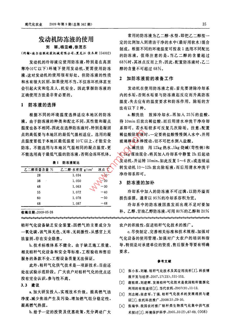 現(xiàn)代化農(nóng)業(yè)2009年第9期(總第362期)淺談秸稈氣化供氣技術(shù)劉淵',閆立衡’(1.農(nóng)業(yè)部干燥機械設(shè)備質(zhì)量監(jiān)督檢驗測試中心,黑龍江佳木斯154007;2.黑龍江省農(nóng)墾科學(xué)院)摘要:介紹了秸稈氣化的原理和秸稈氣化供氣工藝流程,闡述了秸稈氣化供氣技術(shù)的優(yōu)勢,分析了目前該項技術(shù)存在的問題,提出了相應(yīng)的改進(jìn)建議。關(guān)鍵詞:秸稈氣化;供氣;可再生能源秸稈氣化技術(shù)改變了原料的使用狀態(tài),產(chǎn)生的經(jīng)上料機送人氣化爐,在氣化爐內(nèi)進(jìn)行燃燒和還原秸稈氣的用途與城市煤氣相同,是一種清潔、方便、反應(yīng)產(chǎn)生燃?xì)猓?進(jìn)入燃?xì)鈨艋到y(tǒng)(由氣體降溫、水廉價的可再生能源,秸稈氣燃燒穩(wěn)定、熱效率高,適凈化處理、焦油分離三部分組成),凈化處理后的污用于炊事和取暖鍋爐等。秸稈氣化技術(shù)在農(nóng)村的應(yīng)水進(jìn)入凈化池,經(jīng)沉淀凈化處理后返回機組重新使用前景廣闊,可減少農(nóng)民開支.提高農(nóng)民生活質(zhì)量,用,不外排;凈化后的燃?xì)饨?jīng)風(fēng)機送入儲氣柜(儲氣具有較大的推廣價值,有利于改善農(nóng)民居住環(huán)境,提柜的作用主要 是儲存燃?xì)?,調(diào)節(jié)用氣量,保持氣柜恒高農(nóng)民生活水平。定壓力,使燃?xì)鉅t灶供氣穩(wěn)定),從儲氣柜出來的燃?xì)馔ㄟ^鋪設(shè)在地下的管網(wǎng)輸送到系統(tǒng)中的用戶。1秸稈氣化的原理[凈化池]秸稈氣化是將秸稈轉(zhuǎn)化為氣體燃料的熱化學(xué)過程。秸稈氣化過程包括4個反應(yīng)區(qū)的工作,依次為粉碎機-送料機-+氣化們-降溫除塵-凈化器氧化區(qū),還原區(qū),熱解區(qū)(裂解區(qū))和干燥區(qū)。秸稈氣用戶-管網(wǎng)一儲氣相-水封器←氣水分離器-風(fēng)機化反應(yīng)原理圖見圖1。秸稈氣化的整個反應(yīng)過程很圖2秸稈氣化集 中供氣工藝流程復(fù)雜,不同的氣化爐的類型、原料性質(zhì)、原料粉碎條戶用秸稈氣化供氣工藝流程如圖3。原料直接件、氣化劑的種類、工藝流程、反應(yīng)條件等其反應(yīng)過喂人氣化爐,在氣化爐中產(chǎn)生燃?xì)?燃?xì)庥奢敋夤苤脸桃膊槐M相同,但不同條件下的秸稈氣化過程基本分氣箱,最后輸送到農(nóng)戶的炊事灶或水加熱器。相同。燃料|↑氣體原料-氣化圳-輸氣管-分氣箱一歐事煙干燥層H0 (水蒸氣)水加熱器100C-250C圖3戶用秸稈氣化 供氣工藝流程熱分解層可燃?xì)怏w(Co, H, .300C3秸稈氣化供氣技術(shù)的優(yōu)缺點及 建議500CCH,CO,等) +液體800C(包括焦油和水蒸氣) +炭3.1優(yōu)點還原層C+C0,- →2C0a.秸稈燃燒充分,殘余灰燼僅為7%;硫量低,. 900. C+H,0- -H,+CO含硫量為0. 38%。氧化層C+02-→CO .b.熱值高,2t秸稈的熱值相當(dāng)于1t 煤,燃燒溫_ 1200C_度高,燃燒火力強,升溫快,節(jié)省時間?;曳帧齝.可調(diào)挖燃燒的火焰溫度,熱能強度可控制調(diào)圖1秸稈氣化反應(yīng)過程節(jié),并實現(xiàn)開、關(guān)兩位操作,使用方便。d. 秸稈氣化供氣技術(shù)不受季節(jié)約束,可實現(xiàn)不2秸稈氣化供氣工藝流程間斷供氣。秸稈氣化供氣技術(shù)主要分為戶用秸稈氣化供氣3.2 存在的主要問題技術(shù)和秸稈氣化集中供氣技術(shù)。秸稈氣化集中供氣a.燃?xì)馄焚|(zhì)有待完善。生物質(zhì)燃?xì)鉂崈舳绕に嚵鞒倘鐖D2.秸稈原料經(jīng)過粉碎達(dá)到要求后,低,燃?xì)饨M分不穩(wěn)定,焦油不易去除,秸稈氣化過程收稿日期:2009-06-01中產(chǎn)生焦油廢水,若隨意傾倒易造成二次污染;部分現(xiàn)代化農(nóng)業(yè)2009年第9期(總第362期)35常用的防凍液為乙二醇-水型,即把乙二醇按一發(fā)動機防凍液的使用定的比例加人到清潔千凈的水中(最好用軟水)混合劉麗,楊亞峰,徐茂志制成。根據(jù)不同的環(huán)境溫度可按表1選用不同配比(約翰*迪爾佳聯(lián)收獲機械有限公司,黑龍江佳木斯15402)的防凍液。值得注意的是,當(dāng)乙二醇的含量超過發(fā)動機的冷卻液應(yīng)使用防凍液。特別是在高原68%時,其冰點反而上升,因此,配置防凍液時,乙二寒冷(0C以下)環(huán)境下使用發(fā)動機,更需使用防凍醇的含量不可超過68%。液,這對發(fā)動機的使用很有好處。但防凍液的性質(zhì)2加防凍液前的準(zhǔn) 備工作和水有很大區(qū)別,如果使用不當(dāng),不僅凍壞機體甚至?xí)鸹馂?zāi)和危及人、機安全。因此掌握防凍液的發(fā)動機在使用防凍液之前,首先要清除冷卻系正確使用方法是非常必要的。內(nèi)的水垢,否則水垢要與防凍液起反應(yīng)而升高防凍溫度,失去應(yīng)有的溫度要求和防凍作用。除垢的方1防凍液的選擇法有以下2種。根據(jù)不同的環(huán)境溫度選擇適應(yīng)本地區(qū)的防凍a.酸洗法放掉冷卻水, 再加入25%的鹽酸,液。由于防凍液的種類和配比不同,其性能和凝點待10min后放出稀鹽酸,而后用清水沖洗干凈冷卻溫度也各不相同,因此在選擇防凍液時,特別是凝固系即可。若水垢較多可反復(fù)幾次除垢。注意:配置點的高低要與本地區(qū)的最低氣溫相適應(yīng)。選用的凝稀鹽酸除垢液時,一-定要將鹽酸慢慢倒入水中,并用點溫度要低于本地區(qū)最低溫度10C以上,才能安全玻璃棒或木棒攪動,切不可把水倒人鹽酸。防凍。不能選用與本地區(qū)氣溫相同的凝點溫度,更b.堿洗法用12kg熱水.1k