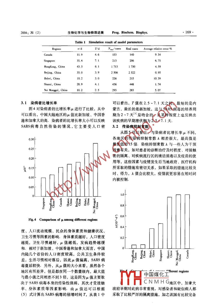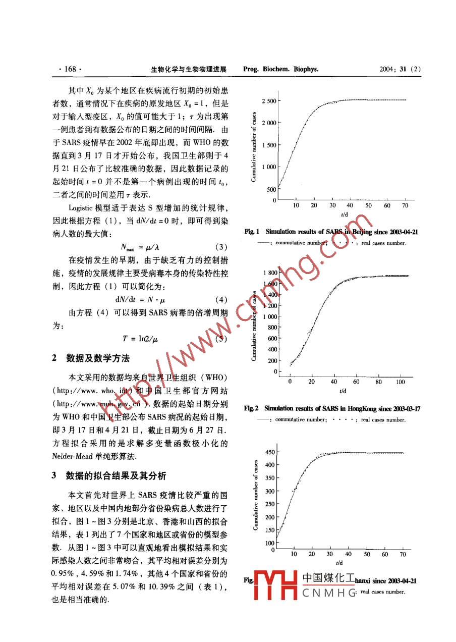 2004;31(2)生物化學(xué)與生物物理進(jìn)展Prog. Biochem. Brophy167SARS流行病傳染動力學(xué)研究李錚陳曦媵虎修志龍孫麗華馮恩民大連理T大學(xué)環(huán)境與生命學(xué)院生物科學(xué)與工程系,大連116024(大連理工大學(xué)應(yīng)用數(shù)學(xué)系,大連116024)摘要 Logistic確定型增長模型可被用來描述嚴(yán)重急性呼吸道綜合癥(SARS)的流行規(guī)律,通過對部分國家、地區(qū)及中國內(nèi)地部分省市的數(shù)據(jù)進(jìn)行擬合,及其對擬合結(jié)果的分析,揭示了各個地區(qū)SARS傳染力不均勻的現(xiàn)象,以及在控制措施上的差異所帶來的不同效果.同時,還對超級傳播現(xiàn)象(SEs)等問題進(jìn)行了討論關(guān)鍵詞嚴(yán)重急性呼吸道綜合癥c模型,傳染動力學(xué),超級傳播現(xiàn)象學(xué)科分類號R181.222002年11月在我國廣東省發(fā)現(xiàn)了一種急性呼分析.本文將根據(jù)以往流行病研究的成果,應(yīng)用比吸道傳染病,主要癥狀為發(fā)熱(>38℃)、干咳、較簡單的數(shù)學(xué)模型分析幾個典型國家和地區(qū)的呼吸急促或呼吸困難,胸部X光檢查可發(fā)現(xiàn)肺部SARS患者數(shù)據(jù),求得模型參數(shù),著重探討SARS病變這種臨床表現(xiàn)為肺炎的疾病,不同于由細(xì)菌的流行規(guī)律引起的所謂典型肺炎,國內(nèi)醫(yī)學(xué)界稱之為“非典1數(shù)學(xué)模型型性肺炎”.由于之前人們對這種新型疾病的病因、傳播規(guī)律、診斷和治療方法知之甚少,在很短目前對流行病傳染動力學(xué)研究的數(shù)學(xué)模型主要時間內(nèi)就擴(kuò)散到香港、北京、加拿大、新加坡、泰有確定性模型和隨機(jī)模型“,其中 Logistic模型是國、越南等很多國家和地區(qū),引起了世界各國的高最簡單的確定性模型.根據(jù)SARS流行特點(diǎn),運(yùn)用度重視.2003年3月15日世界衛(wèi)生組織(WHO) Logisti模型對SARS流行病動力學(xué)特征加以描述將這種疾病命名為嚴(yán)重急性呼吸道綜合癥( severe假設(shè)N代表染病總?cè)藬?shù),μ為染病者比增長acute respiratory syndrome,SARS).經(jīng)各國研究人率,A為傳染抑制常數(shù),那么 Logistic程可以用員緊張的工作,目前初步認(rèn)定SARS病原體是一種下式表示新型的冠狀病毒( coronavirus)(.這種病毒不同dw/dr=N(μ-AN)于以往發(fā)現(xiàn)的任何病毒,也不是以往發(fā)現(xiàn)的冠狀病方程中參數(shù)t的初值為1,即為官方統(tǒng)計數(shù)據(jù)毒的變體,這種病毒具有比較強(qiáng)的傳染能力,可以公布的第一天。在t=1時的N值為第一天公布的通過近距離接觸以飛沫等方式傳播.截止到2003患病人數(shù)年6月27日,全世界已經(jīng)有32個國家和地區(qū)發(fā)現(xiàn)方程第一項(xiàng)表示在不存在人為干預(yù)情況下傳染了非典型性肺炎共8450例,死亡810例,病愈出病的自然流行趨勢,第二項(xiàng)表示對傳染病的人為控院7410例,死亡率已達(dá)9.59%,在我國,報告有制產(chǎn)生的效果在傳染病流行初期,方程第一項(xiàng)占疫情的省份為26個,累計報告非典型性肺炎臨床主導(dǎo)地位,病人數(shù)目呈多代指數(shù)級增長,類似于微診斷病例5327例,累計治愈出院4921例,死亡生物生長的對數(shù)生長期.在傳染病爆發(fā)期,第二項(xiàng)348例,死亡率653%.我國SARS病例占世界總的作用就開始逐漸占據(jù)主導(dǎo)地位,dNdt逐漸趨近數(shù)的63%,盡管目前疫情已經(jīng)得到了一定控制,于0,發(fā)病人數(shù)基本不再上升,傳染病得到控制但由于對SARS病毒流行規(guī)律的認(rèn)識以及臨床診斷關(guān)系式對方程(1)積分可以得到發(fā)病人數(shù)與時間的和治療措施等方面還有許多不足,因此有必要進(jìn)一步加強(qiáng)上述研究工作,以便更好地預(yù)防和控制該病的擴(kuò)散和復(fù)發(fā).目前,針對SARS的流行規(guī)律,已中國煤化工x(-)(2)有Riey和 Lipsitch等23分別就香港和新加坡的疫CNMHG情進(jìn)行了比較詳細(xì)的描述和數(shù)據(jù)分析.但是,作為通訊聯(lián)系人Tel/Fax: 04114706369, E-mail: zlxiu@ mail. dlptt Inen疫情嚴(yán)重的中國大陸等地區(qū)還缺乏相應(yīng)的疫情數(shù)據(jù)收稿日期:200710,接受日期:200928168生物化學(xué)與生物物理進(jìn)展Prog. Biochem. Biophys204;31(2)其中X0為某個地區(qū)在疾病流行初期的初始患者數(shù),通常情況下在疾病的原發(fā)地區(qū)X0=1,但是對于輸入型疫區(qū),X0的值可能大于1;r為出現(xiàn)第一例患者到有數(shù)據(jù)公布的日期之間的時間間隔.由于SARS疫情早在2002年底即出現(xiàn),而WHO的數(shù)據(jù)直到3月17日才開始公布,我國衛(wèi)生部則于4月21日公布了比較準(zhǔn)確的數(shù)據(jù),因此數(shù)據(jù)記錄的起始時間t=0并不是第一個病例出現(xiàn)的時間t,二者之間的時間差用r表示Logistic模型適于表達(dá)S型增加的統(tǒng)計規(guī)律,因此根據(jù)方程(1),當(dāng)dN/dt=0時,即可得到染病人數(shù)的最大值Fig, 1 Simulation results of SARS in20030421A在疫情發(fā)生的早期,由于缺乏有力的控制措施,疫情的發(fā)展規(guī)律主要受病毒本身的傳染特性控制,因此方程(1)可以簡化為1600dN/dt= N(4)由方程(4)可以得到SARS病毒的倍增周期8002數(shù)據(jù)及數(shù)學(xué)方法本文采用的數(shù)據(jù)均來自世界衛(wèi)生組織(WHO)80100(htp://ww.who.int)和中國衛(wèi)生部官方網(wǎng)站(htp://w.moh,gow.cn).數(shù)據(jù)的起始日期分別rg2 Simulation resul