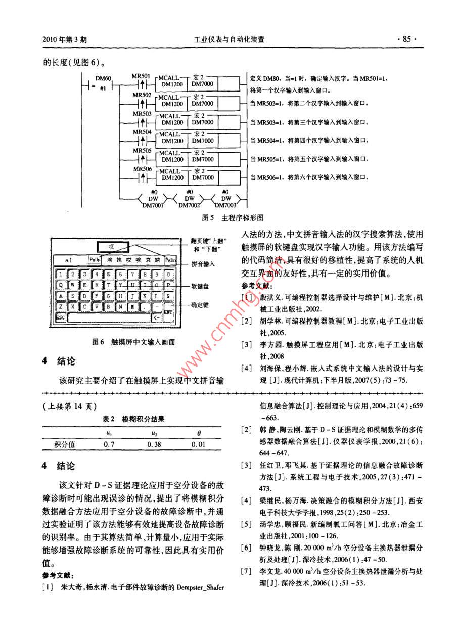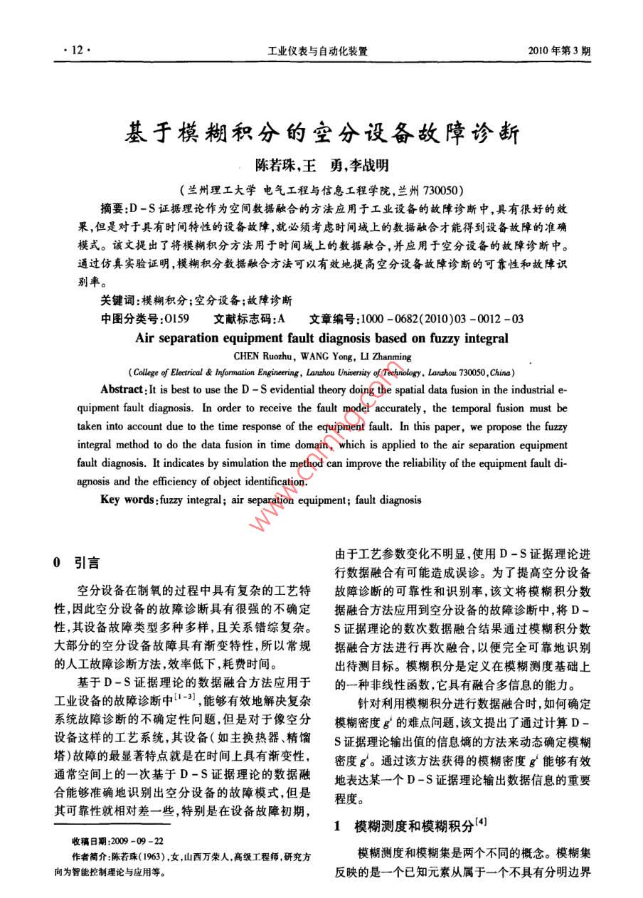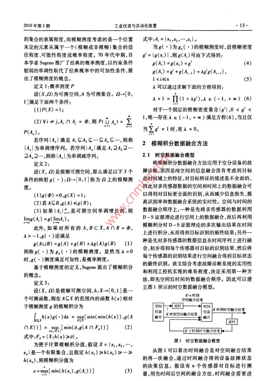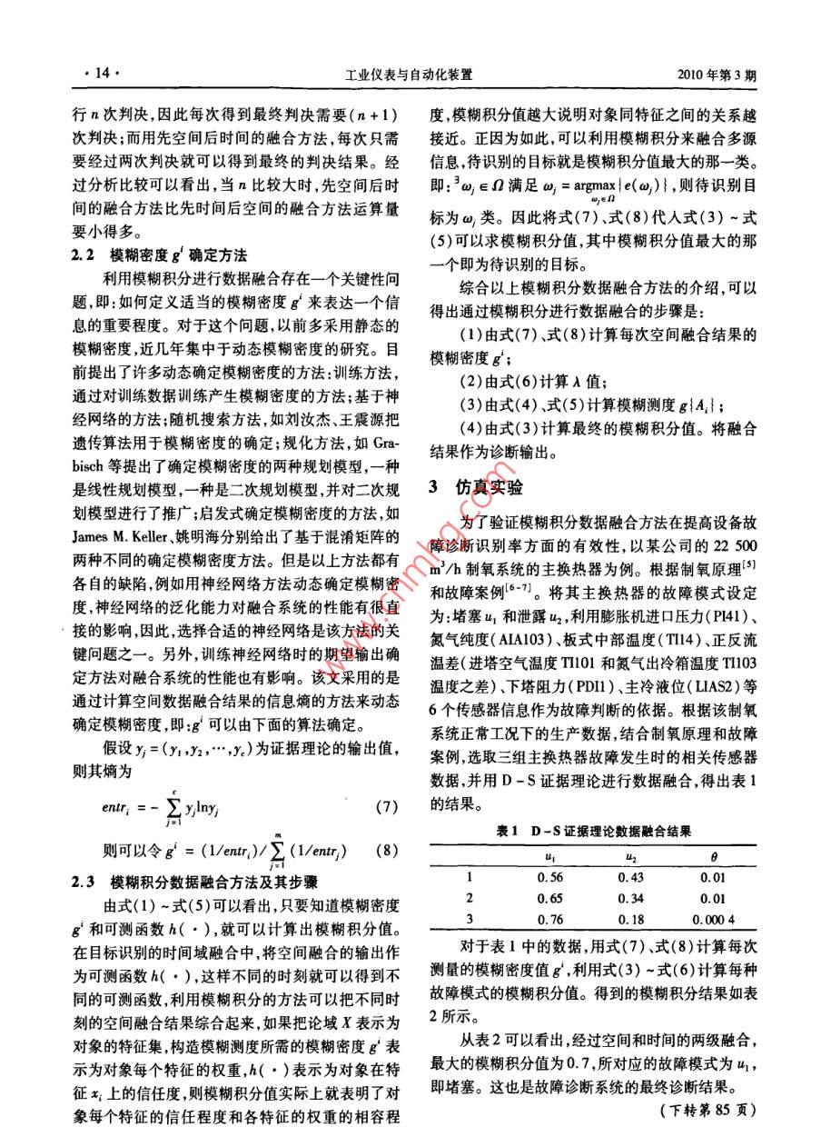 工業(yè)儀表與自動(dòng)化裝置2010年第3期基于模糊積分的空分設(shè)備故障診新陳若珠,王勇,李戰(zhàn)明蘭州理工大學(xué)電氣工程與信息工程學(xué)院,蘭州70050)摘要:D-S證據(jù)理論作為空間數(shù)據(jù)融合的方法應(yīng)用于工業(yè)設(shè)備的故障診斷中,具有很好的效果,但是對(duì)于具有時(shí)間特性的設(shè)備故障,就必須考慮時(shí)間域上的數(shù)據(jù)融合才能得到設(shè)備故障的準(zhǔn)確模式。該文提出了將模糊積分方法用于時(shí)間域上的數(shù)據(jù)融合,并應(yīng)用于空分設(shè)備的故障診斷中。通過仿真實(shí)驗(yàn)證明,模糊積分?jǐn)?shù)據(jù)融合方法可以有效地提高空分設(shè)備故障診斷的可靠性和故障識(shí)別率。關(guān)鍵詞:模糊積分;空分設(shè)備;故障診斷中圖分類號(hào):0159文獻(xiàn)標(biāo)志碼:A文章編號(hào):1000-0682(2010)03-0012-03Air separation equipment fault diagnosis based on fuzzy integralCHEN Ruozhu, WANG Yong, LI ZhanmingCollege of Electrical& Information Erg, Lanzhou Uninersity of Technology, Lanzhou 730050, China)Abstract: It is best to use the d-s evidential theory doing the spatial data fusion in the industrial e-quipment fault diagnosis. In order to receive the fault model accurately, the temporal fusion must betaken into account due to the time response of the equipment fault. In this paper, we propose the fuzzyintegral method to do the data fusion in time domain, which is applied to the air separation equipmentfault diagnosis. It indicates by simulation the method can improve the reliability of the equipment fault di-agnosis and the efficiency of object identificationKey words: fuzzy integral; air separation equipment; fault diagnosis0引言由于工藝參數(shù)變化不明顯,使用D-S證據(jù)理論進(jìn)行數(shù)據(jù)融合有可能造成誤診。為了提高空分設(shè)備空分設(shè)備在制氧的過程中具有復(fù)雜的工藝特故障診斷的可靠性和識(shí)別率,該文將模糊積分?jǐn)?shù)性,因此空分設(shè)備的故障診斷具有很強(qiáng)的不確定據(jù)融合方法應(yīng)用到空分設(shè)備的故障診斷中,將D性,其設(shè)備故障類型多種多樣,且關(guān)系錯(cuò)綜復(fù)雜。S證據(jù)理論的數(shù)次數(shù)據(jù)融合結(jié)果通過模糊積分?jǐn)?shù)大部分的空分設(shè)備故障具有漸變特性,所以常規(guī)據(jù)融合方法進(jìn)行再次融合,以便完全可靠地識(shí)別的人工故障診斷方法,效率低下,耗費(fèi)時(shí)出待測(cè)目標(biāo)。模糊積分是定義在模糊測(cè)度基礎(chǔ)上基于D-S證據(jù)理論的數(shù)據(jù)融合方法應(yīng)用于的一種非線性函數(shù),它具有融合多信息的能力工業(yè)設(shè)備的故障診斷中山-3,能夠有效地解決復(fù)雜針對(duì)利用模糊積分進(jìn)行數(shù)據(jù)融合時(shí),如何確定系統(tǒng)故障診斷的不確定性問題,但是對(duì)于像空分模糊密度g的難點(diǎn)問題該文提出了通過計(jì)算D設(shè)備這樣的工藝系統(tǒng),其設(shè)備(如主換熱器、精餾s證據(jù)理論輸出值的信息嫡的方法來(lái)動(dòng)態(tài)確定模糊塔)故障的最顯著特點(diǎn)就是在時(shí)間上具有漸變性,密度g。通過該方法獲得的模糊密度g能夠有效通??臻g上的一次基于D-S證據(jù)理論的數(shù)據(jù)融地表達(dá)某一個(gè)D-S證據(jù)理論輸出數(shù)據(jù)信息的重要合能夠準(zhǔn)確地識(shí)別出空分設(shè)備的故障模式,但是程度。其可靠性就相對(duì)差一些,特別是在設(shè)備故障初期1模糊測(cè)度和模糊積分收稿日期:2009-09-22作者簡(jiǎn)介:陳若珠(1963),女,山西萬(wàn)榮人,高級(jí)工程師研究方模糊測(cè)度和模糊集是兩個(gè)不同的概念。模糊集向?yàn)橹悄芸刂评碚撆c應(yīng)用等反映的是一個(gè)已知元素從屬于一個(gè)不具有分明邊界2010年第3期工業(yè)儀表與自動(dòng)化裝置的集合的隸屬程度,而模糊測(cè)度考慮的是一個(gè)位置式中:A,={x1,x2,…,x1}。未定的元素從屬于一個(gè)(模糊或非模糊)集合的信當(dāng)g(·)為gA(·)的模糊測(cè)度時(shí)設(shè)模糊密度任程度、可能性程度或概率程度。70年代中期,日g=1g(x),則g(A)可由下式得到:本學(xué)者 Sugeno推廣了經(jīng)典的概率測(cè)度,以約束條件(A1)=g(x1)=g(4)較弱的單調(diào)性取代了經(jīng)典概率中的可加性條件,提g(A)=8+g(A1-1)+Ag(A-1),出了模糊測(cè)度的概念l-1,g(·)還滿足上進(jìn)行積分,從而得到目標(biāo)識(shí)別的最終結(jié)果;另外一8(AUB)=g(A)+g(B)+g(A)(B)(1)種是先對(duì)多傳感器的數(shù)據(jù)信息在時(shí)間序列上進(jìn)行融則稱g(·)為6(·)的模糊測(cè)度。顯然當(dāng)A=0合初步得到每個(gè)傳感器對(duì)目標(biāo)的識(shí)別結(jié)果然后將時(shí),g(·)測(cè)度滿足可加性是概率測(cè)度。每個(gè)傳感器的識(shí)別結(jié)果進(jìn)行空間融合得到目標(biāo)狀態(tài)基于模糊測(cè)度的定義, Sugeno提出了模糊積分的最終識(shí)別。該文綜合考慮故障診斷系統(tǒng)的實(shí)用性的概念。和利用工控機(jī)實(shí)現(xiàn)的難易程度,決定采用第一種方定義3:法即先空間后時(shí)間的數(shù)據(jù)融合順序。因此可以建設(shè)(X,Q)是模糊可測(cè)空間,h:X→[0,1]是立圖1所示的時(shí)空數(shù)據(jù)融合模型。個(gè)可測(cè)函數(shù),則在AX的范圍內(nèi)的函數(shù)h(x)相對(duì)空間融合結(jié)果于模糊測(cè)度g的模糊積分為空向},延時(shí)葉時(s