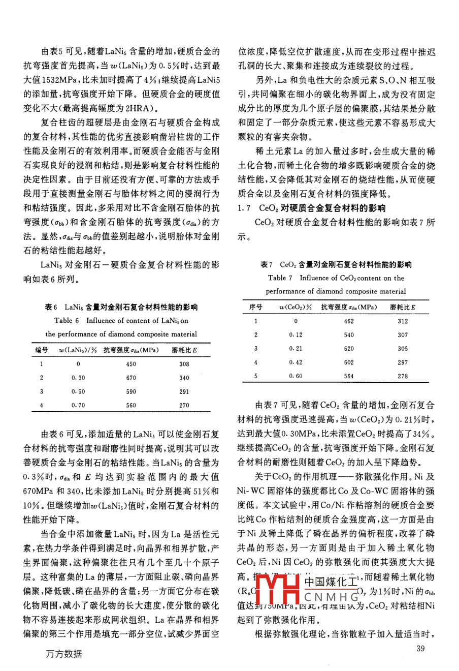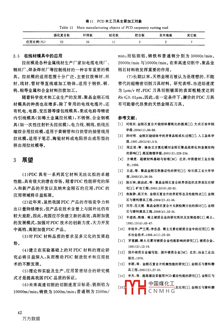 第19卷第5期越硬村料程Vol 192007年10月SUPERHARD MATERIAL ENGINEERINGOct.2007PDC的主要特性與應用柴津萩,王光祖(鄭州磨料磨具磨削研究所,河南鄭州450013)摘要:文章對PDC的主要特性及應用領(lǐng)域進行簡要綜述。隨著現(xiàn)代工業(yè)和科學技術(shù)的發(fā)展,PDC廣泛應用于汽車、石油地質(zhì)鉆探、木材加工、金屬絲拉撥等工業(yè)領(lǐng)域。關(guān)鍵詞:PDC;主要特性與應用;綜述中圖分類號:TQ164文獻標識碼:A文章編號:1673-1433(2007)05-036-07Main characteristics and application of pDcCHAI Jin-qiu, WANG Guang-zu(Zhengzhou Abrasives and Grinding Research Institute, Zhengzhou, Henan, 450013)Abstract:a brief comment was made on the main characteristics of PDC and itsapplication fields in the paper. With the development of modern industry and high-techPDC is expanding its use in many industry fields such as automobile, oil geologicadrilling, carpentry, metal wire pulling and drawing and so onKeywords: PDC; main characteristics and application; comment耐磨性、熱穩(wěn)定性和抗沖擊韌性是PDC最重要耐磨性的主要因素有的性能指標,在某些情況下,強度、可加工性、自銳性(1)制造工藝。燒結(jié)時間較短,且燒結(jié)溫度較高也可能成為重要參數(shù)。PDC具有單晶金剛石所不具時,PDC耐磨性較好;燒結(jié)溫度偏低時,PDC耐磨性備的一些優(yōu)良特征。在PDC中,晶粒呈無序排列,各差;燒結(jié)時間過長,金剛石石墨化趨于嚴重,PDC耐向同性,無解理面??梢灾瞥商囟ㄐ螤?以適合不同的磨性將急劇下降。用途。(2)一般來講金剛石的粒度越細,耐磨性越高;粒可以設(shè)計或預測產(chǎn)品的性能,賦予產(chǎn)品必要的特度配比對耐磨性同樣影響較大點,以適應它的特定用途,如選擇細粒度的PDC刀具(3)若PDC中的粘接劑基本上呈線條狀或絮狀,材料,可使刀具的刃口質(zhì)量提高;粗粒度的PDC刀具且較均勻地分布在金剛石周圍,并與其相互作用形成材料,可使刀具的耐用度提高。較髙熔點的高強度物相,金剛石顆粒就能很好的燒結(jié)在一起,而得到高熱穩(wěn)定性和高耐磨性的PDC1PDC的主要特性(4)控制晶粒的異常長大。晶粒的異常長大是金剛石在金屬觸媒中的再結(jié)晶過程引起的,在催化劑較1.1耐磨性多的地方容易產(chǎn)生。在Fe-金剛石體系的燒結(jié)過程中,中的抗磨損能力,一般用磨耗比來評價影響PDC的和的形成在一定程度上可抑制晶粒的異常長耐磨性是指PDC在切削、鉆井、修整砂輪等過程FeC中國煤化工相燒結(jié)時發(fā)現(xiàn)在金CNMHG①收稿日期:2007-02-20作者簡介柴津秋(1957—),女,工程師主要從事科研管理方面的工作,36剛石與鈷的混料中添加碳化物粉有助于減少液相存氧化溫度、石墨化溫度。(在,遏制晶粒的異常長大。另外,在燒結(jié)PDC時,添加總之,PDC的熱穩(wěn)定性與許多因素有關(guān),而且各適量細粒度cBN(粒徑小于0.5m),可抑制金剛石晶因素之間相互影響。比如,與所處環(huán)境的關(guān)系、與粘接粒的異常長大{3劑的關(guān)系、與金剛石微晶粒度的關(guān)系等1.2機械磨損機理提高熱穩(wěn)定性的一些方法有般來說,金剛石聚晶純機械磨損機理可以大致(1)選擇適當?shù)恼辰觿?并調(diào)節(jié)粘接劑的含量;分為四種類型:研磨磨損、沖擊磨損、切削磨損和混合(2)選擇適當?shù)慕饎偸6刃湍p(3)加入適量的硼;(1)研磨磨損金剛石聚晶層的磨損大都發(fā)生在(4)通過酸處理,鋅液吸收,電解等方法除掉金屬切削力不大的連續(xù)切削/磨削場合。磨損方式以中間相相的磨損及脫落開始,使得金剛石顆粒裸露出來。在1.3抗沖擊韌性反復摩擦作用力的作用下,金剛石表面產(chǎn)生裂紋。隨抗沖擊韌性是指PDC承受沖擊載荷的能力,主著切削過程的進行,裂紋不斷地擴展,新的裂紋的不要體現(xiàn)為在沖擊力作用下金剛石顆粒不脫落,金剛石斷產(chǎn)生,并連成網(wǎng),導致細小的金剛石碎片剝落,產(chǎn)生層不裂紋崩刃,不分層。磨損。抗沖擊韌性作為PDC的重要性能指標之一,被(2)沖擊磨損沖擊磨損通常發(fā)生在切削力較廣泛關(guān)注。業(yè)已研究出若干提高PDC的抗沖擊韌性大,被加工材料組織不均勻或斷續(xù)切削場合。由于沖的方法,如在PDC層上覆蓋一層粘接劑或類似材料擊力較大,金剛石聚晶的破壞主要取決于材料的斬斷作保護層,像一層致密的網(wǎng)罩住所有金剛石,形成裂強度、中間相對金剛石顆粒的把持力及聚晶的斷裂個完整、穩(wěn)定的結(jié)構(gòu),從而提高它的抗沖擊韌性韌性。對斷裂表面的觀察可見到金剛石顆粒的整體破PDC界面最初為一個平面,在實際使用過程中證明碎及較大塊金剛石的脫落現(xiàn)象。很明顯,較小的金剛這種結(jié)構(gòu)并不是很理想,因為在界面處很容易因為強石顆粒尺寸和韌性較好的中間相對提高聚晶的沖擊度不夠而出現(xiàn)金剛石層的剝落損壞,針對這一現(xiàn)象,磨損能力是有益的。眾多研究人員提出了多種解決方案,如在金剛石和基(3)切削磨損切削磨損通常發(fā)生在切削力較體之間添加鎢片;將基體界面做成溝槽或鋸齒狀;把大、切削速度較高的場合。此時,在較大摩擦力的作用溝槽或鋸齒做成環(huán)形,并把尖角改成圓角;降低鋸齒下,金剛石與工件接觸表面的溫度較高金剛石變軟,尖端粘接劑的含量;把界面做成波浪形等等在磨削力的作用下金剛石自身被切削。這種情況通常1.4PDC的主要缺陷伴隨有工件與金剛石之間的化學反應發(fā)