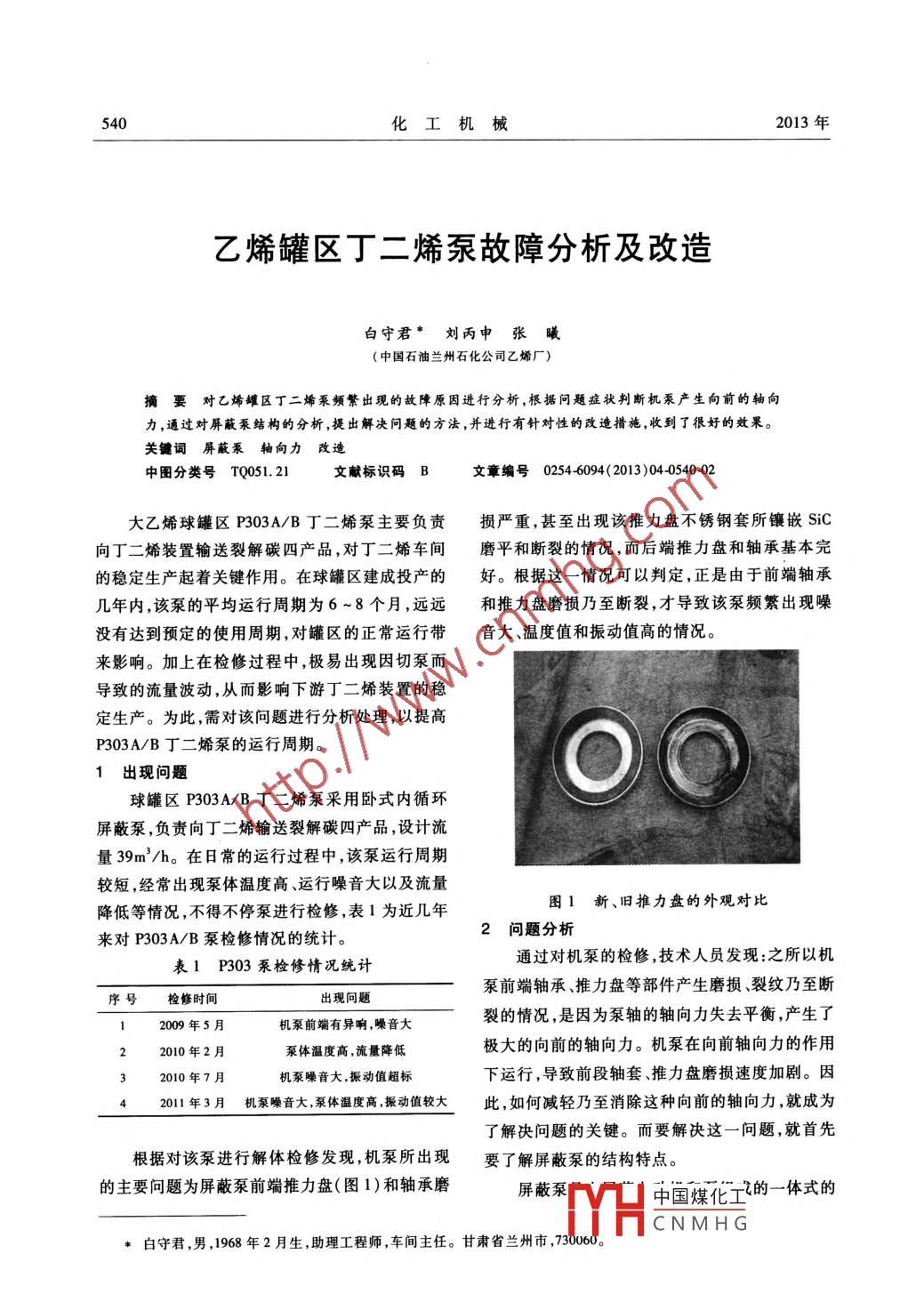 540化工機械2013年.乙烯罐區(qū)丁二烯泵故障分析及改造白守君*劉丙申張曦(中國石油蘭州石化公司乙烯廠)摘要對乙烯罐區(qū)丁二烯泵頻繁出現(xiàn)的故障原因進(jìn)行分析,根據(jù)問題癥狀判斷機泵產(chǎn)生向前的軸向力,通過對屏蔽泵結(jié)構(gòu)的分析,提出解決問題的方法,并進(jìn)行有針對性的改造措施,收到了很好的效果。.關(guān)鍵詞屏蔽泵軸向力改造中圖分類號TQ051. 21文獻(xiàn)標(biāo)識碼B文章編號0254-6094( 2013)04-0540-02大乙烯球罐區(qū)P303A/B丁二烯泵主要負(fù)責(zé)損嚴(yán)重,甚至出現(xiàn)該推力盤不銹鋼套所鑲嵌SiC向丁二烯裝置輸送裂解碳四產(chǎn)品,對丁二烯車間磨平和斷裂的情況,而后端推力盤和軸承基本完的穩(wěn)定生產(chǎn)起著關(guān)鍵作用。在球罐區(qū)建成投產(chǎn)的好。根據(jù)這一情況可以判定,正是由于前端軸承幾年內(nèi),該泵的平均運行周期為6~8個月,遠(yuǎn)遠(yuǎn)和推力盤磨損乃至斷裂,才導(dǎo)致該泵頻繁出現(xiàn)噪沒有達(dá)到預(yù)定的使用周期,對罐區(qū)的正常運行帶音大、溫度值和振動值高的情況。來影響。加上在檢修過程中,極易出現(xiàn)因切泵而導(dǎo)致的流量波動,從而影響下游丁二烯裝置的穩(wěn)定生產(chǎn)。為此,需對該問題進(jìn)行分析處理,以提高P303A/B丁二烯泵的運行周期。出現(xiàn)問題球罐區(qū)P303A/B丁二烯泵采用臥式內(nèi)循環(huán)屏蔽泵,負(fù)責(zé)向丁二烯輸送裂解碳四產(chǎn)品,設(shè)計流量39m'/h。在日常的運行過程中,該泵運行周期較短,經(jīng)常出現(xiàn)泵體溫度高、運行噪音大以及流量圖1新、舊推力盤的外觀對比降低等情況,不得不停泵進(jìn)行檢修,表1為近幾年2問題分析來對P303A/B泵檢修情況的統(tǒng)計。通過對機泵的檢修,技術(shù)人員發(fā)現(xiàn):之所以機表1 P303 泵檢修情況統(tǒng)計泵前端軸承、推力盤等部件產(chǎn)生磨損、裂紋乃至斷序號檢修時間12009年5月機泵前端有異響,噪音大裂的情況,是因為泵軸的軸向力失去平衡,產(chǎn)生了2010年2月泵體溫度高,流量降低極大的向前的軸向力。機泵在向前軸向力的作用2010年7月.機泵噪音大,振動值超標(biāo)下運行,導(dǎo)致前段軸套、推力盤磨損速度加劇。因2011年3月機泵噪音大,泵體溫 度高,振動值較大此,如何減輕乃至消除這種向前的軸向力,就成為了解決問題的關(guān)鍵。而要解決這一問題,就首先根據(jù)對該泵進(jìn)行解體檢修發(fā)現(xiàn),機泵所出現(xiàn)要了解屏蔽泵的結(jié)構(gòu)特點。的主要問題為屏蔽泵前端推力盤(圖1)和軸承磨屏蔽泵中國煤化工的-體式的DYHCNMHG*白守君,男,1968年2月勝,助理工程師,車間主任。甘肅省蘭州市,730060.