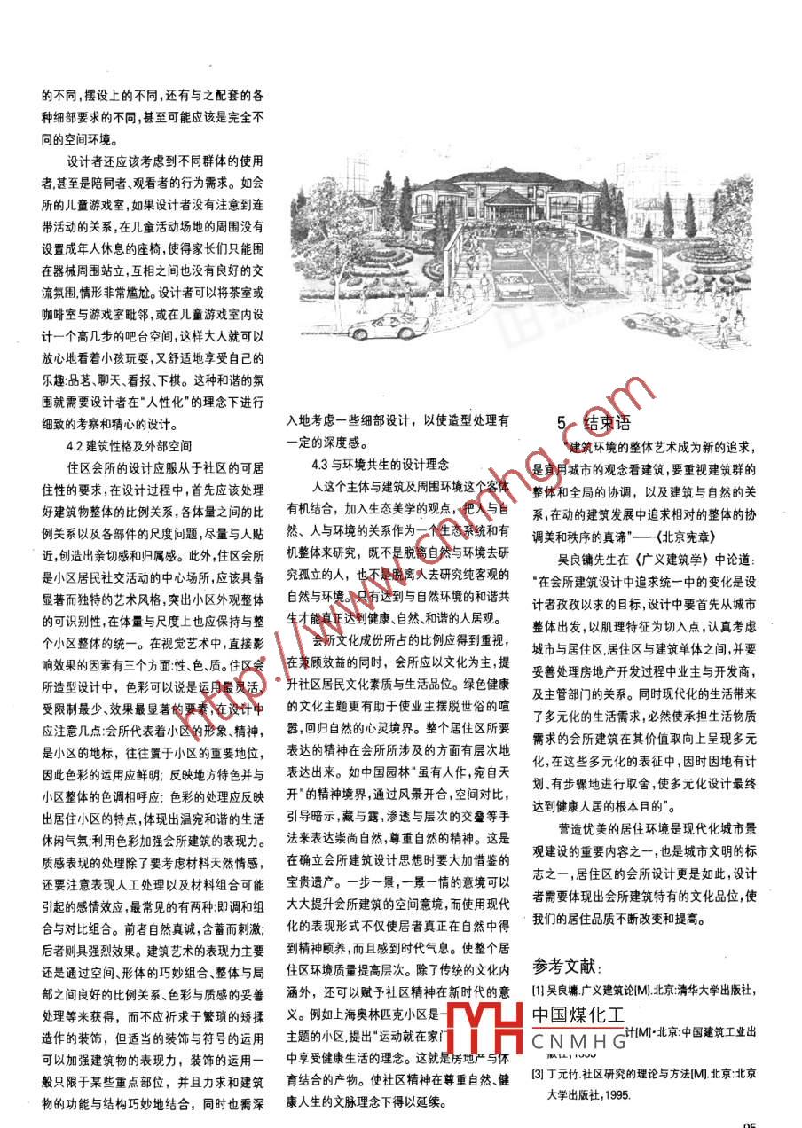 論會(huì)所設(shè)計(jì)Discuss the Chamber Design晏益力YAN Yili摘具:本文涉及會(huì)所的由來,討論到會(huì)所的環(huán)境同時(shí)也使會(huì)所建筑這一- 獨(dú)特的建筑類型在持久,也對(duì)外服務(wù)。設(shè)計(jì),并通過對(duì)當(dāng)前會(huì)所設(shè)計(jì)中常出現(xiàn)問題的探理論與實(shí)踐上都得以大度提高,住宅設(shè)計(jì)可公共會(huì)所又分為商業(yè)類會(huì)所和度假類討,認(rèn)為會(huì)所設(shè)計(jì)應(yīng)該具備適宜的功能、尺度、環(huán)境能因?yàn)槌錾臅?huì)所設(shè)計(jì)而面貌-新,因此從會(huì)所。商業(yè)類會(huì)所是以商業(yè)為主的俱樂部會(huì)等因素,為業(yè)主創(chuàng)造良好的居住空間及環(huán)境感受。房地產(chǎn)開發(fā)及購房者的角度來看,會(huì)所建筑所,他們多為會(huì)員制并且收費(fèi)較高,且多為在整個(gè)規(guī)劃設(shè)計(jì)中占有重要的地位。國際集團(tuán)式管理?,F(xiàn)在北京幾家著名的俱樂關(guān)鍵詞:會(huì)所建筑;功能;尺度;環(huán)境景觀會(huì)所原來是一一個(gè)舶來品, 意思是身份不部有長安俱樂部、京城俱樂部、美洲俱樂部凡人士聚會(huì)的場(chǎng)所。演變至今,會(huì)所已成為等。度假型會(huì)員俱樂部多以休閑娛樂為主,clubs to discuss environmental design, and物業(yè)項(xiàng)目的配套設(shè)施之一,買房人在考察樓會(huì)所像酒店一樣,比較典型的有龍?jiān)穭e墅、through the design of the current clubs are of-盤時(shí),從關(guān)心項(xiàng)目的價(jià)格、位置、交通、戶型紫玉山莊、快樂無窮大。.ten the problems of that club should be de-等,進(jìn)而開始注重社區(qū)的公共設(shè)施,會(huì)所也會(huì)所中最大量的是住區(qū)會(huì)所,所謂住區(qū)signed with appropriate functions, scale, theenvironment and other factors, to owners Cre-成為項(xiàng)目吸引買房人目光的必備武器。隨著會(huì)所是指在居住區(qū)為居民服務(wù)的會(huì)所,有些ate a good lving space and the environment社會(huì)的發(fā)展和人民生活水平的提高,體育產(chǎn)住區(qū)會(huì)所也在一定條件下對(duì)外開放。社區(qū)會(huì)felings.業(yè)蓬勃發(fā)展,人們更加注重生活質(zhì)量,健身.所大多以主題形式存在,可分為生活型、健休閑已成為時(shí)尚。在這種大環(huán)境下,會(huì)所已康休閑型、文化型。如北京寶星園社區(qū)內(nèi)的Koy words:club building; functions; stan-成為眾人所關(guān)注的熱點(diǎn)。陽光雙會(huì)所、今典花園的今典潛水俱樂部、dards; environmental landscape通用國際的SPA會(huì)所等。中圈分類號(hào):TU242.41會(huì)所的類型 .文獻(xiàn)標(biāo)識(shí)碼:A從使用范圍上看,會(huì)所可分為公共會(huì)所2會(huì)所環(huán)境文章編號(hào):1008-0422(2008)07-0093- -03和社區(qū)會(huì)所。住宅會(huì)所大致分為別墅區(qū)會(huì)所、多層居隨著生活水平的提高,人們對(duì)居住的需公共會(huì)所的使用者不做任何限定,面向住區(qū)會(huì)所及高層居住區(qū)會(huì)所三種。別墅區(qū)占求從基本生理需求的滿足逐步向心理與文所有人開放,但絕大部分采用會(huì)員制的形式地寬廣,容積率很低,而會(huì)所面積占總開發(fā)面化領(lǐng)域的更高層次推進(jìn),住區(qū)不單是居住的存在。積比例相對(duì)較高, -般是高級(jí)會(huì)所。在以低功能,同時(shí)也是人們思想與情感交流的地社區(qū)會(huì)所大多只面向社區(qū)業(yè)主,也有采層、多層住宅為主的小區(qū)內(nèi),會(huì)所一般自成方。隨著住宅開發(fā)建設(shè)和設(shè)計(jì)的價(jià)值取向,用會(huì)員制的,其中部分社區(qū)會(huì)所為確保經(jīng)營. -區(qū),除滿足本區(qū)使用外,還可對(duì)外開放。城中國煤化工fHCNMHG作者簡(jiǎn)介:晏益力( 1966- ),男,湖南湘潭人,湖南湘酒市規(guī)劃建筑設(shè)計(jì)院建筑師。93市中心高層居住區(qū)會(huì)所用地則相對(duì)狹小,有3.2不適當(dāng)?shù)臅?huì)所建筑形象問題往往缺乏設(shè)計(jì)者的重視。而在現(xiàn)代城市的甚至與住宅的裙樓相結(jié)合或設(shè)于樓層中。建筑形象是一個(gè)有序的知覺整體,反映越來越有限的空間里 ,這些環(huán)境和細(xì)部設(shè)計(jì)無論用地大小,皆可創(chuàng)造出精湛的空間效果建筑內(nèi)在 的邏輯、力量、構(gòu)成、美的感受和特往往是最貼近人的,任何 -點(diǎn)方便,任何一和舒適宜人的周邊環(huán)境。性會(huì)所建筑因其功能和空間構(gòu)成的獨(dú)特性,絲 視覺上的愉悅,都會(huì)對(duì)人們的心理產(chǎn)生積會(huì)所與環(huán)境它們有著獨(dú)特的建筑個(gè)性在建筑形 象上與其它類型的休閑娛樂建筑極的影響。與空間序列特征,建筑師根據(jù)當(dāng)?shù)氐牡乩硖赜兴煌?在立面上更注重輪廓的優(yōu)美和立征、歷史傳統(tǒng)、居民的行為活動(dòng)特點(diǎn),以人為面線條的流暢: 平面和體型簡(jiǎn)潔,體塊的穿4會(huì)所設(shè)計(jì)的改進(jìn)和完善本,創(chuàng)造高質(zhì)量的景觀環(huán)境。插、變化、組合較少而更注重建筑細(xì)部的處住區(qū)會(huì)所在設(shè)計(jì)時(shí)應(yīng)滿足以下的原則例如香港陽明山莊,位于香港島大潭郊理; 體量上以穩(wěn)重大方端莊為主而不失輕和要求:分區(qū)明確,布局合理,聯(lián)系方便,互不野公園內(nèi),可遠(yuǎ