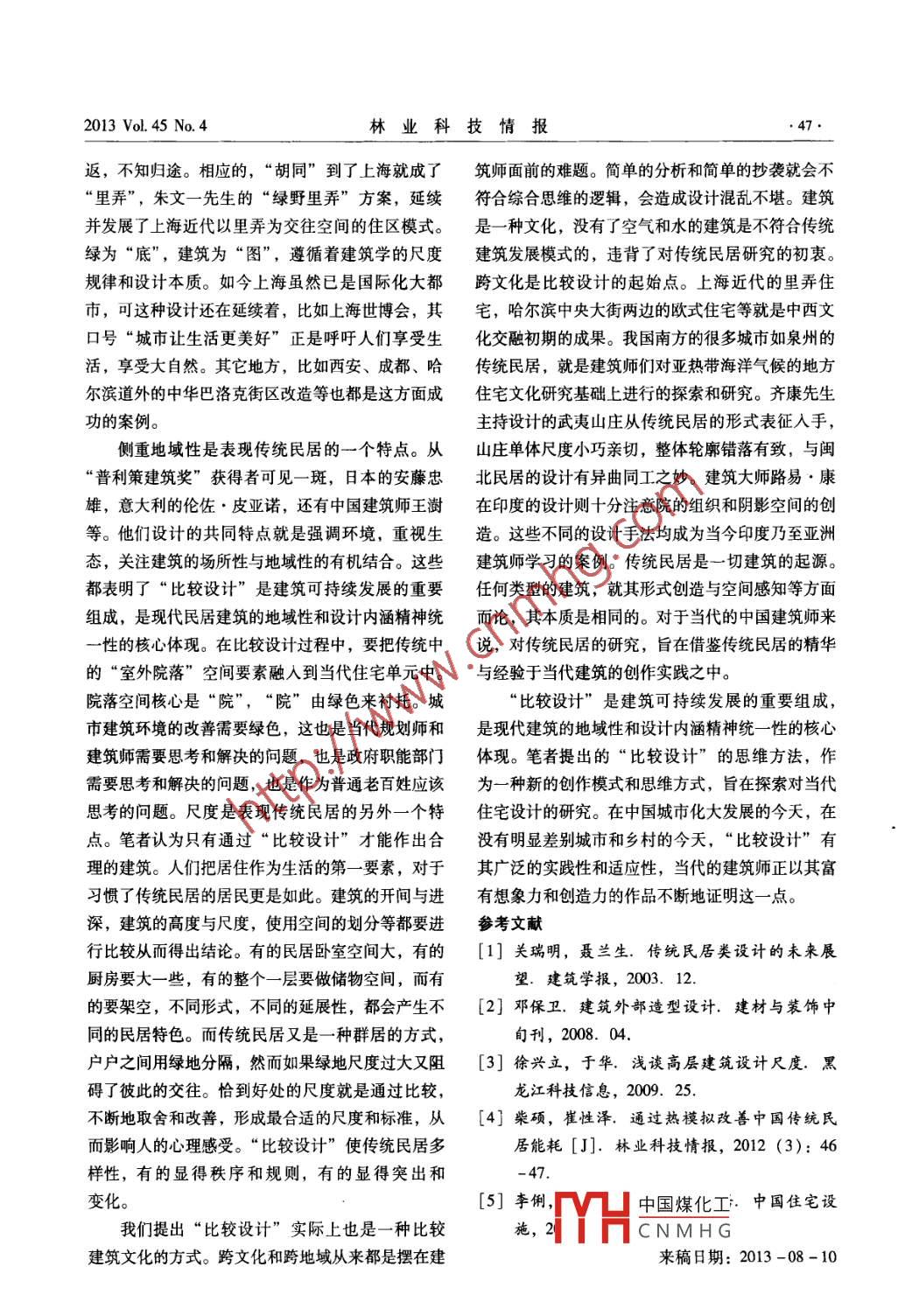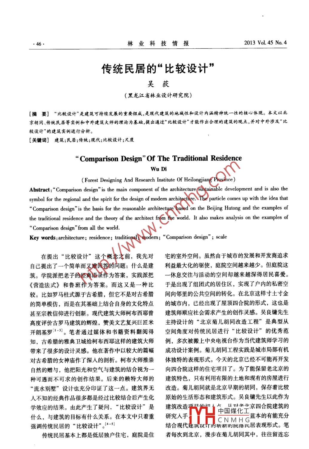 , 46.林業(yè)科技情報2013 Vol. 45 No. 4傳統(tǒng)民居的“比較設(shè)計”吳荻(黑龍江省林業(yè)設(shè)計研究院)[摘要]“比較設(shè)計”是建筑可持續(xù)發(fā)展的重要組成,是現(xiàn)代建筑的地域性和設(shè)計內(nèi)涵精神統(tǒng)一 性的核心體現(xiàn)。本文以北京胡同.傳統(tǒng)民居等實例和中外建筑大師的理論為基礎(chǔ),提出通過“比較設(shè)計”才能作出合理的建筑的觀點,并對中外涉及“比較設(shè)計”的建筑實例進行分析。[關(guān)鍵詞]建筑;民居 ;傳統(tǒng);現(xiàn)代;比較設(shè)計;尺度“Comparison Design”O(jiān)f The Traditional ResidenceWu Di( Forest Designing And Research Institute Of Heilongjiang Province)Abstract:“Comparison design" is the main component of the architecture sustainable development and is also thesymbol for the regional and the spirit for the design of moderm architecture. The particle comes up with the idea that“Comparison design" is the basis for the reasonable architecture based on the Beijing Hutong and the examples ofthe traditional residence and the theory of the architect from the world. It also makes analysis on the examples of“Cormparison design' from all the world.Key words: architecture; residence; traitional; modem;“Comparison design" ; scale在提出“比較設(shè)計”這個概念之前,我先對宅的室外空間。雖然由于城市的發(fā)展和開發(fā)商追求自己提出了一個簡單而又難回答的問題:什么是建利益最大化的驅(qū)使,庭院空間越來越少。但庭院這筑。學(xué)院派把老子的經(jīng)典語錄作為答案,實踐派把--休息交往與活動的空間卻越來越深得居民喜愛?!稜I造法式》和魯班作為答案。而這又是一種比于是出現(xiàn)了組團式的居住區(qū),實現(xiàn)了戶內(nèi)的私密空較。比如羅馬柱式源于古希臘,但它不是對古希臘間向鄰里的公共空間的轉(zhuǎn)化。在北京這樣寸土寸金的簡單模仿,而是在其基礎(chǔ)上結(jié)合自身的文化特點的城市內(nèi),已經(jīng)出現(xiàn)了屋頂四合院的形式,這也是甚至宗教信仰進行創(chuàng)新?,F(xiàn)代建筑大師柯布西耶曾建筑師順應(yīng)社會需求產(chǎn)生的創(chuàng)作靈感。吳良鏞先生高度評價古羅馬建筑的輝煌,贊美文藝復(fù)興巨匠米主持設(shè)計的“北京菊兒胡同改造工程”是典型從開朗基羅(1-3]。筆者通過媒體和書籍資料翻閱得空間角度對傳統(tǒng)民居進行“比較設(shè)計”的優(yōu)秀范知,古希臘的雅典衛(wèi)城給柯布西耶這樣的建筑大師例,多次被搬上中央電視臺作為當(dāng)代建筑師學(xué)習(xí)的帶來了很多的設(shè)計靈感。他在著作中以較大的篇幅成功設(shè)計案例。菊兒胡同工程實踐是城市局部有機對古希臘的女神廟作了深人的剖析??虏即髱熗瞥珞w獨特的表現(xiàn)形式。今天的北京已經(jīng)不可能再開發(fā)自然的贈與,他把陽光和空氣與建筑的結(jié)合視為一向四合院這樣的住宅項目了。為了能保留老北京的種可遇而不可求的創(chuàng)作結(jié)果。后來的賴特大師的建筑特色,只有利用有限的土地和現(xiàn)有的房屋進行“流水別墅”設(shè)計也充分印證了這一點。建筑界無改造。菊兒胡同就是北京早期的胡同,保存著比較人不知的經(jīng)典作品很多都是經(jīng)過比較結(jié)合后產(chǎn)生化原始的生活形態(tài)和建筑形式。吳良鏞先生以此作為學(xué)效應(yīng)的結(jié)果。由此產(chǎn)生了疑問,“ 比較設(shè)計”是建筑改造項目的切入占。u 對共業(yè)京四合院建筑的中國煤化工什么,與建筑的目標(biāo)有什么關(guān)系。在本文中只著重研究人手藍(lán)本的有能充分YHCNMH G強調(diào)傳統(tǒng)民居的“ 比較設(shè)計”。(4-5)結(jié)合現(xiàn)代建鞏設(shè)訂的斬和的阮路民居表現(xiàn)形式。筆傳統(tǒng)民居基本上都是低層獨戶住宅,庭院是住者每次到北京,漫步在菊兒胡同其中,往往留連忘.2013 Vol. 45 No. 4林業(yè)科技情報.47.返,不知歸途。相應(yīng)的,“胡同”到了上海就成了筑師 面前的難題。簡單的分析和簡單的抄襲就會不“里弄”,朱文- -先生的“綠野里弄”方案,延續(xù)符合綜 合思維的邏輯,會造成設(shè)計混亂不堪。建筑并發(fā)展了上海近代以里弄為交往空間的住區(qū)模式。是- -種文化,沒有了空氣和水的建筑是不符合傳統(tǒng)綠為“底”,建筑為“圖”,遵循著建筑學(xué)的尺度建筑發(fā)展模式的,違背了對傳統(tǒng)民居研究的初衷。規(guī)律和設(shè)計本質(zhì)。如今上海雖然已是國際化大都.跨文化是比較設(shè)計的起始點。上海近代的里弄住市,可這種設(shè)計還在延續(xù)著,比如上海世博會,其宅, 哈爾濱中央大街兩邊的歐式住宅等就是中西文口號“城市讓生活更美好”正是呼吁人們享受生化交融初期的成果。我國南方的很多城市如泉州的活,享受大自然。其它地方,比如西安、成都、哈傳統(tǒng)民居,就是建筑師們對亞熱帶海洋氣候的地方爾濱道外的中華巴洛克街區(qū)改造等也都是這方面成住宅文化研究基礎(chǔ)上進行的探索和研究。齊康先生功的案例。主持設(shè)計的武夷山莊從傳統(tǒng)民居的形式表征人手,側(cè)重地域性是表現(xiàn)傳統(tǒng)民居的一個特點。從山莊單體尺度小巧親切, 整體輪廓錯落有致,與閩“普利策建筑獎”獲得者可見一斑,日本的安藤忠北民居的設(shè)計有 異曲同工之妙。建筑大師路易●康雄,意大利的倫佐