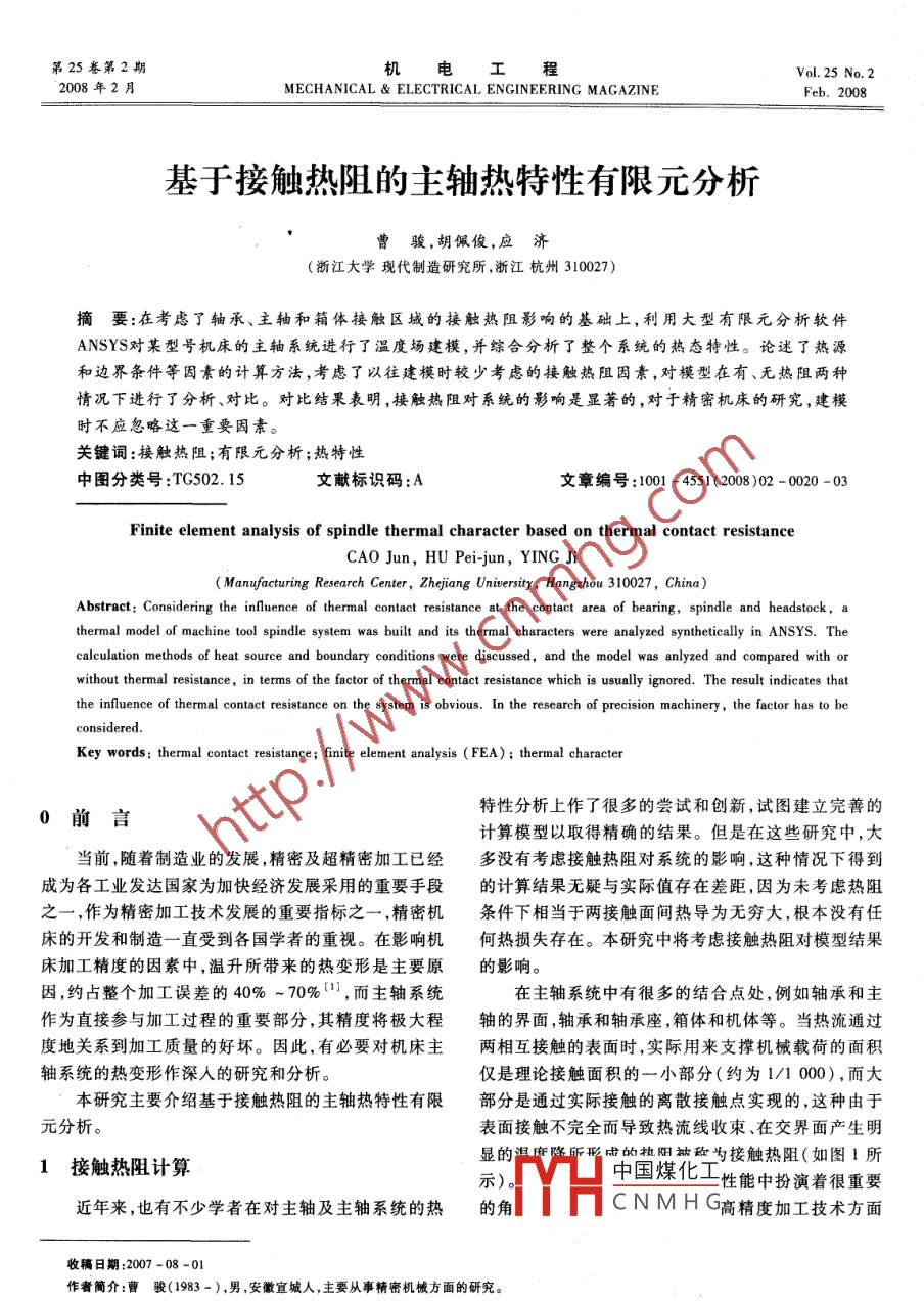 第25卷第2期機電工程Vol. 25 No. 22008年2月MECHANICAL ELECTRICAL ENGINEERING MAGAZINEFeb.2008基于接觸熱阻的主軸熱特性有限元分析曹駿,胡佩俊,應(yīng)濟(浙江大學現(xiàn)代制造研究所,浙江杭州310027)摘要:在考慮了軸承、主軸和箱體接觸區(qū)域的接觸熱阻影響的基礎(chǔ)上,利用大型有限元分析軟件ANSYS對某型號機床的主軸系統(tǒng)進行了溫度場建模,并綜合分析了整個系統(tǒng)的熱態(tài)特性。論述了熱源和邊界條件等因素的計算方法,考慮了以往建模時較少考慮的接觸熱阻因素,對模型在有、無熱阻兩種情況下進行了分析、對比。對比結(jié)果表明,接觸熱阻對系統(tǒng)的影響是顯著的,對于精密機床的研究,建模時不應(yīng)忽略這一重要因素。關(guān)鍵詞:接觸熱阻;有限元分析;熱特性中圖分類號:TG502.15文獻標識碼:A文章編號:1001-4551(2008)02-0020-03Finite element analysis of spindle thermal character based on thermal contact resistanceCAO Jun, HU Pei-jun, YING JiManufacturing Research Center, Zhejiang University, hangzhou 310027, China)Abstract: Considering the influence of thermal contact resistance at the contact area of bearing, spindle and headstock,athermal model of machine tool spindle system was built and its thermal characters were analyzed synthetically in ANSYS. Thecalculation methods of heat source and boundary conditions were discussed, and the model was anlyzed and compared with orwithout thermal resistance, in terms of the factor of thermal contact resistance which is usually ignored. The result indicates thatthe influence of thermal contact resistance on the system is obvious. In the research of precision machinery, the factor has to beonsideredKey words: thermal contact resistance; finite element analysis(FEA); thermal character0前言特性分析上作了很多的嘗試和創(chuàng)新,試圖建立完善的計算模型以取得精確的結(jié)果。但是在這些研究中,大當前,隨著制造業(yè)的發(fā)展,精密及超精密加工已經(jīng)多沒有考慮接觸熱阻對系統(tǒng)的影響,這種情況下得到成為各工業(yè)發(fā)達國家為加快經(jīng)濟發(fā)展采用的重要手段的計算結(jié)果無疑與實際值存在差距,因為未考慮熱阻之一,作為精密加工技術(shù)發(fā)展的重要指標之一,精密機條件下相當于兩接觸面間熱導(dǎo)為無窮大,根本沒有任床的開發(fā)和制造一直受到各國學者的重視。在影響機何熱損失存在。本研究中將考慮接觸熱阻對模型結(jié)果床加工精度的因素中,溫升所帶來的熱變形是主要原的影響。因,約占整個加工誤差的40%-70%,而主軸系統(tǒng)在主軸系統(tǒng)中有很多的結(jié)合點處,例如軸承和主作為直接參與加工過程的重要部分,其精度將極大程軸的界面,軸承和軸承座,箱體和機體等。當熱流通過度地關(guān)系到加工質(zhì)量的好壞。因此,有必要對機床主兩相互接觸的表面時,實際用來支撐機械載荷的面積軸系統(tǒng)的熱變形作深入的研究和分析。僅是理論接觸面積的一小部分(約為1/1000),而大本研究主要介紹基于接觸熱阻的主軸熱特性有限部分是通過實際接觸的離散接觸點實現(xiàn)的,這種由于元分析表面接觸不完全而導(dǎo)致熱流線收束、在交界面產(chǎn)生明1接觸熱阻計算顯的成的拉陽被為接觸熱阻(如圖1所示)。中國煤化工性能中扮演著很重要近年來,也有不少學者在對主軸及主軸系統(tǒng)的熱的角CNMHG高精度加工技術(shù)方收稿日期:2007-08-01作者簡介:曹駿(1983-),男,安徽宣城人,主要從事精密機械方面的研究。第2期曹駿.等:基于接觸熱阻的主軸熱特性有限元分析屢當>3.33×10-3m2·r/s2時:M2=10f(tn)2d2(5)當2時M2=160×10%d(a)按觸表面形貌b)按觸面溫度降示意圖式(3)~式(5)中∫1一與軸承類型和所受負荷有關(guān)的系數(shù);P1一確定軸承摩擦力矩的計算負荷,f和p1皆圖1接觸熱阻的形成機理可以通過查閱資料獲得;dn一軸承中徑;n-軸承轉(zhuǎn)顯得尤為重要。速;-在工作溫度下潤滑劑的運動粘度f6-與軸承自前蘇聯(lián)科學家 Kapitza研究低溫下液氮和固體類型和潤滑方式有關(guān)的常數(shù)。表面間的熱阻以來,人們對固體表面間的接觸熱阻進從上面的公式可以看出,軸承的生熱率與潤滑劑行了廣泛的研究。但是大部分研究都僅限于特定情況的流動速度有關(guān),而隨著溫度的升高潤滑劑的流動速(如真空環(huán)境下、低溫環(huán)境下),而直接測量又并非輕度會降低,必將導(dǎo)致軸承生熱率的升高軸承的溫升曲而易舉,所以工程技術(shù)人員一直想探求一種易于使用線,如圖2所示。的理論方法或者半經(jīng)驗方法。在文獻[2]中,通過實驗和有限元方法驗證了幾種接觸模型的比較,給出了接觸熱阻的近似計算公式:R,(1)+k2A2+k3A3式中h,表面粗糙度;A1、A2、A3一接觸面材料和間隙物質(zhì)的傳熱系數(shù);k1、k2、k3一待定系數(shù),由接觸面實際情況決定。2計算參數(shù)和邊界條件圖2軸承的溫升曲線本研究中的主軸系統(tǒng)主要由主軸、主軸箱、前后軸所以給定的軸承生熱率也不是常量,而是變量。承、軸承蓋等主要部件組成,在三維軟件Pro/E中建好(3)換熱系數(shù)的確定模型,然后導(dǎo)入 ANSYS9.0中,忽略模型中倒角等微采用怒謝爾特準則方程計算。在強迫對流條件下小結(jié)構(gòu)。在 ANSYS9.0中建立有限元模型,整個模型當主軸以一定的轉(zhuǎn)速旋轉(zhuǎn)時,與空氣間的對流換熱系擁有46932個實體單元對于模型的熱源和邊界條件數(shù)可按下式計算:的計算,大