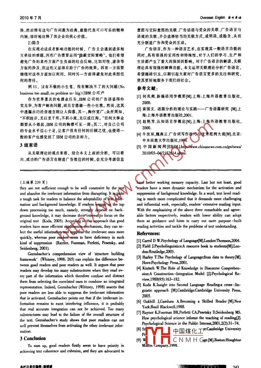 nwsy@overseaen.comISSN 100- -5039hp://ww.overcaen.comOverseas English 圃圖圓霜Tel:+86- 551 -5690811 5690812Analysis on Text -level Reading佘桂婷(中山大學(xué)新華學(xué)院外語(yǔ)系,廣東廣州510520)Abstract: Reading, especially reading at text Level, is 2 proces of continuously repeating, consolidating and undersanding words, phrases,and sentences. However, from the perspective of psycholinguistics, the compariosn and contrast of empirical data from experiments and re-searches would be evidences to support the idea that reading at text level is mainly infuenced by readers' ability of identfying a text's co-hesion and coherence, balancing the activation and supession of background knowledge, as well as readers' utilization of working memo-ry. Readers can make good use of these three aspects in order to advance their understanding of reading at text level.Key words: text level reading; cohesion; coherence; background knowledge; working memory中圈分類(lèi)號(hào):H319文獻(xiàn)標(biāo)識(shí)碼:A文章編號(hào) :1009 -5039(2010)07- -0238 021 IntroductionIt is not the combination of isolated words and sentences. Read-ers have to associate diferent parts of the text to search for itsinner connection and to combine them with background knowl-prehension of a whole reading text quite often poses dficulitesedge to construct the whole meaning (Koda, 2005). As text com-for readers. While having text level reading, readers need to en-dow themselves with the familarity of words and phrases, the un-prehension is rather complex and flexible, it involves the com-pleted match of both local and global coherence for the underly-derstanding of sentences' structure and meaning, and the abilitying meaning. One of the most important features of a text may beto make some inferences and to accumulate abundant informa-coherence and cohesion. It is the cohesive devices that connecttion. Kintsch's construction -integration model (Kintsch, 1988)the new inhformation with given information to be coherent as aseems to be a promising model of text reading because it explainswhole and form an integrated meaning of the text. Readers makehow a text is represented in menory as well as how the text isgreat eforts to decode coherence and cohesion while reading.integrated with readers' general knowledge beyond the text. InMaintaining coherence of a text requires making inference be-the early construction stage, readers activate the words' meaningyond the literal meaning of a text to enter higher level informa-and make inference. Then in the integration stage, it is time to(Harley, 2001). Oakhill and Gamham (1988) suggest thatintegrate the related network to gain a global coherence and sta-poor readers have problems, especially dificulty of making a setble structure (Harley, 2001). It is atempted to combine this con-of inferences. Some readers have better ability to detect and no-stnuction -integration model with some psycholinguistic theories,tice the inconsistency of comprehension that ffect them to con-researches and experiments to analyze readens' diferences fromtinue reading and they know when to reread and what should bethe fllowing three factors, aiming to come up with hints forreaders to figure out their weakness and facilitate themselves toreread to solve the problems. However, poor readers may havefailure to do such prompt monitoring (Rayner, Foorman, Perfetti,make improvements.Pesetsky, and Seidenberg, 2001).2 Text Level ReadingOne method of achieving text coherence is the use ofBecause text is associated with coherence as its inner fea-anaphora and its antecedent. As Hist and Brill (Field, 2003)ture to maintain meaning, whether readers can seize the deep co-suggest, text comprehension is directed by anaphor, The ties be-herence of the text itself is critical for text comprehension, in thistween anaphor and its antecedents may be diverse and looselysense, pursuing this may explain the difterences of readers abili-distributed in a text. They may have certain distances elsewherety. Moreover, readers' individual operation of working memoryin a text. One of the important higher level skillsl of reading is tovaries much during text comprebension. Therefore, in many p8y-process anaphors correctly. Readers have to find out the cohesivecholinguisic researches, working memory is often perceived todevices and extract the correct matching of the anaphor and itsanalyze readers' reading ability. Finally, readers' activation andrelated antecedent. Whether readers can easily resolve thesuppression of background knowledge and the use of them toanaphor with its antecedent or not distinguishes good readers andbenefit their readings also differ from each other. It seems con-poor readers because it really needs extensive coping strategiesvincing to take these factors into consideration in order to explain(Harley, 2001). As Haviland and Clark state (Whitney, 1998), thediferent readers' reading at text level.anaphoric reference requires readers to connect the information2.1 Coberence and cohesionappropriately using a bridging inference that retrieves informnationfrom the memory to ease the connection. According to HarleyText is undoubtedly endowed with coherence to make sense.中國(guó)煤化工YHCNMHG收稿日期:2010-04-24修回日期:2010-05-02作者簡(jiǎn)介:余桂婷(1982-),助教,碩士研究生,主要研究方向?yàn)檎Z(yǔ)言學(xué),應(yīng)用語(yǔ)言學(xué)及英語(yǔ)教學(xué)法。238順D 美麗剪本欄目責(zé)任編舞:謝嬡嬡2010年7月Overseas English 海外 美語(yǔ)(2001), it is the bridging inference that try to connect the newers' working memory is overloaded by the decoding processingand given information in a text to link the ideas and achieve co-which therefore results in litle psbility to use working memoryherence.to construct meaning. In addition, because their decoding is quiteslow, every time the working memory can just receive a smallseem 