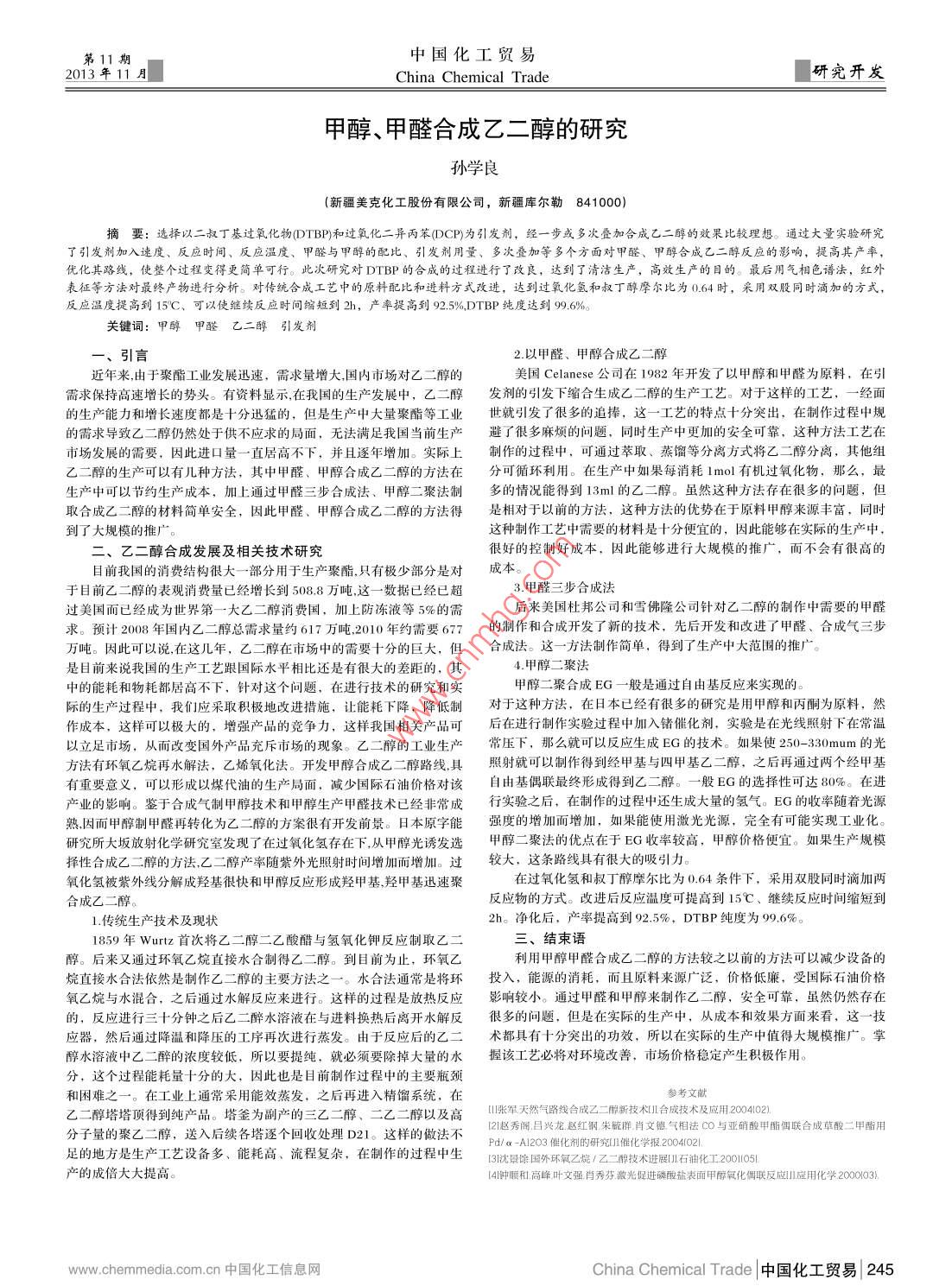 11期中國化工貿(mào)易2013年11月China Chemical trade圓研究開發(fā)甲醇、甲醛合成乙二醇的研究孫學(xué)良(新疆美克化工股份有限公司,新疆庫爾勒841000)摘要:選擇以二叔丁基過氧化物ΦTBP和過氧化二異丙苯ΦCP為引發(fā)劑,經(jīng)一步或多次疊加合成乙二醇的效果比較理想。遖過大量實(shí)驗(yàn)硏究了引發(fā)劑加入速度、反應(yīng)時(shí)間、反應(yīng)溫度、甲醛與甲醇的配比、引發(fā)劑用量、多次疊加等多個(gè)方面對(duì)甲醛、甲醇合成乙二醉反應(yīng)的影響,提高其產(chǎn)率,優(yōu)化其路線,使整個(gè)過程變得更簡單可行。此次硏究對(duì)DTBP的合成的過程進(jìn)行了改良,達(dá)到了清潔生產(chǎn),髙效生產(chǎn)的目的。最后用氣相色譜法,紅外表征等方法對(duì)最終產(chǎn)物進(jìn)行分析。對(duì)傳統(tǒng)合成工藝中的原料配比和進(jìn)料方式改進(jìn),達(dá)到過氧化氬和叔丁醇摩爾比為0.64時(shí),采用雙股同時(shí)滴加的方式反應(yīng)溫度提高到15℃C、可以使繼續(xù)反應(yīng)時(shí)間縮短到加h,產(chǎn)率提高到92.5%DTBP純度達(dá)到9,6%。關(guān)鍵詞:甲醇甲醛乙二醇引發(fā)劑一、引言2.以甲醛、甲醇合成乙二醇近年來由于聚酯工業(yè)發(fā)展迅速,需求量增大,國內(nèi)市場(chǎng)對(duì)乙二醇的美國 Celanese公司在1982年開發(fā)了以甲醇和甲醛為原料,在引需求保持高速增長的勢(shì)頭。有資料顯示,在我國的生產(chǎn)發(fā)展中,乙二醇發(fā)劑的引發(fā)下縮合生成乙二醇的生產(chǎn)工藝。對(duì)于這樣的工藝,一經(jīng)面的生產(chǎn)能力和增長速度都是十分迅猛的,但是生產(chǎn)中大量聚酯等工業(yè)世就引發(fā)了很多的追捧,這一工藝的特點(diǎn)十分突出,在制作過程中規(guī)的需求導(dǎo)致乙二醇仍然處于供不應(yīng)求的局面,無法滿足我國當(dāng)前生產(chǎn)避了很多麻煩的問題,同時(shí)生產(chǎn)中更加的安全可靠,這種方法工藝在市場(chǎng)發(fā)展的需要,因此進(jìn)口量一直居高不下,并且逐年增加。實(shí)際上制作的過程中,可通過萃取、蒸餾等分離方式將乙二醇分離,其他組乙二醇的生產(chǎn)可以有幾種方法,其中甲醛、甲醇合成乙二醇的方法在分可循環(huán)利用。在生產(chǎn)中如果每消耗lmol有機(jī)過氧化物,那么,最生產(chǎn)中可以節(jié)約生產(chǎn)成本,加上通過甲醛三步合成法、甲醇二聚法制多的情況能得到13ml的乙二醇。雖然這種方法存在很多的問題,但取合成乙二醇的材料簡單安全,因此甲醛、甲醇合成乙二醇的方法得是相對(duì)于以前的方法,這種方法的優(yōu)勢(shì)在于原料甲醇來源豐富,同時(shí)到了大規(guī)模的推廣這種制作工藝中需要的材料是十分便宜的,因此能夠在實(shí)際的生產(chǎn)中二、乙二醇合成發(fā)展及相關(guān)技術(shù)研究很好的控制好成本,因此能夠進(jìn)行大規(guī)模的推廣,而不會(huì)有很高的目前我國的消費(fèi)結(jié)構(gòu)很大一部分用于生產(chǎn)聚酯只有極少部分是對(duì)成本于目前乙二醇的表觀消費(fèi)量已經(jīng)増長到508.8萬噸,這一數(shù)據(jù)已經(jīng)已超3.甲醛三步合成法過美國而已經(jīng)成為世界第一大乙二醇消費(fèi)國,加上防凍液等5%的需后來美國杜邦公司和雪佛隆公司針對(duì)乙二醇的制作中需要的甲醛求。預(yù)計(jì)2008年國內(nèi)乙二醇總需求量約617萬噸2010年約需要677的制作和合成開發(fā)了新的技術(shù),先后開發(fā)和改進(jìn)了甲醛、合成氣三步萬噸。因此可以說在這幾年,乙二醇在市場(chǎng)中的需要十分的巨大,但合成法。這一方法制作簡單,得到了生產(chǎn)中大范圍的推廣。是目前來說我國的生產(chǎn)工藝跟國際水平相比還是有很大的差距的,其4.甲醇二聚法中的能耗和物耗都居高不下,針對(duì)這個(gè)問題,在進(jìn)行技術(shù)的研究和實(shí)甲醇二聚合成EG一般是通過自由基反應(yīng)來實(shí)現(xiàn)的。際的生產(chǎn)過程中,我們應(yīng)采取積極地改進(jìn)措施,讓能耗下降,降低制對(duì)于這種方法,在日本已經(jīng)有很多的研究是用甲醇和丙酮為原料,然作成本,這樣可以極大的,增強(qiáng)產(chǎn)品的競爭力,這樣我國相關(guān)產(chǎn)品可后在進(jìn)行制作實(shí)驗(yàn)過程中加入鍺催化劑,實(shí)驗(yàn)是在光線照射下在常溫以立足市場(chǎng),從而改變國外產(chǎn)品充斥市場(chǎng)的現(xiàn)象。乙二醇的工業(yè)生產(chǎn)常壓下,那么就可以反應(yīng)生成EG的技術(shù)。如果使250-330mum的光方法有環(huán)氧乙烷再水解法,乙烯氧化法。開發(fā)甲醇合成乙二醇路線,具照射就可以制作得到經(jīng)甲基與四甲基乙二醇,之后再通過兩個(gè)經(jīng)甲基有重要意義,可以形成以煤代油的生產(chǎn)局面,減少國際石油價(jià)格對(duì)該自由基偶聯(lián)最終形成得到乙二醇。一般EG的選擇性可達(dá)80%。在進(jìn)產(chǎn)業(yè)的影響。鑒于合成氣制甲醇技術(shù)和甲醇生產(chǎn)甲醛技術(shù)已經(jīng)非常成行實(shí)驗(yàn)之后,在制作的過程中還生成大量的氫氣。EG的收率隨著光源熟因而甲醇制甲醛再轉(zhuǎn)化為乙二醇的方案很有開發(fā)前景。日本原字能強(qiáng)度的增加而增加,如果能使用激光光源,完全有可能實(shí)現(xiàn)工業(yè)化研究所大坂放射化學(xué)研究室發(fā)現(xiàn)了