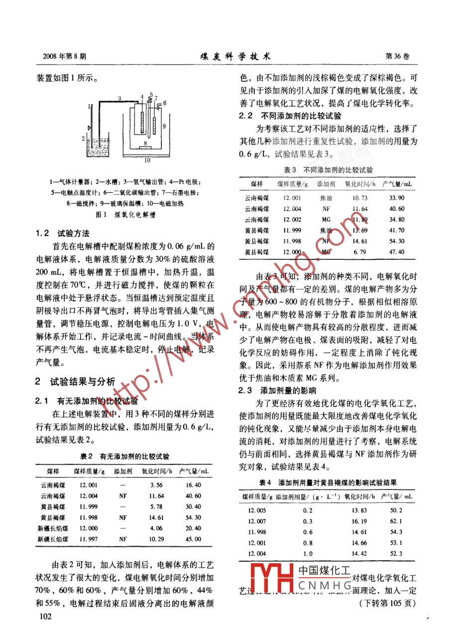 第36卷第8期煤炭科學技術Vol. 36 No. 82008年8月COAL SCIENCE AND TECHNOL0CYAug.2008, 煤炭加工與環(huán)保添加劑對煤電化學氧化工藝的影響邵群(安徽理工大學化學工程學院,安徽淮南232001)摘要:研究了添加劑對煤的電化學氧化工藝的影響,通過對不同系列的添加劑進行比較,根據(jù)相似相溶原理,最優(yōu)的添加劑為蔡系NF。并針對黃縣褐煤以萘系NF為添加劑,得出添加劑的最佳.用量為0.3g/L。.關鍵詞:煤;電化學氧化;添加劑中圖分類號: TQ531文獻標志碼: A文章編號: 0253 -2336 (2008) 08 -0101 -02Additive influenced to coal electrochemical oxidized technologySHAO Qun(School of Chemical Enginering, Anhui University of Science and Tecnology, Huainan 232001 , China)Abstract: The paper studied the aditive influenced to the coal electrochemical oxidized technology. In comparison with the diferent世ries of the additives and based on the similar and phase dissolvable principle, a naphthalene sernes NF was the optimum additive. Accord-ing to the Huangian lignite taking the naphthalene series NF as the aditve, the best consumption of the addtive was0.3 g/L.Key words: coal; electrochemical oxidization; additive煤的電化學轉化是煤炭深加工I的新技術1-4),少或阻止電解產(chǎn)物在電極及煤粒表面的附著,從而其操作條件溫和,一般在70C左右,常壓下進行,大幅度提高煤的電化學轉化速率。工藝簡單,設備投資少。但迄今為止,煤的電化學1驗氣化工藝存在的主要問題是煤的轉化速率隨電解時間的延長而下降,達穩(wěn)態(tài)后轉化速率太低,難以滿1.1試驗煤樣及裝置足實際生產(chǎn)要求,限制了新氣化工藝的發(fā)展。煤樣采自反應活性較高且變質(zhì)程度較低的云南轉化速率下降的原因是電解產(chǎn)物在電解液中溶褐煤、黃縣褐煤(精)和新疆長焰煤。原煤經(jīng)破解度小,附著在電極和煤粒表面,妨礙煤的電化學碎、篩分、摻合和縮分,制備出粒度小于74 μm轉化。該研究是通過在電解液中分散- -定 量的有機的實驗室分析煤樣。該煤樣的工業(yè)分析和元素分析溶劑來增大電解液對電解產(chǎn)物的溶解分散能力,減數(shù)據(jù)見表1。.表1煤樣的工業(yè)分析和元素分析 (質(zhì)量分數(shù))%工業(yè)分析元索分析(daf基)煤種M.AVadw(C)w(H)w(N)w(S)w(O)云南褐煤17. 342.9843. 6472. 825.321.800. 5619.50黃縣褐煤13. 4418. 33.42. 5174. 645.091. 860. 7917. 62新疆長焰煤6.922.9239. 0778. 865.731. 080.4513. 88注: M為煤樣收到基水分; A。為煤樣十基灰分; Var 為煤樣「燥尤灰基揮發(fā)分。電解槽采用隔離式電解槽,為玻璃圓柱形裝解在中國煤化工極為簡狀石墨電置,用由玻璃砂芯制作的多孔隔膜將陰極室與陽極極,YHCNMHG徑為0.1mm的室隔開,多孔隔膜阻止煤粉與陰極接觸,但允許溶鉑絲織成0.37 mm、面積為53.96 cm2的網(wǎng)。試驗1012008年第8期煤炭科學技術第36卷裝置如圖1所示。.色,由不加添加劑的淺棕褐色變成了深棕褐色??梢娪捎谔砑觿┑囊爰由盍嗣旱碾娊庋趸瘡姸?改1點7_善了電解氧化工藝狀況,提高了煤電化學轉化率。2.2不同添 加劑的比較試驗9為考察該工藝對不同添加劑的適應性,選擇了其他幾種添加劑進行重復性試驗,添加劑的用量為0.6g/L,試驗結果見表3。.~10表3不同添 加劑的比較試驗1-氣體計量器; 2- -水槽; 3一氫氣輸出管; 4 -Pr電極;煤樣煤樣質(zhì)量/g添加劑 氧化時間/h 產(chǎn)氣量/ml5一電觸點溫度計; 6- -二氧化碳輸出管; 7-石墨電極;云南褐煤12. 001焦油10. 7333. 908-磁攪拌; 9一玻璃保溫橢; 10一電磁加熱云南褐煤12. 004NF11. 6440.60圖1煤氧化電解槽云南禍煤12. 002MG11.8934.801.2試驗方法黃縣褐煤11. 99913. 6941.70首先在電解槽中配制煤粉濃度為0.06 g/mL的黃縣櫛煤11. 998.14.61 .54.30黃縣禍煤12. 0004C6.7947. 40電解液體系,電解液質(zhì)量分數(shù)為30%的硫酸溶液200 mL,將電解槽置于恒溫槽中,加熱升溫,溫由表3可知,添加劑的種類不同,電解氧化時度控制在70心,并進行磁力攪拌,使煤的顆粒在間及產(chǎn)氣量都有一定的差別。煤的電解產(chǎn)物多為分電解液中處于懸浮狀態(tài)。當恒溫槽達到預定溫度且子量為600~800的有機物分子,根據(jù)相似相溶原陰極導出口不再冒氣泡時,將導出彎管插入集氣測理,電解產(chǎn)物較易溶解于分散著添加劑的電解液量管,調(diào)節(jié)穩(wěn)壓電源,控制電解電壓為1.0 V,電中。從而使電解產(chǎn)物具有較高的分散程度,進而減解體系開始工作,并記錄電流-時間曲線。當體系少了電解產(chǎn)物在電極、煤表面的吸附,減輕了對電不再產(chǎn)生氣泡,電流基本穩(wěn)定時,停止電解,記錄化學反應的妨礙作用,一定程度上消除了鈍化現(xiàn).產(chǎn)氣量。象。因此,采用萘系NF作為電解添加劑作用效果優(yōu)于焦油和木質(zhì)素MC系列。2試驗結果與分析2.3添加劑量的影響2.1有無添加劑的比較試驗為了更經(jīng)濟有效地優(yōu)化煤的電化學氧化工藝,在上述電解裝置中,用3種不同的煤樣分別進使添加劑的用量既能最大限度地改善煤電化學氧化行有無添加劑的比較試驗,添加劑用量為0.6 g/L,的鈍化現(xiàn)象,又能盡量減少由于添加劑本身電解電試驗結果見表2。流的消耗,對添加劑的用量進行了考察,電解系統(tǒng)表2有無添加劑的比較試驗仍與前面相同,選擇黃縣褐煤與NF添加劑作為研究對象,試驗結果見表4。煤樣質(zhì)量/g添加劑 氧化時間/h 產(chǎn)氣量/mlL云南褐煤12.0013.5616.40表4添加劑用量對黃縣褐煤的影響試驗結果云南褐煤12. 004媒樣質(zhì)量/g謚加