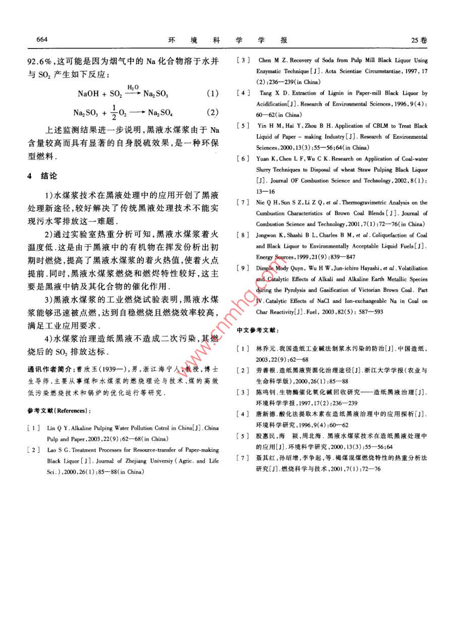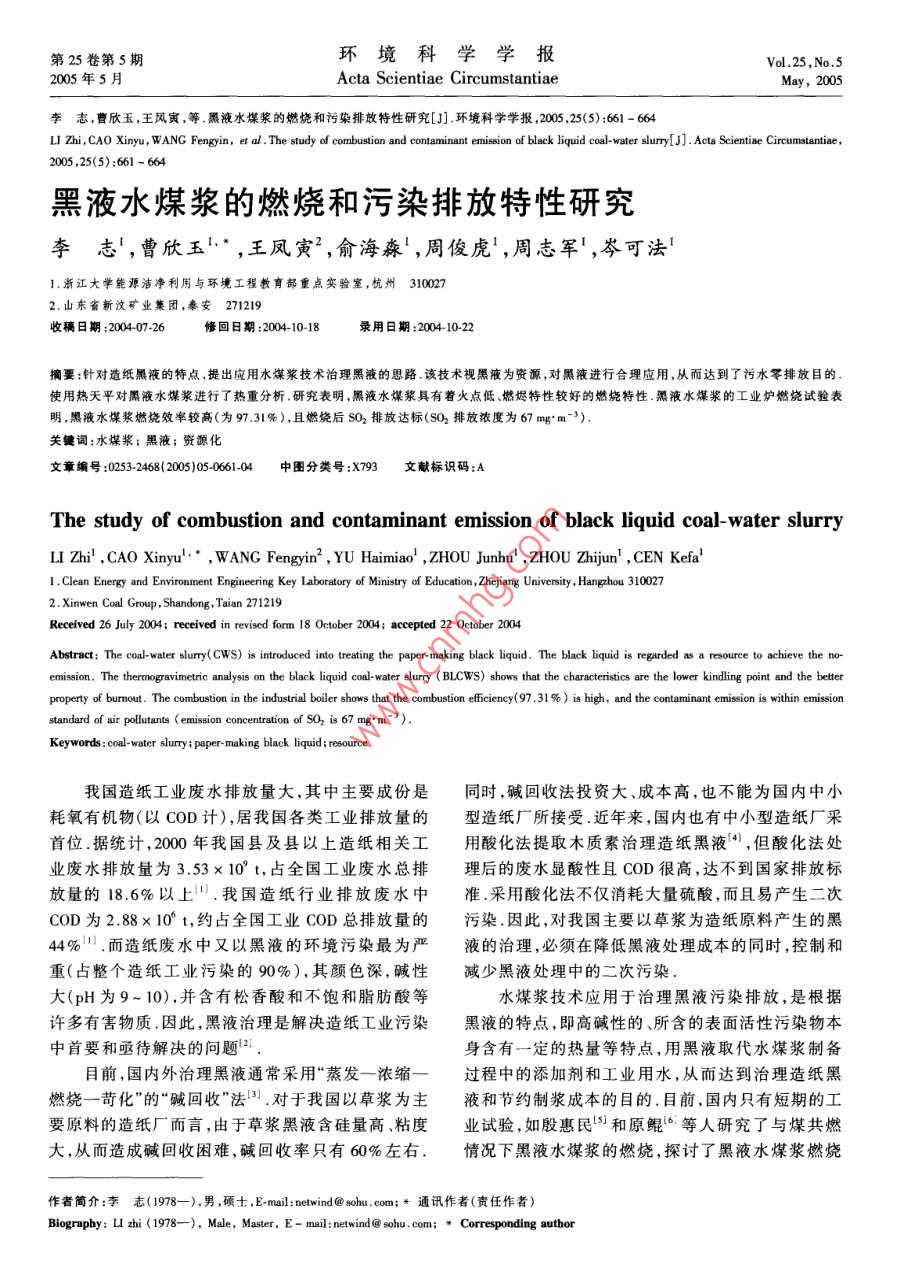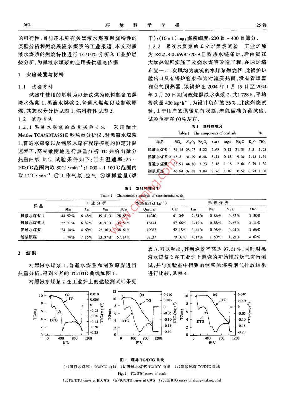 第25卷第5期環(huán)境科學(xué)學(xué)報Vol 25. No. 52005年5月Acta Scientiae CircumstantiaeMay,2005李志,曹欣玉,王風(fēng)寅,等黑液水煤漿的燃燒和污染排放特性研究[J].環(huán)境科學(xué)學(xué)報,2005,25(5):661-664LI Zhi, CAo Xinyu, WANG Fengyin, ef al. The study of combustion and contaminant emission of black liquid coal-water slurry[ J]. Acta Scientiae Circumstantiae2005,25(5):661-664黑液水煤漿的燃燒和污染排放特性研究李志',曹欣玉,王鳳寅2,俞海淼,周俊虎1,周志軍1,岑可法1.浙江大學(xué)能源潔凈利用與環(huán)境工程教育部重點(diǎn)實(shí)驗(yàn)室,杭州3100272.山東省新汶礦業(yè)集團(tuán),秦安271219收稿日期:20040726修回日期:2004-10-18錄用日期:20041022摘要:針對造紙黑液的特點(diǎn),提出應(yīng)用水煤漿技術(shù)治理黑液的思路該技術(shù)視黑液為資源,對黑液進(jìn)行合理應(yīng)用,從而達(dá)到了污水零排放目的使用熱天平對黑液水煤漿進(jìn)行了熱重分析,研究表明,黑液水煤漿具有著火點(diǎn)低、燃燼特性較好的燃燒特性黑液水煤漿的工業(yè)爐燃燒試驗(yàn)表明,黑液水煤漿燃燒效率較高(為9731%),且燃燒后SO2排放達(dá)標(biāo)(SO2排放濃度為67mm-3)關(guān)鍵詞:水煤漿;黑液;資源化文章編號:0253-2468(2005)050661-04中圖分類號:X793文獻(xiàn)標(biāo)識碼:AThe study of combustion and contaminant emission of black liquid coal-water slurryLI Zhi, CAO Xinyu WANG Fengyin, YU Haimiao, ZHOU Junhu', ZHOU Zhijun,CEN Kefa1. Clean Energy and Environment Engineering Key Laboratory of Ministry of Education, Zhejiang University, Hangzhou 3100272. Xinwen Coal Group, Shandong, Taian 271219Received 26 July 2004: received in revised form 18 October 2004: accepted 22 October 2004Abstract: The coal-water slurry( CwS) is introduced into treating the paper-making black liquid. The black liquid is regarded as a resouree to achieve the no-emission. The thermogravimetric analysis on the black liquid coal-water slurry( BLCWS)shows that the characteristics are the lower kindling point and the betterproperty of burnout. The combustion in the industrial boiler shows that the combustion efficiency(97, 31%)is high, and the contaminant emission is within emissionstandard of air pollutants(emission concentration of So, is 67 mgm">)Keywords: coal-water slurry; paper-making black liquid; resor我國造紙工業(yè)廢水排放量大,其中主要成份是同時,堿回收法投資大、成本高,也不能為國內(nèi)中小耗氧有機(jī)物(以COD計(jì)),居我國各類工業(yè)排放量的型造紙廠所接受近年來,國內(nèi)也有中小型造紙廠采首位據(jù)統(tǒng)計(jì),2000年我國縣及縣以上造紙相關(guān)工用酸化法提取木質(zhì)素治理造紙黑液,但酸化法處業(yè)廢水排放量為3.53×10t,占全國工業(yè)廢水總排理后的廢水顯酸性且COD很高,達(dá)不到國家排放標(biāo)放量的18.6%以上.我國造紙行業(yè)排放廢水中準(zhǔn)采用酸化法不僅消耗大量硫酸,而且易產(chǎn)生二次COD為2.88×10°t,約占全國工業(yè)COD總排放量的污染因此,對我國主要以草漿為造紙?jiān)袭a(chǎn)生的黑44%1.而造紙廢水中又以黑液的環(huán)境污染最為嚴(yán)液的治理,必須在降低黑液處理成本的同時,控制和重(占整個造紙工業(yè)污染的90%),其顏色深,堿性減少黑液處理中的二次污染大(pH為9-10),并含有松香酸和不飽和脂肪酸等水煤漿技術(shù)應(yīng)用于治理黑液污染排放,是根據(jù)許多有害物質(zhì)因此,黑液治理是解決造紙工業(yè)污染黑液的特點(diǎn),即高堿性的、所含的表面活性污染物本中首要和亟待解決的問題2身含有一定的熱量等特點(diǎn),用黑液取代水煤漿制備目前,國內(nèi)外治理黑液通常采用“蒸發(fā)一濃縮一過程中的添加劑和工業(yè)用水,從而達(dá)到治理造紙黑燃燒一苛化”的“堿回收”法.對于我國以草漿為主液和節(jié)約制漿成本的目的.目前,國內(nèi)只有短期的工要原料的造紙廠而言,由于草漿黑液含硅量高、粘度業(yè)試驗(yàn),如殷惠民和原鯤等人研究了與煤共燃大,從而造成堿回收困難,堿回收率只有60%左右.情況下黑液水煤漿的燃燒,探討了黑液水煤漿燃燒作者簡介:李志(1978—),男,碩士,E-mail:netwind@sohu.com;*通訊作者(責(zé)任作者)ography:LIzhi(1978--),Male,Master,E-mail:netwind@sohu.com:Correspondingauthor662環(huán)境科學(xué)學(xué)報25卷的可行性.目前還未見有關(guān)黑液水煤漿燃燒特性的千):(10±1)mg;煤粉細(xì)度:200目~400目篩分實(shí)驗(yàn)分析和燃燒黑液水煤漿的工業(yè)報道.本文對黑1.2.2羆液水煤漿的工業(yè)爐燃燒試驗(yàn)工業(yè)爐原液水煤漿的燃燒特性進(jìn)行 TG/DTG分析和工業(yè)爐燃為SZL28-0.6995/70-AⅡ型熱水鏈條爐,后由浙江燒分析,為黑液水煤漿的應(yīng)用提供理論依據(jù)大學(xué)熱能所實(shí)施了改燒水煤漿改造工程,在原爐墻1實(shí)驗(yàn)裝置與材料布置一、二次風(fēng)均為旋流的水煤漿燃燒器.此鍋爐爐膛出口只有鍋爐管束作為對流受熱面,沒有省煤器1.1試驗(yàn)材料和空氣預(yù)熱器.該鍋爐在2004年1月19日至2004試驗(yàn)中使用的燃料為以新汶煤為原料制備的黑年3月30日期間改燒黑液水煤漿2,共1728h,平均液水煤漿1、黑液水煤漿2、普通水煤漿以及制漿原投漿量400kg·h-',為設(shè)計(jì)負(fù)荷的56%,此次燃燒試煤,其灰成分分析見表1,燃料特性見表2驗(yàn),由于用戶的供暖負(fù)荷限制,未能做滿負(fù)荷試驗(yàn),1.2試驗(yàn)方法試驗(yàn)負(fù)荷在60%左右1.2.1黑液水煤漿的熱重實(shí)驗(