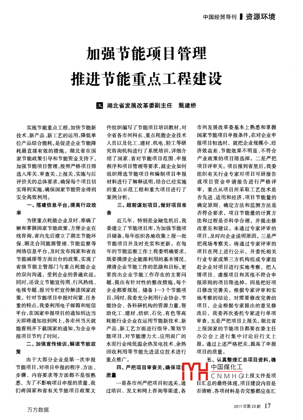 中國經(jīng)貿(mào)導(dǎo)刊■資源環(huán)境加強節(jié)能項目管理推進(jìn)節(jié)能重點工程建設(shè)文湖北省發(fā)展改革委副主任甄建橋?qū)嵤┕?jié)能重點工程,加快節(jié)能新件組織編寫了節(jié)能項目培訓(xùn)教材,對市州發(fā)展改革委基本上熟悉和掌握技術(shù)新產(chǎn)品新工藝的運用,降低單全省各市州科長、重點耗能企業(yè)技術(shù)國家節(jié)能項目申報條件,在對企業(yè)申位產(chǎn)品綜合能耗,是促進(jìn)企業(yè)節(jié)能降人員以及化工、建材、機電、輕工等研報項目初選時,就把企業(yè)規(guī)模小、經(jīng)耗最直接有效的措施。湖北省在國究咨詢機構(gòu)進(jìn)行了系統(tǒng)培訓(xùn),詳細(xì)介濟(jì)效益差、節(jié)能效果不明顯、不符合家節(jié)能政策引導(dǎo)和節(jié)能資金支持下,紹了國家、省對節(jié)能項目范圍、申報產(chǎn)業(yè)政策的項目篩選掉。二是嚴(yán)把加強節(jié)能項目管理,按照嚴(yán)格項目篩程序和項目管理等要求,就企業(yè)如何項目評審關(guān)。項目報到省里后,我委選人庫關(guān)、審査關(guān)、上報關(guān)、實施與后組織篩選節(jié)能項目和編制項目申報組織有關(guān)行業(yè)專家對項目可研報告評價關(guān)的總體要求,確保每個項目切材料進(jìn)行了解釋說明結(jié)合已經(jīng)實施或項目資金申請報告進(jìn)行嚴(yán)格評實得到實施確保國家節(jié)能資金得到的重點示范工程和重大項目進(jìn)行了審,重點從項目所采取工藝技術(shù)是安全高效利用。案例分析。否先進(jìn)、適用和經(jīng)濟(jì),項目節(jié)能量的搭建信息平臺,提高行政效三、超前謀劃項目,做好項目準(zhǔn)確定原則、確定方法和監(jiān)測方法是備否符合要求,項目節(jié)能量的計算方為使重點耗能企業(yè)及時、準(zhǔn)確了近幾年,特別是金融危機后,我法和過程是否科學(xué)合理,并提出修解和掌握國家節(jié)能政策,方便企業(yè)在委建立了節(jié)能項目庫,為加強節(jié)能項改意見和建議。未通過專家評審的線咨詢,省內(nèi)先后建立了湖北節(jié)能環(huán)目儲備每年組織各地收集上報一批項目,及時向企業(yè)說明原因。三是嚴(yán)保、湖北合同能源管理、節(jié)能監(jiān)察等節(jié)能項目并及時充實和更新。在每把現(xiàn)場考察關(guān)。將通過專家評審的網(wǎng)絡(luò)信息平臺,及時發(fā)布國家和省在年的節(jié)能監(jiān)察工作上我委明確要求,項目在網(wǎng)上進(jìn)行公示,并委托相關(guān)節(jié)能減排等方面出臺的政策,實現(xiàn)了既要摸清企業(yè)能源利用的基本情況,行業(yè)專家或第三方機構(gòu)組成專家組省級節(jié)能主管部門與重點耗能企業(yè)理清企業(yè)節(jié)能工作的思路和目標(biāo),更赴企業(yè)對項目進(jìn)行實地考察,把人的雙向溝通,受到企業(yè)的普遍歡迎。要找出企業(yè)節(jié)能工作存在的主要問情項目、虛報項目和其他不符合申同時,還設(shè)立節(jié)能宣傳周、行風(fēng)熱線、題,提出有針對性的整改措施,每個報原則的項目篩選掉。四是把好項電視專題、報刊專欄宣傳解讀國家政企業(yè)都要規(guī)劃、儲備1-—3個節(jié)能項目修改完善關(guān)。根據(jù)專家評審和實策。針對節(jié)能項目申報時間緊、任務(wù)目。同時,我委充分利用行業(yè)協(xié)會、節(jié)地考察的結(jié)論,對需要修改完善的重的特點,我委利用電子郵箱和短信能協(xié)會、各科研機構(gòu)的資源力量,幫項目,企業(yè)根據(jù)專家提出的意見修平臺,在國家申報項目的通知到達(dá)當(dāng)助化工、建材、紡織、石化、有色等高改后,我委再次委托專家進(jìn)行單項天即將通知掛到網(wǎng)上,各市州當(dāng)天就耗能行業(yè)企業(yè)在運用節(jié)能新技術(shù)新審查。五是嚴(yán)把項目上報關(guān)。湖北省能看到并下載國家的通知,為企業(yè)申產(chǎn)品、新工藝方面進(jìn)行指導(dǎo),策劃節(jié)上報國家的節(jié)能項目都要在委主任報項目節(jié)約了時間。能項目,對節(jié)能潛力大、應(yīng)用面廣的辦公會上進(jìn)行集中討論后行文上二、加強宣傳培訓(xùn),解讀節(jié)能政水泥行業(yè)純低溫余熱發(fā)電技術(shù)、余熱報。通過上述嚴(yán)格把關(guān),提高了申報回收利用等節(jié)能先進(jìn)適應(yīng)技術(shù)進(jìn)行項目的質(zhì)量由于大部分企業(yè)是第一次申報重點推廣。五、認(rèn)真整理匯總項目資料,確節(jié)能項目,對項目申報的程序、方法、四、嚴(yán)把項目審查關(guān),確保項中國煤化工步驟、內(nèi)容要求等方面都不是很熟質(zhì)量CNMHG上報文件是項悉,為了不影響項目申報的質(zhì)量,我一是各市州嚴(yán)把項目初選關(guān)。通日匯總的最終體現(xiàn),項目建設(shè)內(nèi)容是們將國家和省有關(guān)節(jié)能項目政策文過培訓(xùn)、發(fā)文和網(wǎng)上咨詢等渠道,各否清晰、各項材料是否完整都應(yīng)在匯20年第23期17資源環(huán)境■中國經(jīng)貿(mào)導(dǎo)刊總文件中加以標(biāo)注,以方便查詢。因頸。為此,我委積極與金融機構(gòu)探索取得明顯成效此,在設(shè)計項目匯總表時,我委將項解決節(jié)能項目融資難的辦法,每年組(一)有效提升了全省節(jié)能技術(shù)目單位、隸屬關(guān)系、項目類型、項目建織興業(