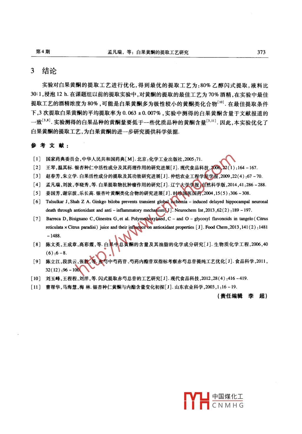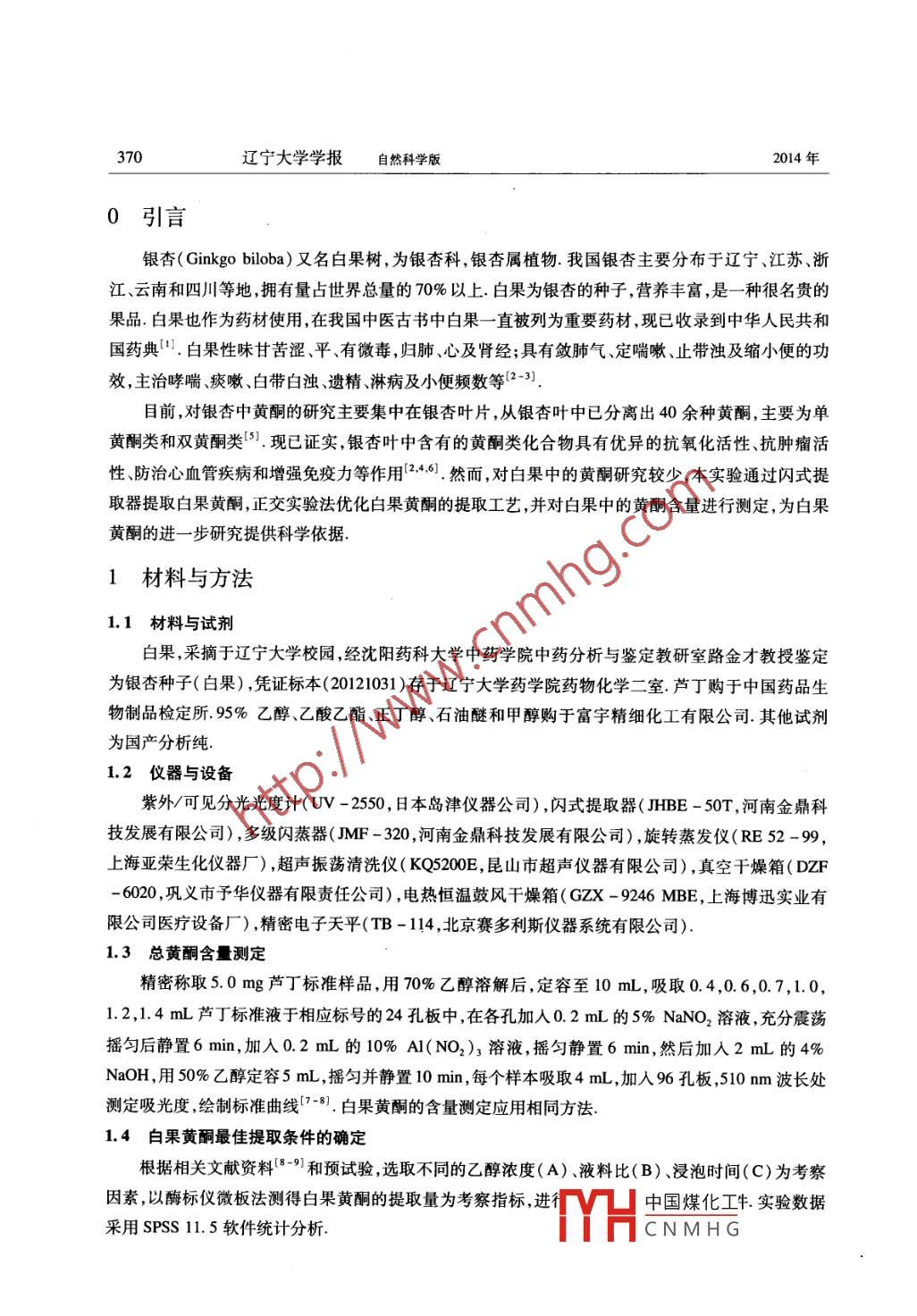遼寧大學(xué)學(xué)報(bào)JOURNAL OF LIAONING UNIVERSITY自然科學(xué)版Natural Sciences edition第41卷第4期2014年Vol 41 No 4 2014白果黃酮的提取工藝研究孟凡瑞',劉宇,劉波2,李曉秀2,劉洋,孔玉梅',王丹1(1.遼寧大學(xué)藥學(xué)院,遼寧沈陽1006;2.沈陽醫(yī)學(xué)院,遼寧沈陽110034)摘要:目的:優(yōu)化白果黃酮的提取工藝方法:采用閃式提取器提取白果黃酮,以白果黃酮的提取量為檢測指標(biāo),利用正交試驗(yàn)法對影響白果黃酮提取量的因素進(jìn)行評價,并對白果黃酮含量進(jìn)行測定結(jié)果閃式提取白果黃酮的最佳提取工藝為:乙醇濃度為80%,液料比30:1,浸泡12h在此條件下,3次提取白果黃酮的平均提取率為0.063±0.007%,結(jié)論:正交試驗(yàn)優(yōu)選出的白果黃酮提取工藝簡單,重復(fù)性好關(guān)鍵詞:白果黃酮;閃式提取;正交試驗(yàn)中圖分類號:R284.2文獻(xiàn)標(biāo)志碼:A文章編號:1000-5846(2014)04036940Extraction Process of Ginkgo FlavonoidsMENG Fan-rui', LIU Yu, LIU Bo2, LI Xiao-xiu2, LIU Yang, KONG Yu-mei, WANG Dan(1. College of Pharmacy, Liaoning University, Shenyang 110036, China2. Shenyang Medical College, Shenyang 110034, China)Abstract: Aim: To optimize the extraction process of ginkgo flavonoids. Methods Ginkgoflavonoids were extracted by flash extractor, the amount of ginkgo flavonoids extract was asassessment scale, and the factors affecting the extraction rates were evaluated by orthogonal testThe amount of ginkgo flavonoids was determined. Result: The results showed that the optimumextraction method of ginkgo flavonoids by flash extractor was 80% ethanol concentration, 30:1liquid ratio, soaking 12 h. Three times average extraction rate of ginkgo flavonoids was 0. 0630. 007% under the conditions. Conclusion: The extraction process of ginkgo flavonoids optimizedin the experiment is simple and high reproducibleKey words: ginkgo flavonoids; flash extraction; orthogonal test收稿日期:2014-06-28基金項(xiàng)目:遼寧省教育廳科研項(xiàng)目(L2013011)作者簡介:孟凡瑞(1979-),男博士,講師,主要從事天然產(chǎn)物提取及藥理作用YHa中國煤化工CNMHG370遼寧大學(xué)學(xué)報(bào)自然科學(xué)版2014年0引言銀杏( Ginkgo biloba)又名白果樹,為銀杏科,銀杏屬植物.我國銀杏主要分布于遼寧、江蘇、浙江、云南和四川等地,擁有量占世界總量的70%以上白果為銀杏的種子,營養(yǎng)豐富,是一種很名貴的果品.白果也作為藥材使用,在我國中醫(yī)古書中白果一直被列為重要藥材,現(xiàn)已收錄到中華人民共和國藥典.白果性味甘苦澀、平、有微毒,歸肺、心及腎經(jīng);具有斂肺氣、定喘嗽、止帶濁及縮小便的功效,主治哮喘、痰嗽、白帶白濁、遺精淋病及小便頻數(shù)等2-3)目前,對銀杏中黃酮的研究主要集中在銀杏葉片,從銀杏葉中已分離出40余種黃酮,主要為單黃酮類和雙黃酮類.現(xiàn)已證實(shí),銀杏葉中含有的黃酮類化合物具有優(yōu)異的抗氧化活性、抗腫瘤活性防治心血管疾病和增強(qiáng)免疫力等作用26,然而,對白果中的黃酮研究較少,本實(shí)驗(yàn)通過閃式提取器提取白果黃酮,正交實(shí)驗(yàn)法優(yōu)化白果黃酮的提取工藝,并對白果中的黃酮含量進(jìn)行測定,為白果黃酮的進(jìn)一步研究提供科學(xué)依據(jù)1材料與方法1.1材料與試劑白果,采摘于遼寧大學(xué)校園,經(jīng)沈陽藥科大學(xué)中藥學(xué)院中藥分析與鑒定教研室路金才教授鑒定為銀杏種子(白果),憑證標(biāo)本(20121031)存于遼寧大學(xué)藥學(xué)院藥物化學(xué)二室蘆丁購于中國藥品生物制品檢定所.95%乙醇、乙酸乙酯、正丁醇、石油醚和甲醇購于富宇精細(xì)化工有限公司.其他試劑為國產(chǎn)分析純1.2儀器與設(shè)備紫外/可見分光光度計(jì)(UV-2550,日本島津儀器公司),閃式提取器(JHBE-50T,河南金鼎科技發(fā)展有限公司),多級閃蒸器(JMF-320,河南金鼎科技發(fā)展有限公司),旋轉(zhuǎn)蒸發(fā)儀(RE52-99,上海亞榮生化儀器廠)超聲振蕩清洗儀(KQ5200E,昆山市超聲儀器有限公司),真空干燥箱(DZF-6020,鞏義市予華儀器有限責(zé)任公司),電熱恒溫鼓風(fēng)干燥箱(GzX-9246MBE,上海博迅實(shí)業(yè)有限公司醫(yī)療設(shè)備廠),精密電子天平(TB-114,北京賽多利斯儀器系統(tǒng)有限公司)1.3總黃酮含量測定精密稱取5.0mg蘆丁標(biāo)準(zhǔn)樣品,用70%乙醇溶解后,定容至10mL,吸取0.4,0.6,0.7,1.0,1.2,14mL蘆丁標(biāo)準(zhǔn)液于相應(yīng)標(biāo)號的24孔板中,在各孔加入0.2mL的5%NaNO2溶液,充分震蕩搖勻后靜置6min,加入0.2mL的10%A(NO2)3溶液搖勻靜置6min,然后加入2mL的4%NaOH,用50%乙醇定容5mL,搖勻并靜置10min,每個樣本吸取4mL,加入96孔板,510mm波長處測定吸光度繪制標(biāo)準(zhǔn)曲線.白果黃酮的含量測定應(yīng)用相同方法1.4白果黃酮最佳提取條件的確定根據(jù)相關(guān)文獻(xiàn)資料”和預(yù)試驗(yàn)選取不同的乙醇濃度(A)、液料比(B)、浸泡時間(C)為考察化工牛.實(shí)驗(yàn)數(shù)據(jù)H G第4期孟凡瑞,等:白果黃酮的提取工藝研究3712結(jié)果與分析2.1微板法測量黃酮含量在本實(shí)驗(yàn)中對白果黃酮含量進(jìn)行的測定取得很好的線性關(guān)系,其標(biāo)準(zhǔn)曲線為:y=60634x+0.0086,R=0.9997,如圖1所示2.2單因素試驗(yàn)2.2.1酒精濃度對提取的影響固定試驗(yàn)條件:選取浸泡時間6h液料比為10:1,設(shè)酒精濃度分別為50%,65%,80%,95%考察酒精濃度對白果黃酮提取率的影響,結(jié)果如圖2所示v=6.0634x+0.008600.020.040.060.080.10.120.1450%60%70%80%90%