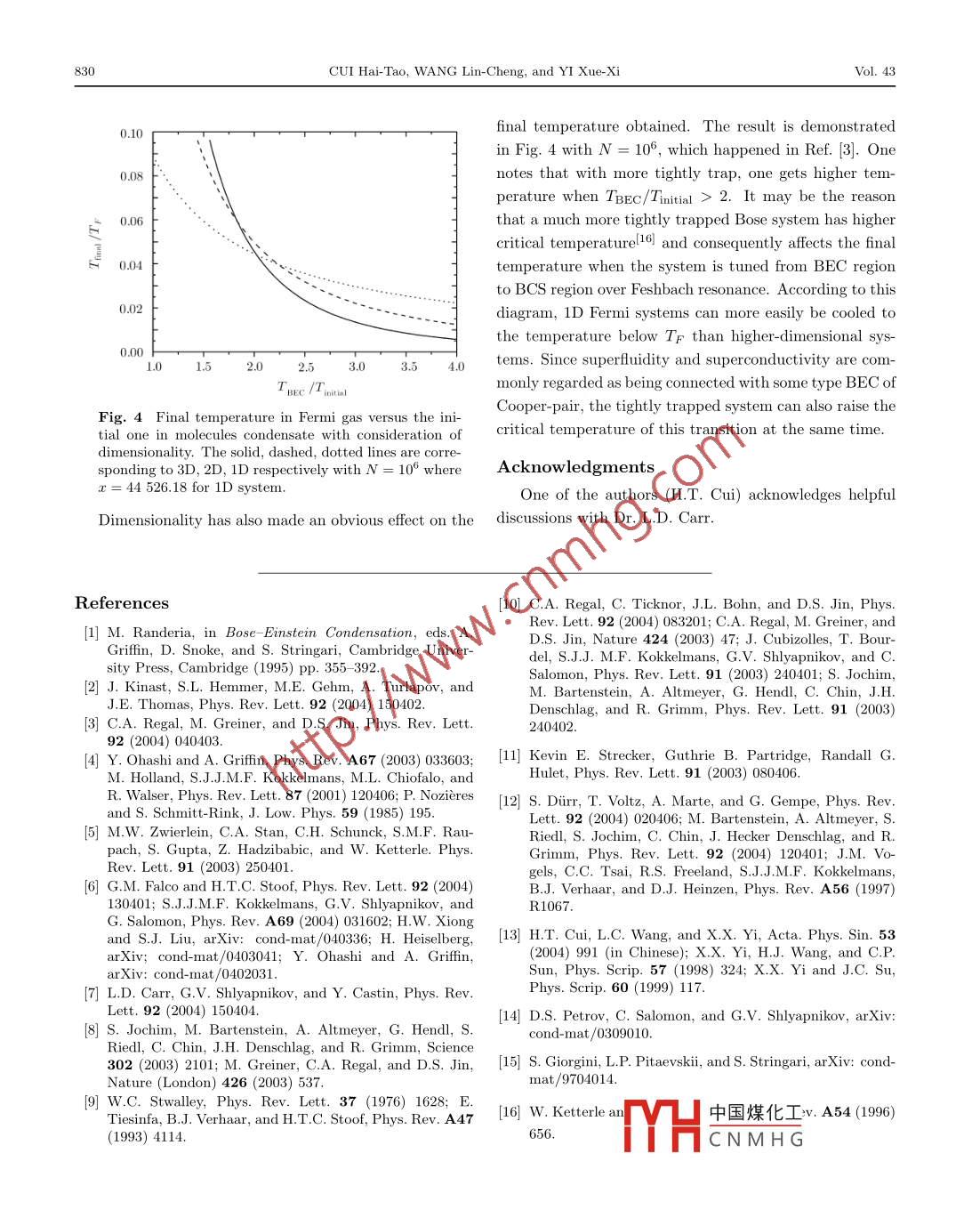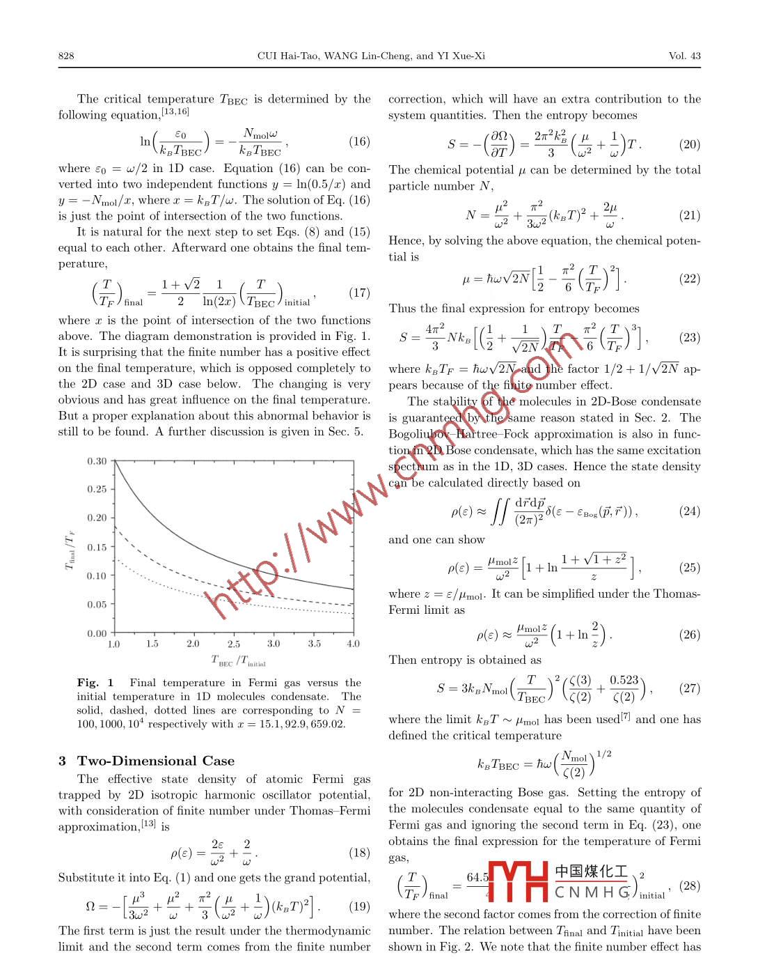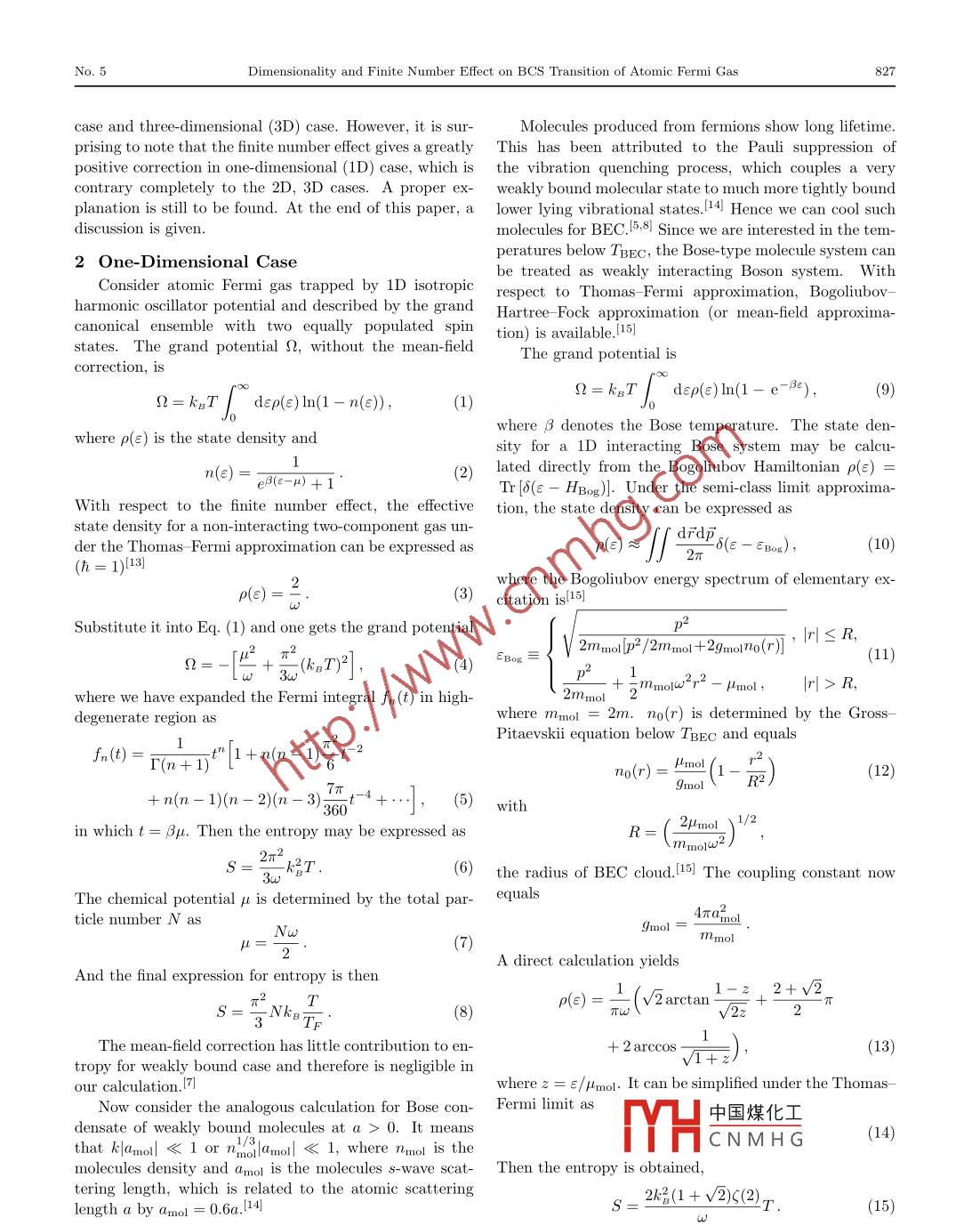 Commun. Theor. Phys.(Beijing, China)43(2005)pp. 826-830C International Academic PublishersVol.43,No.5,May15,2005Dimensionality and Finite Number Effect on BCS Transition of Atomic Fermi Gas*CUI Hai-Tao, WANG Lin-Cheng 2 and YI Xue-XiI Physics Department, Dalian University of Techology, Dalian 116024,ChinaInstitute of Theoretical Physics, Northeast Normal University, Changchun 130024, China(Received September 28, 2004; Revised November 16, 2004)Abstract The effect of finite number and dimensionality has been discussed in this paper. The finite number effecthas a negative correction to final temperature for 2D or 3D atomic Fermi gases. The changing of final temperatureobtained by scanning from BEC region to BCS region are 10% or so with N 10 and can be negligible when N>103However, in 1D atomic Fermi gas, the effect gives a positive correction which greatly changes the final temperature inFermi gas. This behavior is completely opposed to the 2D and 3D cases and a proper explanation is still to be foundDimensionality also has a positive correction, in which the more tightly trapping, the higher final temperature one getswith the same particle number. A discussion is also presentedPACS numbers: 03.75.Ss, 05.30. Fk, 36.90+fKey words: finite number effect, dimensionality, atomic BCS transition1 IntroductionBoth types of the bound-weaklypairs can be con-The progress having been made in achieving highly verted from each other adiabatically by tuning Feshbachdegenerate regime of trapped atomic Fermi gas has at- resonance. 1, 2 It provides a straightforward method toracted much attention. It originates from the reason that reach deeply degenerate Fermi gas from a molecules beCBardeen-Cooper-Schriffer(BCS) transition, which hap- By adiabatically changing the scattering length a frompens at very low temperature, compared to Fermi temper- positive to negative, the entropy is held constant, whichture TF, is associated with Bose-Einstein condensation leads to strong decrease at the final temperature 7Itof Cooper-pairs. I Recently a series of experiments 2, 3 is just the main idea of Ref[7]. In this work the en-have demonstrated the possibility of going further into the tropy of atomic Fermi gas is proportional to T/TF.AndBCS-BEC crossover. [1,4 In Regal's experiment trappedn the bec region the same quantity is proportional tatomic gas has been cooled to T/TF =0.07 with w 100 (T/TBEc) with the Bogoliubov-Hartree-Fock approxparticles. While in MIT experiment an even lower tem- mation. Since it is achieved to reach deeply into the tem-perature T/TF=0.05 has been obtained. [5I Since underperature below TBEC, this suggests that extremely lowIch a low temperature the system parameters suchtemperature in atomic Fermi gas could be made. Thistensity, temperature, interaction strength are easy tedetermined, it opens up the opportunity for theoreticalwork predicts theoretically that T/TF N 10-2 could beinvestigation into this novel quantum system. 16.71attained under which it possibly leads to BCS transitionHoInteraction between atomic fermplays a crucialit is worth while to note that the parti-role in explaining the BCS-BEC crossover. When the scle number is very limit in these experiments, for examwave scattering length is positive, it is possible for two ple Nn 107 in MITI5 and N w 10 in JILA (3) Theyfermions to form a bound state called molecular and un- are far below the thermodynamics limit(N-o, V-dergo BEC 15. 8 In the other hand, if a<0, fermionsoo, N/V- constant) and the thermodynamic methodsare also bound weakly together, which are candidates for are not in function. But the work(7 did not take this ef-Cooper-pair, the delocalized pairs in momentum spacefect into account. It is necessary to analyze the effect ofof atomic s-wave scattering length. It opens up the door tems and an analysis is inevitable. In addition to the finiteinto the beBEC crossover region experimentally. In number effect, we also discuss the effect of dimensional-also called BEC region, there exist long-lived ity on the final temperature obtained by adiabatic tuningmolecules, which are weakly bound short-range fermion The method used here is a generalization of Ref [7] withpairs. [ol On the other hand weakly bound fermions pairs consideration of fir中國煤化工 nality.1Thealso exist, which are very different from Cooper pairs be- result shows thatCNMHGes anegativecause of stronger interaction, and the BEC of this type of correction to the final temperature 1% or so when the to-pairs have been observed in JILA. 3tal number is no more than 10 in two-dimensional(2D)The project supported by National Natural Science Foundation of China under Grant No. 10305002No 5Dimensionality and Finite Number Effect on BCS Transition of Atomic Fermi Gas82ase and three-dimensional (3D)case. However, it is sur-Molecules produced from fermions show long lifetimeprising to note that the finite number effect gives a greatly This has been attributed to the Pauli suppression ofpositive correction in one-dimensional(1D)case, which is the vibration quenching process, which couples a verycontrary completely to the 2D, 3D cases. A proper ex- weakly bound molecular state to much more tightly boundplanation is still to be found. At the end of this paper, a lower lying vibrational states. 14! Hence we can cool suchdiscussion is givenmolecules for bec. 5. 8 Since we are interested in the tem-2 One-Dimensional Caseperatures below TBEC, the Bose-type molecule system canbe treated as weakly interacting Boson system. withConsider atomic Fermi gas trapped by ID isotropicmation. Bogoliubharmonic oscillator potential and described by the grand Hartree-Fock approximation (or mean-field approxima-canonical ensemble with two equally populated spinstates. The grand potential &, without the mean-field tion)is available. [15]The grand potential iscorrection isQ2=kBT/dep(e)In(1-n(e))Q=kET/dep(e)In(1-e-Bewhere B denotes the Bose temperature. The state den-where p(a)is the state 