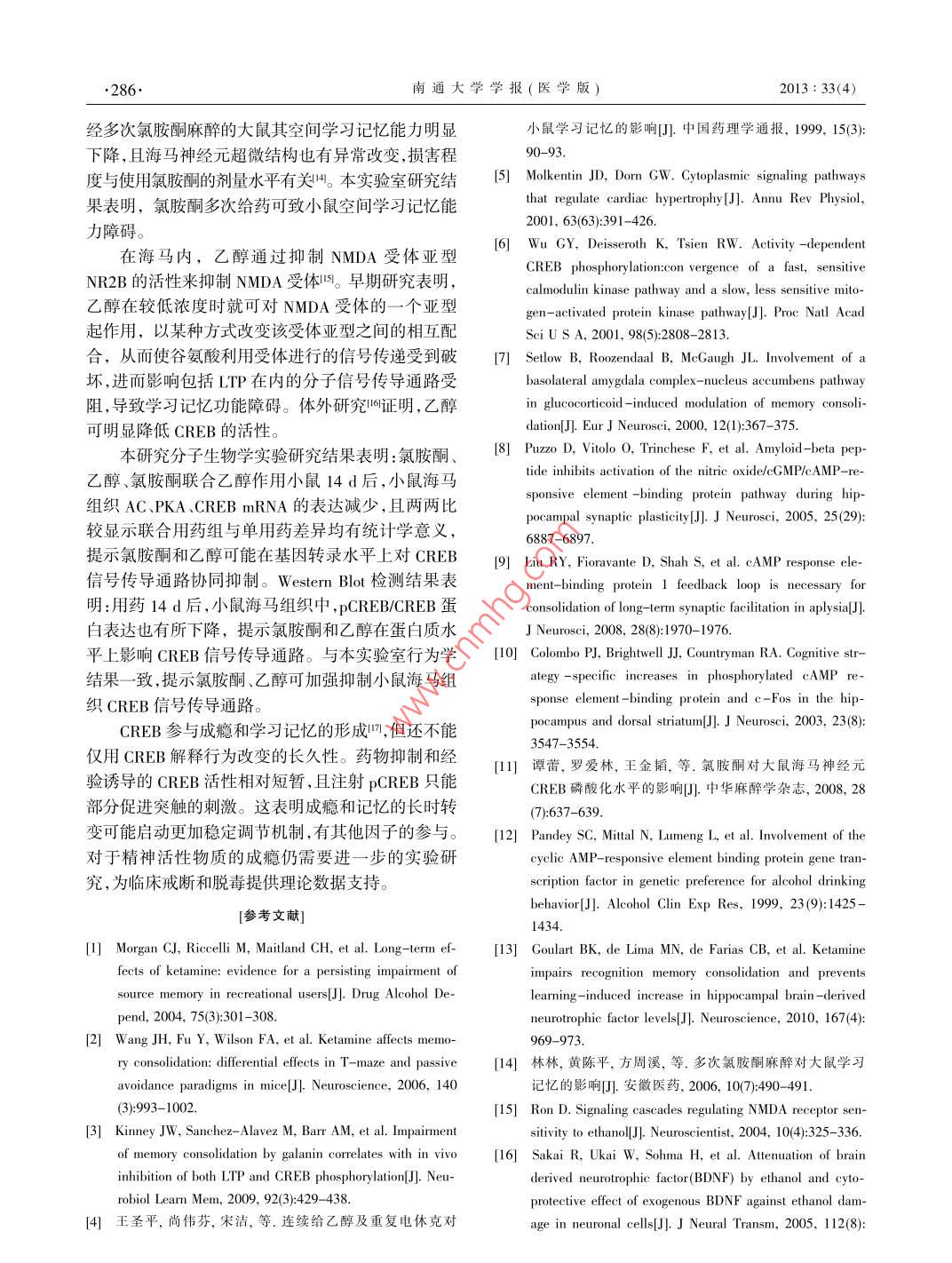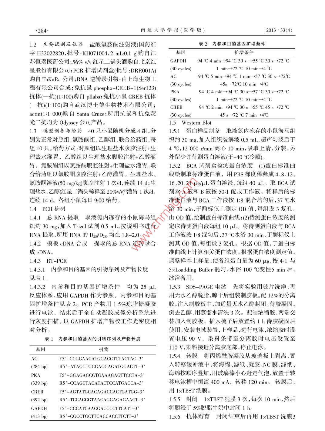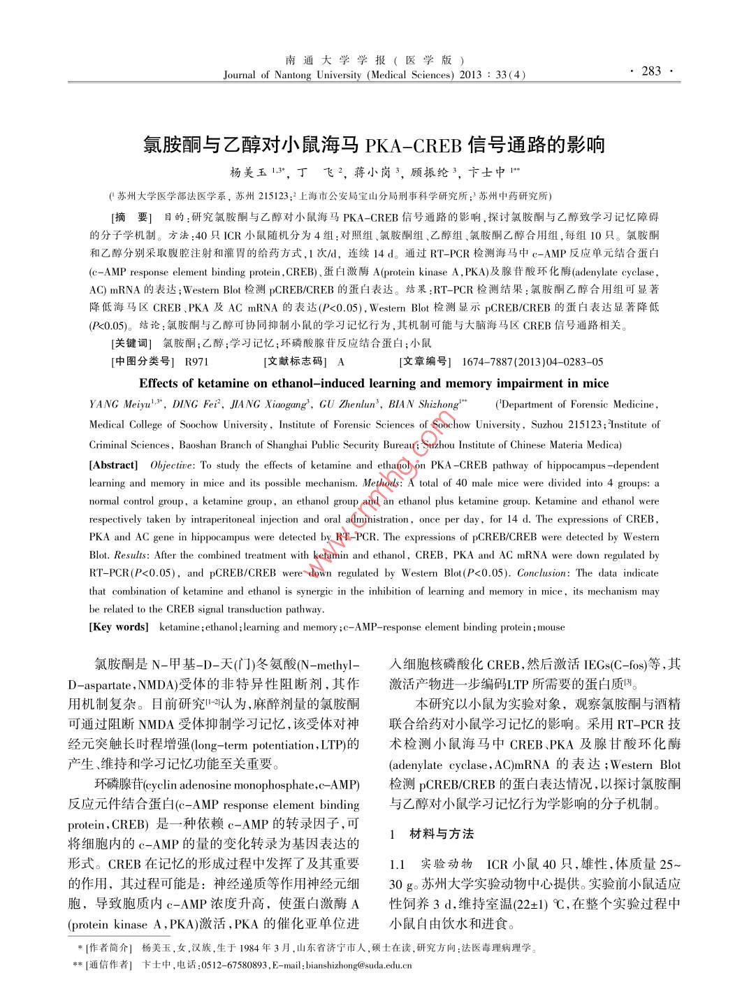 南通大學學報(醫(yī)學版Journal of Nantong University(Medical Sciences) 2013: 33(4283氯胺酮與乙醇對小鼠海馬PKA-CREB信號通路的影響楊美玉13”,丁飛2,蔣小崗3,顧振綸3,卞士中”(蘇州大學醫(yī)學部法醫(yī)學系,蘇州215123;2上海市公安局寶山分局刑事科學研究所;3蘇州中藥研究所)摘要]目的:研究氯胺酮與乙醇對小鼠海馬ⅣKA-CREB信號通路的影響,探討氯胺酮與乙醇致學習記憶障礙的分子學機制。方法:40只ICR小鼠隨機分為4組:對照組、氯胺酮組、乙醇組、氯胺酮乙醇合用組,每組10只。氯胺酮和乙醇分別釆取腹腔注射和灌胃的給藥方式,1次/d,連續(xù)14d。通過RT-PCR檢測海馬中c-AMP反應單元結合蛋白(c- AMP response element binding protein,CREB)蛋白激酶A( protein kinase A,FKA)及腺苷酸環(huán)化酶( adenylate cyclase,AC)mRNA的表達; Western blot檢測 PCREB/CREB的蛋白表達。結果:RT-PCR檢測結果:氯胺酮乙醇合用組可顯著降低海馬區(qū)CREB、PKA及 AC mRNA的表達(P<0.05), Western Blot檢測顯示 PCREB/CREB的蛋白表達顯著降低(P<0.05)。結論:氯胺酮與乙醇可協(xié)同抑制小鼠的學習記憶行為,其機制可能與大腦海馬區(qū)CREB信號通路相關[關鍵詞]氯胺酮;乙醇;學習記憶;環(huán)磷酸腺苷反應結合蛋白;小鼠中圖分類號]R971文獻標志碼]A[文章編號]1674-7887(2013)04-0283-05Effects of ketamine on ethanol-induced learning and memory impairment in miceYANG Meiyu., DING Fei JIA NG Xiaogang, GU Zhenlun, BlA N Shizhong (Department of Forensic MedicineMedical College of Soochow University, Institute of Forensic Sciences of Soochow University, Suzhou 215123; Institute ofCriminal Sciences, Baoshan Branch of Shanghai Public Security Bureau; Suzhou Institute of Chinese Materia Medica)[Abstract] Objective: To study the effects of ketamine and ethanol on PKA-CREB pathway of hippocampus -dependentlearning and memory in mice and its possible mechanism. Methods: A total of 40 male mice were divided into 4 groups: anormal control group, a ketamine group, an ethanol group and an ethanol plus ketamine group. Ketamine and ethanol wererespectively taken by intraperitoneal injection and oral administration, once per day for 14 d. The expressions of CreBPKA and AC gene in hippocampus were detected by RT-PCR. The expressions of pCREB/CREB were detected by WesternBlot. Results: After the combined treatment with ketamin and ethanol. CREB. PKA and AC mRNA were down regulated byRT-PCR(P<0. 05), and p CREB/CREB were down regulated by Westem Blot(P<0. 05). Conclusion: The data indicatethat combination of ketamine and ethanol is synergic in the inhibition of learning and memory in mice, its mechanism maybe related to the CreB signal transduction pathway.[Key words] ketamine; ethanol; learning and memory; C-AMP-response element binding protein; mouse氯胺酮是N-甲基D-天(門)冬氨酸(N- methy-人細胞核磷酸化CREB,然后激活TEGs(C-os)等,其D- -aspartate,NMDA)受體的非特異性阻斷劑,其作激活產(chǎn)物進一步編碼LTP所需要的蛋白質。用機制復雜。目前研究認為,麻醉劑量的氯胺酮本研究以小鼠為實驗對象,觀察氯胺酮與酒精可通過阻斷NMDA受體抑制學習記憶,該受體對神聯(lián)合給藥對小鼠學習記憶的影響。采用RT-PCR技經(jīng)元突觸長時程增強(ong- -term potentiation,TP)的術檢測小鼠海馬中CREB、PKA及腺甘酸環(huán)化酶產(chǎn)生、維持和學習記憶功能至關重要。adenylate cyclase, AC)mRNA的表達; Western blot環(huán)磷腺苷 (cyclin adenosine monophosphate,c-AMP)檢測 pCREB/CREB的蛋白表達情況,以探討氯胺酮反應元件結合蛋白(c- AMP response element binding與乙醇對小鼠學習記憶行為學影響的分子機制。protein,CREB)是一種依賴c-AMP的轉錄因子,可將細胞內(nèi)的c-AMP的量的變化轉錄為基因表達的1材料與方法形式。CREB在記憶的形成過程中發(fā)揮了及其重要1.1實驗動物ICR小鼠40只,雄性,體質量25的作用,其過程可能是:神經(jīng)遞質等作用神經(jīng)元細30g。蘇州大學實驗動物中心提供。實驗前小鼠適應胞,導致胞質內(nèi)c-AMP濃度升高,使蛋白激酶A性飼養(yǎng)3d,維持室溫(22±1)℃,在整個實驗過程中protein kinase A,PKA)激活,PKA的催化亞單位進小鼠自由飲水和進食。*作者簡介楊美玉,女,漢族,生于1984年3月,山東省濟寧市人,碩土在讀,研究方向:法醫(yī)毒理病理學通信作者卞士中,電話:0512-67580893,E- mail. bianshizhongt@ suda. edu. en南通大學學報(醫(yī)學版)2013:33(4)1.2主要試劑及儀器鹽酸氯胺酮注射液(國藥準表2內(nèi)參和目的基因擴增條件字H32022820,批號:KH071004,2ml:0.1g)購自江基因擴增條件蘇恒瑞醫(yī)藥公司;56%v/紅星二鍋頭酒購自北京紅 GAPDH94℃4min94℃30s-55℃30s72℃星股份有限公司;PCR擴增試劑盒(批號:DR0A)63lmin+72℃10min+4℃購自 Takara公司;RNA逆轉錄引物:由上海生物工℃5min→94℃1min→+57℃30s-72℃程有限公司合成;兔抗鼠 phospho-CREB-1(Ser13345s72℃10min*4℃抗體(一抗)(1:100)購自 slabs;抗小鼠CREB抗體94℃4min→→94℃30s57℃30s+72℃30 cycles)lmin+72℃10min-+4℃(一抗)(1:100購自武漢博士德生物技術有限公司CREB94℃2min+94℃30s→55℃45s72℃actin(1:1000)購自 Santa cruze;所用抗鼠和抗兔熒(30 cyeles)45s+72℃7min-+4℃光二抗均為 Odyssey公司產(chǎn)品1.5 Western blot1.3模型制備與給藥40只小鼠隨機分成4組,分1.5.1蛋白樣品制備取液氮內(nèi)凍存的小鼠海馬組別為正常對照組,氯胺酮組,乙醇組,聯(lián)合給藥組,每織約30mg,加入組織裂解液05m,超聲勻漿后于組10只。給藥方式:對照組以生理鹽水腹腔注射+生4℃,12000 r/min離心10min,吸取上清,分裝,另理鹽水灌胃,乙醇組以生理鹽水腹腔注射+乙醇灌外留