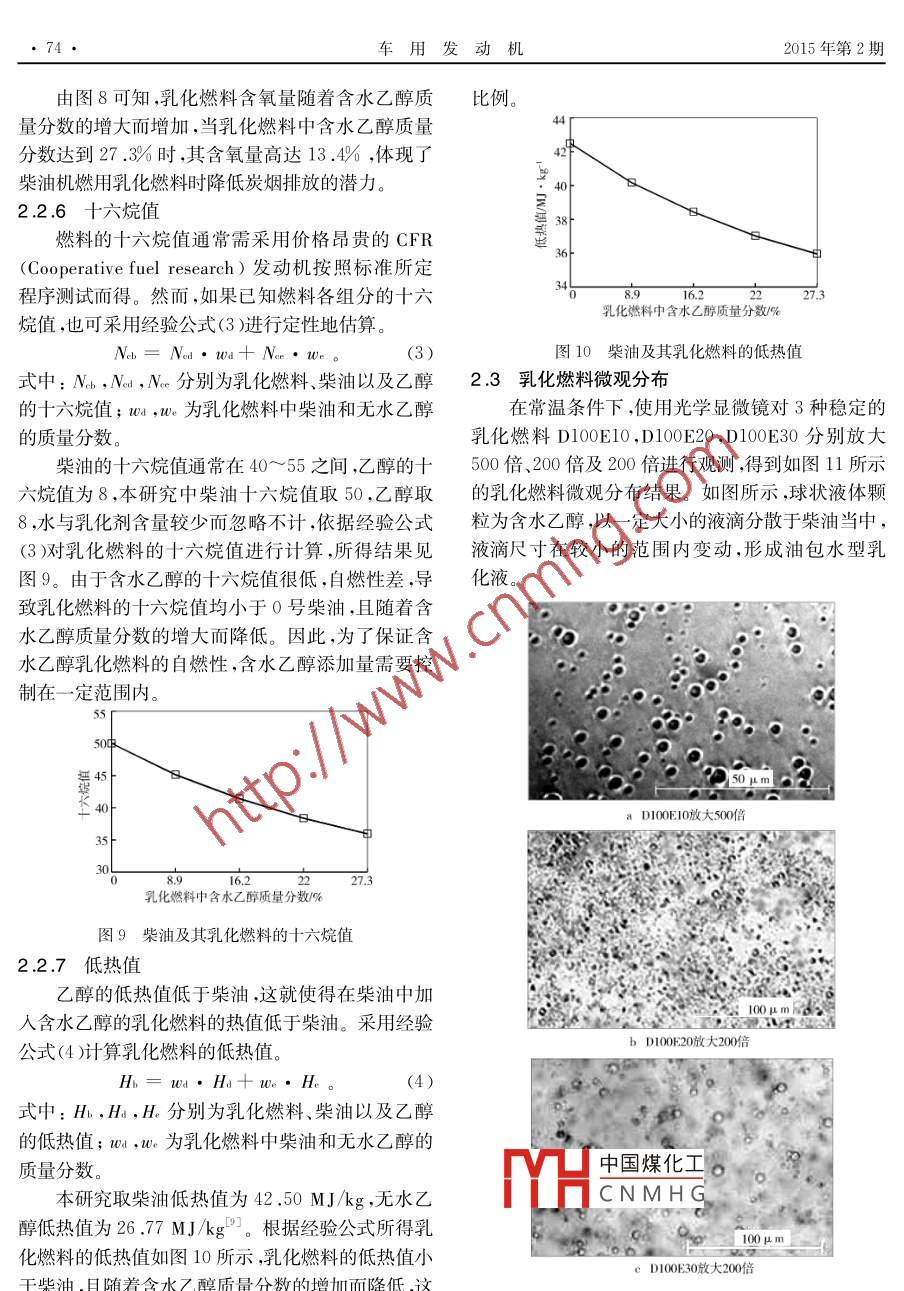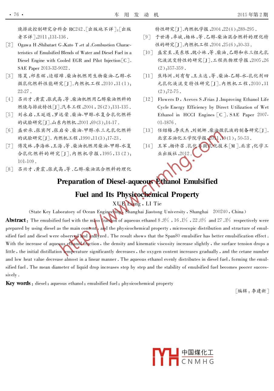 第2期(總第217期)車用發(fā)動機2015年4月VEHICLE ENGINEApr.2015柴油-含水乙醇乳化燃料配制及理化特性研究薛亮,李鐵(上海交通大學(xué)海洋工程國家重點實驗室,上海200240)摘要:以柴油作為乳化燃料主要成分,配制了含水乙醇質(zhì)量分數(shù)分別為8.9%,16.1%,22.%和27.3%4種乳化燃料,并對這些乳化燃料和柴油的理化特性、微觀分布及結(jié)構(gòu)進行觀測和研究。實驗結(jié)果表明:單一乳化劑span8o乳化效果較好;隨著含水乙醇質(zhì)量分數(shù)増大,乳化燃料的密度和運動黏度略冇増加,表面張力略有減小,蒸發(fā)性變得更妤,初始餾岀溫度明昰降低,含氧量増加,十六烷值和低熱值逐漸降低;含水廴醇均勻地分散在柴油中形成油包水型乳化液,分散相液滴平均直徑逐漸増大,乳化燃料穩(wěn)定性逐漸變差關(guān)鍵詞:柴油;含水乙醇;乳化燃料;理化特性DOI:10.3969/iss.1001-222.2015.02.015中圖分類號:TK411.71文獻標(biāo)志碼:B文章編號:1001-2222(2015)02-0070-07隨著我國汽車工業(yè)的飛速發(fā)展和汽車保有量的大增加了乙醇精制過程的能耗與成本。 Flowers急劇攀升,石油資源短缺與環(huán)境污染等問題日益凸等-硏究了以玉米為原料精制生產(chǎn)燃料乙醇時的顯,尤其是近年來全國范圍內(nèi)持續(xù)性的霧霾天氣,更能量收支,發(fā)現(xiàn)最終乙醇的凈能量僅占原料總能量加引起了人們對清潔能源、替代能源的廣泛關(guān)注。的6%,而蒸餾脫水工程能耗占37%之多。當(dāng)乙醇柴油機的主要排放物—固體顆粒物和氮氧化物被濃縮程度在80%左右時,即含水量為20%時,最終認為是霧霾污染的主要組成部分所得乙醇的能量收支將會得到大幅改善。在柴油中加入水或醇類燃料形成柴油乳化燃本研究將含水量為20%(質(zhì)量分數(shù))的含水乙料,能夠有效降低炭煙(Sσot)和氮氧化物(NO-)排醇與柴油按照一定的比例進行混合,配制多種柴油-放,同時提高指示熱效率。早期的國內(nèi)外研究表含水乙醇乳化燃料,并對其理化特性進行比較明柴油中摻入甲醇可以實現(xiàn)較穩(wěn)定的甲醇水柴研究。油三組元乳化混合。劉永啟、盛世承、傅茂林等學(xué)者通過試驗研究發(fā)現(xiàn),水對乳化液的穩(wěn)定性有1實驗儀器及方法重要影響,當(dāng)甲醇中摻水15%時,通過選擇適當(dāng)?shù)?實驗試劑及儀器乳化劑,柴油-甲醇水復(fù)合乳液可穩(wěn)定35~50d,其本研究所使用的實驗用品和儀器見表1和表2。黏度高于柴油,低熱值低于柴油,展示了良好的應(yīng)用表1中的實驗試劑主要用于乳化燃料的配制前景。乙醇同甲醇物性相近,但相對甲醇而言,目前其中氘代水用來對含水乙醇中的H原子進行標(biāo)記以關(guān)于柴油-含水乙醇乳化燃料的研究較少。黃震。、表1實驗試劑卓斌等研究了乙醇-柴油混合燃料的理化特性;盛宏至、焦緯洲等學(xué)者對柴油-乙醇水乳化燃料的流變特性進行了研究。然而,目前關(guān)于含水量較0號柴油高的柴油-含水乙醇乳化燃料的制備、理化特性及微無水乙醇(>99,5%,化學(xué)純)觀特性分析等全面系統(tǒng)的研究較為罕見蒸餾水(H2O)乙醇與柴油混合時,為了保持相溶性,通常采用氘代水(D2O無水乙醇。乙醇與水為共沸混合物,為得到高純度的乙醇除蒸餾工程外還需要進一步的脫水工程,大H中國煤化工醇CNMHGTween60、OP-10、AEO3收稿日期:2014-09-17;修回日期:201基金項目:國家自然科學(xué)基金(51276作者簡介:薛亮(1988—),男,碩士,主要研究方向為發(fā)動機噴霧與燃燒特性研究; jiuxi situ,edu,cn通訊作者:李鐵(1974-),男,研究員,主要研究方向為先進內(nèi)燃機燃燒、代用燃料技術(shù)等;liti@sjtu.edu,cn。2015年4月薛亮,等:柴油-含水乙醇乳化燃料配制及理化特性研究確定其擴散系數(shù)。表2中的實驗儀器主要用于柴油性測定法》進行。氧含量、十六烷值和低熱值等物性及乳化燃料的物性測量,主要包括表面張力、運動黏通過經(jīng)驗公式來定性分析。通過光學(xué)顯微鏡和度、蒸發(fā)性等理化特性。核磁共振波譜儀觀察、分析燃料的微觀分布和結(jié)構(gòu)。表2實驗儀器2實驗結(jié)果與討論序號名稱2.1乳化燃料的配制電子天平Y(jié)P200022.1.1乳化劑的選擇電動攪拌器7312-1旋轉(zhuǎn)黏度儀親水親油平衡值(h)是乳化劑的重要指標(biāo),油NDJ-SSBZY-201包水型乳化液的h值為3~6,據(jù)此可初步選擇乳化劑。為了比較復(fù)配乳化劑和單一乳化劑乳化效果的恒溫槽CH10255678優(yōu)劣,初步選用表1中的幾種乳化劑,其中包括3種蒸餾測定儀DLYS-101親水性乳化劑,與親油性乳化劑復(fù)配,保證復(fù)配后乳光學(xué)顯微鏡DM4000化劑的h值仍在3~6之間。兩種或多種乳化劑復(fù)核磁共振波普儀 A vanceⅢ400MHz配后的h值可根據(jù)式(1)計算。1.2實驗方法柴油與無水乙醇可互溶,但一旦有水存在,就會逐漸分層,因此需要加入適量乳化劑和助乳化劑。本研究先將無水乙醇與蒸餾水按照質(zhì)量比為41的式中:h和h分別為復(fù)合乳化劑和第種乳化劑親比例進行混合,得到含水量為20%(質(zhì)量分數(shù))的含水親油平衡值;v;為復(fù)合乳化劑中乳化劑i的質(zhì)量水乙醇,然后在環(huán)境溫度25℃、濕度40RH的條件分數(shù)。下將該含水乙醇與柴油混合,配制了多組乳化燃料表3列出實驗環(huán)境、柴油、助乳化劑、攪拌時間最終選擇乳化效果較好的配方,配制含水乙醇質(zhì)量等條件相同的情況下使用不同乳化劑