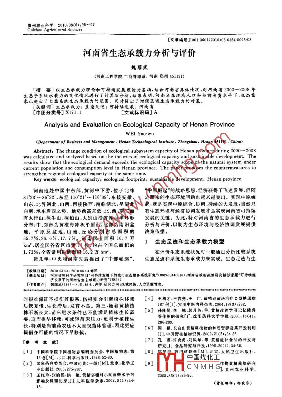 貴州農(nóng)業(yè)科學(xué)、2010,38(6) :95~97Guizhou Agricultural Sciences[文章編號]1001-3601<2010)06-0364-0095-03河南省生態(tài)承載力分析與評價魏耀武(河南工程學(xué)院工商管理系,河南鄭州451191)[摘要]以生態(tài)承載力理論和可持續(xù)發(fā)展理論為基礎(chǔ),結(jié)合河南省具體情況,對河南省2000- -2008年生態(tài)子系統(tǒng)承載力的變化情況進(jìn)行了計算及分析,結(jié)果表明,河南省在現(xiàn)有人口和當(dāng)前消費(fèi)水平下,生態(tài)需求已超出了自然系統(tǒng)生態(tài)承載力的范圍。同時提出了增強(qiáng)區(qū)城生態(tài)承載力的對策。[關(guān)鍵詞]生態(tài)承載力;生態(tài)足跡;可持續(xù)發(fā)展:河南省[中圖分類號] X171.1[文獻(xiàn)標(biāo)識碼] AAnalysis and Evaluation on Ecological Capacity of Henan ProvinceWEI Yao-wu(Department of Business and Management,Henan Technological Institute,Zhengzhou, Henan 451191, China)Abstract: The change condition of ecological subsystem capacity of Henan province during 2000- 2008was calculated and analyzed based on the theories of ecological capacity and sustainable development. Theresults show that the ecological demand exceeds the ecological capacity scope of the natural system undercurrent population and consumption level in Henan province.' The paper proposes the countermeasures tostrengthen regional ecological capacity at the same time.Key words: ecological capacity; ecological footprint; sustainable development; Henan province河南地處中國中東部.黃河中下游,位于北緯“中原崛起”的戰(zhàn)略思想,經(jīng)濟(jì)獲得了飛速發(fā)展,但隨31°23'~36°22' ,東經(jīng)110*21'~116*39' ,東接安徽、之而來的生態(tài)環(huán)境問題也越來越突出。實(shí)現(xiàn)中原崳山東,北界河北、山西,西接陜西,南臨湖北,呈望北起,就是實(shí)現(xiàn)中原綜合、協(xié)調(diào)、持續(xù)的大發(fā)展,當(dāng)然只向南、承東啟西之勢。地勢西高東低,北、西、南三面有生態(tài)環(huán)境與經(jīng)濟(jì)協(xié)調(diào)發(fā)展才是實(shí)現(xiàn)河南省可持續(xù)有太行山伏牛山.桐柏山、大別山沿省界呈半環(huán)形發(fā)展的關(guān)鍵。為此,特對河南省的生態(tài)承載力進(jìn)行分布;中、東部為黃淮海沖積平原;西北部為南陽盆分析與評價,以期為生態(tài)環(huán)境與經(jīng)濟(jì)協(xié)調(diào)發(fā)展提供地。平原及盆地、山地、丘陵分別占總面積的決策依據(jù).55. 7%、26.6%.17.7%。河南國土面積16.7萬1生態(tài)足 跡和生態(tài)承載力模型km2 ,居全國各省區(qū)市第17 位,約占全國總面積的1.73%;全省常用耕地面積16.2萬hm2。在評價生態(tài)系統(tǒng)狀況時一般通過分析比較系統(tǒng)近幾年,中央和河南先后提出了“中部崛起”、生態(tài)足跡 和系統(tǒng)生態(tài)承載力來實(shí)現(xiàn)。生態(tài)足跡與生[收稿日期] 2010-03-03 2010-0604修回[基金項目]河南省軟科學(xué) 研究項日“可持續(xù)發(fā)展下的城市生態(tài)服務(wù)系統(tǒng)研究"082400440610) ;河南省敢府決簫研究招標(biāo)課題“可持續(xù)經(jīng)[作者簡介]魏耀式(1977-).男,碩士.講師 .研究方向:區(qū)域經(jīng)濟(jì)、人力資源管理。時很難保證不損傷其根系,傷根則會引起植株移栽[4] 王相才,王吉亮,王 廣.黃精地黃湯治療2型糖尿病后恢復(fù)慢、生長滯后、發(fā)育不良。第三,隨著黃精植187例[J].實(shí)用中醫(yī)內(nèi)科雜志.2004,18(3):232.株不斷長大,苗床肥水條件已不能滿足植株生長需[5] 孫隆儒.李 銑,郭月英,等.黃精改善學(xué)習(xí)記憶障礙等作用的研究[J].沈陽藥科大學(xué)學(xué)報, 2001,18(4):要,適當(dāng)提早移栽,可減輕苗床壓力,更利于植株生286-289.長,特別是當(dāng)前藥農(nóng)還不太重視苗床管理,因此更應(yīng)[6]周繇.長白山黃精屬植物的種質(zhì)資源及其開發(fā)利用提倡在可能的情況下早移裁。[J].中國野生植物資源.2002.21(2):34-35.[參考文獻(xiàn)][7]孔謹(jǐn),許克勇,劉鳳琴,等.黃精滋補(bǔ)食品的開發(fā)與研究[J].食品研究與開發(fā),1998 ,20(4) :34-36.1]中國科學(xué)院中閏植物志編輯委員會.中國植物志;第[8]鄭漢5藥甩培物學(xué)「M].業(yè)京,人民衛(wèi)生出版社,15卷[M].北京:科學(xué)出版社,1978:52-80.中國煤化工[2]國家藥 典委員會.中國藥典(一部)[M].北京:化學(xué)工[9]二作物黃精裁培研究業(yè)出版社,2005:275-287.YHCN M H G].貴州農(nóng)業(yè)科學(xué),[3]王紅玲 .張渝侯.洪艷. 黃精多糖對小鼠血糖水平的2005,33(1) :85 86.影響及機(jī)理初探[J].兒科醫(yī)學(xué)雜志, 2002,8(1)14-(責(zé)任編輯:楊曉客)5.●96.貴州農(nóng)業(yè)科學(xué)2010,38卷態(tài)承載力可以確定該地區(qū)人類活動是否導(dǎo)致了生態(tài)消費(fèi)數(shù)據(jù)等摘自2000--2008年的《河南省統(tǒng)計年赤字或盈余。生態(tài)足跡是指支持一定地區(qū)的人口所鑒》,土地數(shù)據(jù)根據(jù)河南省國土資源局土地利用現(xiàn)狀需的生產(chǎn)性土地和水域的面積以及吸納這些人口所調(diào)查數(shù)據(jù)整理獲得(下同).產(chǎn)生的廢棄物所需要的土地之和。生態(tài)足跡可以通1.2 生態(tài)承載力模型過測定當(dāng)前人類為了維持自身生存而利用自然的量生態(tài)承載力公式:來評估人類對生態(tài)系統(tǒng)的影響。生態(tài)承載力指生態(tài)EC=N.ec=N.Z(r,●a;●y)(-=......系統(tǒng)的自我維持.自我調(diào)節(jié)能力,資源與環(huá