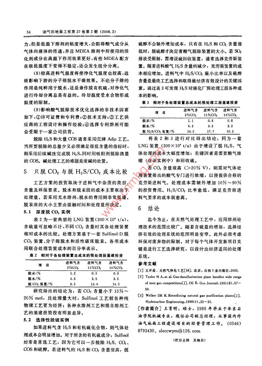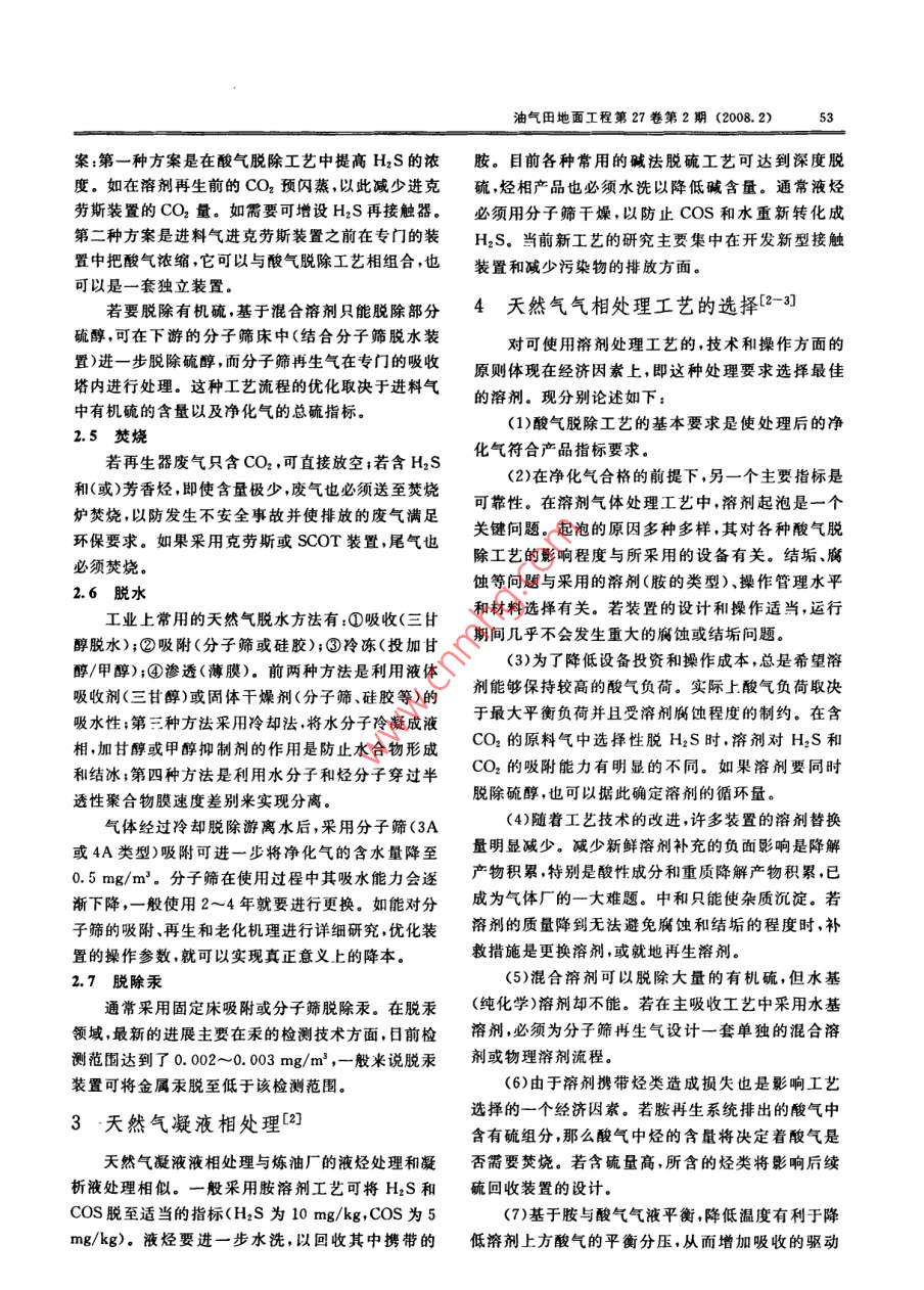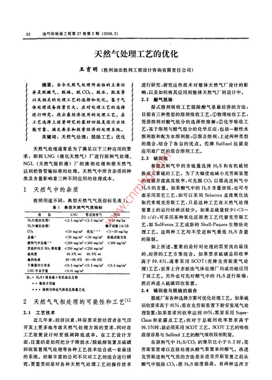 52油氣田地面工程第27卷第2期(2008. 2)天然氣處理工藝的優(yōu)化王育明(勝利油田勝利工程設(shè)計(jì)咨詢有限責(zé)任公司)摘要:當(dāng)今天然氣處理所面臨的主要任進(jìn)行研究,研究這些技術(shù)對(duì)整體天然氣廠設(shè)計(jì)的影務(wù)是脫酸氣、脫硫、脫CO2.脫水、脫汞等響,以及如何將其應(yīng)用到整體天然氣廠的設(shè)計(jì)中.以及相關(guān)的處理工藝的選擇和優(yōu)化。鑒于氣2.2 酸氣脫除體處理設(shè)備投資巨大,應(yīng)對(duì)處理工藝的選擇濕式溶劑吸收工藝脫除酸氣是最經(jīng)濟(jì)的方法,進(jìn)行研究,找出最經(jīng)濟(jì)適用的處理工藝。在目前有三種類型的溶劑吸收工藝:①物理吸收工藝,工藝選擇上投資研究的最好回報(bào)是設(shè)計(jì)出性憑借溶劑對(duì)酸氣組分的選擇性溶解;②化學(xué)吸收工能可靠、滿足要求和投資經(jīng)濟(jì)的處理系統(tǒng)。藝,基于溶劑與酸氣組分的化學(xué)反應(yīng),包括-般性水關(guān)鍵詞:天然氣處理;脫除工藝;優(yōu)化溶劑胺和配方水溶劑胺;③混合溶劑上述兩種類型天然氣處理通常是為了滿足以下三種應(yīng)用的要;的混合,結(jié)合了各自的優(yōu)點(diǎn)。殼牌Sulinol法就是應(yīng)用最廣泛的混合溶劑工藝。求:即到LNG (液化天然氣)廠進(jìn)行原料氣處理、2.3硫回收NGL (天然氣凝析液)廠的液相處理和使天然氣根據(jù)進(jìn)料氣中的含硫量選擇H2S和有機(jī)硫轉(zhuǎn)達(dá)到銷售管輸標(biāo)準(zhǔn)的處理。天然氣中所含雜質(zhì)的種換成元素硫的工藝。為了大幅度地減小克勞斯裝置類及含量影響著三種不同應(yīng)用的處理成本。的規(guī)模并提高其效率,可先脫CO2以提高進(jìn)料氣中1天然氣中的雜質(zhì)H2S的含量。如果酸氣中的H2S含量很低,也可考慮采用其它工藝,如可以采用Selectox直接氧化法按照用途不同,典型天然氣氣質(zhì)指標(biāo)見(jiàn)表1.取代常規(guī)克勞斯工藝,只是這種工藝在天然氣處理表1典型天然氣氣質(zhì)指標(biāo).裝置上的運(yùn)行經(jīng)驗(yàn)還較少。如果總硫量較少(<5~標(biāo)LNG管道銷 售氣NGL20 t/d),可采用某種氧化還原類工藝代替克勞斯工H2S(胺法處理)<3.5 mg/m2 <3.5 mg/m2 <10 mg/kgH2S(賊弦處理)銅片試驗(yàn)1A/1B藝,如SulFerox工藝或新的Shell-Paques生物法處<50 mg/m’優(yōu)化... <5~20 mg/kg理工藝。這兩種工藝均不受進(jìn)料氣最低H2S含量總碗"<20 mg/m2 <20 mg/m'檢硫試驗(yàn)為負(fù)的限制。<300 mg/m2 <300 mg/m' <300 mg/m2焚燒爐出口SOn釋放量<250 mg/m2' <250 ng/m2如上所述,重要的是針對(duì)處理的需要找出最佳硫純度99.9%w1 99.9% w .的、經(jīng)濟(jì)的工藝方案組合。如果要求硫磺總回收率碗回收率95~99.9% 95~99. 9%高于99. 8%,通常采用SCOT(殼牌克勞斯廢氣處干燥器出口會(huì)水<0.5 mg/m2 <0. 5 mg/m' <0.5 mg/m?LNG中采含量<0.01 my/m?理)工藝,世界上許多胺法氣體處理廠均成功地應(yīng)用注: H2S+ 碳基確+有機(jī)藐化合物了該工藝。另外也可先對(duì)酸氣中的H2S進(jìn)行濃縮,●.收決于用途然后再進(jìn)入硫磺回收裝置。...體積與凈化氣體優(yōu)化熱量之比2.4硫回收與脫硫的組合2天然氣氣相處理的可能性和工藝[1]脫硫廠有各種選擇方案可優(yōu)化處理工藝。如果硫回收要求高于95%,需在克勞斯裝置下游安裝尾氣處2.1工藝技術(shù) .理裝置;如果要求回收率達(dá)到99%,需要采用Super-近幾年來(lái),經(jīng)濟(jì)因素、環(huán)保要求使經(jīng)營(yíng)者在氣田Claus和亞露點(diǎn)工藝;而對(duì)于總硫回收率要求高于開發(fā)上更多地考慮天然氣處理方面的要求,同時(shí)在99. 5%時(shí),就必須采用SCOT工藝。SCOT工藝的吸收工藝裝置設(shè)計(jì)時(shí)更強(qiáng)調(diào)降低成本。在工藝設(shè)計(jì)方段很容易與Sulinol工藝的酸氣吸收段相配套。面,注重的是如何把分子篩脫水/脫硫醇裝置及硫磺在原料氣中H2S/CO2的摩爾比小于0.2時(shí),克回收裝置尾氣處理等各種工藝技術(shù)組合成一套最佳勞斯裝置難以直接處理從酸氣裝置來(lái)的酸氣。改進(jìn)的系統(tǒng)。經(jīng)驗(yàn)豐富的公司不只對(duì)工藝的組合進(jìn)行研克勞斯進(jìn)料氣氣質(zhì)的方法是在進(jìn)克勞斯裝置之前從究,更重要的是對(duì)各種天然氣處理工藝的操作技術(shù)酸氣中脫除CO2,使H2S濃度提高。有兩種選擇方油氣田地面工程第27卷第2期(2008. 2)53 .案:第一種方案是在酸氣脫除工藝中提高H2S的濃胺。目前各種常用的堿法脫硫工藝可達(dá)到深度脫度。如在溶劑再生前的COr預(yù)閃蒸,以此減少進(jìn)克硫,烴相產(chǎn)品也必須水洗以降低堿含量.通常液烴勞斯裝置的CO2量。如需要可增設(shè)H2S再接觸器。.必須用分子篩干燥,以防止COS和水重新轉(zhuǎn)化成第二種方案是進(jìn)料氣進(jìn)克勞斯裝置之前在專門的裝H2S.當(dāng)前新工藝的研究主要集中在開發(fā)新型接觸置中把酸氣濃縮,它可以與酸氣脫除工藝相組合,也裝置和減少污染物的排放方面??梢允且惶转?dú)立裝置。若要脫除有機(jī)硫,基于混合溶劑只能脫除部分4天然氣氣相處理工藝的選擇[2-3]硫醇,可在下游的分子篩床中(結(jié)合分子篩脫水裝對(duì)可使用溶劑處理工藝的,技術(shù)和操作方面的置)進(jìn)-步脫除硫醇,而分子篩再生氣在專門的吸收原則體現(xiàn)在經(jīng)濟(jì)因素上,即這種處理要求選擇最佳塔內(nèi)進(jìn)行處