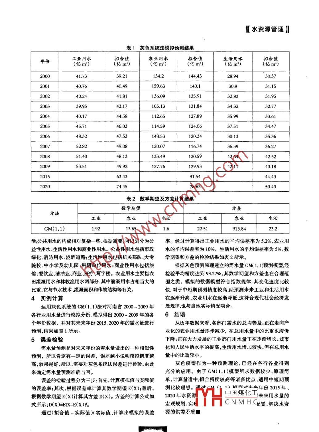 |水資源管理)]|基于GM(1,1)的河南省需水量預(yù)測(cè)研究邵全忠(河南省周口水文水資源勘測(cè)局周口466200)[摘要]本文重點(diǎn)介紹了灰色理論及其建模原理,對(duì)年度用水量進(jìn)行深入挖掘,依據(jù)河南省2000~ 2009年用水資料建立了灰色GM( 1, 1)預(yù)測(cè)模型,經(jīng)檢驗(yàn)?zāi)P途冗_(dá)到93.27%,并用該模型對(duì)需水量進(jìn)行了預(yù)測(cè)。預(yù)測(cè)結(jié)果表明,該模型用于需水量預(yù)測(cè),符合其灰色特性,可檢驗(yàn),適用性好,可為河南水資源規(guī)劃與管理提供必要的參考。[關(guān)鍵詞]灰色系統(tǒng)法GM(1,1)模型 需水預(yù)測(cè)1引言由一階灰色模型x' 1構(gòu)成的微分方程為:水資源是基礎(chǔ)性自然資源,是生態(tài)環(huán)境建設(shè)的控制性drx-+ax("=u(1)要素。隨著國(guó)民經(jīng)濟(jì)和社會(huì)迅速發(fā)展,人口快速增長(zhǎng)和城市將式( 1)離散化后得到矩陣形式:Y=XB(2)規(guī)模的不斷擴(kuò)大。水資源短缺、水質(zhì)污染已嚴(yán)重制約河南社會(huì)經(jīng)濟(jì)可持續(xù)發(fā)展。需水預(yù)測(cè)是水資源規(guī)劃的基礎(chǔ),是水資對(duì)方程組(2)按最小二乘法得到:源管理的重要依據(jù),也是供水系統(tǒng)優(yōu)化調(diào)度管理的重要部B=(X)+(XTY)=(2)分,合理地預(yù)測(cè)規(guī)劃水平年社會(huì)經(jīng)濟(jì)各部門的需水要求,對(duì)有計(jì)劃地指導(dǎo)水資源開發(fā)利用具有重要的意義。則微分方程的解為:x"0(k+1)=(x(0(1)-號(hào))e*+號(hào)2灰色系統(tǒng) GM(1,1 )模型x((k )的模擬值為:x"(0(k+1 )=x'("(k+1 )-x*")(k)所謂灰色系統(tǒng)是介于白色系統(tǒng)和黑箱系統(tǒng)之間的過渡該方法可以直接利用原始數(shù)據(jù)建立指數(shù)增長(zhǎng)模型,不系統(tǒng),一般地說,社會(huì)系統(tǒng)、經(jīng)濟(jì)系統(tǒng)、生態(tài)系統(tǒng)都是灰色系需要具體地分析系統(tǒng)的結(jié)果,就能找出系統(tǒng)整體變化的規(guī)統(tǒng)?;疑A(yù)測(cè)通過鑒別系統(tǒng)因素之間發(fā)展趨勢(shì)的相異程度,律。它所需要的數(shù)據(jù)不要求太多,并且適于中長(zhǎng)期預(yù)測(cè),在即進(jìn)行關(guān)聯(lián)分析,并對(duì)原始數(shù)據(jù)進(jìn)行生成處理來尋找系統(tǒng)數(shù)據(jù)缺乏時(shí)非常有效。變動(dòng)的規(guī)律,生成有較強(qiáng)規(guī)律性的數(shù)據(jù)序列,然后建立相應(yīng)3 河南省需水量預(yù)測(cè)的微分方程模型,從而預(yù)測(cè)事物未來發(fā)展趨勢(shì)的狀況。其用3.1水資源概況等時(shí)距觀測(cè)到的反應(yīng)預(yù)測(cè)對(duì)象特征的一-系列數(shù)最值構(gòu)造灰河南位于中國(guó)中東部、黃河中下游,界于北緯31° 23'色預(yù)測(cè)模型.預(yù)測(cè)術(shù)來某- -時(shí)刻的特征量,或達(dá)到某-特征-36° 22 ,東經(jīng)110° 21' ~116° 39/ . 之間,河南省河川徑量的時(shí)間?;疑A(yù)測(cè)方法是- -種不嚴(yán)格的系統(tǒng)方法,它拋開流地表水資源主要由降雨形成。全省多年平均降水量為了系統(tǒng)結(jié)構(gòu)分析的環(huán)節(jié),把受各種因索影響的需水量視為784mm,其中76%的降水量由植物吸收蒸騰、土壤入滲以及在一定范圍內(nèi)變化的與時(shí)間有關(guān)的灰色量,從其自身的數(shù)地表水體蒸發(fā)所消耗,另有24%的降水量形成河川徑流量。據(jù)列中挖掘有用信息,并以此模型對(duì)未來需水量做出預(yù)測(cè)。通過對(duì)1956 ~ 1979年資料的計(jì)算,全省多年平均河川天然GM(1,1 )模型是灰色系統(tǒng)最常用的一種模型,它是由徑流量為312.7億m' ,折合徑流深為189mm.多年平均年徑一個(gè)包含 單變量的一-階微分方程構(gòu)成的模型。該模型通過流深的區(qū)域分布與降水的總趨勢(shì)大體-致, 南部大于北部,對(duì)原始數(shù)據(jù)進(jìn)行生成處理,使對(duì)原始數(shù)據(jù)的累加生成尋找區(qū)大于平原。系統(tǒng)的整體規(guī)律,建立模型來尋找和揭示系統(tǒng)需水的潛在3.2需水量預(yù)測(cè)規(guī)律,其呈指數(shù)趨勢(shì)變化,通過建立指數(shù)微分方程,得到預(yù)本文對(duì)需水量的預(yù)測(cè)工業(yè)用水分為主要包括:工業(yè)用測(cè)模型。水、農(nóng)業(yè)用水、生活用水三部分。設(shè)已有的用水量序列數(shù)據(jù):一般工業(yè)用水和電力工業(yè)用水兩類?;痣妼儆诟吆乃衳' 0)={x( 0)(1),x( 0(2),K,x( 0)(n)業(yè),所需要的新中國(guó)煤化工比較高.相對(duì)比作一階累加生成模塊x():較特殊,所以將HCNMHG用水和公共用x("=(x("(1),x("(2),K,x' "(n)}水兩類,居住用水的構(gòu)成比較簡(jiǎn)單,主要用于居民的日常生.ZHmHUAI 2011,12|水資源管理)|表1_灰色 系統(tǒng)法模擬預(yù)測(cè)結(jié)果年份工業(yè)用水?dāng)M合值農(nóng)業(yè)用水生活用水(億m')(億m)(億m2) .200041.7339.21134.2144.4328.9430.37200140.7640.49 .159.63140.130.931.15200240.2441.81136.09135.9132.8331.95200339.9543.17105.13131.8434.3232.77200440.1744.58112.65127.8935.9933.61200545.7146.03114.59124.0637.5134.47200648.3247.53148.53120.3430.1335.36200752.8249.08120.07116.7436.3936.27200851.4048.13133.49120.5942.6442.52200953.5149.92127.76129.9342.1140.18201563.4391.5444.43202074.4578.6350.43表2數(shù)學(xué)期望及方差計(jì)算結(jié)果數(shù)學(xué)期望方工業(yè)農(nóng)業(yè)生活GM(1,1)1.92 .13.651.22.51913.8423.2活;公共用水的構(gòu)成相對(duì)復(fù)雜-些,根據(jù)需