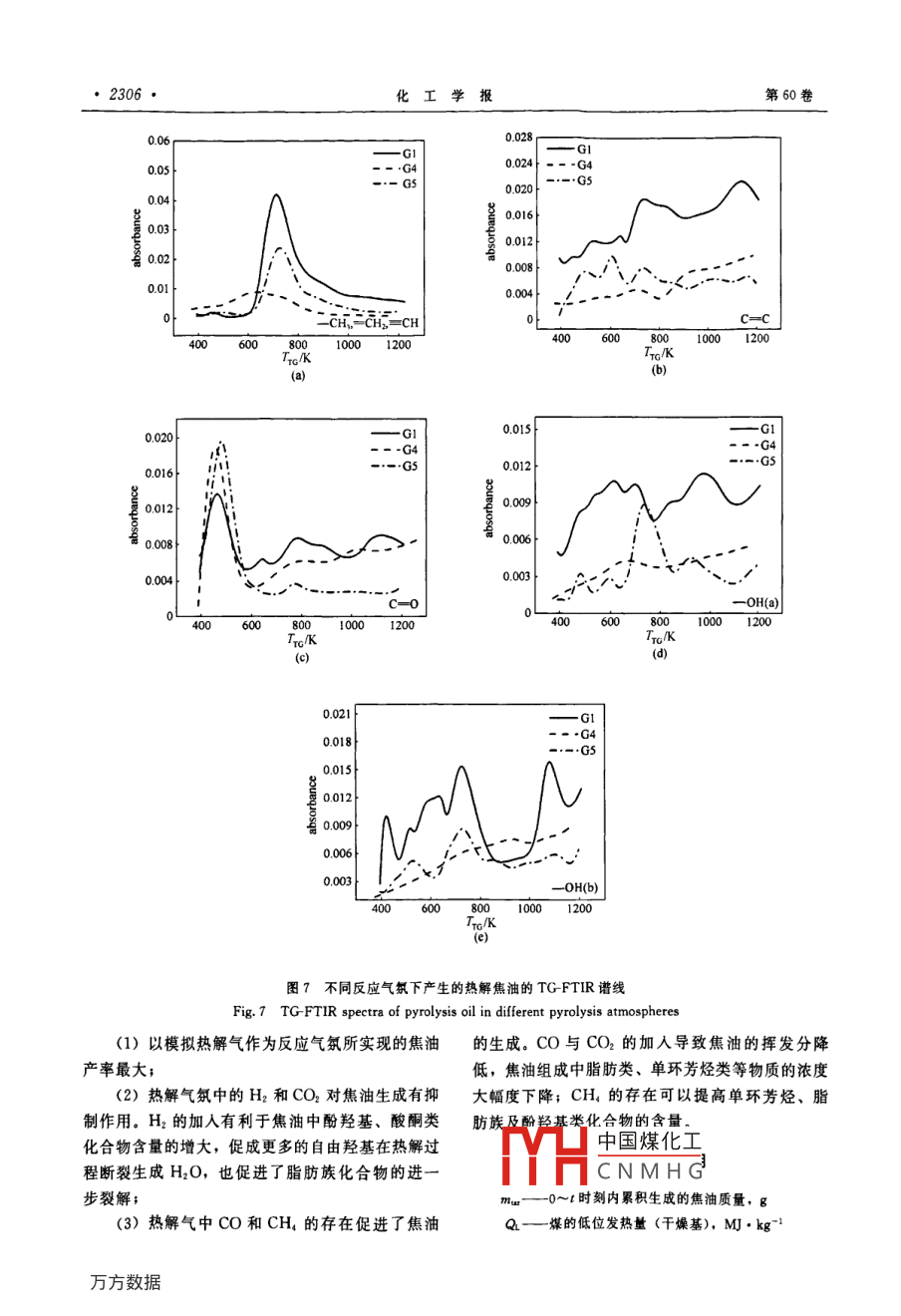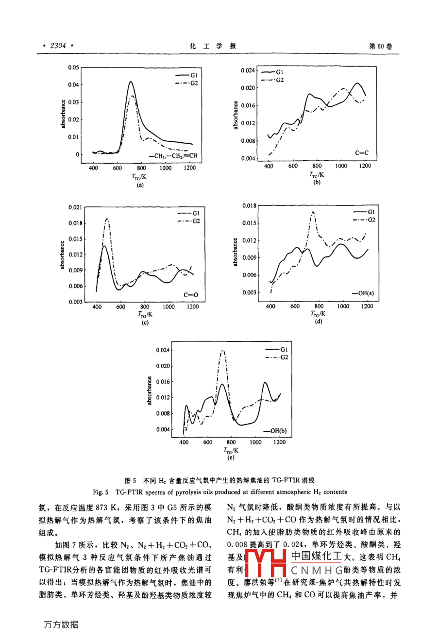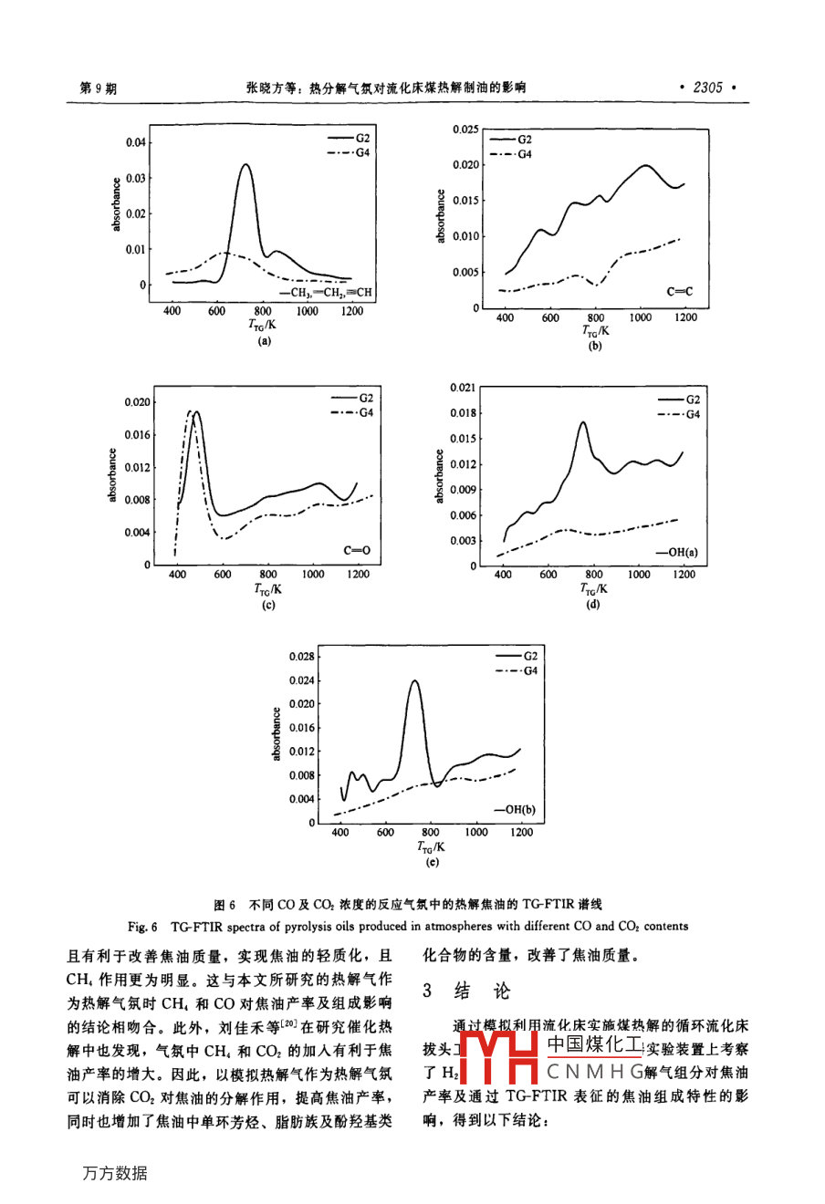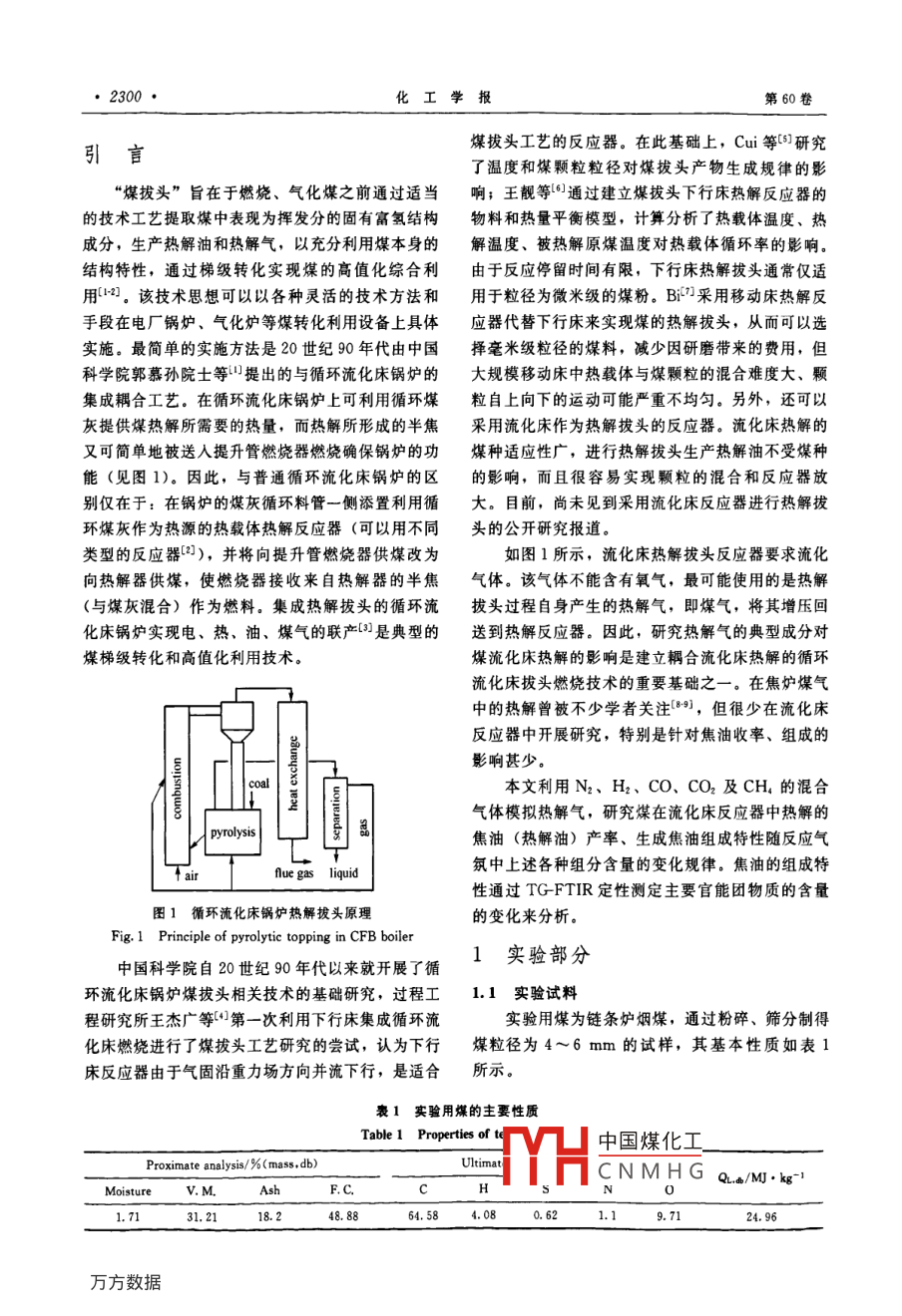 第60卷第9期化工學(xué)報(bào)Vol. 60 No 92009年9月cIesc Journ研究論文熱分解氣氛對(duì)流化床煤熱解制油的影響張曉方12,金玲3,熊燃',汪印,劉云義3,許光文(中國(guó)科學(xué)院過(guò)程工程研究所多相復(fù)雜系統(tǒng)國(guó)家重點(diǎn)實(shí)驗(yàn)室,北京100080;北京航天萬(wàn)源煤化工工程技術(shù)有限公司,北京100176;3沈陽(yáng)化工學(xué)院化學(xué)工程學(xué)院,遼寧沈陽(yáng)110142)摘要:在循環(huán)流化床鍋爐上耦合流化床熱解反應(yīng)器既可提供電力又副產(chǎn)熱解油,明顯提高煤的利用價(jià)值。在這個(gè)過(guò)程中,熱解反應(yīng)器通常利用自身產(chǎn)生的熱解氣作為流化介質(zhì)。本文考察了模擬熱解氣反應(yīng)氣氛對(duì)流化床煤熱解拔頭制取熱解油產(chǎn)率的影響,并利用 TG-FTIR分析了焦油官能團(tuán)組成及隨TG溫度的變化。針對(duì)鍋爐用煙煤的實(shí)驗(yàn)結(jié)果表明:采用熱解氣作為反應(yīng)氣氛時(shí)焦油產(chǎn)率最大,相對(duì)無(wú)水無(wú)灰基煤達(dá)13%。反應(yīng)氣氛中H2和CO2的存在不利于焦油生成,但CO和CH4的加入提高了焦油產(chǎn)率;H2的加入有利于焦油中酚羥基、羧基類化合物生成,同時(shí)也促進(jìn)了脂肪族化合物的裂解;CH4的存在可以提高焦油中單環(huán)芳烴、脂肪族及酚羥基類化合物的含量。關(guān)鍵詞:熱解拔頭;流化床;焦油;反應(yīng)氣氛中圖分類號(hào):TQ523.5文獻(xiàn)標(biāo)識(shí)碼:A文章編號(hào):0438-1157(2009)09—2299-09Effect of reaction atmosphere on tar production fromcoal pyrolysis in fluidized bed reactorZHANG Xiaofang., JIN Ling.,XIONG Ran, WANG Yin, LIU Yunyi, XU Guangwen'('State Key Laboratory of Multi-Phase Compler System, Institute of Process Engineering, CAS, Beijing 100080, Chinaiz Beijing Aerospace Wanyuan Coal Chemical Engineering Technology Co., Ltd, Beijing 100176, China;aCollege of Chemical Engineering, Shenyang Institute of Chemical Technology, Shenyang 110142, Liaoning, China)Abstract: Coal utilization can be improved by coupling a fluidized bed pyrolyzer to a CFb boiler, whichenables a co-production of pyrolysis oil and electricity. In this process, the pyrolyzer uses generally theself-generated pyrolysis gas as the fluidizing gas. The present study deals with the pyrolysis oil productionn a fluidized bed reactor through using a simulated pyrolysis gas as the reaction atmosphere, and both theyield and composition were analyzed with TG-FTIR. For a bituminous coal used in steam boilers, the oilyield reaches its possible peak value of 13%(mass, daf). The presence of H and COz in the reactionatmosphere decreases the tar yield, whereas the addition of CO and CH, into the atmosphere increases thetar production. TG-FTIR analysis demonstrated that adding H2 into the pyrolysis atmosphere increases thecontents of phenolic and carboxylic compounds in the produced pyrolysis oil, while it promotes as well thecracking of aliphatic hydrocarbons during pyrolysis. Adding CH, causes more aliphatic hydrocarbonssingle aromatic ring chemicals and phenolic compounds in the pyrolysis oilKey words: pyrolytic topping; fluidized bed; tar; reaction atmosphere8收到初稿,2009-05-31收到修改稿聯(lián)系人:許光文。第一作者:張曉方(1983-),女,碩士研H中國(guó)煤化工Guangwen, gwxuCNMHG究生。Foundation item: supported by the National Natural Science基金項(xiàng)目:國(guó)家自然科學(xué)基金項(xiàng)目(20776144);國(guó)家高技術(shù) Foundation of China(20776144) and the High-tech Research研究發(fā)展計(jì)劃重大項(xiàng)目(2006AA5A103)Development Program of China(2006AA05A103·2300化工學(xué)報(bào)引言煤拔頭工藝的反應(yīng)器。在此基礎(chǔ)上,Cui等研究了溫度和煤顆粒粒徑對(duì)煤拔頭產(chǎn)物生成規(guī)律的影“煤拔頭”旨在于燃燒、氣化煤之前通過(guò)適當(dāng)響;王靚等通過(guò)建立煤拔頭下行床熱解反應(yīng)器的的技術(shù)工藝提取煤中表現(xiàn)為揮發(fā)分的固有富氫結(jié)構(gòu)物料和熱量平衡模型,計(jì)箅分析了熱載體溫度、熱成分,生產(chǎn)熱解油和熱解氣,以充分利用煤本身的解溫度、被熱解原煤溫度對(duì)熱載體循環(huán)率的影響。結(jié)構(gòu)特性,通過(guò)梯級(jí)轉(zhuǎn)化實(shí)現(xiàn)煤的高值化綜合利由于反應(yīng)停留時(shí)間有限,下行床熱解拔頭通常僅適用山。該技術(shù)思想可以以各種靈活的技術(shù)方法和用于粒徑為微米級(jí)的煤粉。B1采用移動(dòng)床熱解反手段在電廠鍋爐、氣化爐等煤轉(zhuǎn)化利用設(shè)備上具體應(yīng)器代替下行床來(lái)實(shí)現(xiàn)煤的熱解拔頭,從而可以選實(shí)施。最簡(jiǎn)單的實(shí)施方法是20世紀(jì)90年代由中國(guó)擇毫米級(jí)粒徑的煤料,減少因研磨帶來(lái)的費(fèi)用,但科學(xué)院郭慕孫院士等ψ提出的與循環(huán)流化床鍋爐的大規(guī)模移動(dòng)床中熱載體與煤顆粒的混合難度大、顆集成耦合工藝。在循環(huán)流化床鍋爐上可利用循環(huán)煤粒自上向下的運(yùn)動(dòng)可能嚴(yán)重不均勻。另外,還可以灰提供煤熱解所需要的熱量,而熱解所形成的半焦采用流化床作為熱解拔頭的反應(yīng)器。流化床熱解的又可簡(jiǎn)單地被送入提升管燃燒器燃燒確保鍋爐的功煤種適應(yīng)性廣,進(jìn)行熱解拔頭生產(chǎn)熱解油不受煤種能(見(jiàn)圖1)。因此,與普通循環(huán)流化床鍋爐的區(qū)的影響,而且很容易實(shí)現(xiàn)顆粒的混合和反應(yīng)器放別僅在于:在鍋爐的煤灰循環(huán)料管一側(c
