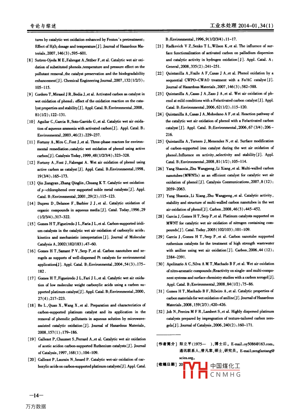 第34卷第1期工業(yè)水處理Vol 34 No. 12014年1月Industrial Water TreatmentJan.,2014炭材料催化劑在催化濕式氧化中的應(yīng)用陽(yáng)立平12,曾凡棠1,李岱霖3,禹琪,房懷陽(yáng)1(1.環(huán)境保護(hù)部華南環(huán)境科學(xué)研究所,廣東廣州510655;2.中國(guó)科學(xué)院廣州地球化學(xué)研究所廣東廣州510640;3.廈門(mén)理工學(xué)院,福建廈門(mén)361024)摘要]催化濕式氧化(CWO)是一種有效處理難降解有機(jī)廢水的新技術(shù)。催化劑是CWO技術(shù)的一個(gè)關(guān)鍵因素碳材料催化劑是一種新型的催化劑?;钚蕴俊⑻技{米管及碳干凝膠在CwO處理中可直接做催化劑,也是一種良好的催化劑載體。炭材料催化劑在CWO處理中具有良好發(fā)展前景,全面介紹了炭材料催化劑在CWo中的應(yīng)用。[關(guān)鵪詞]催化濕式氧化;活性炭;碳納米管;碳干凝膠;催化劑;載體[中圖分類號(hào)]X7031[文獻(xiàn)標(biāo)識(shí)碼]A[文章編號(hào)]1005-829X(2014)01-001005Application of carbon material catalyst to thecatalystic wet oxidation technologyYang Liping, Zeng Fantang', Li Dailin, Yu qi, Fang Huaiyang(1. South China Institute of Environmental Sciences, Department of Environmental ProtectionGuangzhou 510655, China; 2. Guangzhou Institute of Geochemistry, Chinese Academy of SciencesGuangzhou 510640, China; 3. Xiamen University of Technology, Xiamen 361024, China)Abstract: Catalytic wet oxidation(CwO)is a new technology which can be used for treating refractory organicwastewater effectively. Catalyst is a key to the cwo technology. Carbon material catalyst is a kind of novel catalystActivated carbon, carbon nanotube and carbon xerogel can be used not only as direct catalysts but also as catalcarriers. Carbon material catalysts used in CWo treatment has pretty good development prospect. An overall intro-duction is given on the application of carbon catalysts to CwO treatment.Key words: catalytic wet oxidation; activated carbon; carbon nanotube; carbon xerogel; catalyst; catalyst support隨著現(xiàn)代工業(yè)的發(fā)展,傳統(tǒng)的廢水處理方法面1活性炭催化劑臨極大的挑戰(zhàn),開(kāi)發(fā)新的廢水處理方法對(duì)于解決日益嚴(yán)重的水污染問(wèn)題具有十分重要的意義。催化濕活性炭(AC)由于其比表面積大而常常用做吸式氧化CWo)技術(shù)適合處理那些采用焚燒法處理附劑,在廢水脫色、有毒有害物質(zhì)的吸附等方面有著濃度太低而采用生物法處理又毒性太大的廢水0廣泛的應(yīng)用。但是近年來(lái)的研究發(fā)現(xiàn)活性炭也是一催化劑是CWO技術(shù)的核心,也是國(guó)內(nèi)外學(xué)者研究種良好的催化劑。的重點(diǎn)。炭材料作為一種新興的催化劑,具有諸多優(yōu)A. Santos等6)分別以3種AC為催化劑進(jìn)行了點(diǎn):不僅是一種良好的吸附劑,也具有催化劑的良好CWO處理苯酚的研究,在氧氣分壓為16MPa,溫度性能特別適合于液相催化反應(yīng)2;熱穩(wěn)定性好,在為160℃的條件下處理一定時(shí)間后,苯酚的轉(zhuǎn)化率酸性或堿性條件下也很穩(wěn)定,比較適合苛刻的反應(yīng)可達(dá)100%,TOC去除率為80%;研究者還以 Fenton條件;價(jià)格較低,再生比較方便。近年來(lái),研究者氧化預(yù)處理酚類廢水,再以AC為催化劑進(jìn)行CWO對(duì)炭材料催化劑的研究很多,但目前還沒(méi)有相關(guān)文處理,結(jié)果表明聯(lián)合處理可使廢水的礦化度變得很獻(xiàn)對(duì)CWO技術(shù)中各種炭材料催化劑進(jìn)行歸納和綜高廢水的毒性大大降低。ME. Suarez-Ojeda等述,筆者主要介紹了CWO法中相關(guān)炭材料催化劑的以AC為催化劑,采用cWo法分別對(duì)苯酚、鄰甲酚和二氯酚進(jìn)行研究進(jìn)展。H中國(guó)煤化工3種模找廢水影響很大,CNMHG。T.Cord[基金項(xiàng)目]環(huán)境保護(hù)部華南環(huán)境科學(xué)研究所中央級(jí)公益性科研院所基本科研業(yè)務(wù)專項(xiàng)資助項(xiàng)目(PM-ax021-20121109310工業(yè)水處理2014-01,34(1)陽(yáng)立平,等:炭材料催化劑在催化濕式氧化中的應(yīng)用等9在三相反應(yīng)器中以AC為催化劑對(duì)苯酚進(jìn)行了 Duprez等叫分別以Ru、Pt、Rh負(fù)載于TiO2、CeO2、ACcWo處理,在溫度為160℃,氧氣分壓為1.6MPa,上制得催化劑,并進(jìn)行了CWO處理苯酚和乙酸的研苯酚的初始質(zhì)量濃度為1000mg,初始pH為35究。結(jié)果表明:Ru(5%)AC催化降解乙酸的效果最的條件下處理50h,苯酚的轉(zhuǎn)化率為70%,TOC去好,在溫度200℃、總壓為4MPa、反應(yīng)3h后,乙酸除率為40%。研究者還在一定條件下對(duì)催化劑進(jìn)行轉(zhuǎn)化率為97%,CO2的選擇性為98%。H.T. Gomes了再生研究但效果不佳。C. aguilar等以AC為等(以Im/AC為催化劑進(jìn)行了丁酸和異丁酸的CWO催化劑對(duì)氨水進(jìn)行了CWO處理,結(jié)果表明:以處理,在473K和氧氣壓力為069MPa下處理2hHNO3氧化預(yù)處理的AC對(duì)氨水的吸附能力較強(qiáng),而后,丁酸和異丁酸的轉(zhuǎn)化率分別為43%和52%。H在CWO處理過(guò)程中對(duì)氨水的氧化能力較差;而以T. Gomes等6以PAC為催化劑對(duì)苯胺進(jìn)行了CWoH2還原處理過(guò)的AC表現(xiàn)出較高的氧化活性??赡芴幚淼难芯?在200氧氣分壓為069MPa的條件的原因是吸附主要發(fā)生在含有羧酸酸酐、內(nèi)酯酸等下處理2h后,苯胺轉(zhuǎn)化率可達(dá)100%,CO選擇性可表面基團(tuán)上,而AC的催化活性只與醌類表面基團(tuán)達(dá)94.5%。H. T Gomes等還以PAC為催化劑對(duì)有關(guān)。A. Fortuny等在三相反應(yīng)器中以AC和Cu