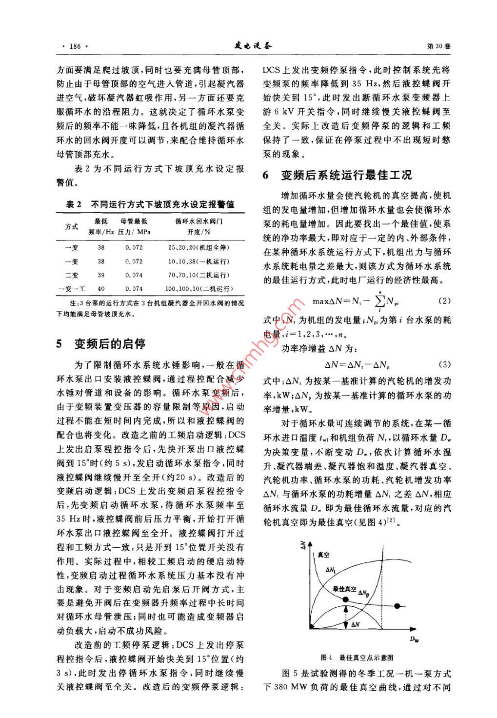 第30卷第3期發(fā)電謾備Vol 30, No. 32016年5月POWER EQUIPMENTMay.2016電廠循環(huán)水泵變頻改造陳正建(深圳能源集團(tuán)殿份有限公司東部電廠,廣東深圳518120)摘要:針對(duì)變頻改造后出現(xiàn)的泵的最小流量限制和循環(huán)水母管充水要求,通過理論分析和試驗(yàn),確定了運(yùn)行的邊界保證設(shè)備和系統(tǒng)的安全。為了使得機(jī)組在最佳真空下運(yùn)行,通過試驗(yàn)和估算找出變頻泵的最佳運(yùn)行工況提高了循環(huán)水泵運(yùn)行的靈活性,降低了廠用電率。關(guān)鍵詞:循環(huán)水;變頻;最佳真空;廠用電率中圖分類號(hào):TK477文獻(xiàn)標(biāo)志碼:A文章編號(hào):1671-086X(2016)03-0183-05Frequency Conversion Retrofit of a Circulating WaterPump for Power PlantsChen Zhengjian( Dongbu Power Plant, Shenzhen Energy Corporation, Shenzhen 518120, China)Abstract: To guarantee that the flow rate of relevant circulating water pumps is higher than theinimum requirement and the top of the main pipeline can be filled with seawater after frequencyconversion retrofit, operation limits are set through analysis and commissioning tests to secure the safety ofrelated equipment and systems. Meanwhile, optimal operation conditions are found by tests and calculationsafter frequency conversion retrofit, so that the circulating water system can be operated under the bestvacuum condition and become more flexible to the DSS operation mode, thus bringing remarkable economicbenefit to the power plantKeywords: circulating water; frequency conversion; optimal vacuum; auxiliary power ratio循環(huán)水泵是燃?xì)庹羝?lián)合循環(huán)電廠最大的耗能設(shè)備,某電廠3臺(tái)聯(lián)合循環(huán)機(jī)組配置了31循環(huán)水系統(tǒng)概況臺(tái)循環(huán)水泵,設(shè)計(jì)的循環(huán)水泵系統(tǒng)在運(yùn)行方式某電廠安裝3臺(tái)350MW聯(lián)合循環(huán)機(jī)組,電上缺乏靈活性,不能在電廠兩班制運(yùn)行方式下廠的循環(huán)冷卻水系統(tǒng)采用海水直流供水,取排水經(jīng)濟(jì)運(yùn)行,浪費(fèi)大量廠用電。筆者重點(diǎn)分析了日均設(shè)在海邊。變頻改造后,為了保證滿足循環(huán)水泵最小流量冷卻水工藝流程為:海水→前池→凈水間要求和循環(huán)水爬坡母管充水等邊界條件,對(duì)循→循環(huán)水泵房→壓力管→凝汽器及輔機(jī)冷卻器環(huán)水泵變頻后的運(yùn)行頻率進(jìn)行了限制,保證設(shè)→排水孔→虹吸井→排水溝→排水口→海水。備和系統(tǒng)安全。在安全邊界范圍內(nèi),通過凝汽循環(huán)水系統(tǒng)采用雙母管制供水,3套聯(lián)合循環(huán)機(jī)器真空變化對(duì)汽輪機(jī)功率微增影響的試驗(yàn)方組配套3臺(tái)循環(huán)水泵,2條循環(huán)水母管,3套虹法,得出了最佳真空對(duì)應(yīng)的循環(huán)水泵運(yùn)行方式吸井,以及1條鋼筋混凝土自流排水溝。循環(huán)和頻率定值,保證機(jī)組運(yùn)行在最經(jīng)濟(jì)工況點(diǎn)。水母管間設(shè)有聯(lián)絡(luò)管,排水溝間也設(shè)有聯(lián)循環(huán)水泵變頻改造后的經(jīng)濟(jì)效益顯著,靈活性絡(luò)溝明顯增強(qiáng),達(dá)到了預(yù)期的改造效果圖1為該電廠循環(huán)水系統(tǒng)圖。收稿日期:2015-1020作者簡介:陳正建(1981一),男,工程師,主要從事燃?xì)廨啓C(jī)運(yùn)行管理工作E-mail:chenzhengjian@sec.com.cn184發(fā)也汊備第30卷循環(huán)水母管甲AP-131號(hào)虹吸井循環(huán)水母管乙MIAB [AB( M1號(hào)液控2號(hào)液控3號(hào)液控蝶閥測2號(hào)虹吸井水1號(hào)循環(huán)下2號(hào)循環(huán)T3號(hào)循環(huán)攔污柵]『攔污柵】攔污3號(hào)虹吸井鋼閘門【鋼閘門】【鍋閘門3號(hào)凝汽器海水海水海水圖1循環(huán)水系統(tǒng)圖循環(huán)水泵額定流量為7.05m3/s,揚(yáng)程為機(jī)組負(fù)荷,循環(huán)水的需求量也不同,定速泵此時(shí)m,泵出口均安裝有液控式緩閉蝶閥,減小水缺乏明顯的靈活性。筆者主要分析機(jī)組全停工錘風(fēng)險(xiǎn)。單臺(tái)循環(huán)水泵電動(dòng)機(jī)功率為2200kW,況和冬季工況的情況。電壓為6kV2.1機(jī)組全停工況2循環(huán)水系統(tǒng)改造前狀況機(jī)組主要是兩班制運(yùn)行,夜間機(jī)組調(diào)停后,仍需要少量的循環(huán)水冷卻軸封蒸汽和部分疏水按照設(shè)計(jì),電廠3臺(tái)機(jī)組配備3臺(tái)循環(huán)水泵,泄漏到凝汽器的蒸汽維持真空及輔機(jī)部分冷卻為滿足夏季海水溫度最高時(shí)的循環(huán)冷卻需要,3用水,這時(shí)需要的循環(huán)水量很小。根據(jù)實(shí)際運(yùn)行臺(tái)泵同時(shí)運(yùn)行;冬季工況下可以按照三機(jī)二泵運(yùn)參數(shù),機(jī)組在停機(jī)后凝汽器循環(huán)水進(jìn)出口的溫升行,在滿足冷卻需要的情況下冬季運(yùn)行可節(jié)約廠只有0.3K,此時(shí)1臺(tái)工頻泵的循環(huán)水流量基本用電。實(shí)際運(yùn)行中,這樣的配置相對(duì)于兩班制運(yùn)都被浪費(fèi)。行的機(jī)組缺乏靈活性,經(jīng)濟(jì)性差。根據(jù)2012年2.2-泵一機(jī)工況和二機(jī)二泵工況統(tǒng)計(jì),1-4月和12月的冬季工況,幾乎沒有出現(xiàn)冬季工況,由于海水溫度在17℃左右,而3臺(tái)機(jī)的運(yùn)行工況。冬季典型的兩班制運(yùn)行情況夏季工況的海水溫度在27℃,冬季工況的溫見圖2。度明顯低很多,循環(huán)水的冷卻經(jīng)常過量,導(dǎo)致凝汽器真空度太高,凝汽器壓力超過極限