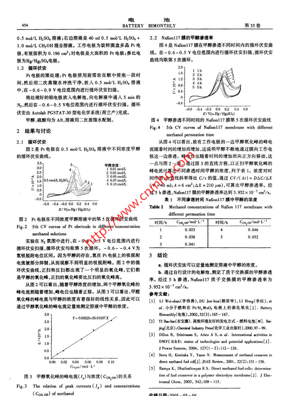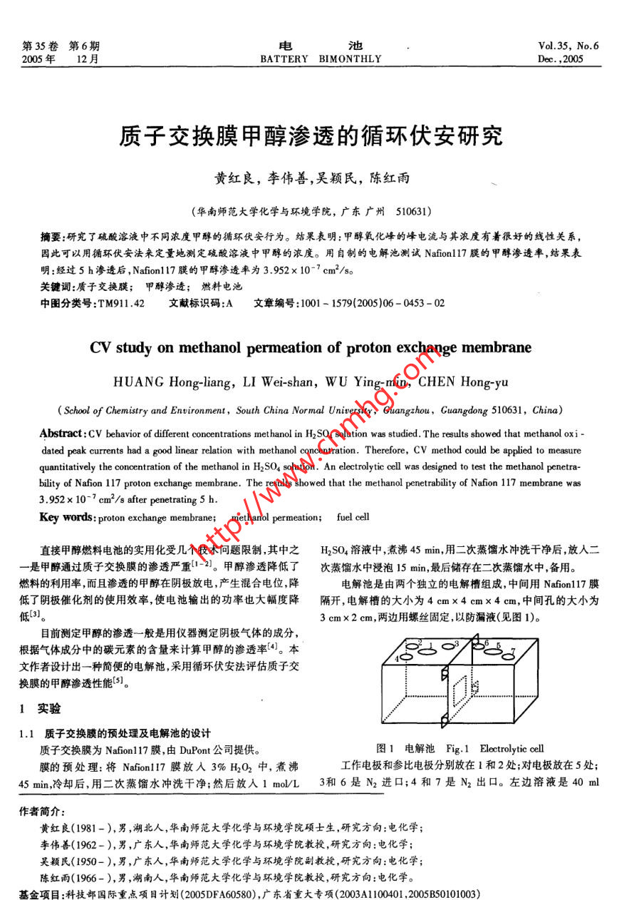 第35卷.第6期電池Vol.35, No.62005年12月BATTERY BIMONTHLYDec. ,2005質(zhì)子交換膜甲醇滲透的循環(huán)伏安研究黃紅良,李偉善,吳穎民,陳紅雨(華南師范大學(xué)化學(xué)與環(huán)境學(xué)院,廣東廣州510631)摘要:研究了硫酸溶液中不同濃度甲醇的循環(huán)伏安行為。結(jié)果表明:甲醇氧化峰的峰電流與其濃度有著很好的線性關(guān)系,因此可以用循環(huán)伏安法來(lái)定量地測(cè)定硫酸溶液中甲醇的濃度。用自制的電解池測(cè)試Nafion117膜的甲醇滲透率,結(jié)果表明:經(jīng)過(guò)5 h滲透后,Nafion117膜的甲醇滲透率為3.952x 10-7 cm/so .關(guān)鍵詞:質(zhì)子交換膜;甲醇滲透; 燃料電池中圖分類號(hào):TM911.42文獻(xiàn)標(biāo)識(shí)碼:A .文章編號(hào):1001 - 1579(2005)06 - 0453 - 02CV study on methanol permeation of proton exchange membraneHUANG Hong-liang, LI Wei-shan, WU Ying min, CHEN Hongyu( School of Chemistry and Envionment,South China Nor mal Universily, Cuangzhou ,Cuangdong 510631, China)Abstract: CV behavior of diferent concentrations methanol in H2SO4 solution was studied. The reuls showed that methanol oxi-dated peak currents had a good linear relation with methanol concentration. Therefore, CV method could be applied to measurequantitatively the concentration of the methanol in H2SO4 solution. An electrolytic cell was designed to test the methanol penetra-bility of Nafion 117 proton exchange membrane. The results showed that the methanol penetrability of Nafion 117 membrane was3.952 x 10-7 cm2/s after penetraing 5 h. .Key words: proton exchange membrane;methanol permeaion; fuel cell直接甲醇燃料電池的實(shí)用化受幾個(gè)技術(shù)問(wèn)題限制,其中之H2SO4溶液中,煮沸45 min,用二次蒸餾水沖洗干凈后,放人二- -是甲醇通過(guò)質(zhì)子交換膜的滲透嚴(yán)重[1-2]。甲醇滲透降低了次蒸餾水中浸泡15 min,最后儲(chǔ)存在二次蒸餾水中,備用。燃料的利用率,而且滲透的甲醇在陰極放電,產(chǎn)生混合電位,降電解池是由兩個(gè)獨(dú)立的電解槽組成,中間用Nafon117膜低了陰極催化劑的使用效率,使電池輸出的功率也大幅度降隔開(kāi),電解槽的大小為4 cmx4 cmx4 cm,中間孔的大小為低[3]。3 cm x2 cm,兩邊用螺絲固定,以防漏液(見(jiàn)圖1)。目前測(cè)定甲醇的滲透- -般是用儀器測(cè)定陰極氣體的成分,根據(jù)氣體成分中的碳元素的含量來(lái)計(jì)算甲醇的滲透率[4]。本.文作者設(shè)計(jì)出一種簡(jiǎn)便的電解池,采用循環(huán)伏安法評(píng)估質(zhì)子交換膜的甲醇滲透性能[5]。1實(shí)驗(yàn)1.1質(zhì)子交換膜的預(yù)處理及 電解池的設(shè)計(jì)質(zhì)子交換膜為Nafion117膜,由DuPont公司提供。圖1電解池 Fig.1 Elctrolytic cell膜的預(yù)處理:將Nafion117 膜放人3% H2O2中,煮沸工作電極和參比電極分別放在1和2處;對(duì)電極放在5處;45 min,冷卻后,用二次蒸餾水沖洗干凈;然后放入1 mol/L 3和6是 N2進(jìn)口;4和7是N2出口。左邊溶液是40 ml作者簡(jiǎn)介:黃紅良(1981-),男,湖北人,華南師范大學(xué)化學(xué)與環(huán)境學(xué)院碩士生,研究方向:電化學(xué);李偉善(1962-),男,廣東人,華南師范大學(xué)化學(xué)與環(huán)境學(xué)院教授,研究方向:電化學(xué);吳穎民(1950-),男,廣東人,華南師范大學(xué)化學(xué)與環(huán)境學(xué)院副教授,研究方向:電化學(xué);陳紅雨(1966- ),男,湖南人,華南師范大學(xué)化學(xué)與環(huán)境學(xué)院教授,研究方向:電化學(xué)?;痦?xiàng)目:科技部國(guó)際重點(diǎn)項(xiàng)目計(jì)劃(2005DFA60580),廣東省重大專項(xiàng)(2003A1100401 ,2005B50101003)電池454BATTERY BIMONTHLY第35卷.0.5 moVL HSO,溶液;右邊溶液是40 ml 0.5 molVL H2SO4 +2.2 Nafion117 膜的甲醇滲透率1.0 moVL CH,OH混合溶液。工作電極為旋轉(zhuǎn)圓盤多晶Pt電圖4是Nafion117膜在甲醇滲透不同時(shí)間內(nèi)的循環(huán)伏安曲極,有效面積為0. 196 ecm2 ;對(duì)電極是大面積的Pt電極;參比電線。在-0.6~0.5 V電位范圍內(nèi)進(jìn)行循環(huán)伏安掃描,循環(huán)伏安極為Hg/HgSO.電極。曲線均取第5次循環(huán)。1.2循環(huán)伏安Pt電極的預(yù)處理: Pt電極使用前需放在酸中浸泡一段時(shí)1.6-22h千1.233h間,然后用二次蒸餾水沖洗干凈,放入0.5 moVL H2SO4 溶液9 0.855h中,在-0.6~ 0.9 v電位范圍內(nèi)進(jìn)行循環(huán)伏安掃描。.4-將處理好的鉑電極放人電解池,向電解液中通人5 min的-0.4N2,然后在-0.6~ 0.5 V電位范圍內(nèi)進(jìn)行循環(huán)伏安掃描。循環(huán)-0.6-04-0.20.00.20.40.6伏安由Autolab PCSTAT-30型電化學(xué)系統(tǒng)(荷蘭產(chǎn))完成。E/V(x.Hg / HgzSO,)甲醇、硫酸均為AR,溶液用二次蒸餾水配制。圖4甲醇滲透不同時(shí)間的Nafion117 膜第5次循環(huán)伏安曲線Fig.45th CV curves of Nafion117 membrane with different2結(jié)果與討論methanol permeation time2.1 循環(huán)伏安從圖4可以看出,放有工作電極的一邊甲醇氧化峰的峰電圖2是Pt電極在0.5 mol/L H2SO4溶液中不同濃度甲醇流隨著時(shí)間的增加而增加,這說(shuō)明甲醇不斷地通過(guò)膜向工作電的循環(huán)伏安曲線。極這- -邊滲透。峰電位也隨著時(shí)間的增加而向正方向移動(dòng),這一點(diǎn)與圖2一致。通過(guò)圖3的直線方程,以正掃甲醇氧化峰的3.0]1 0.01 molL峰電流計(jì)算出不同滲透時(shí)間甲醇的濃度,列于表1。濃度對(duì)時(shí)2.020.02 mol/L間作圖,由直線斜率得出C/t的值,通過(guò)CV/( AI)= DOC/OX.5 0.5 mol/L HSO,4 0.07 mol/L0]5 0.10 molL(V = 40 ml;A =6 cm2;OX = 210 um),可算出甲醇滲