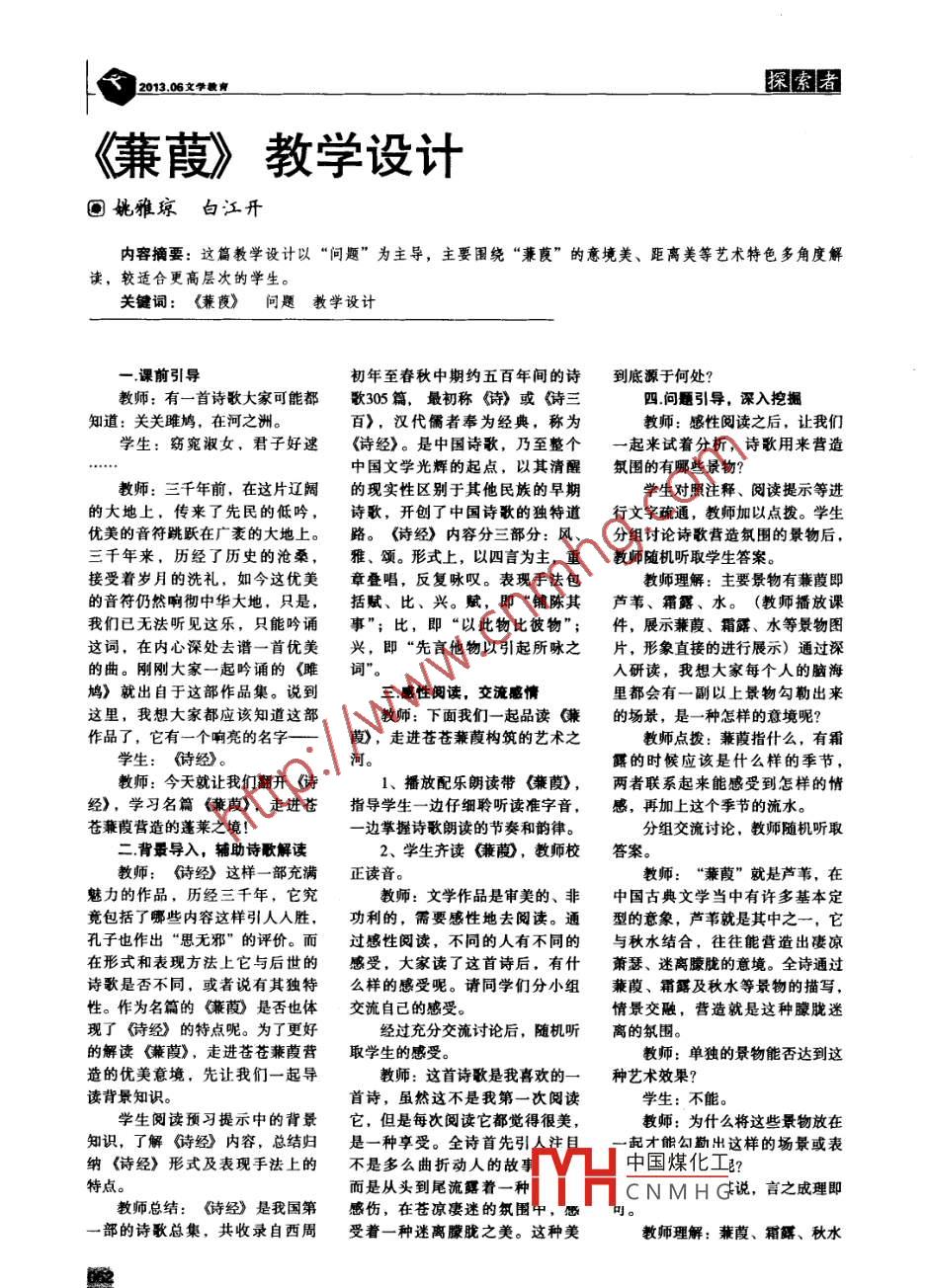 2013.06文學(xué)教育探索者《蒹葭》教學(xué)設(shè)計(jì)圃姚雅瓊白江開內(nèi)容摘要:這篇教學(xué)設(shè)計(jì)以“問題”為主導(dǎo),主要圍繞“蒹茛”的意境美、距離美等藝術(shù)特色多角度解讀,較適合更高層次的學(xué)生。關(guān)鍵詞: {蒹 茛》問題教學(xué)設(shè)計(jì)- - .課前引導(dǎo)初年至春秋中期約五百年間的詩到底源于何處?教師:有一首詩歌大家可能都歌305篇,最初稱《詩》或《詩三四.問題引導(dǎo),深入挖掘知道:關(guān)關(guān)雎鳩,在河之洲。百》,漢代儒者奉為經(jīng)典,稱為.教師:感性閱讀之后,讓我們學(xué)生:窈窕淑女,君子好速《詩經(jīng)》。是中國(guó)詩歌,乃至整個(gè)-起來試著分析,詩歌用來營(yíng)造中國(guó)文學(xué)光輝的起點(diǎn),以其清醒.氛圍的有哪些最物?敗師:三千年前,在這片遼闊的現(xiàn)實(shí)性區(qū)別于其他民族的早期學(xué)生對(duì)照注釋、閱讀提示等進(jìn)的大地上,傳來了先民的低吟,詩歌,開創(chuàng)了中國(guó)詩歌的獨(dú)特道行文字疏通,教師加以點(diǎn)撥。學(xué)生優(yōu)美的音符跳躍在廣袤的大地上。路?!对娊?jīng)》內(nèi)容分三部分:風(fēng)、分組討論詩歌營(yíng)造氛圍的景物后,三千年來,歷經(jīng)了歷史的滄桑,雅、頌。形式上,以四言為主,重教師隨機(jī)聽取學(xué)生答案。接受著歲月的洗禮,如今這優(yōu)美章疊唱,反復(fù)詠嘆。表現(xiàn)手法包.教師理解:主要景物有蒹葭即的音符仍然響徹中華大地,只是,括賦、 比、興。賦,即“鋪陳其5葦、霜露、水。(教師播放課我們已無法聽見這樂,只能吟誦事"; 比,即“以此物比彼物”;件,展示蒹葭、霜露、水等景物圖這詞,在內(nèi)心深處去譜一首優(yōu)美興,即“先言他物以引起所詠之片,形象直接的進(jìn)行展示)通過深的曲。剛剛大家一起吟誦的<《睢入研讀,我想大家每個(gè)人的腦海鳩》就出自于這部作品集。說到三.感性閱讀,交流感情里都會(huì)有一副以上景物勾勒出來這里,我想大家都應(yīng)該知道這部教師:下面我們一-起品讀《兼的場(chǎng)景,是一種怎樣的意境呢?作品了,它有一個(gè)響亮的名字一葭),走進(jìn)蒼蒼蒹葭構(gòu)筑的藝術(shù)之教師點(diǎn)撥:蒹葭指什么,有霜學(xué)生:侍經(jīng)》 。河。露的時(shí)候應(yīng)該是什么樣的季節(jié),教師:今天就讓我們翻開儲(chǔ)1、播放配樂朗讀帶《鐮葭》,兩者聯(lián)系起來能感受到怎樣的情經(jīng)》,學(xué)習(xí)名篇《兼葭》,走進(jìn)蒼指導(dǎo)學(xué)生一邊仔細(xì)聆 聽讀準(zhǔn)字音,感,再加上這個(gè)季節(jié)的流水。蒼蒹葭營(yíng)造的蓬萊之境!一邊掌握詩歌朗讀的節(jié)奏和韻律。分組交流討論,教師隨機(jī)聽取二.背最導(dǎo)入,輔助詩歌解讀2、學(xué)生齊讀《兼葭,教師校答案。教師:侍經(jīng)》 這樣一部充滿正讀音。教師:“蒹葭” 就是蘆葦,在魅力的作品,歷經(jīng)三千年,它究教師:文學(xué)作品是審美的、非中國(guó)古典文學(xué)當(dāng)中有許多基本定竟包括了哪些內(nèi)容這樣引人人勝,功利的,需要感性地去閱讀。通型的意象,蘆葦就是其中之一,它孔子也作出“思無邪”的評(píng)價(jià)。而過感性閱讀,不同的人有不同的與秋水結(jié)合,往往能營(yíng)造出凄涼在形式和表現(xiàn)方法上它與后世的感受,大家讀了這首詩后,有什.蕭瑟、迷離朦朧的意境。全詩通過詩歌是否不同,或者說有其獨(dú)特么樣的感受呢。請(qǐng)同學(xué)們分小組蒹葭、霜露及秋水等景物的描寫,性。作為名篇的《縑藺〉是否也體交流自己的感受。情景交融,營(yíng)造就是這種朦朧迷現(xiàn)了侍經(jīng)》的特點(diǎn)呢。為了更好經(jīng)過充分交流討論后,隨機(jī)聽離的氛圍。的解讀《蔬葭》, 走進(jìn)蒼蒼蒹葭營(yíng)取學(xué)生的感受。教師:單獨(dú)的景物能否達(dá)到這造的優(yōu)美意境,先讓我們一起導(dǎo)教師:這首詩歌是我喜歡的一-種藝術(shù)效果?讀背景知識(shí)。首詩,雖然這不是我第-一次閱讀學(xué)生:不能。學(xué)生閱讀預(yù)習(xí)提示中的背景它,但是每次閱讀它都覺得很美,教師:為什么將這些景物放在知識(shí),了解詩經(jīng)》內(nèi)容,總結(jié)歸是一種享受。全詩首先引人注目-起才能勾勤出這樣的場(chǎng)景或表納<詩經(jīng)》形式及表現(xiàn)手法上的不是多么曲折動(dòng)人的故事中國(guó)煤化工?特點(diǎn)。而是從頭到尾流露著- -種MHCNMH G說,言之成理即教師總結(jié):侍經(jīng)》 是我國(guó)第感傷,在蒼涼妻迷的氛圍中,感可一部的詩歌總集,共收錄自西周受著一種迷離朦朧之美。這種美教師理解:蒹葭、霜齶、秋水方數(shù)據(jù)深索者文學(xué)教育2013.06 '等景物是融入了主觀情感的客觀教師:詩人這樣鍥而不舍進(jìn)行抒情性和音樂的美感享受。物象,即意象;而大家能感受到.追尋的伊人,他到底指什么?播放音樂在水一分,充分的那種情感氛圍是以上景物所營(yíng)學(xué)生:心愛的姑娘。感受詩歌的音樂美。造出來的一種藝術(shù)境界,即意境。.教師:只能是女性嗎?教師:聆聽音樂,我們?cè)?次二者在本質(zhì)上有一定的聯(lián)系,都學(xué)生:也可以是男性。沉迷在《兼葭》帶給我們的藝術(shù)享是主觀與客觀統(tǒng)一的產(chǎn)物,是情教師:除了人,還能否可以指受中。全詩首先吸引我們的不是與物的產(chǎn)物,